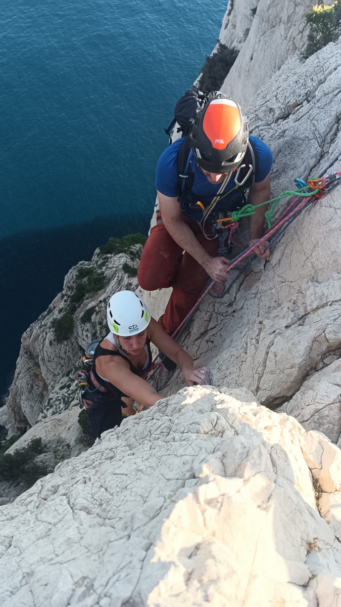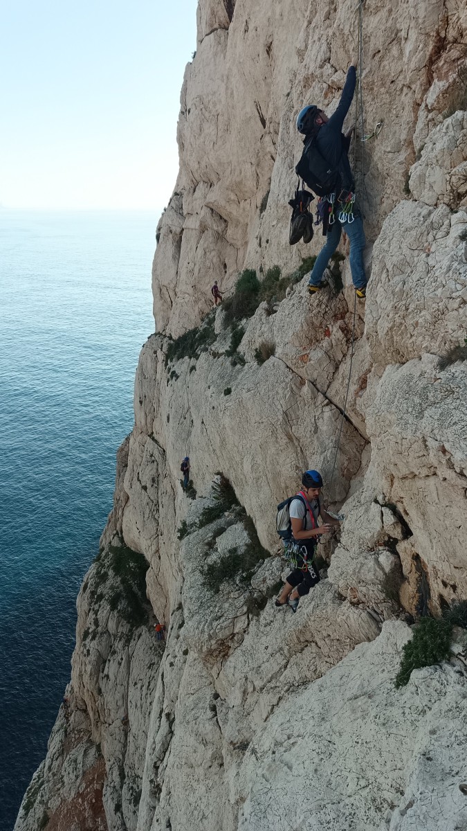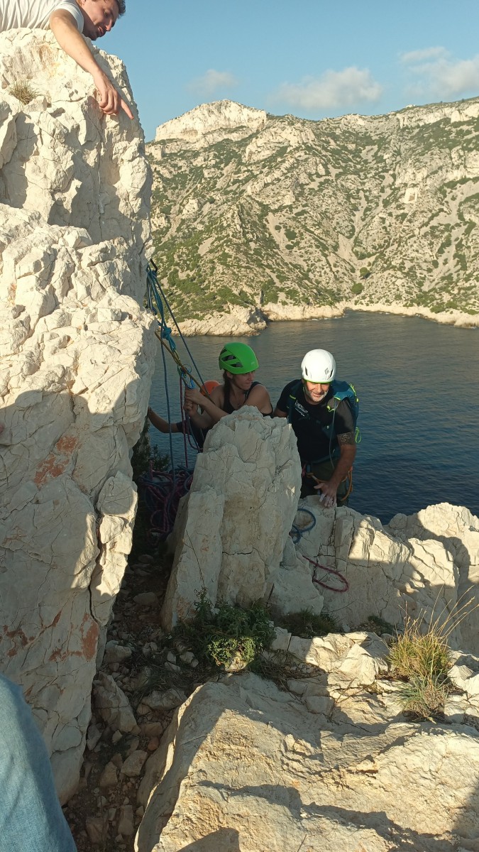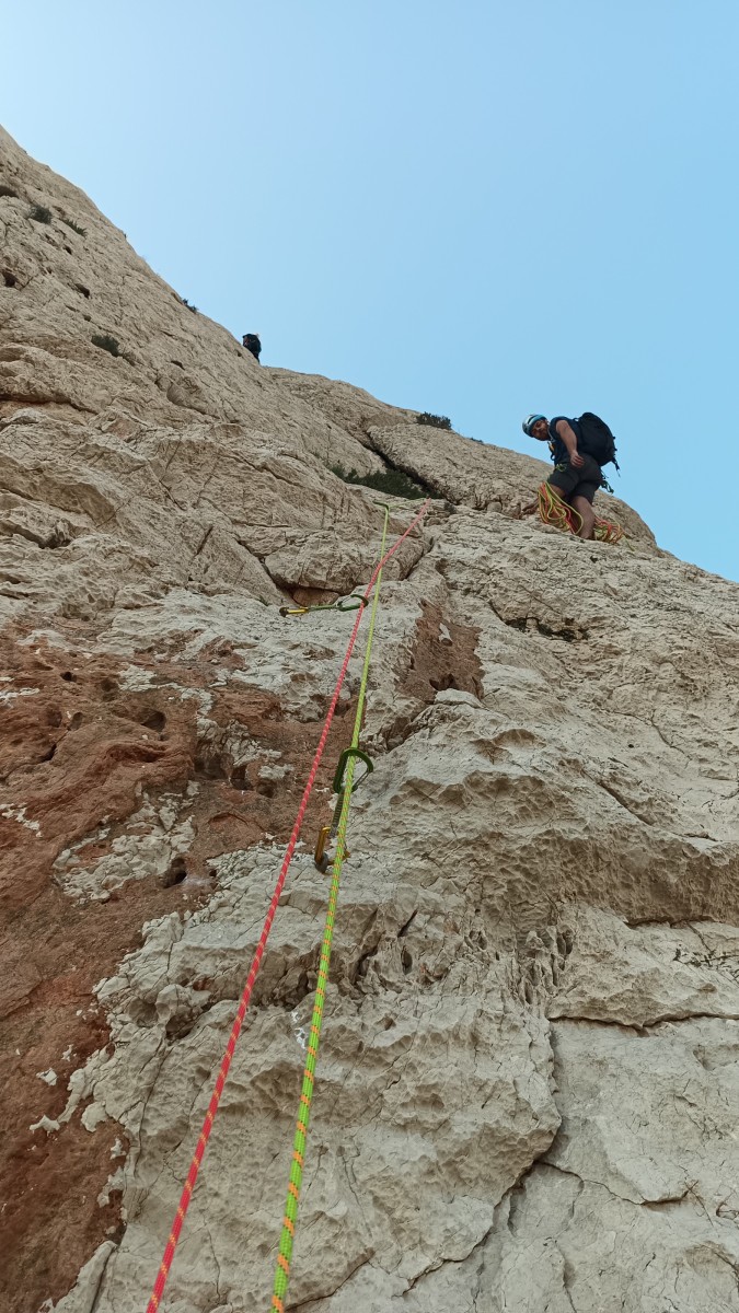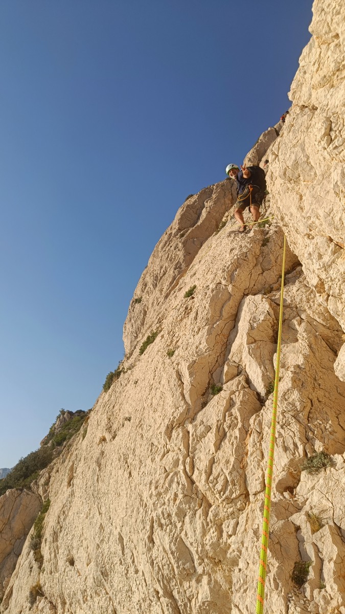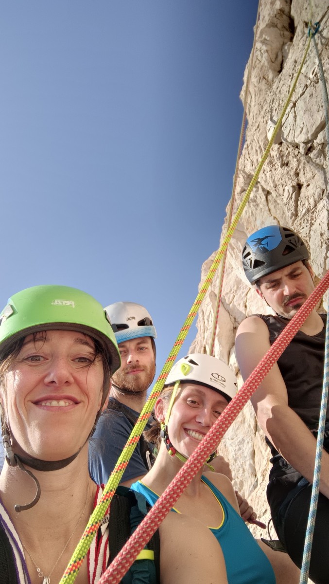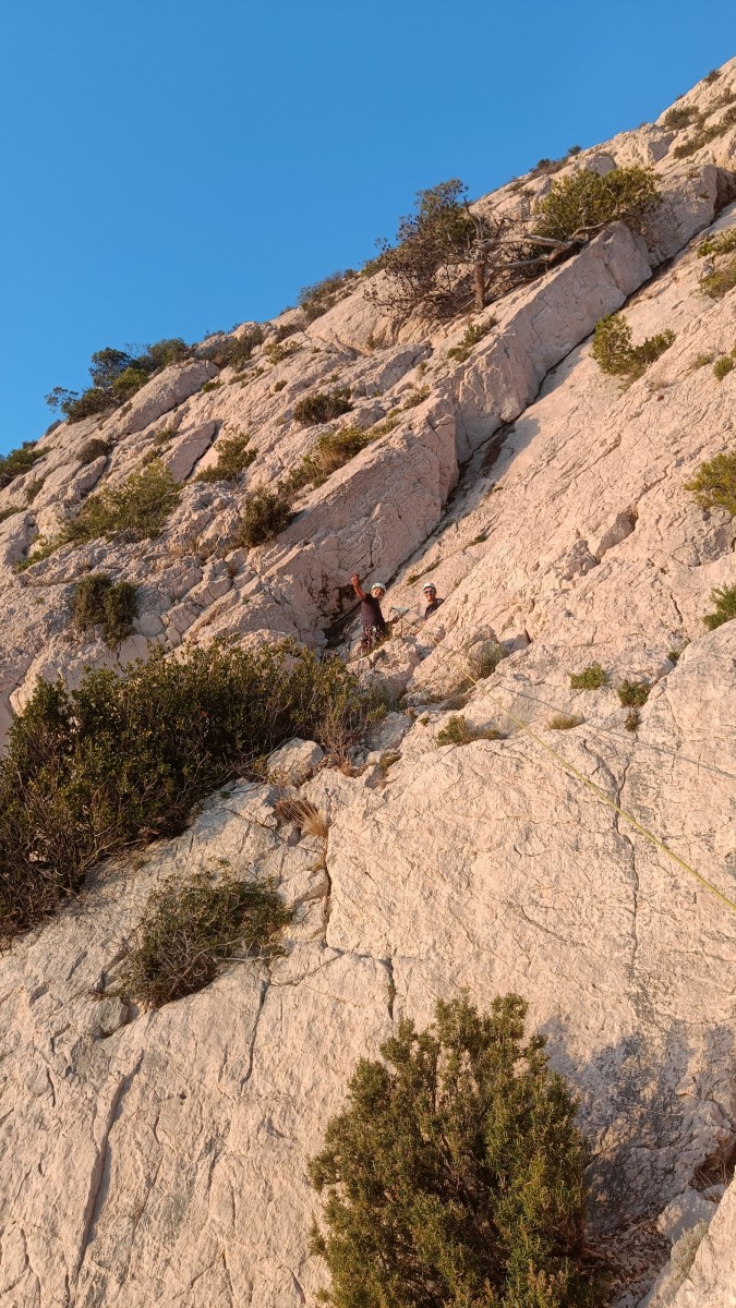 Pendant tout ce temps, le soleil a eu le temps de nous rattraper et nous d’admirer les performances des cordées à notre droite. Sandrine, en experte qu’elle est devenue mais qui a choisi la sagesse dans une voie facile pour elle et pour son dos douloureux, trainant des Djé et Alexis blessés, avale les longueurs dans s abonne humeur communicative. Derrière, Saliha a choisi (ou a été forcée !) de partir en tête dans la L1 et nous la regardons galérer un moment avant d’abandonner. Jean-Luc prend le relais parce que sa patience, si légendaire soit-elle, ne dépasse pas l’idée de finir à la nuit. Alexis lui aussi avait patiemment attendu au dessus et à mi chemin, il décide de changer de cordée pour aider Saliha dans les moments difficiles. Ca c’est l’esprit Dragon !