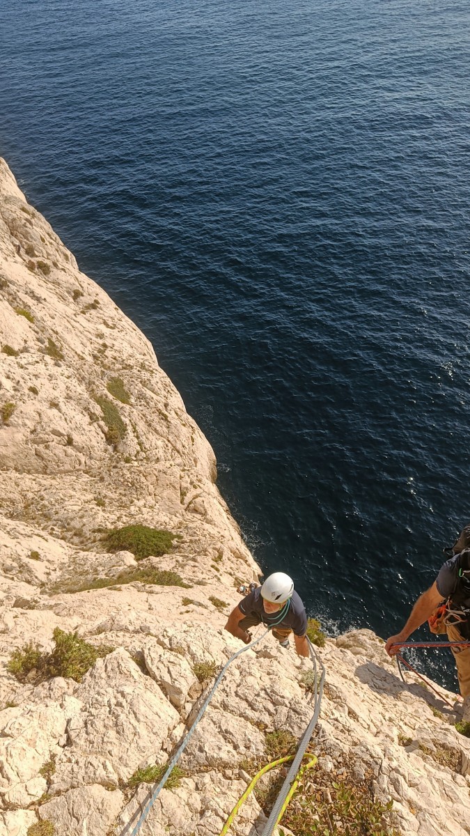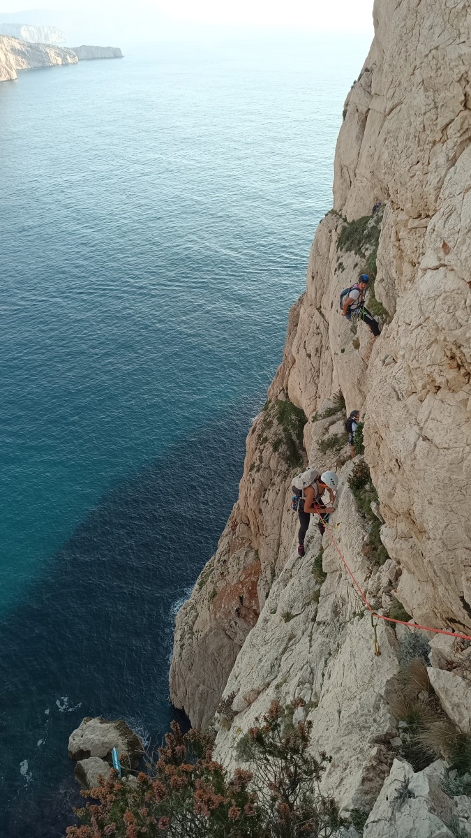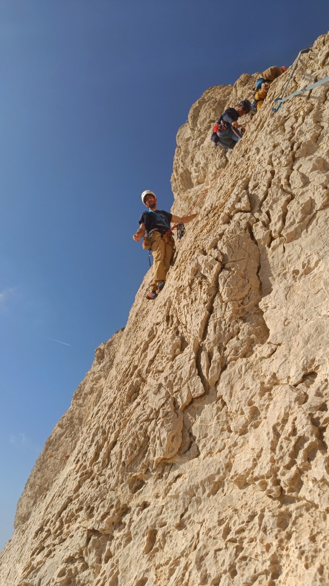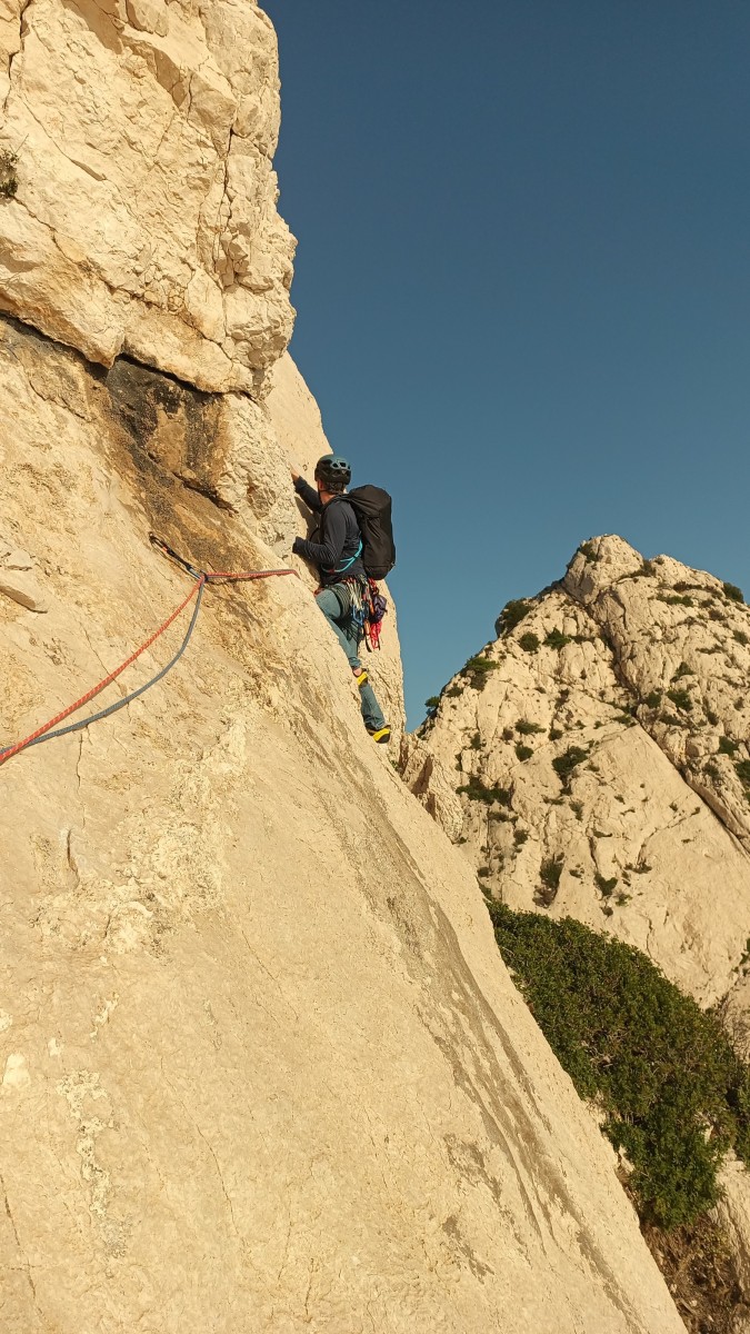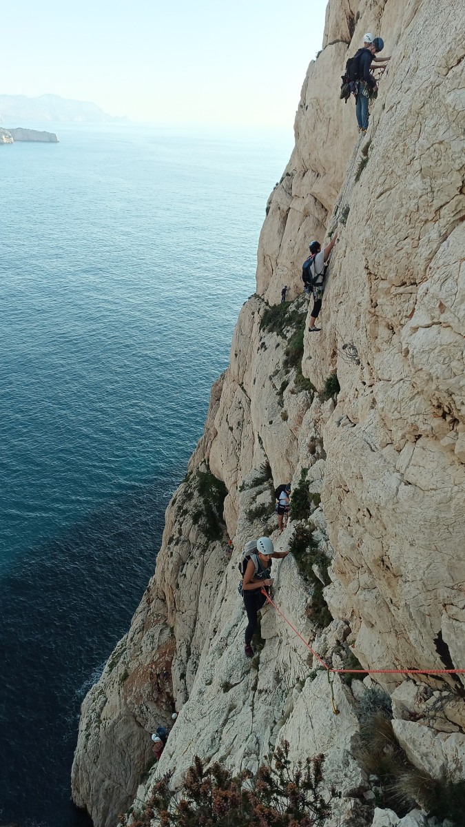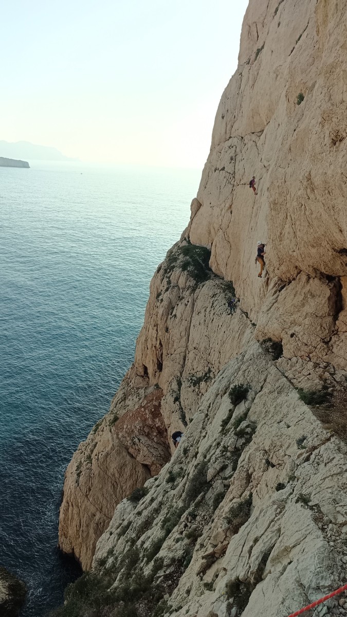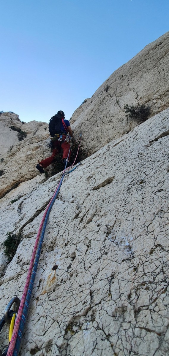 Pendant tout ce temps, le soleil a eu le temps de nous rattraper et nous d’admirer les performances des cordées à notre droite. Sandrine, en experte qu’elle est devenue mais qui a choisi la sagesse dans une voie facile pour elle et pour son dos douloureux, trainant des Djé et Alexis blessés, avale les longueurs dans s abonne humeur communicative. Derrière, Saliha a choisi (ou a été forcée !) de partir en tête dans la L1 et nous la regardons galérer un moment avant d’abandonner. Jean-Luc prend le relais parce que sa patience, si légendaire soit-elle, ne dépasse pas l’idée de finir à la nuit. Alexis lui aussi avait patiemment attendu au dessus et à mi chemin, il décide de changer de cordée pour aider Saliha dans les moments difficiles. Ca c’est l’esprit Dragon !