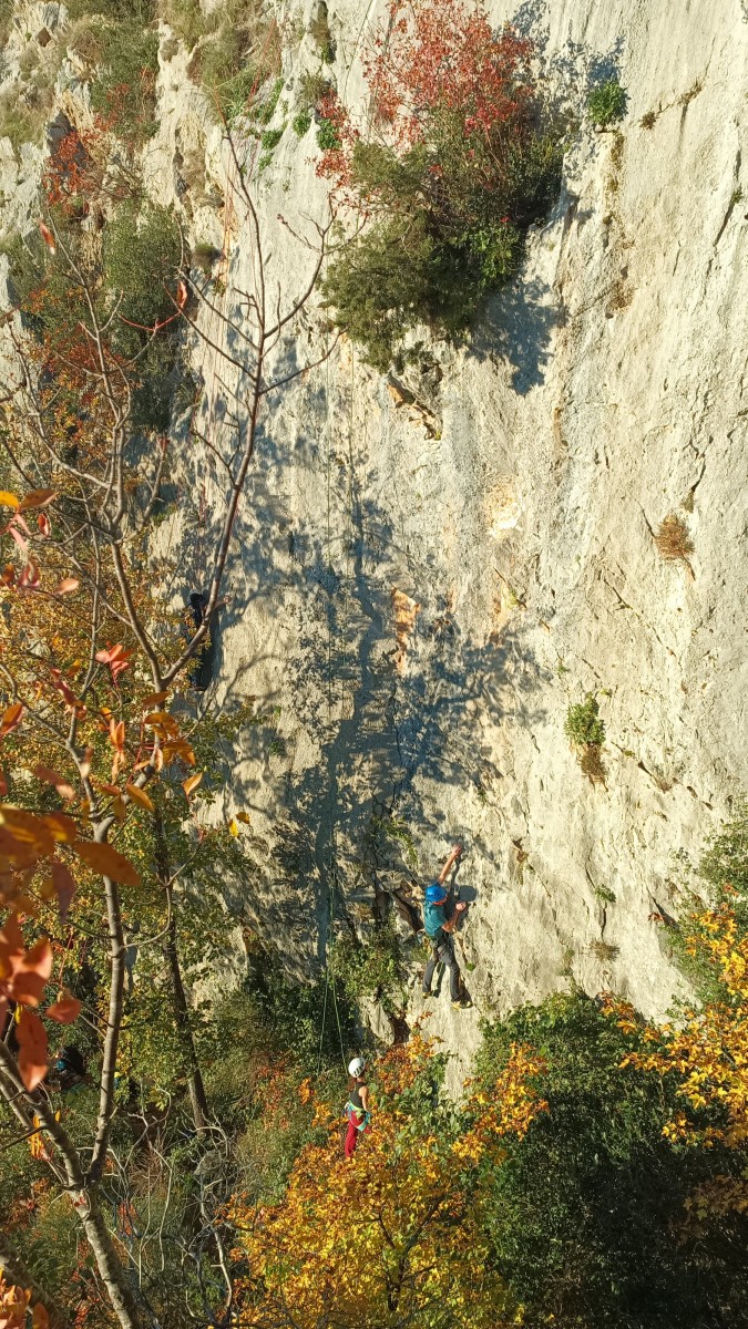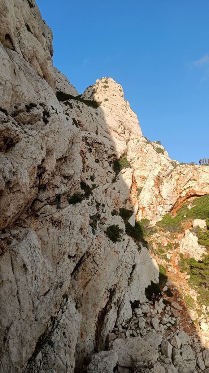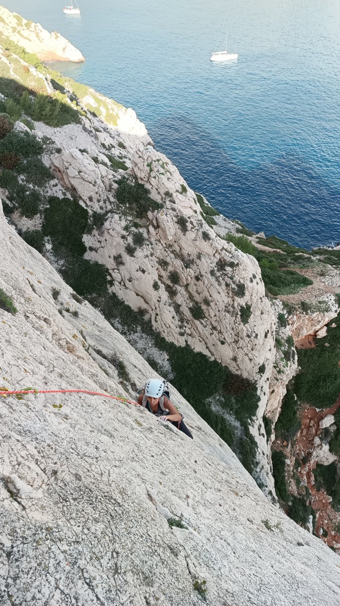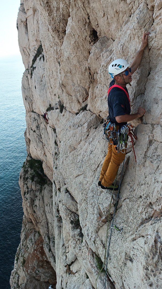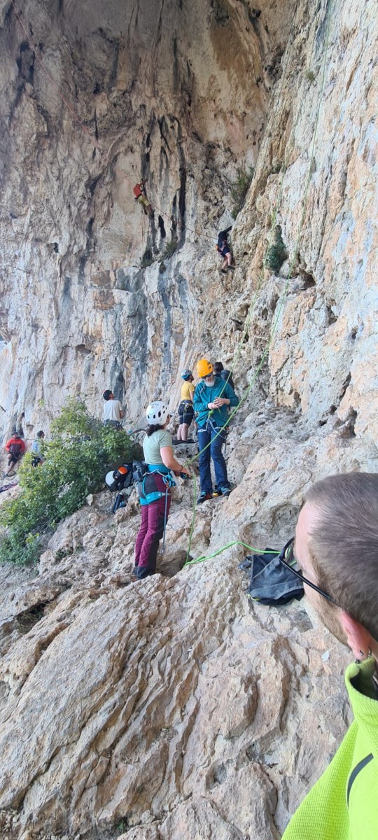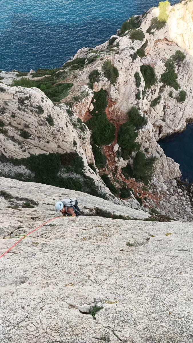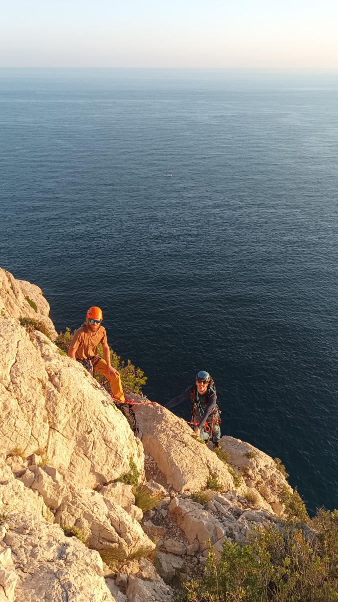 Pendant tout ce temps, le soleil a eu le temps de nous rattraper et nous d’admirer les performances des cordées à notre droite. Sandrine, en experte qu’elle est devenue mais qui a choisi la sagesse dans une voie facile pour elle et pour son dos douloureux, trainant des Djé et Alexis blessés, avale les longueurs dans s abonne humeur communicative. Derrière, Saliha a choisi (ou a été forcée !) de partir en tête dans la L1 et nous la regardons galérer un moment avant d’abandonner. Jean-Luc prend le relais parce que sa patience, si légendaire soit-elle, ne dépasse pas l’idée de finir à la nuit. Alexis lui aussi avait patiemment attendu au dessus et à mi chemin, il décide de changer de cordée pour aider Saliha dans les moments difficiles. Ca c’est l’esprit Dragon !
