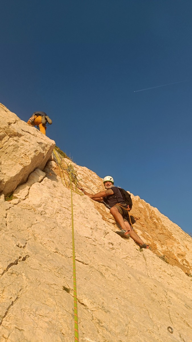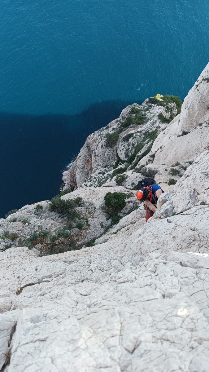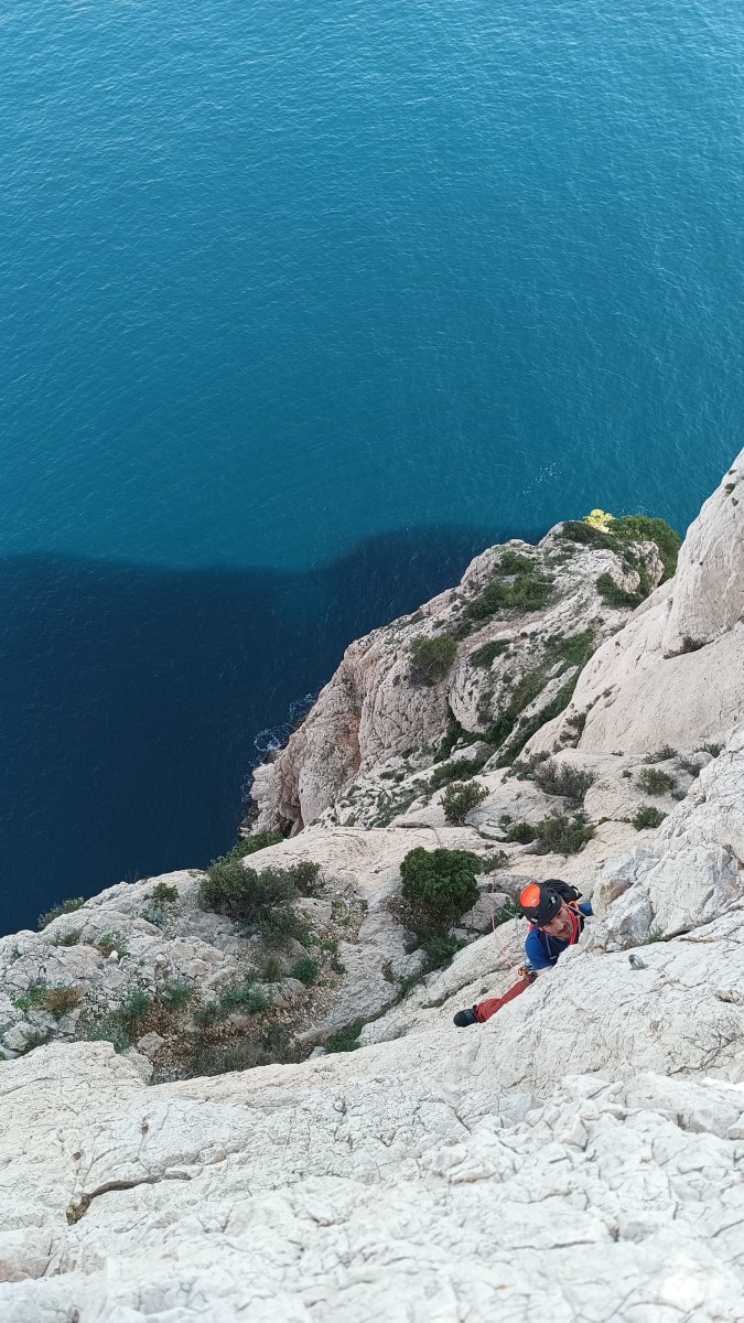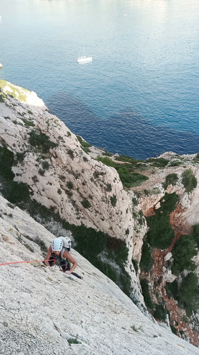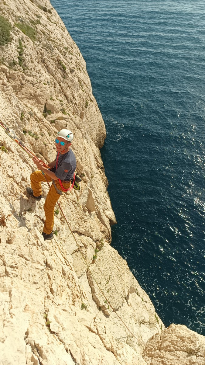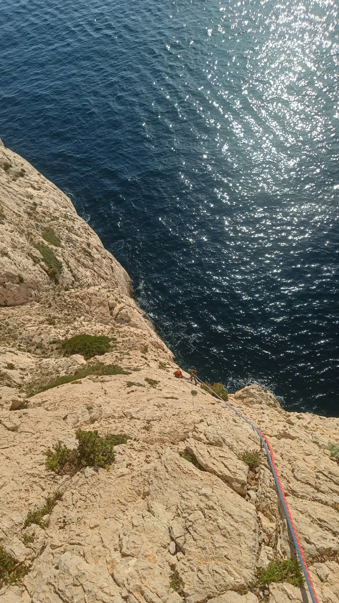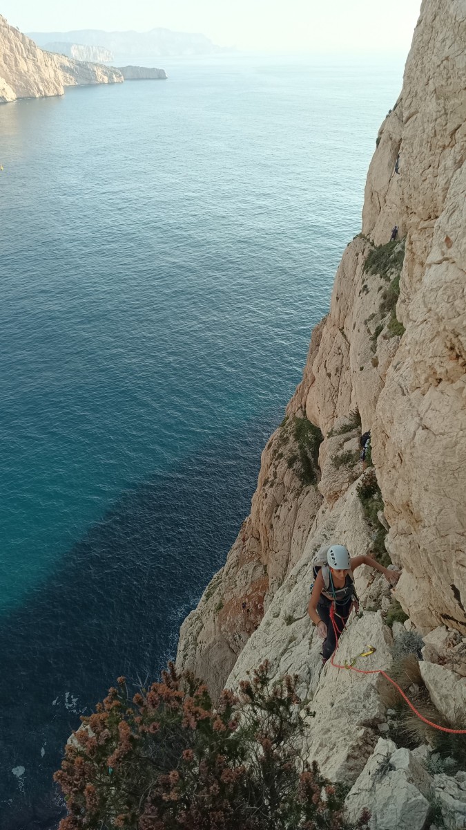 Pendant tout ce temps, le soleil a eu le temps de nous rattraper et nous d’admirer les performances des cordées à notre droite. Sandrine, en experte qu’elle est devenue mais qui a choisi la sagesse dans une voie facile pour elle et pour son dos douloureux, trainant des Djé et Alexis blessés, avale les longueurs dans s abonne humeur communicative. Derrière, Saliha a choisi (ou a été forcée !) de partir en tête dans la L1 et nous la regardons galérer un moment avant d’abandonner. Jean-Luc prend le relais parce que sa patience, si légendaire soit-elle, ne dépasse pas l’idée de finir à la nuit. Alexis lui aussi avait patiemment attendu au dessus et à mi chemin, il décide de changer de cordée pour aider Saliha dans les moments difficiles. Ca c’est l’esprit Dragon !