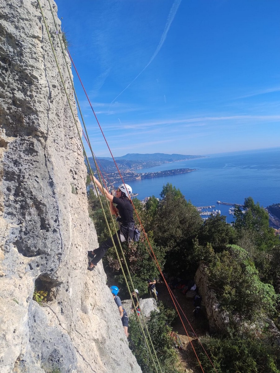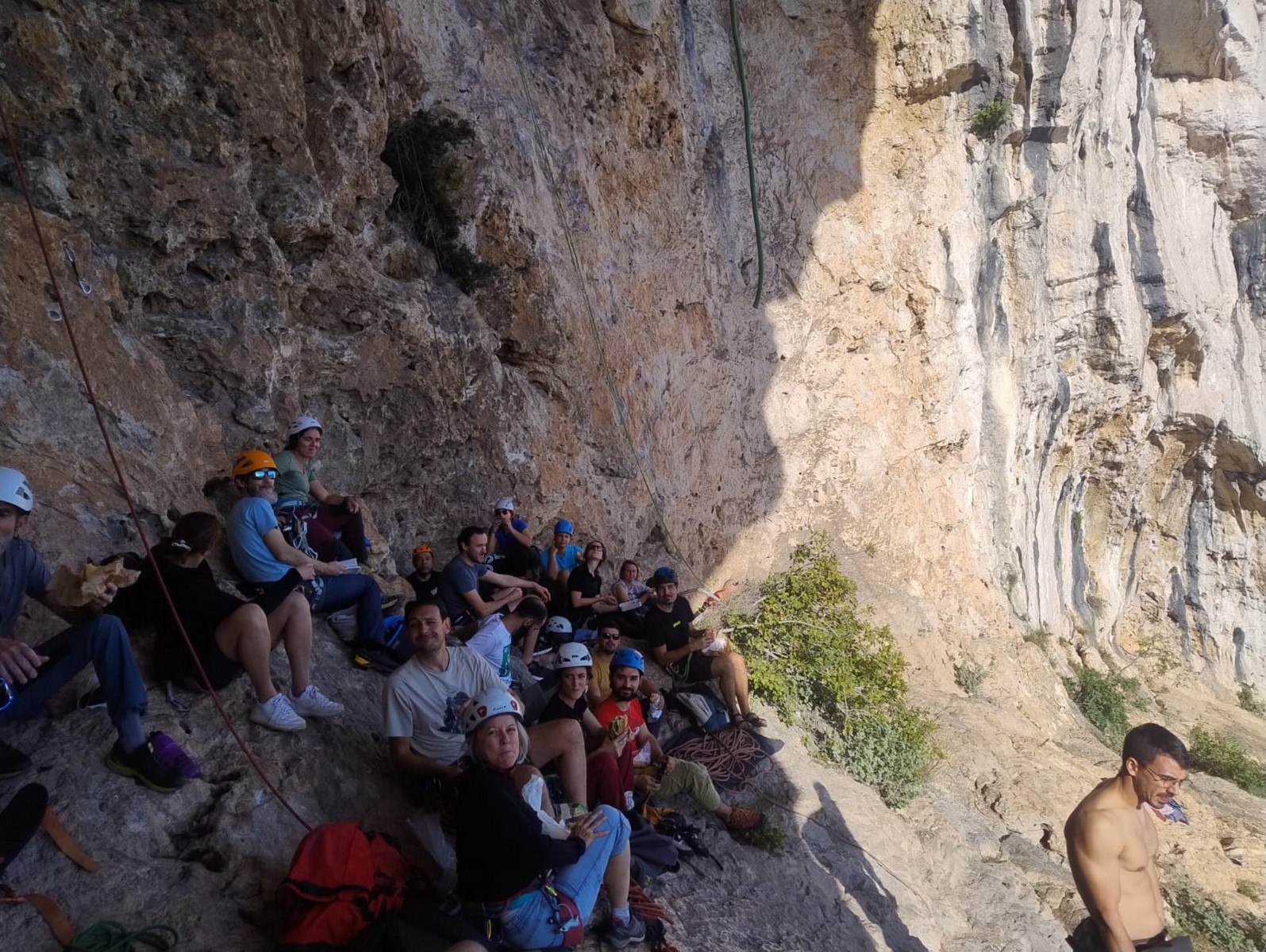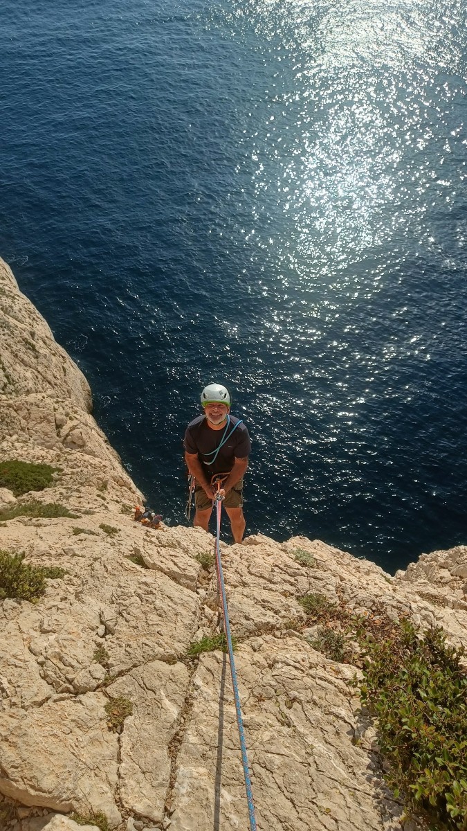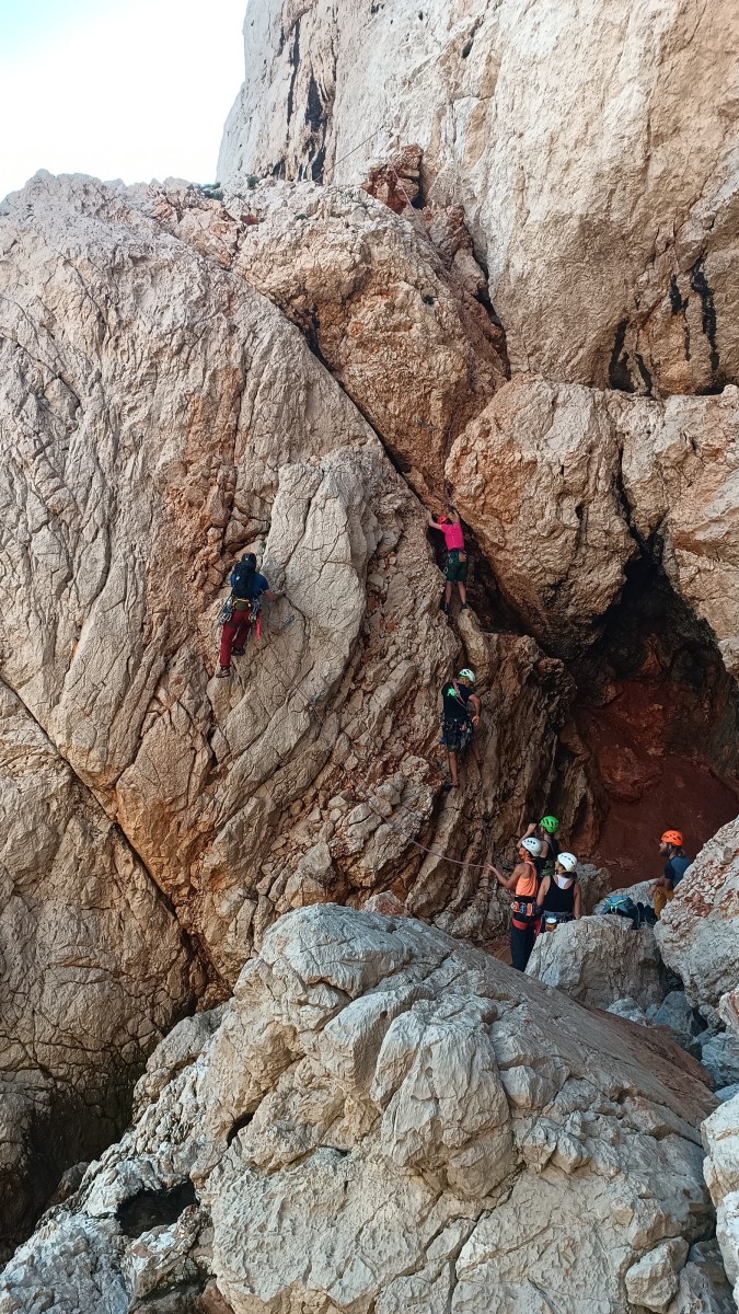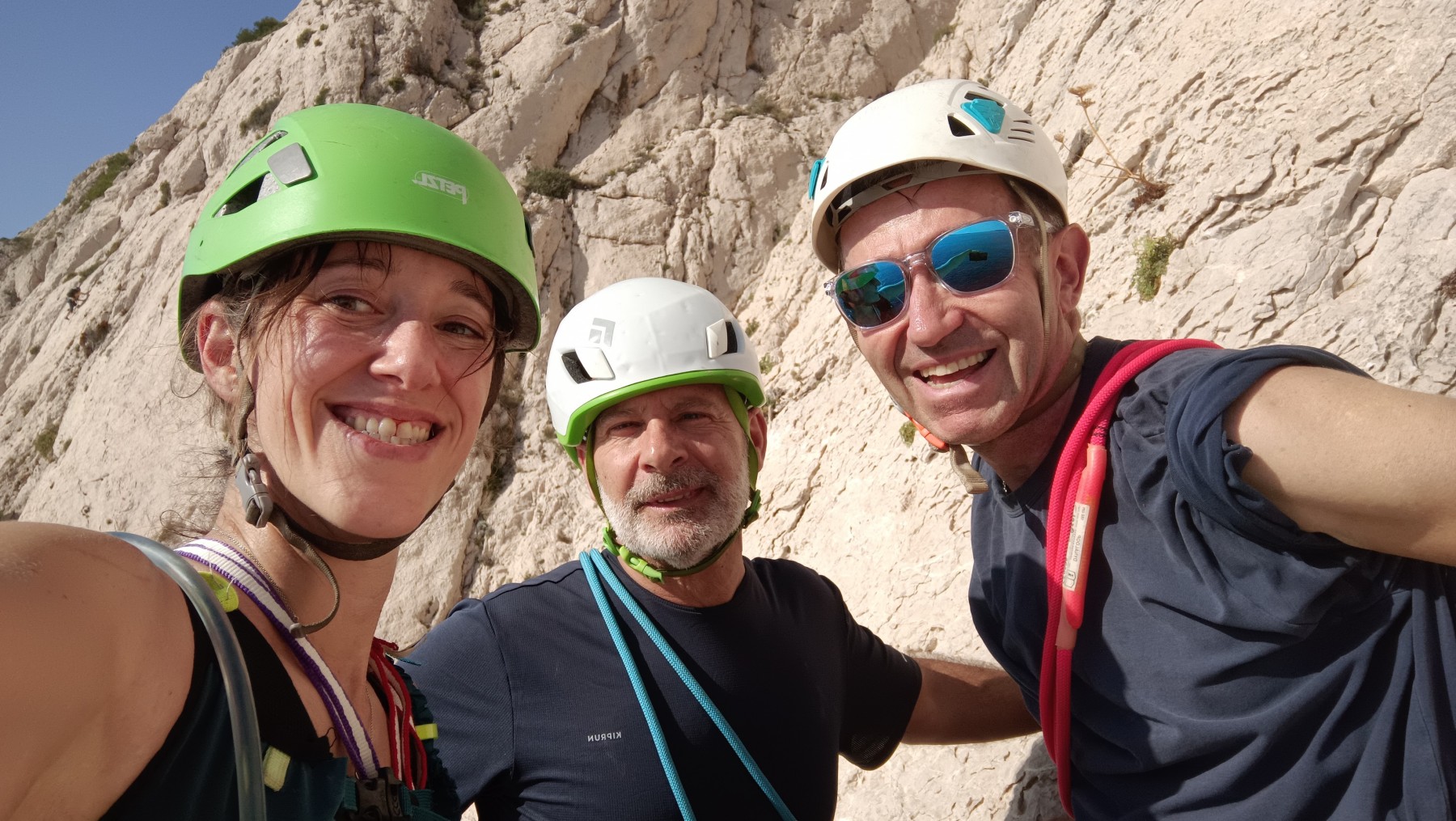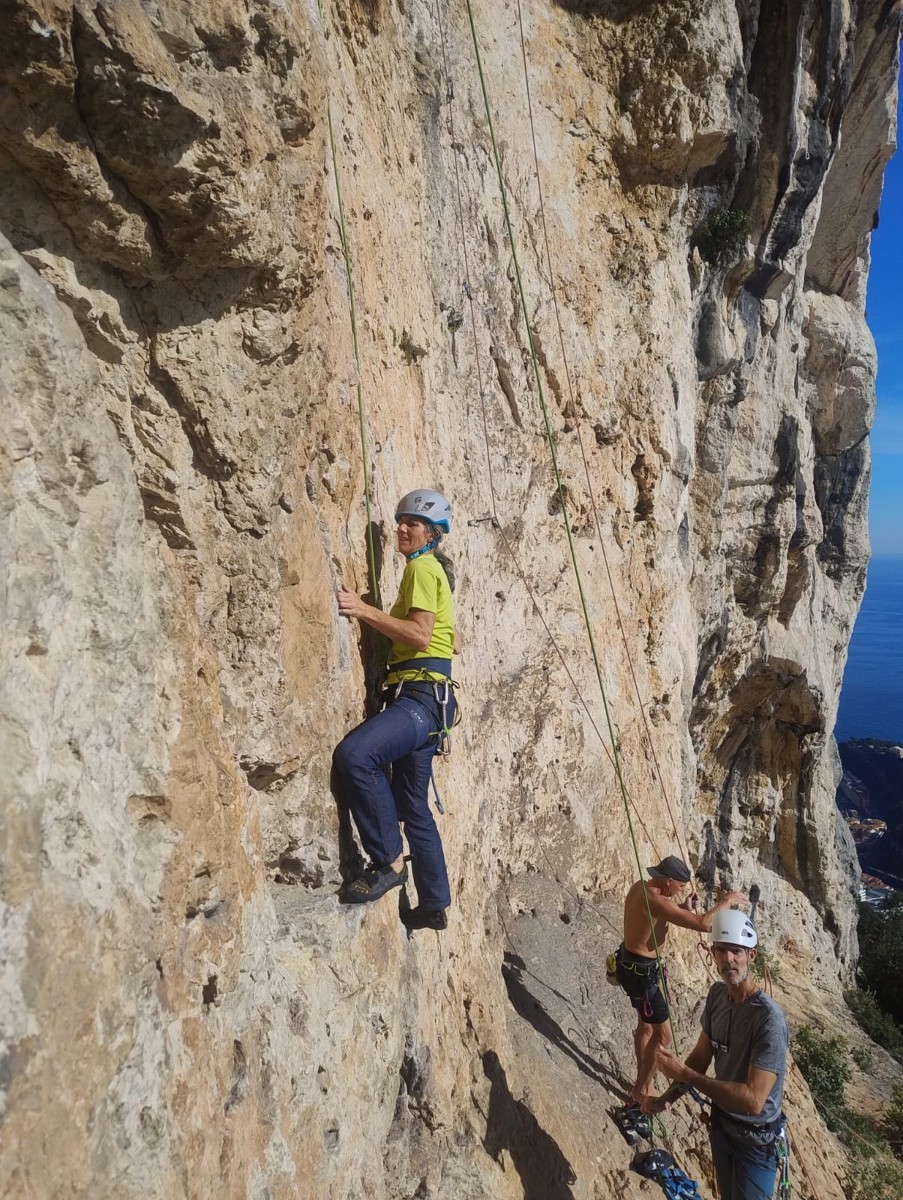Pendant tout ce temps, le soleil a eu le temps de nous rattraper et nous d’admirer les performances des cordées à notre droite. Sandrine, en experte qu’elle est devenue mais qui a choisi la sagesse dans une voie facile pour elle et pour son dos douloureux, trainant des Djé et Alexis blessés, avale les longueurs dans s abonne humeur communicative. Derrière, Saliha a choisi (ou a été forcée !) de partir en tête dans la L1 et nous la regardons galérer un moment avant d’abandonner. Jean-Luc prend le relais parce que sa patience, si légendaire soit-elle, ne dépasse pas l’idée de finir à la nuit. Alexis lui aussi avait patiemment attendu au dessus et à mi chemin, il décide de changer de cordée pour aider Saliha dans les moments difficiles. Ca c’est l’esprit Dragon !