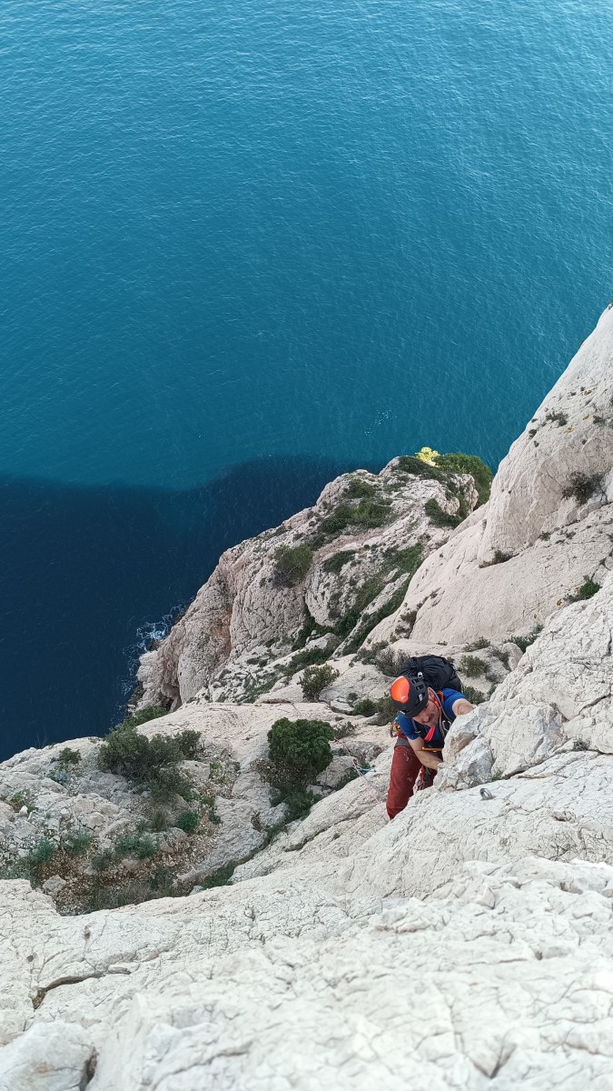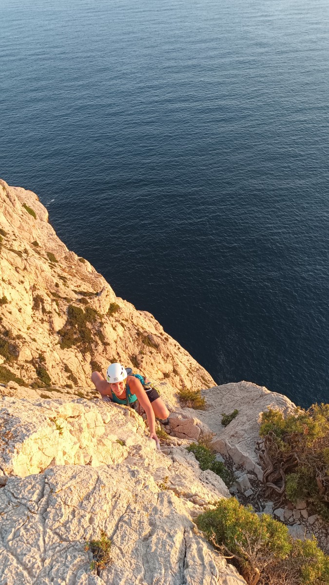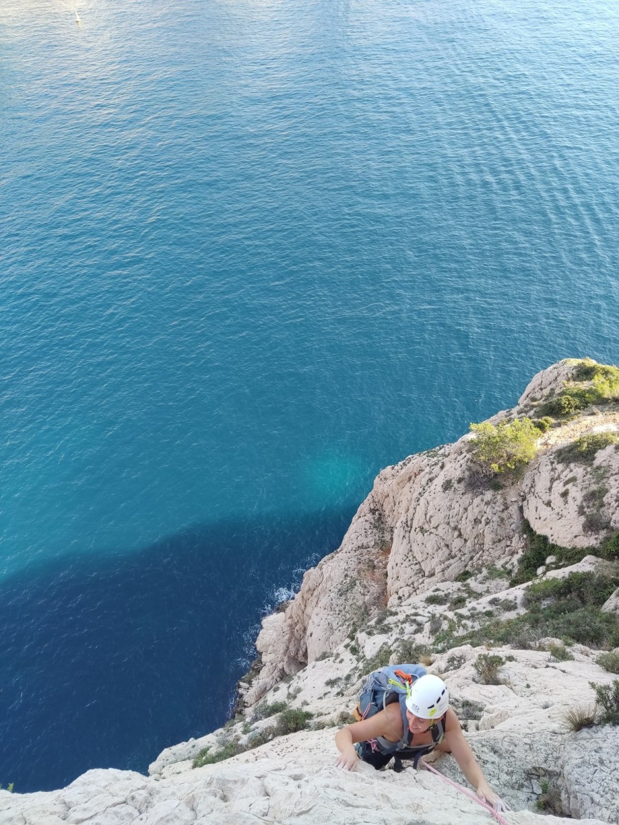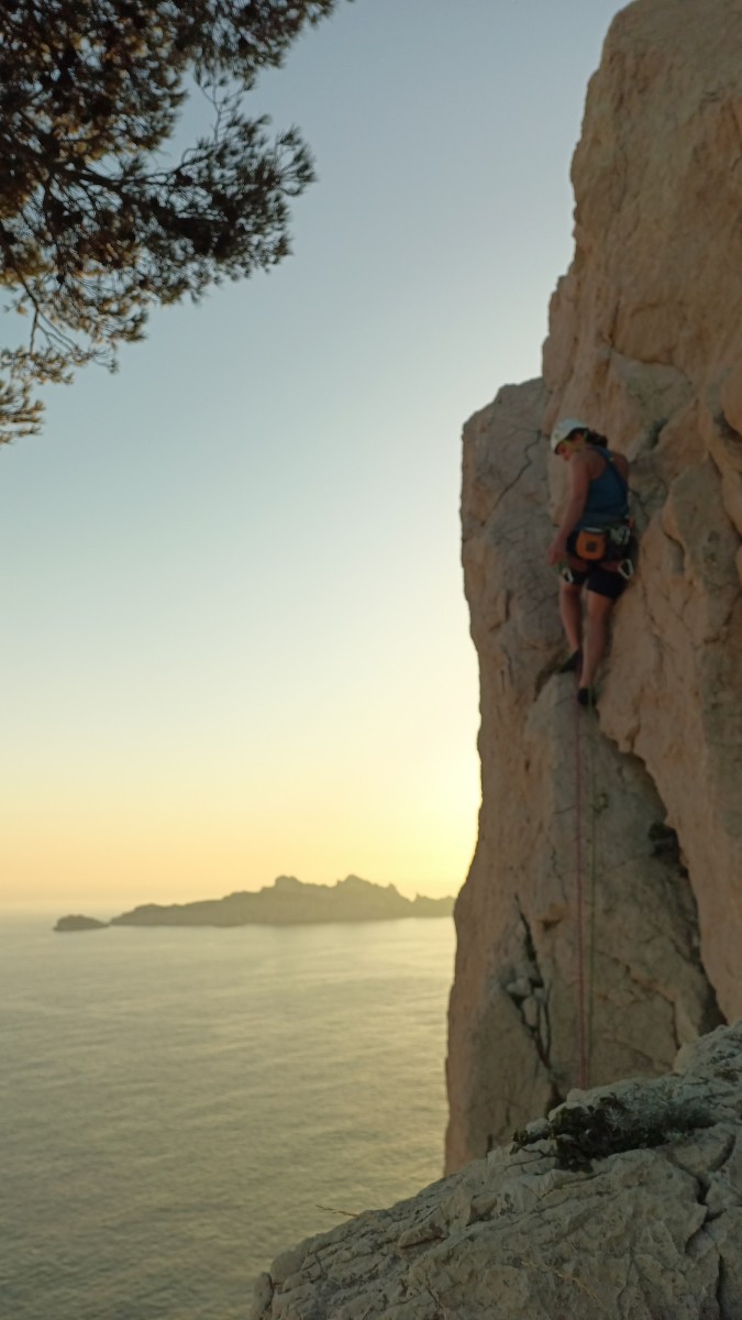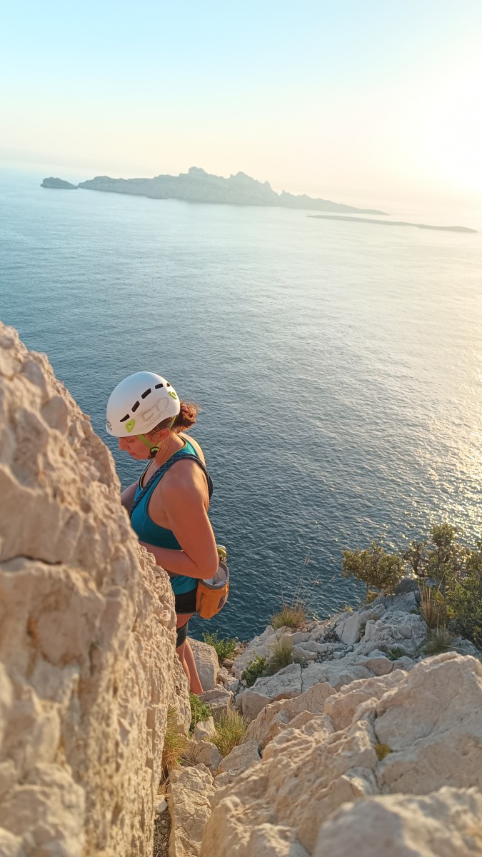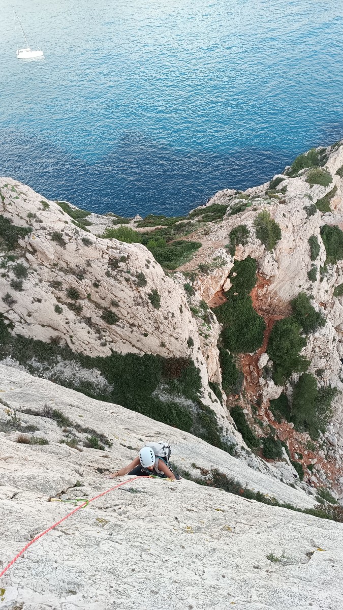Pendant tout ce temps, le soleil a eu le temps de nous rattraper et nous d’admirer les performances des cordées à notre droite. Sandrine, en experte qu’elle est devenue mais qui a choisi la sagesse dans une voie facile pour elle et pour son dos douloureux, trainant des Djé et Alexis blessés, avale les longueurs dans s abonne humeur communicative. Derrière, Saliha a choisi (ou a été forcée !) de partir en tête dans la L1 et nous la regardons galérer un moment avant d’abandonner. Jean-Luc prend le relais parce que sa patience, si légendaire soit-elle, ne dépasse pas l’idée de finir à la nuit. Alexis lui aussi avait patiemment attendu au dessus et à mi chemin, il décide de changer de cordée pour aider Saliha dans les moments difficiles. Ca c’est l’esprit Dragon !