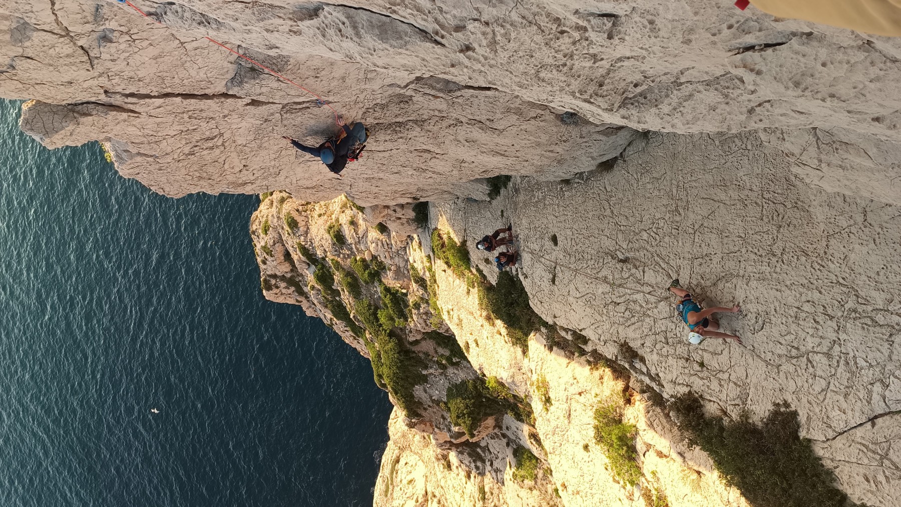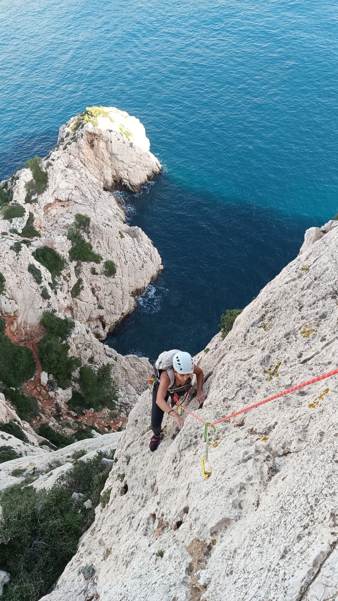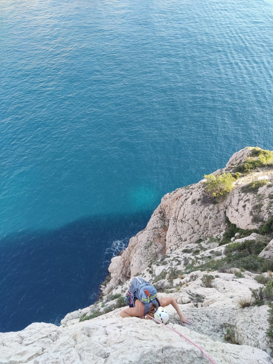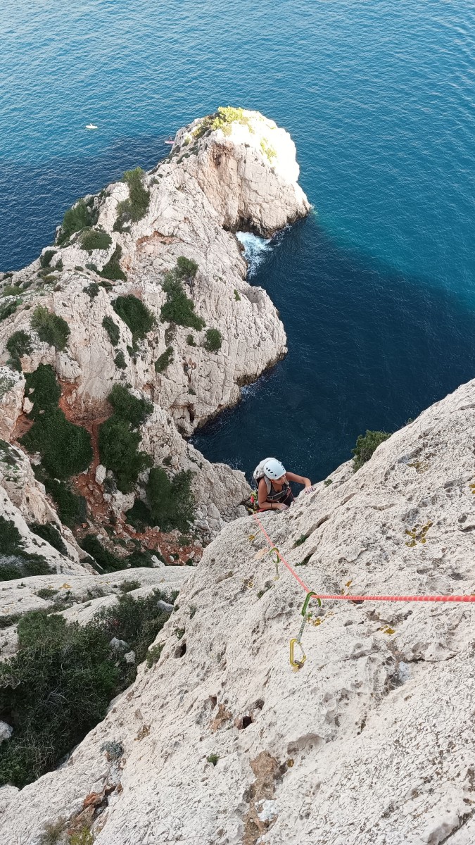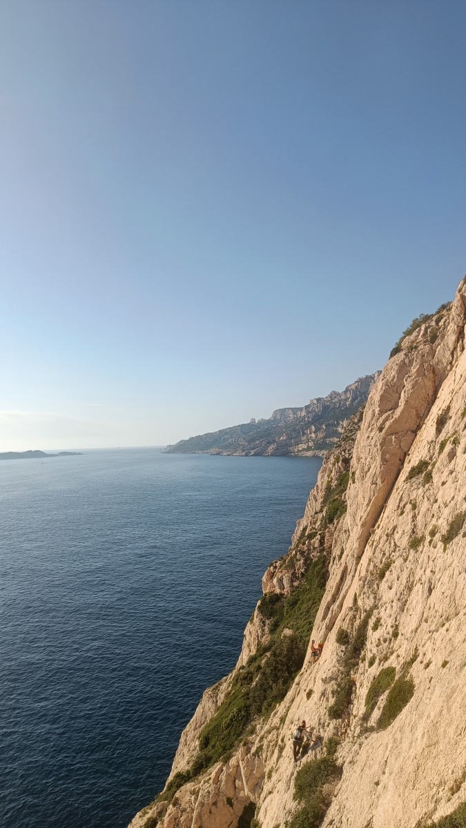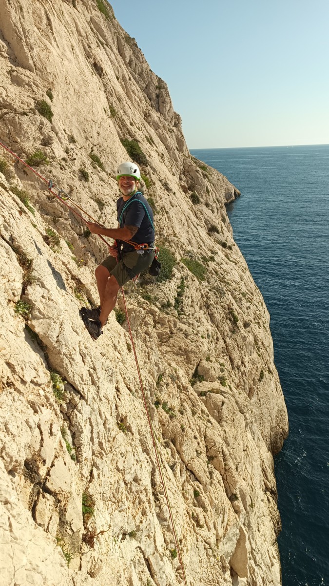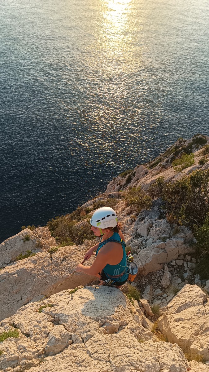 Pendant tout ce temps, le soleil a eu le temps de nous rattraper et nous d’admirer les performances des cordées à notre droite. Sandrine, en experte qu’elle est devenue mais qui a choisi la sagesse dans une voie facile pour elle et pour son dos douloureux, trainant des Djé et Alexis blessés, avale les longueurs dans s abonne humeur communicative. Derrière, Saliha a choisi (ou a été forcée !) de partir en tête dans la L1 et nous la regardons galérer un moment avant d’abandonner. Jean-Luc prend le relais parce que sa patience, si légendaire soit-elle, ne dépasse pas l’idée de finir à la nuit. Alexis lui aussi avait patiemment attendu au dessus et à mi chemin, il décide de changer de cordée pour aider Saliha dans les moments difficiles. Ca c’est l’esprit Dragon !