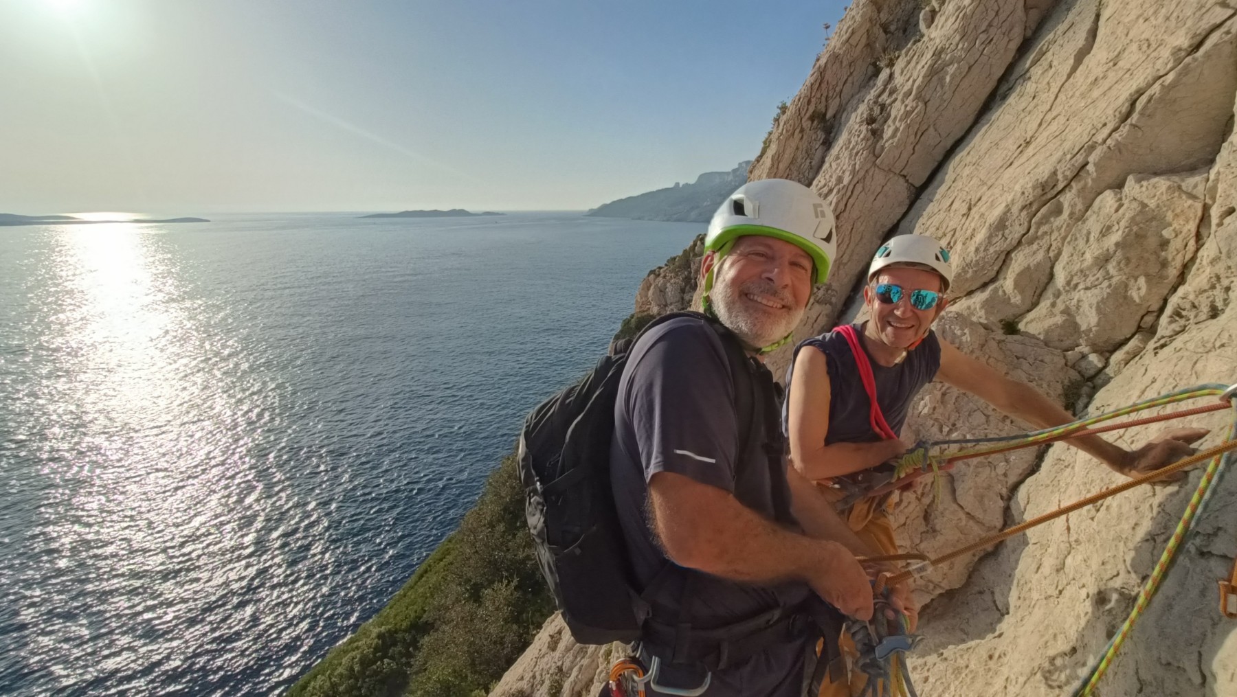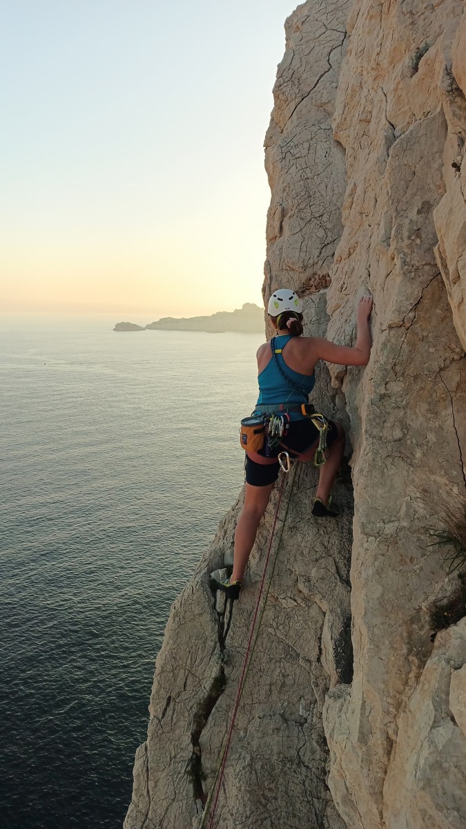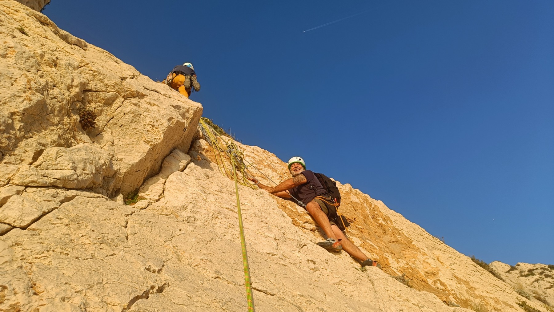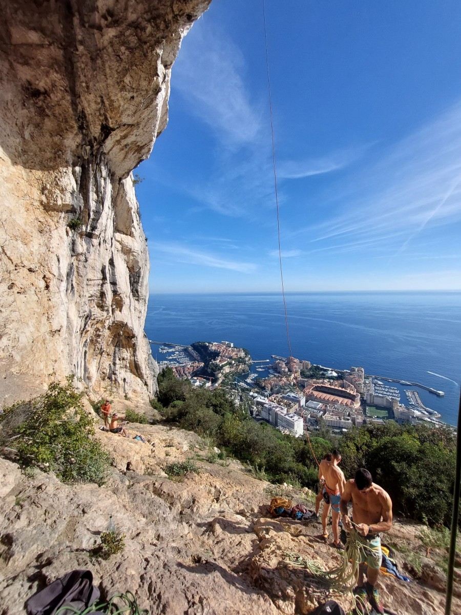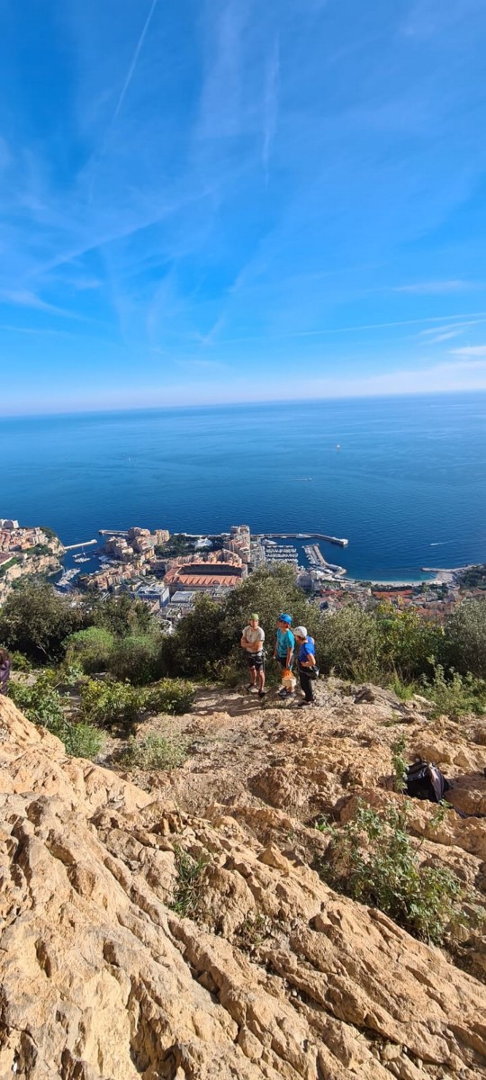 Pendant tout ce temps, le soleil a eu le temps de nous rattraper et nous d’admirer les performances des cordées à notre droite. Sandrine, en experte qu’elle est devenue mais qui a choisi la sagesse dans une voie facile pour elle et pour son dos douloureux, trainant des Djé et Alexis blessés, avale les longueurs dans s abonne humeur communicative. Derrière, Saliha a choisi (ou a été forcée !) de partir en tête dans la L1 et nous la regardons galérer un moment avant d’abandonner. Jean-Luc prend le relais parce que sa patience, si légendaire soit-elle, ne dépasse pas l’idée de finir à la nuit. Alexis lui aussi avait patiemment attendu au dessus et à mi chemin, il décide de changer de cordée pour aider Saliha dans les moments difficiles. Ca c’est l’esprit Dragon !