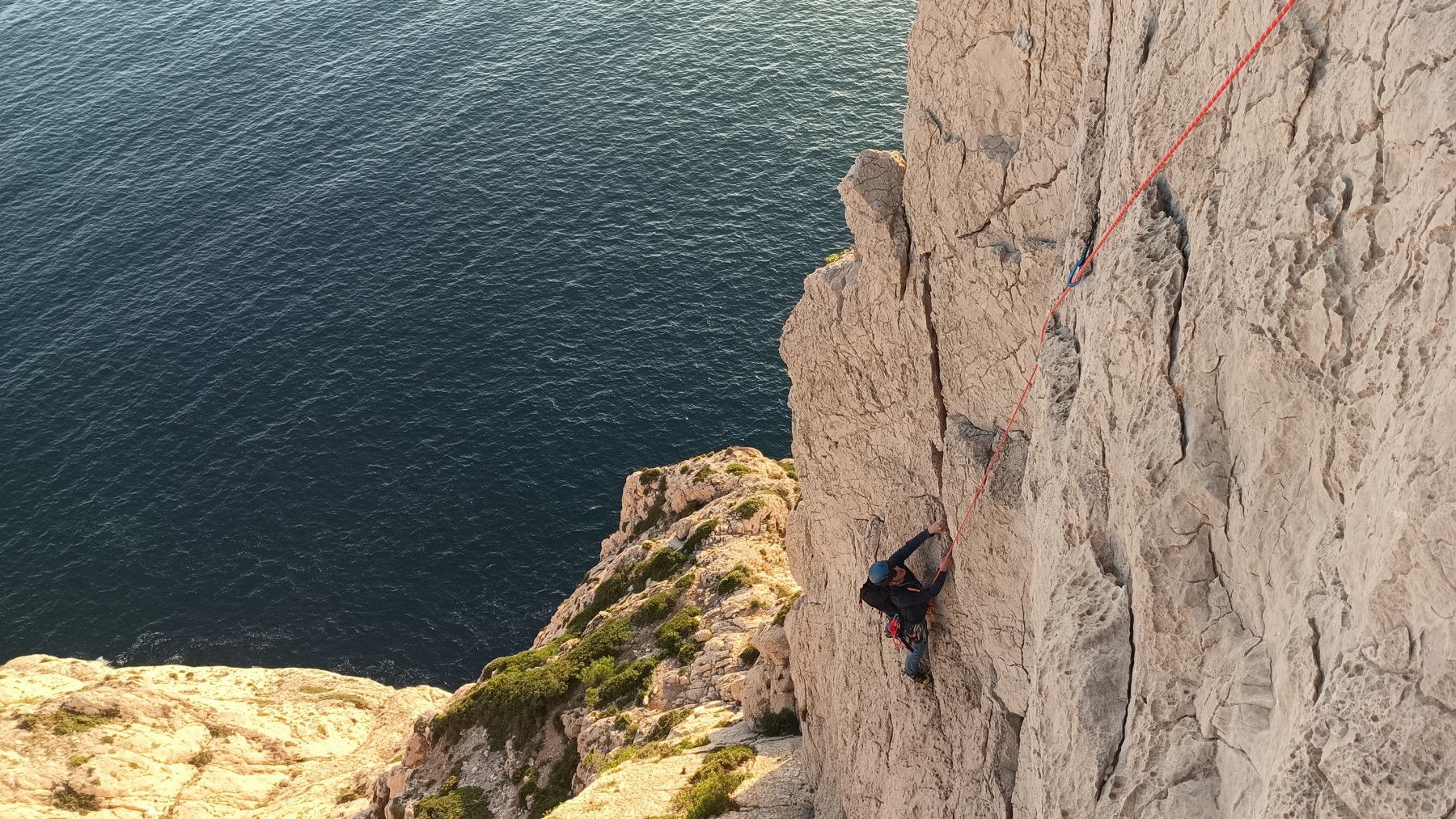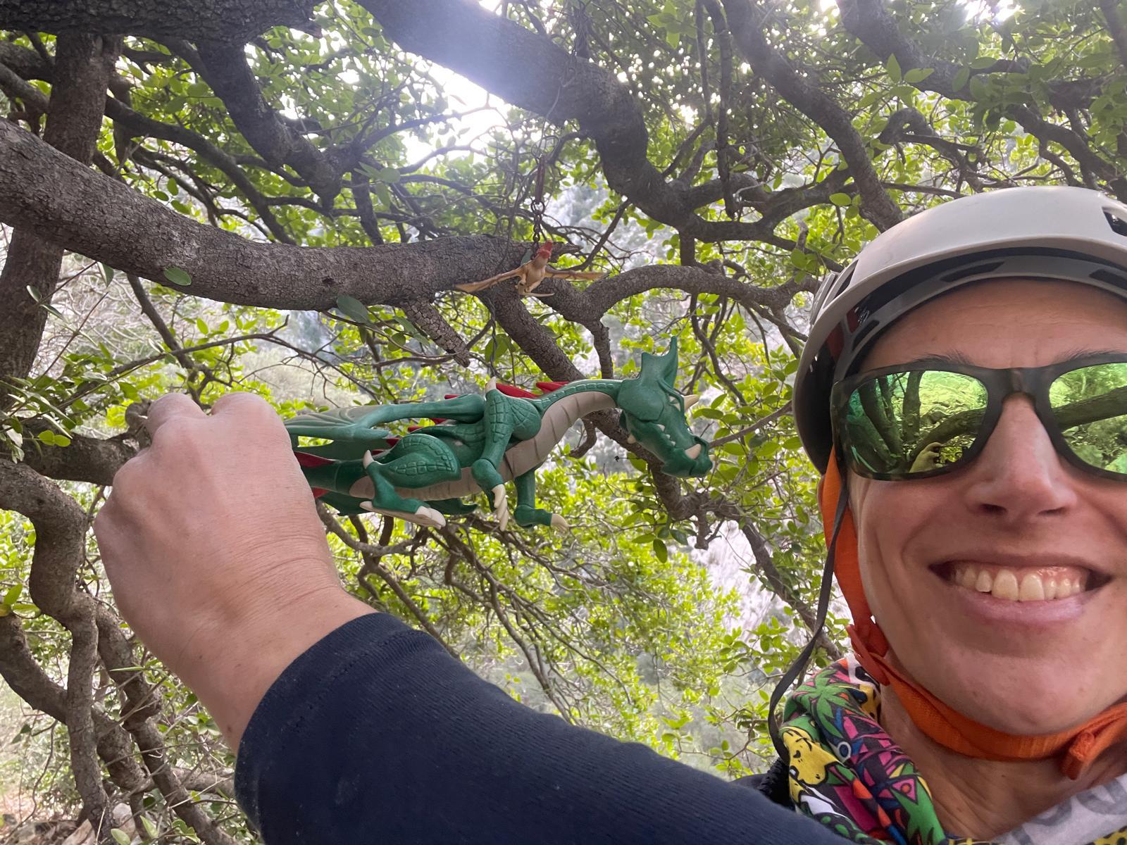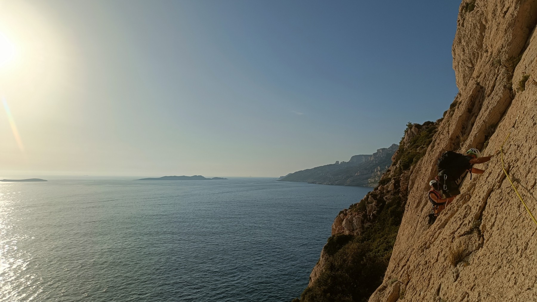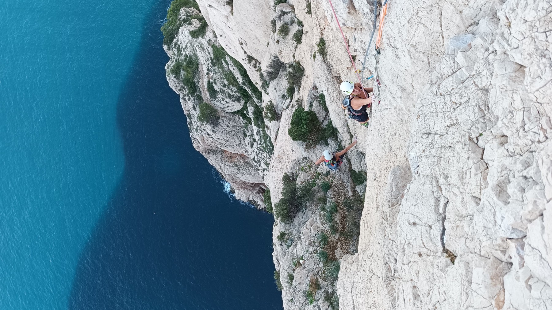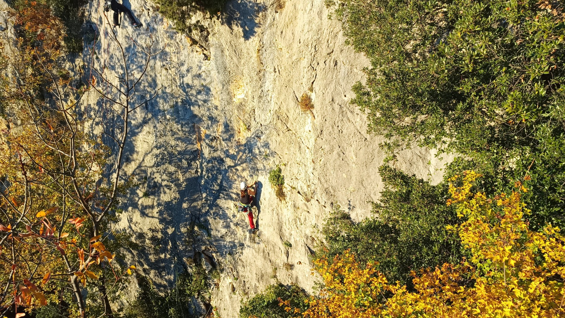 Pendant tout ce temps, le soleil a eu le temps de nous rattraper et nous d’admirer les performances des cordées à notre droite. Sandrine, en experte qu’elle est devenue mais qui a choisi la sagesse dans une voie facile pour elle et pour son dos douloureux, trainant des Djé et Alexis blessés, avale les longueurs dans s abonne humeur communicative. Derrière, Saliha a choisi (ou a été forcée !) de partir en tête dans la L1 et nous la regardons galérer un moment avant d’abandonner. Jean-Luc prend le relais parce que sa patience, si légendaire soit-elle, ne dépasse pas l’idée de finir à la nuit. Alexis lui aussi avait patiemment attendu au dessus et à mi chemin, il décide de changer de cordée pour aider Saliha dans les moments difficiles. Ca c’est l’esprit Dragon !
