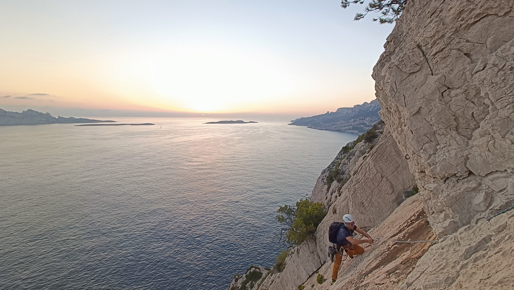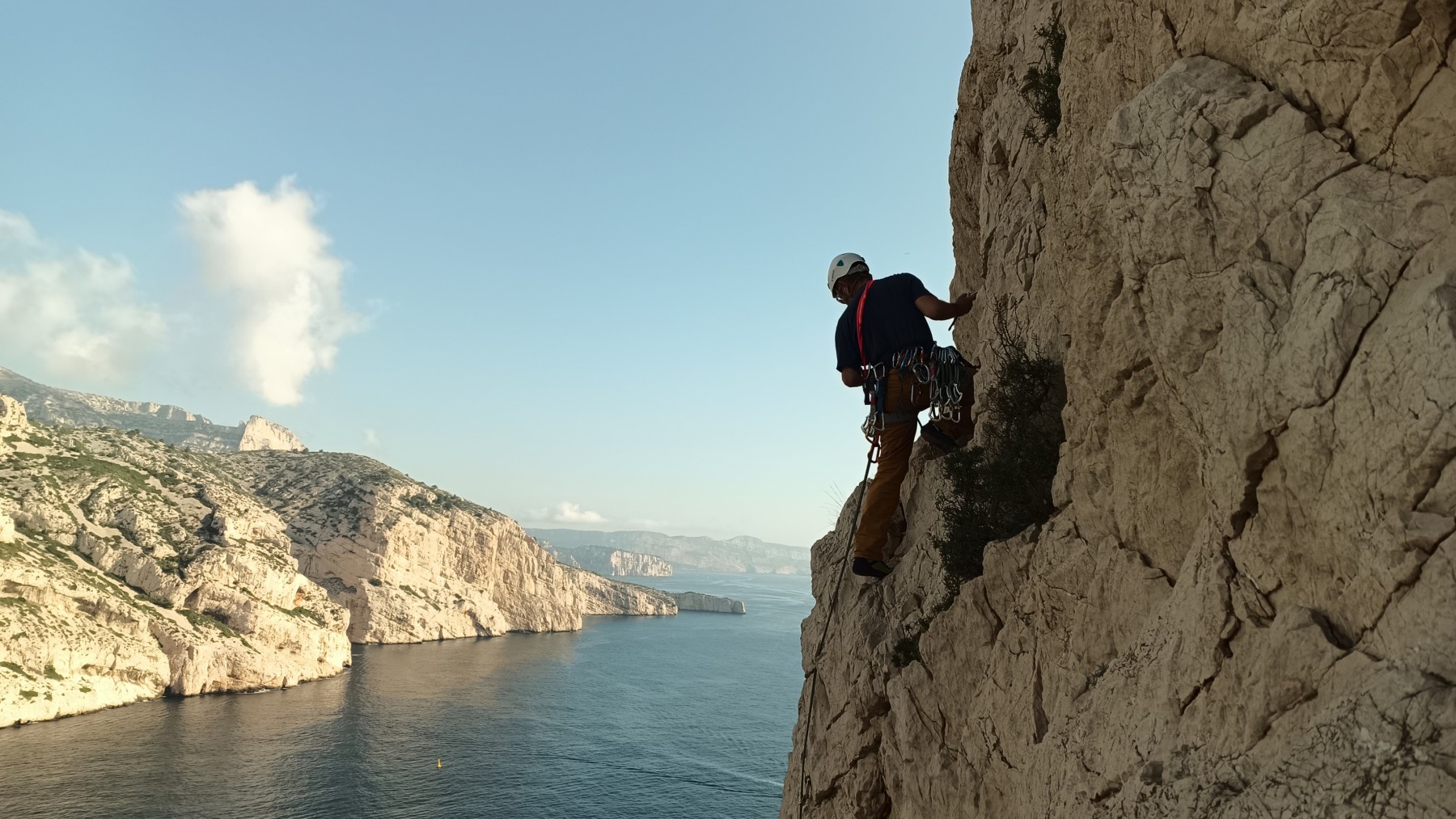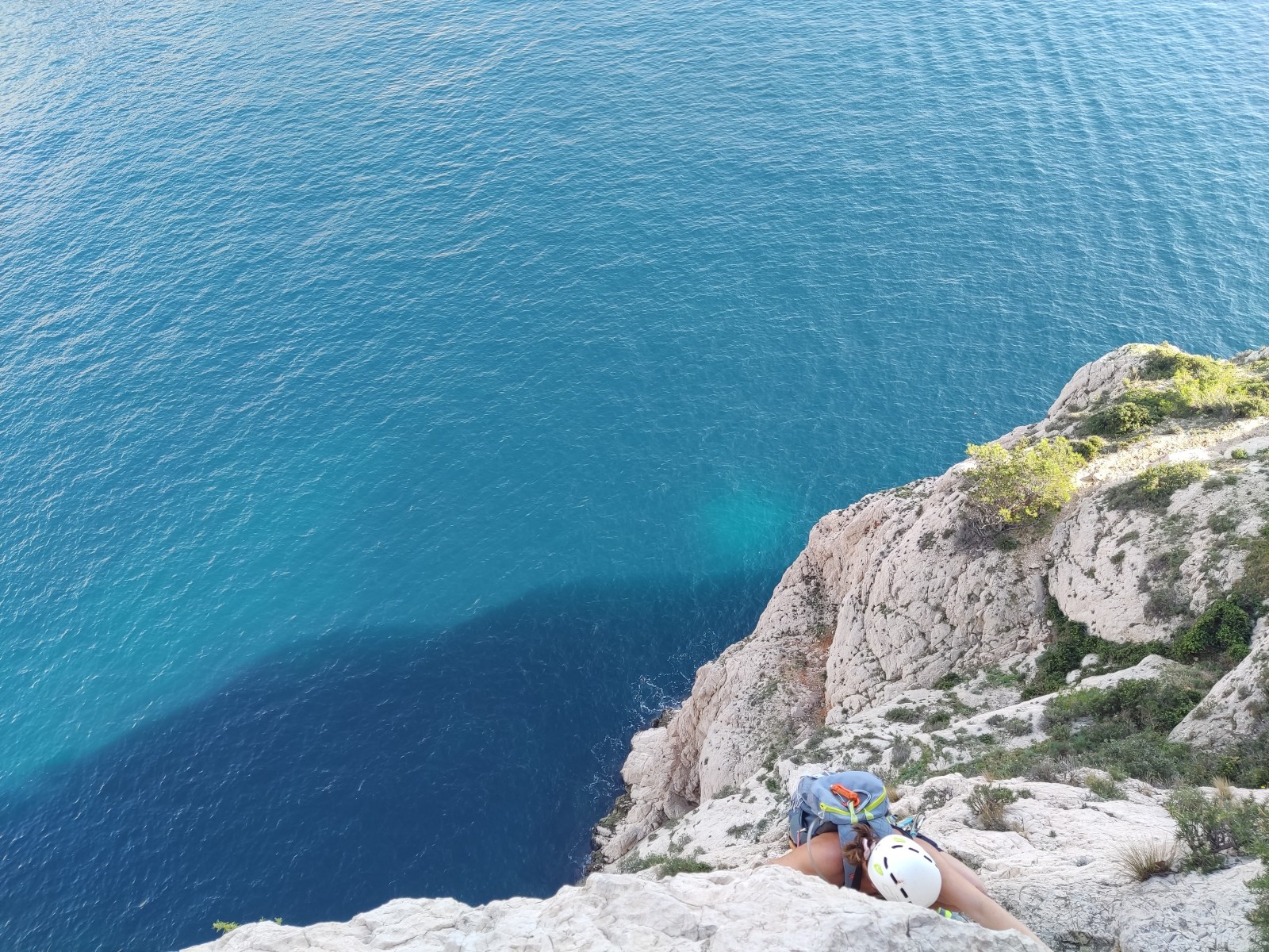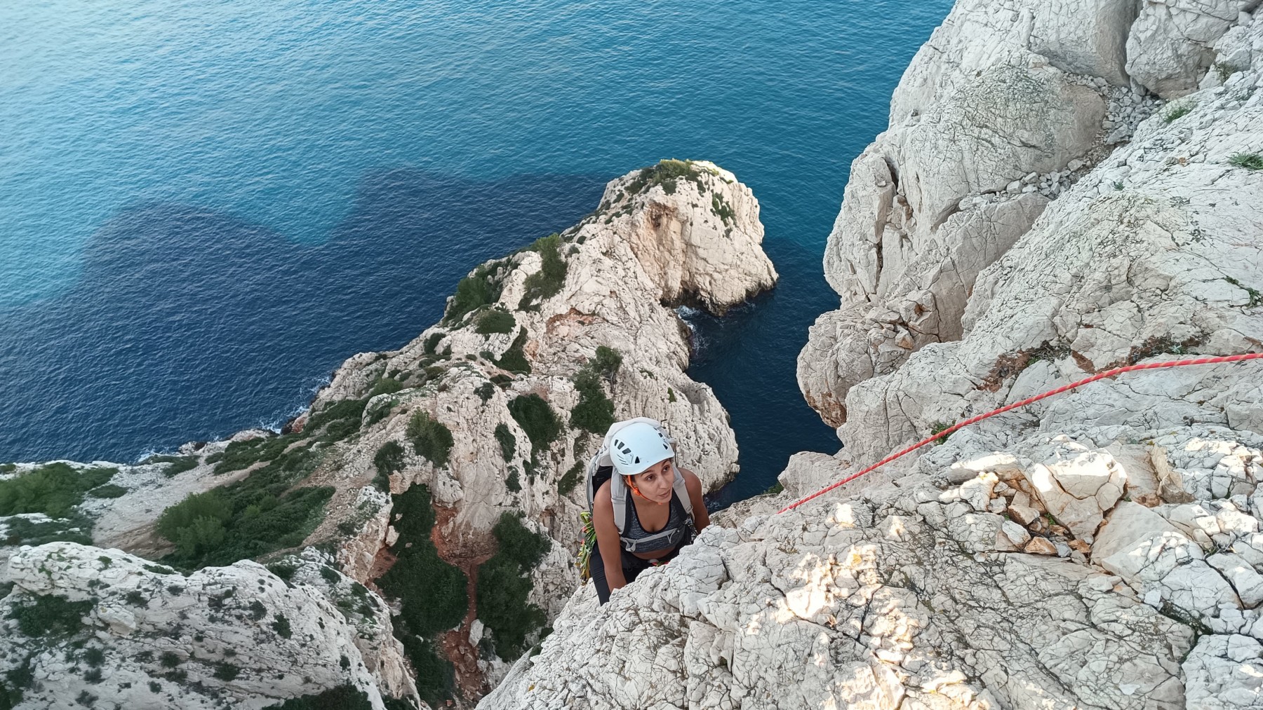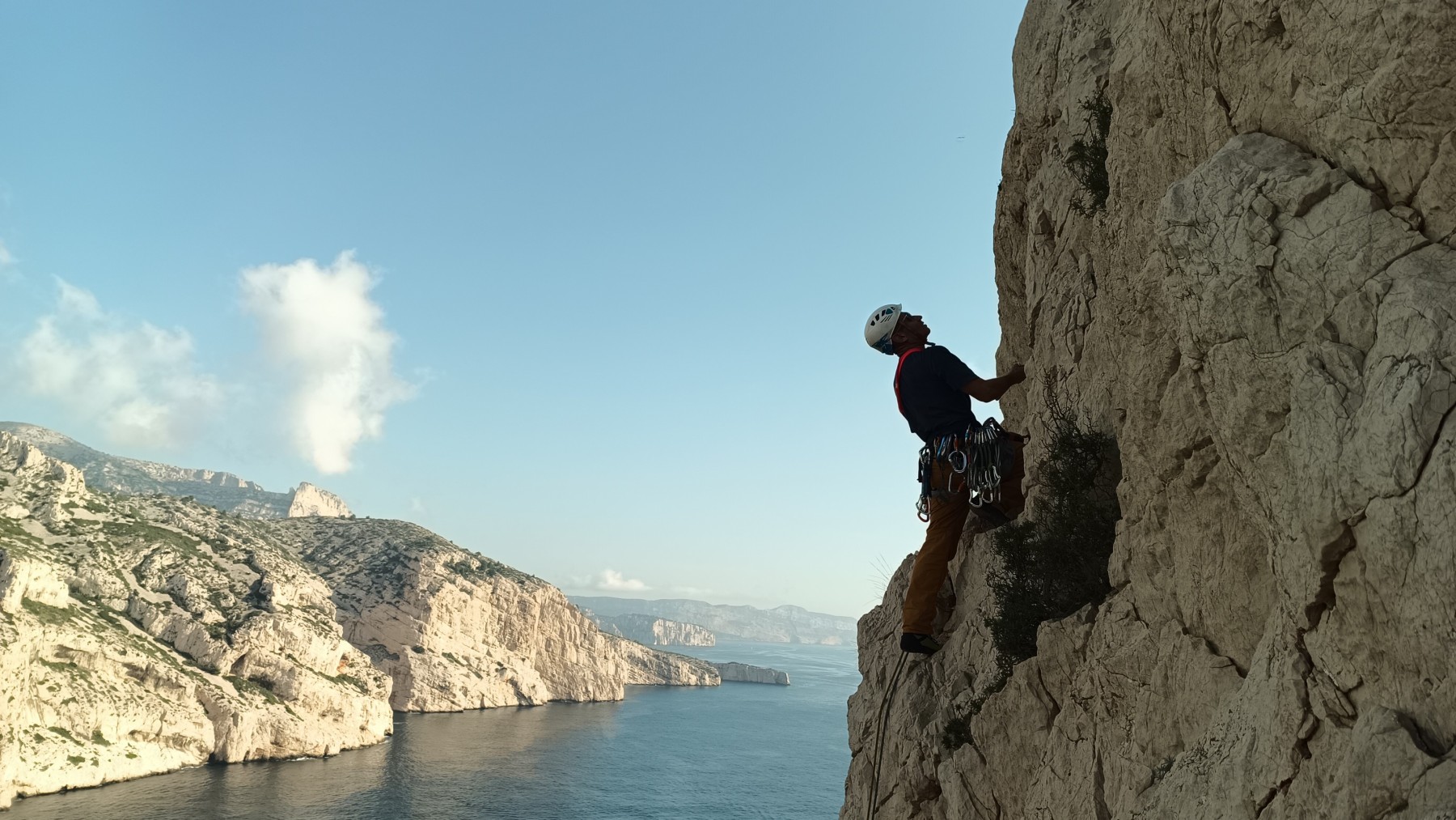 Pendant tout ce temps, le soleil a eu le temps de nous rattraper et nous d’admirer les performances des cordées à notre droite. Sandrine, en experte qu’elle est devenue mais qui a choisi la sagesse dans une voie facile pour elle et pour son dos douloureux, trainant des Djé et Alexis blessés, avale les longueurs dans s abonne humeur communicative. Derrière, Saliha a choisi (ou a été forcée !) de partir en tête dans la L1 et nous la regardons galérer un moment avant d’abandonner. Jean-Luc prend le relais parce que sa patience, si légendaire soit-elle, ne dépasse pas l’idée de finir à la nuit. Alexis lui aussi avait patiemment attendu au dessus et à mi chemin, il décide de changer de cordée pour aider Saliha dans les moments difficiles. Ca c’est l’esprit Dragon !
