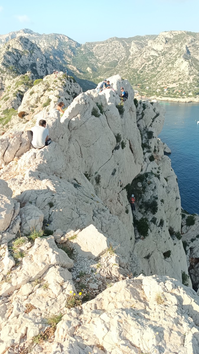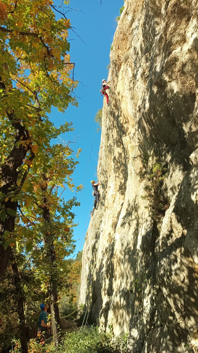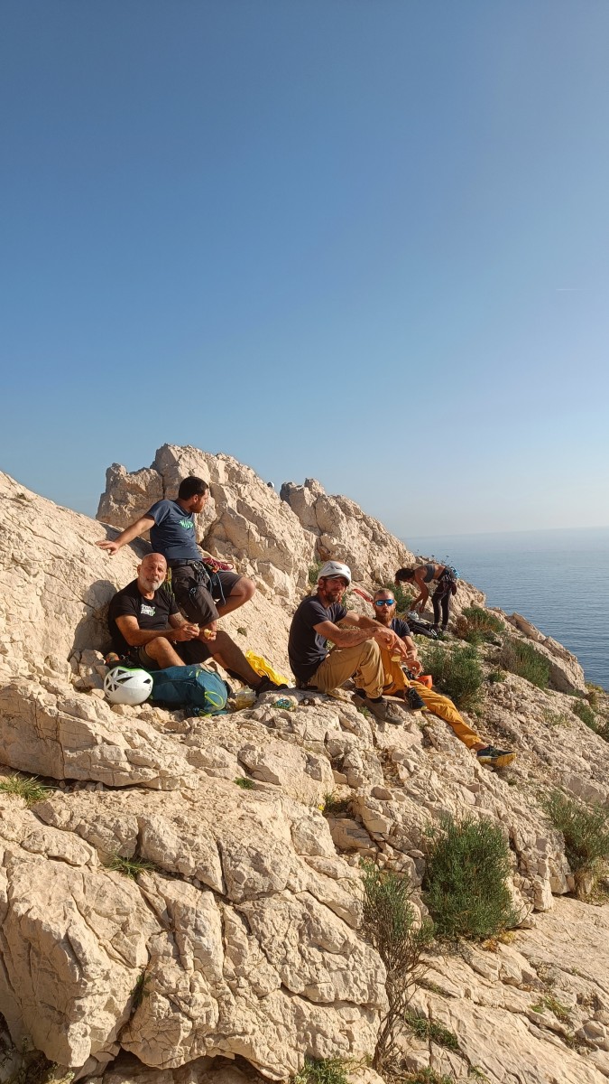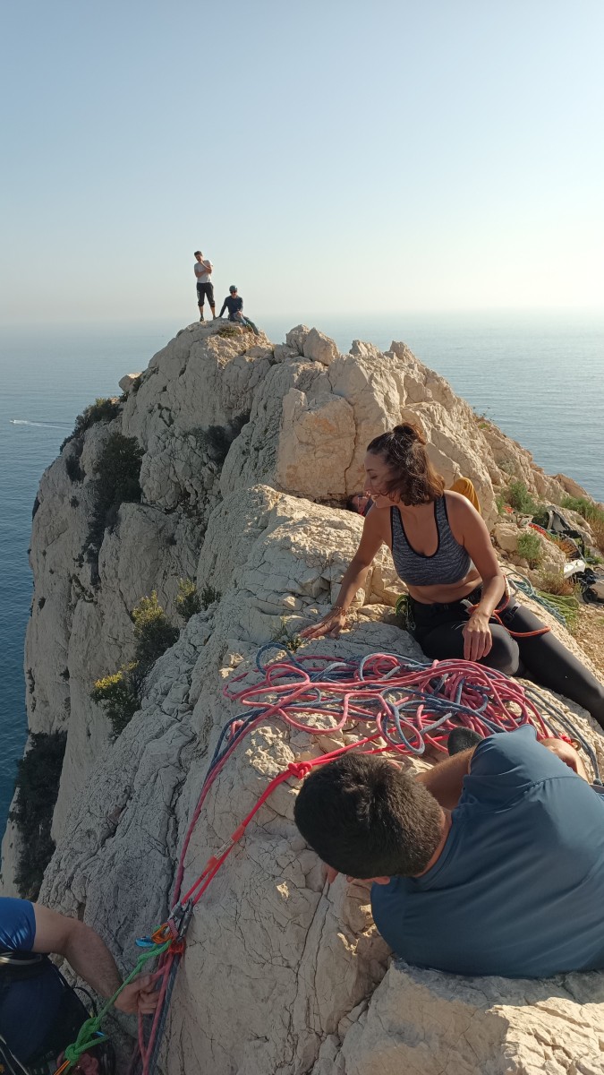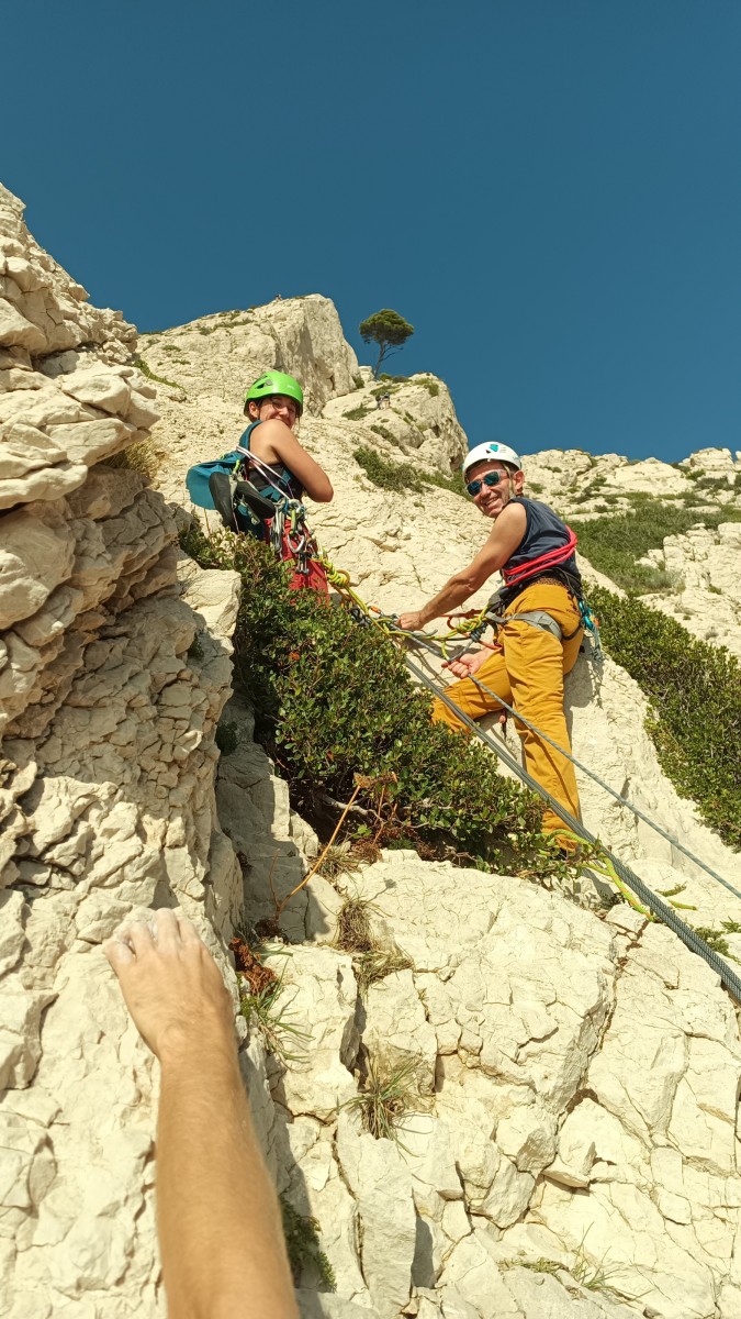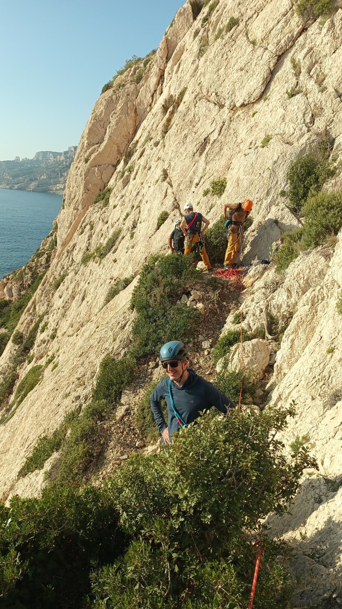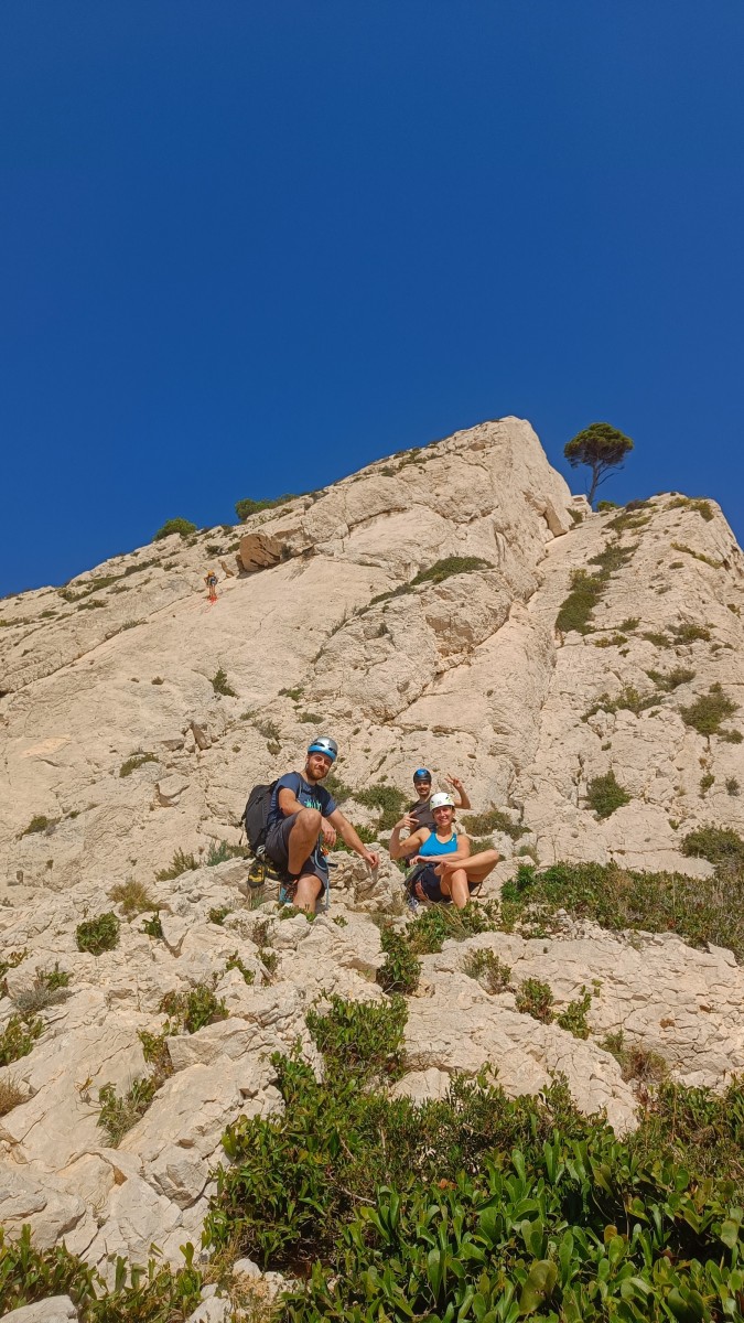 Chez nous, après un peu d’attente au R1 ou R2, ça déroule un peu plus. Roxane fait un premier relais classique puis un relais sur arbre dans une longueur de transition. Camille prend le relais sur Gautier dans les longueurs en 6a+ puis 4c et nous voilà tous à la terrasse où, ceux qui n’avaient pas eu la possibilité de manger (on dira qu’ils ont attendu par solidarité ou par peur de représailles) avalent leur sandwich avant de se poser la question existentielle qui s’impose : par quelle voie on sort ?