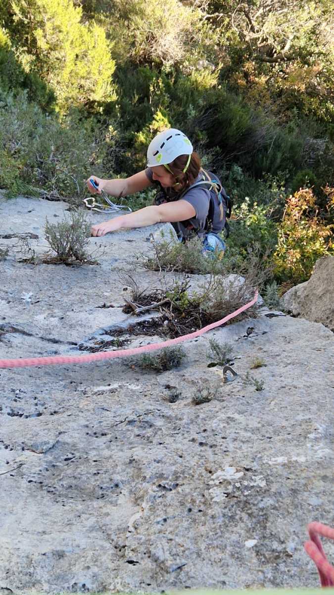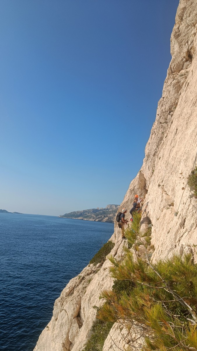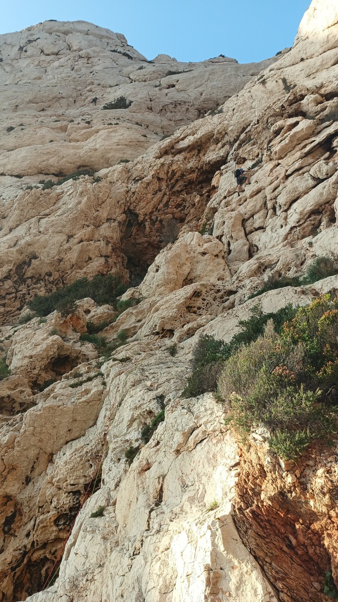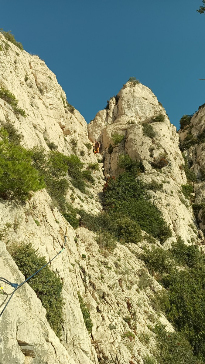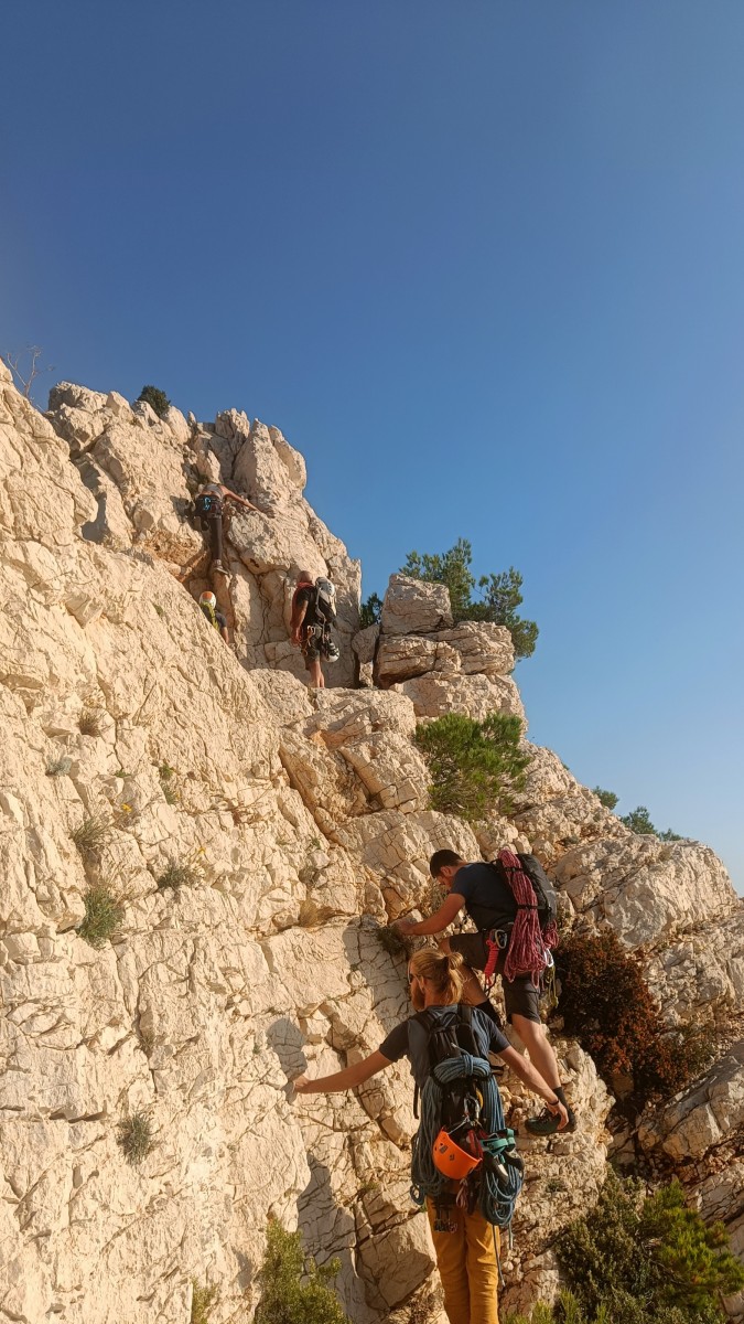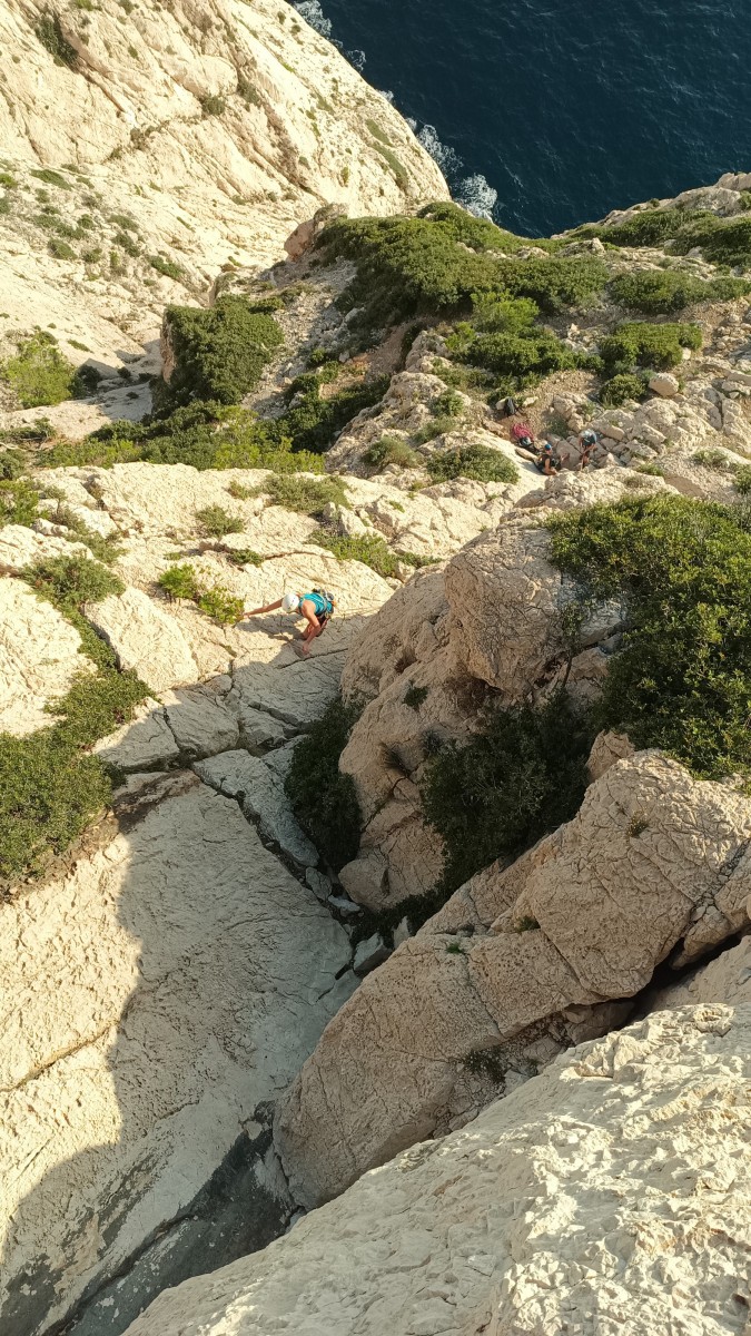 Chez nous, après un peu d’attente au R1 ou R2, ça déroule un peu plus. Roxane fait un premier relais classique puis un relais sur arbre dans une longueur de transition. Camille prend le relais sur Gautier dans les longueurs en 6a+ puis 4c et nous voilà tous à la terrasse où, ceux qui n’avaient pas eu la possibilité de manger (on dira qu’ils ont attendu par solidarité ou par peur de représailles) avalent leur sandwich avant de se poser la question existentielle qui s’impose : par quelle voie on sort ?