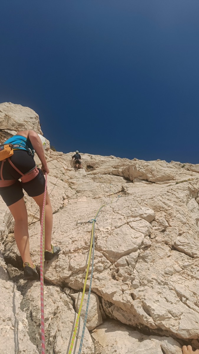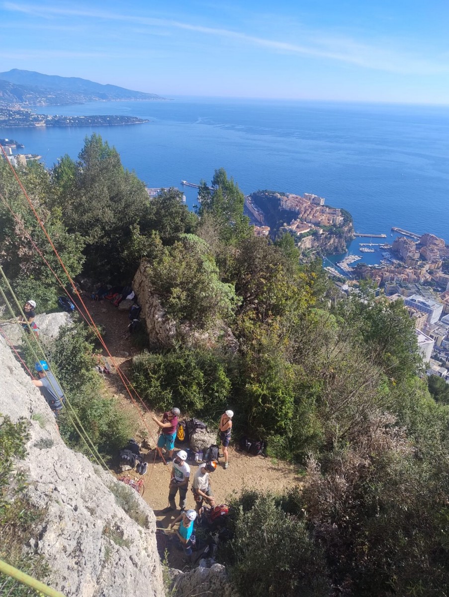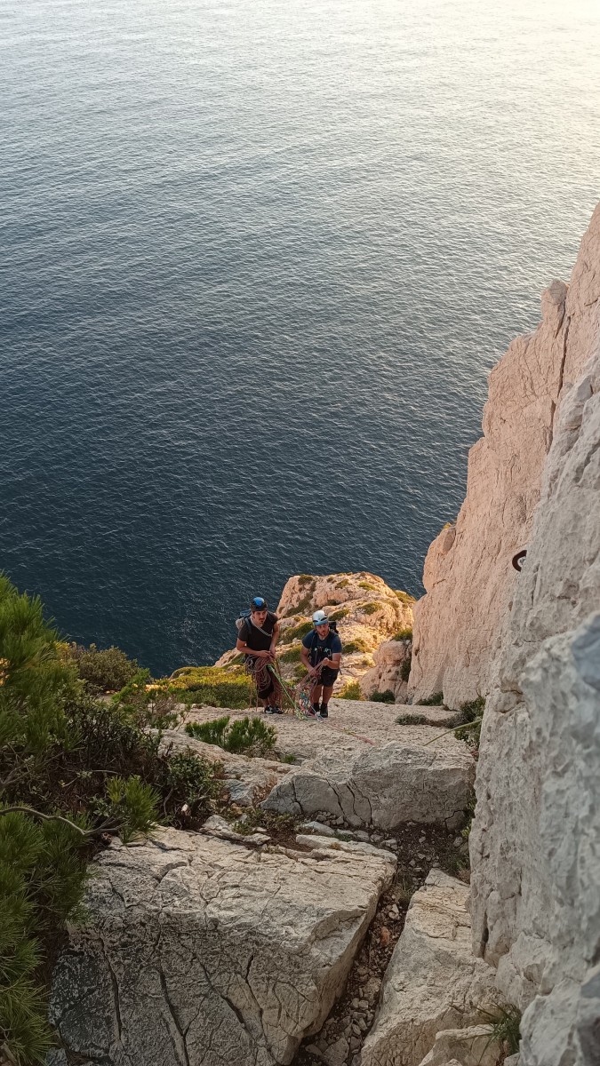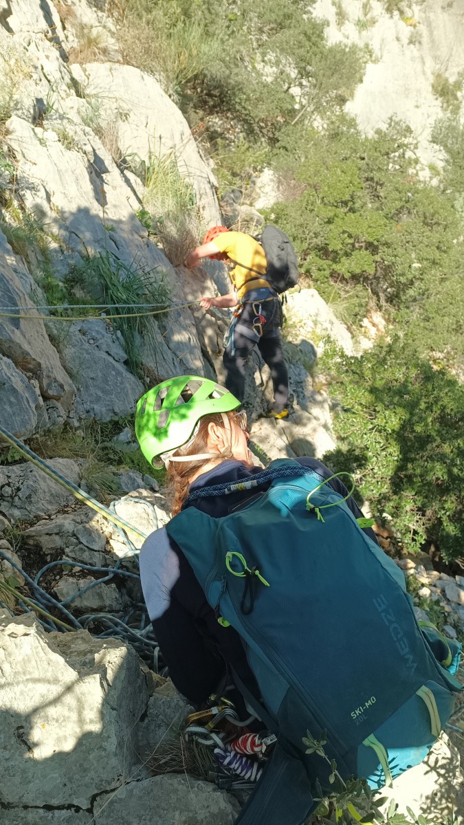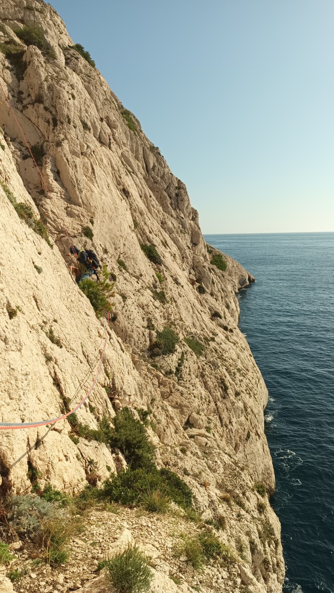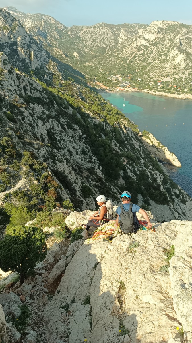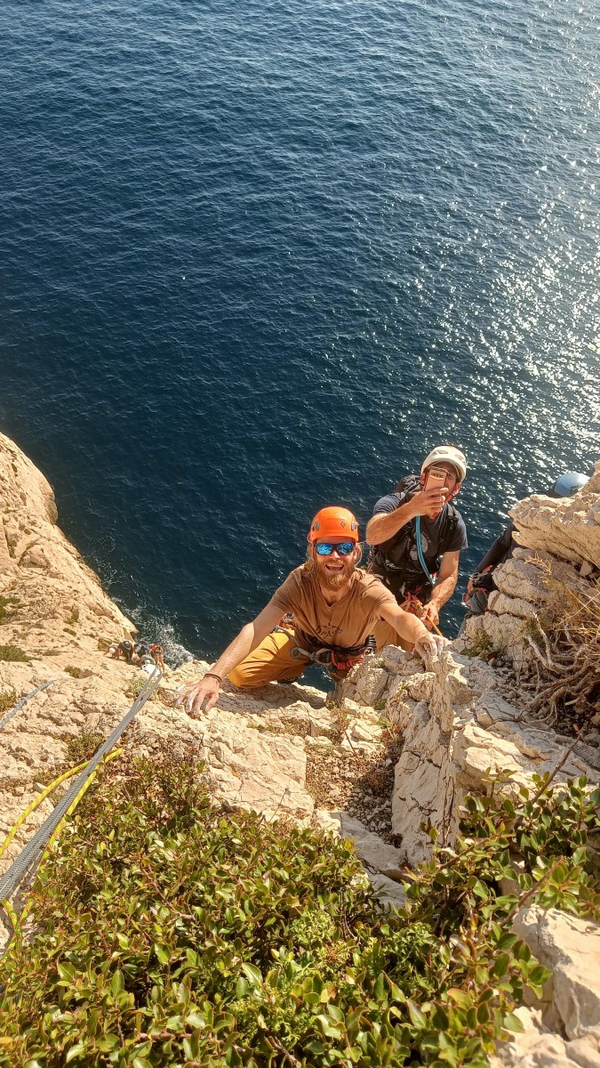 Chez nous, après un peu d’attente au R1 ou R2, ça déroule un peu plus. Roxane fait un premier relais classique puis un relais sur arbre dans une longueur de transition. Camille prend le relais sur Gautier dans les longueurs en 6a+ puis 4c et nous voilà tous à la terrasse où, ceux qui n’avaient pas eu la possibilité de manger (on dira qu’ils ont attendu par solidarité ou par peur de représailles) avalent leur sandwich avant de se poser la question existentielle qui s’impose : par quelle voie on sort ?