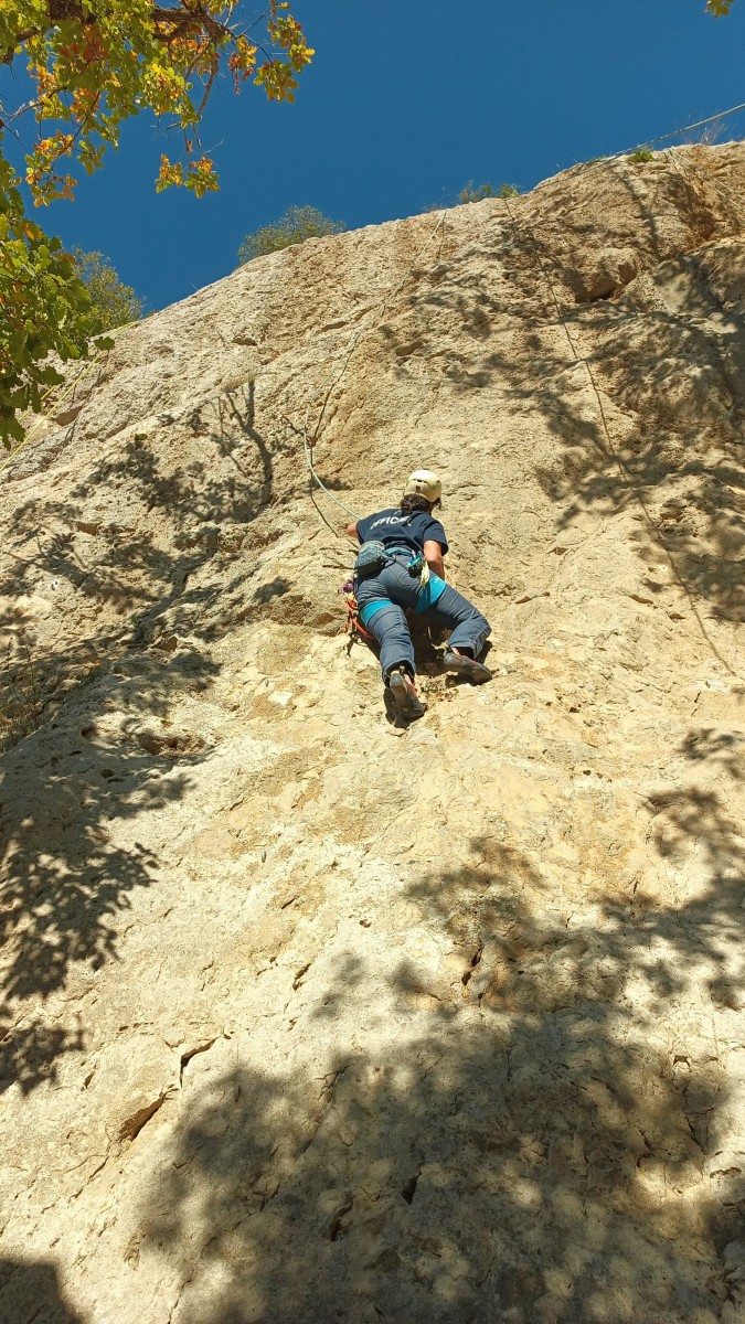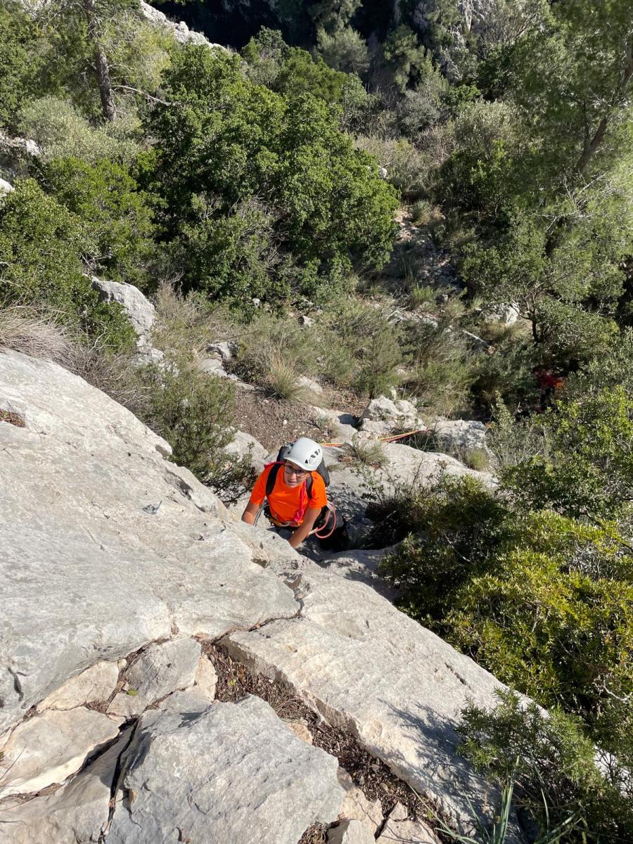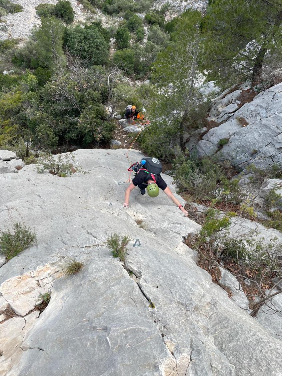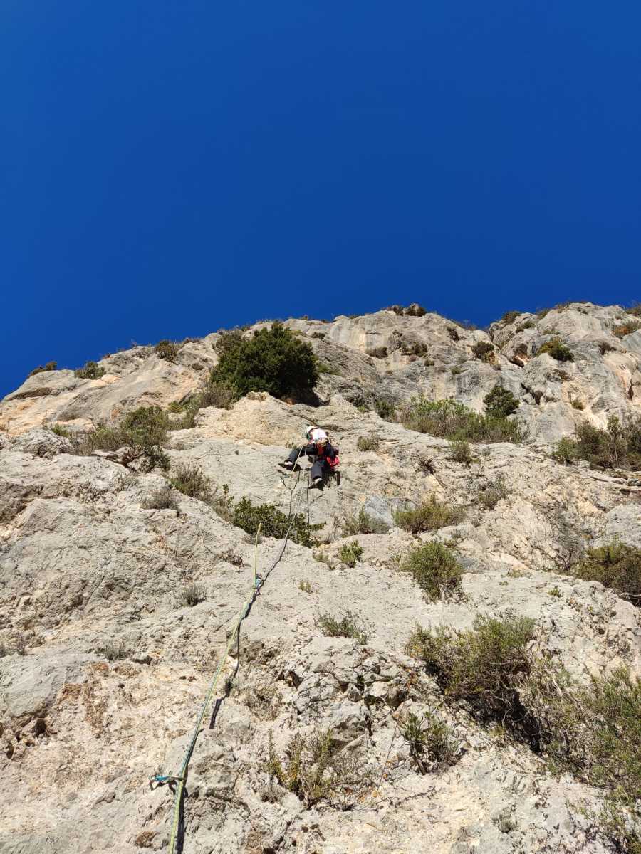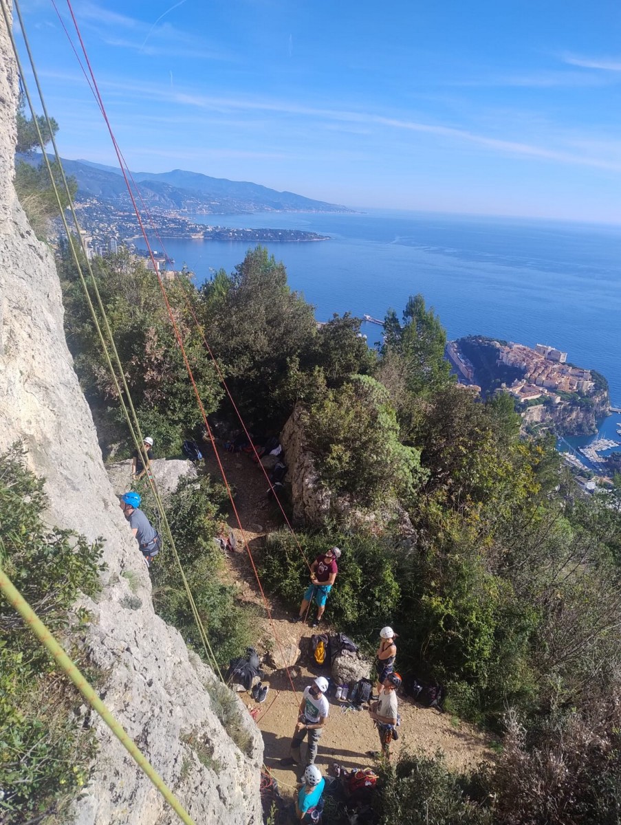 Chez nous, après un peu d’attente au R1 ou R2, ça déroule un peu plus. Roxane fait un premier relais classique puis un relais sur arbre dans une longueur de transition. Camille prend le relais sur Gautier dans les longueurs en 6a+ puis 4c et nous voilà tous à la terrasse où, ceux qui n’avaient pas eu la possibilité de manger (on dira qu’ils ont attendu par solidarité ou par peur de représailles) avalent leur sandwich avant de se poser la question existentielle qui s’impose : par quelle voie on sort ?