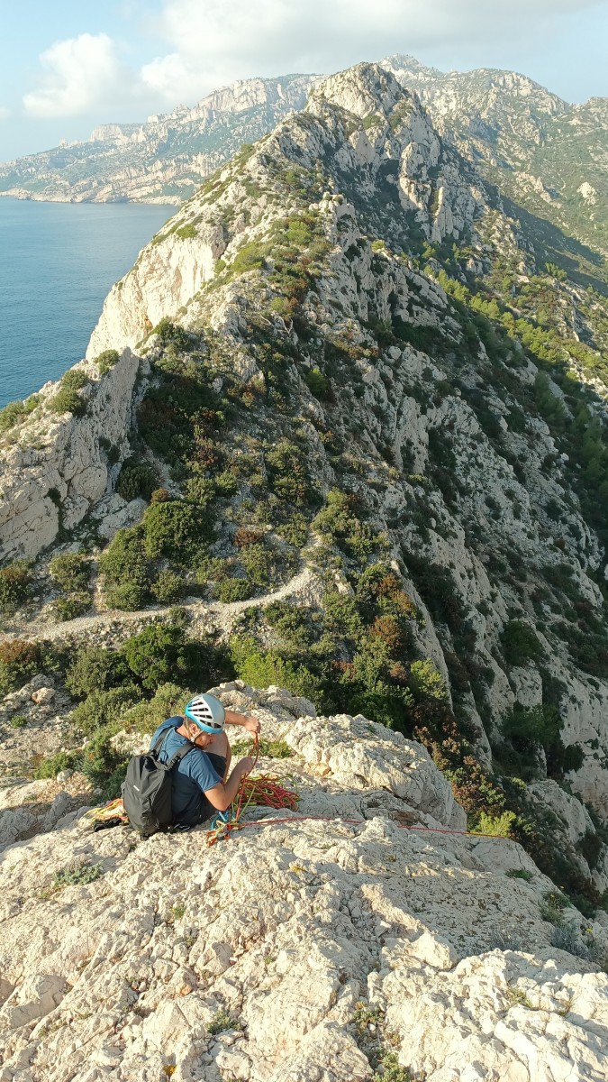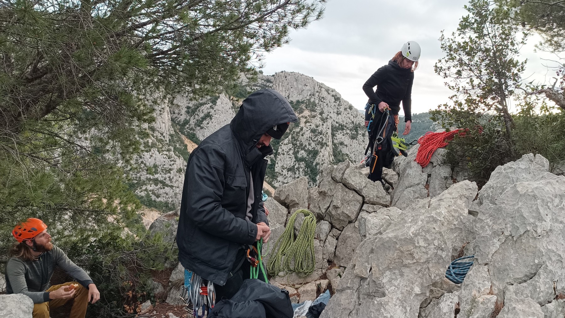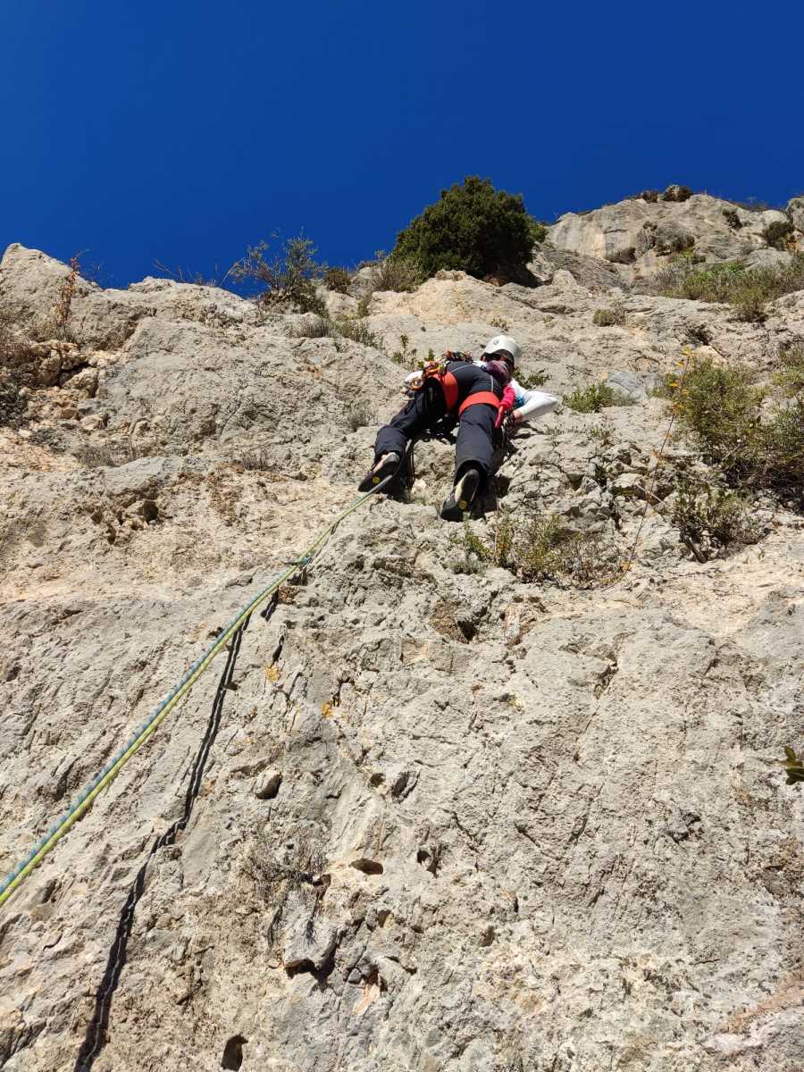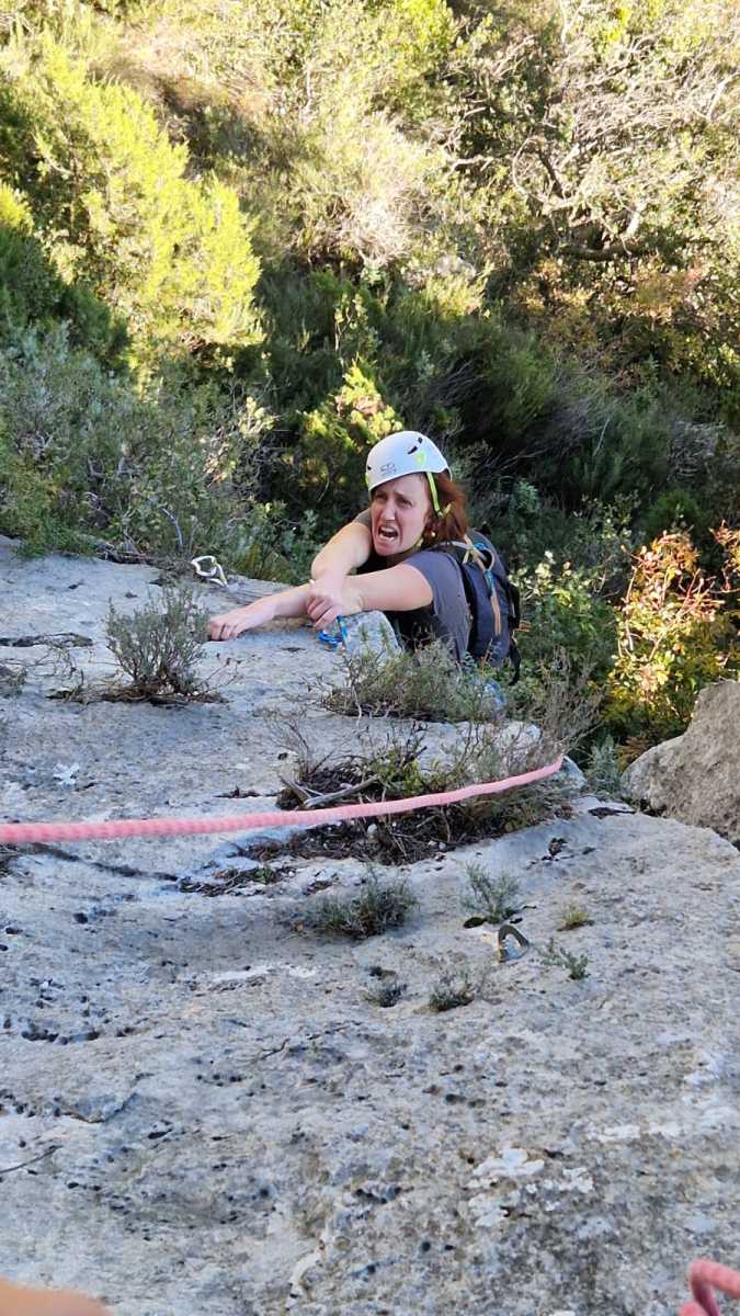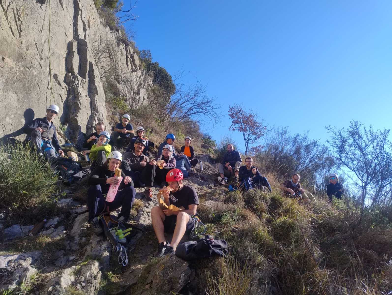 Chez nous, après un peu d’attente au R1 ou R2, ça déroule un peu plus. Roxane fait un premier relais classique puis un relais sur arbre dans une longueur de transition. Camille prend le relais sur Gautier dans les longueurs en 6a+ puis 4c et nous voilà tous à la terrasse où, ceux qui n’avaient pas eu la possibilité de manger (on dira qu’ils ont attendu par solidarité ou par peur de représailles) avalent leur sandwich avant de se poser la question existentielle qui s’impose : par quelle voie on sort ?