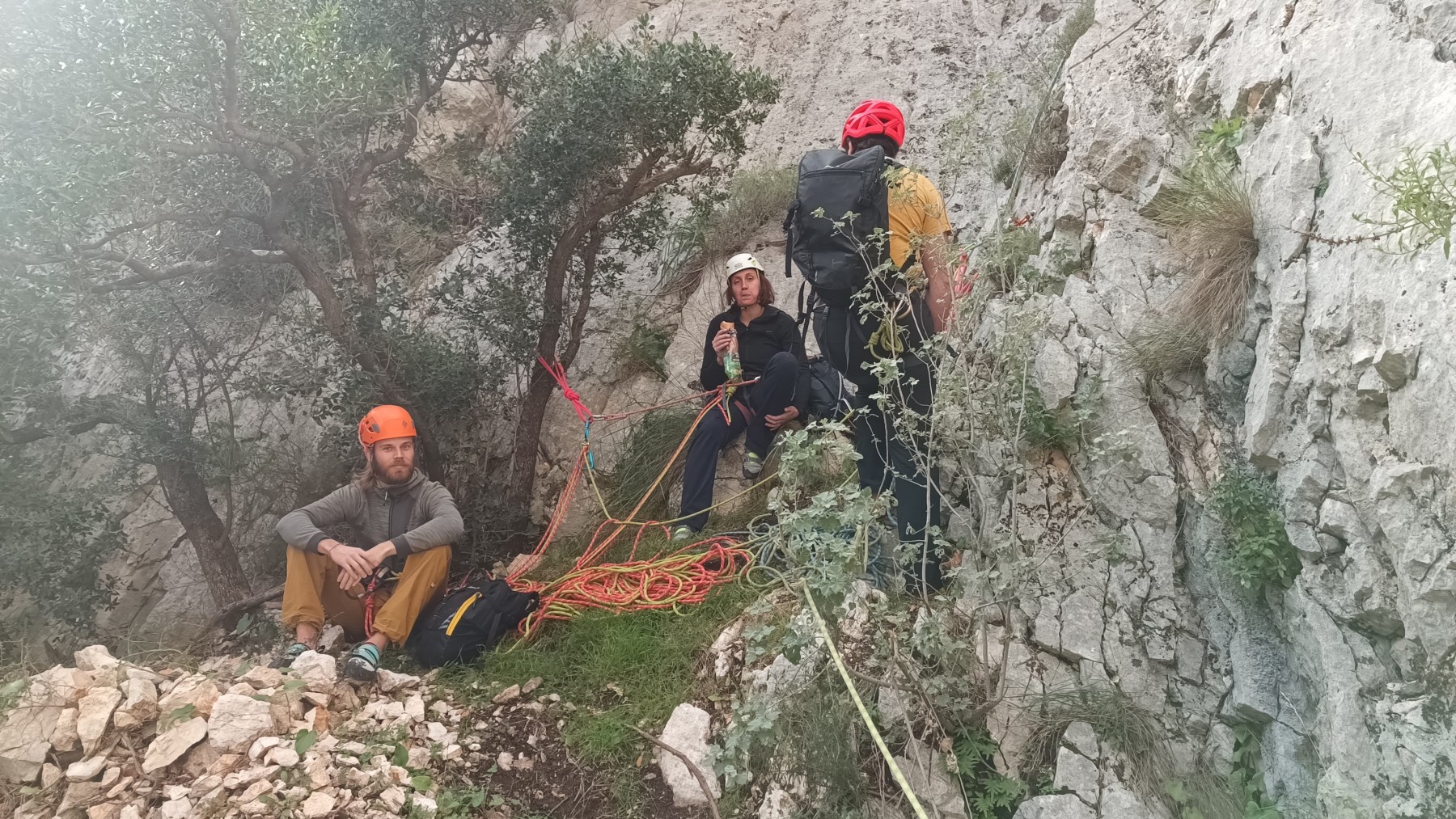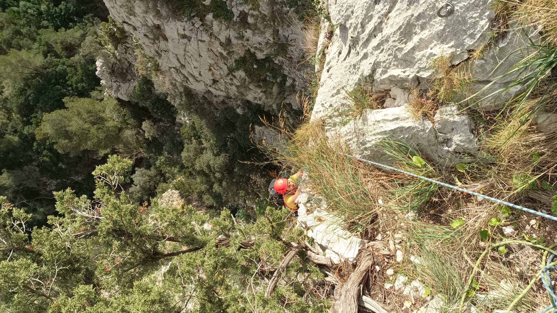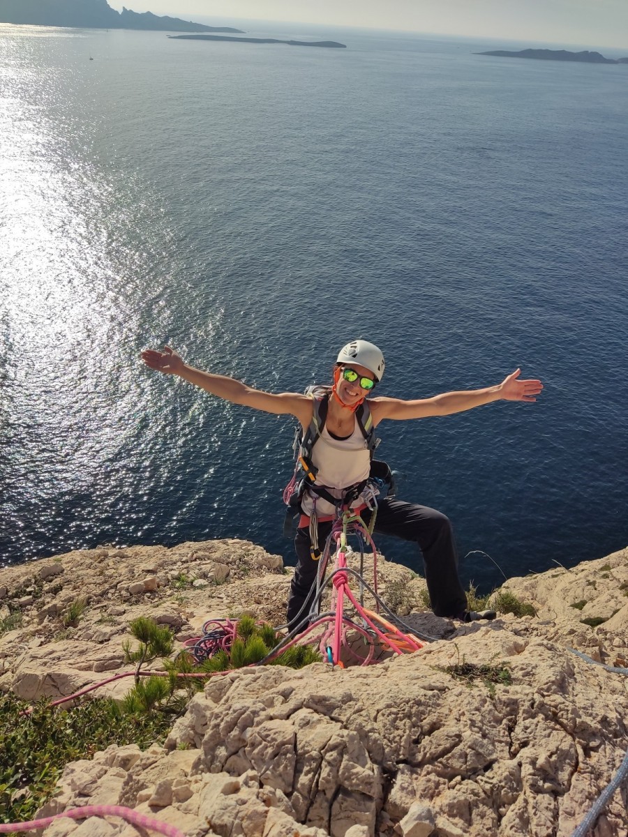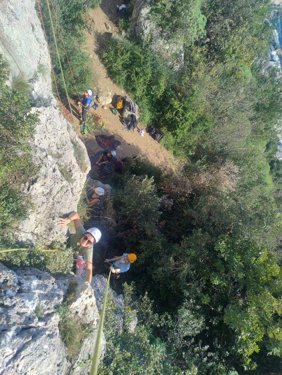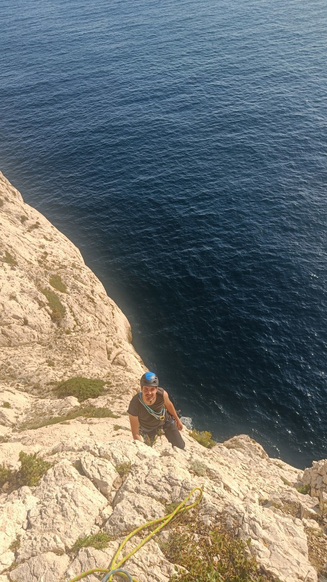 Chez nous, après un peu d’attente au R1 ou R2, ça déroule un peu plus. Roxane fait un premier relais classique puis un relais sur arbre dans une longueur de transition. Camille prend le relais sur Gautier dans les longueurs en 6a+ puis 4c et nous voilà tous à la terrasse où, ceux qui n’avaient pas eu la possibilité de manger (on dira qu’ils ont attendu par solidarité ou par peur de représailles) avalent leur sandwich avant de se poser la question existentielle qui s’impose : par quelle voie on sort ?