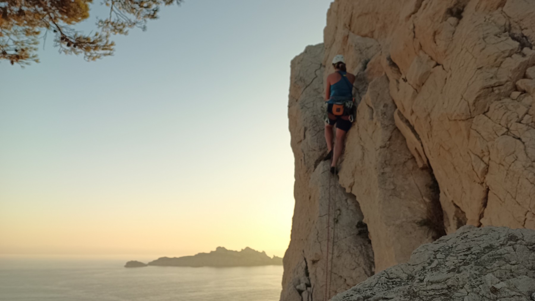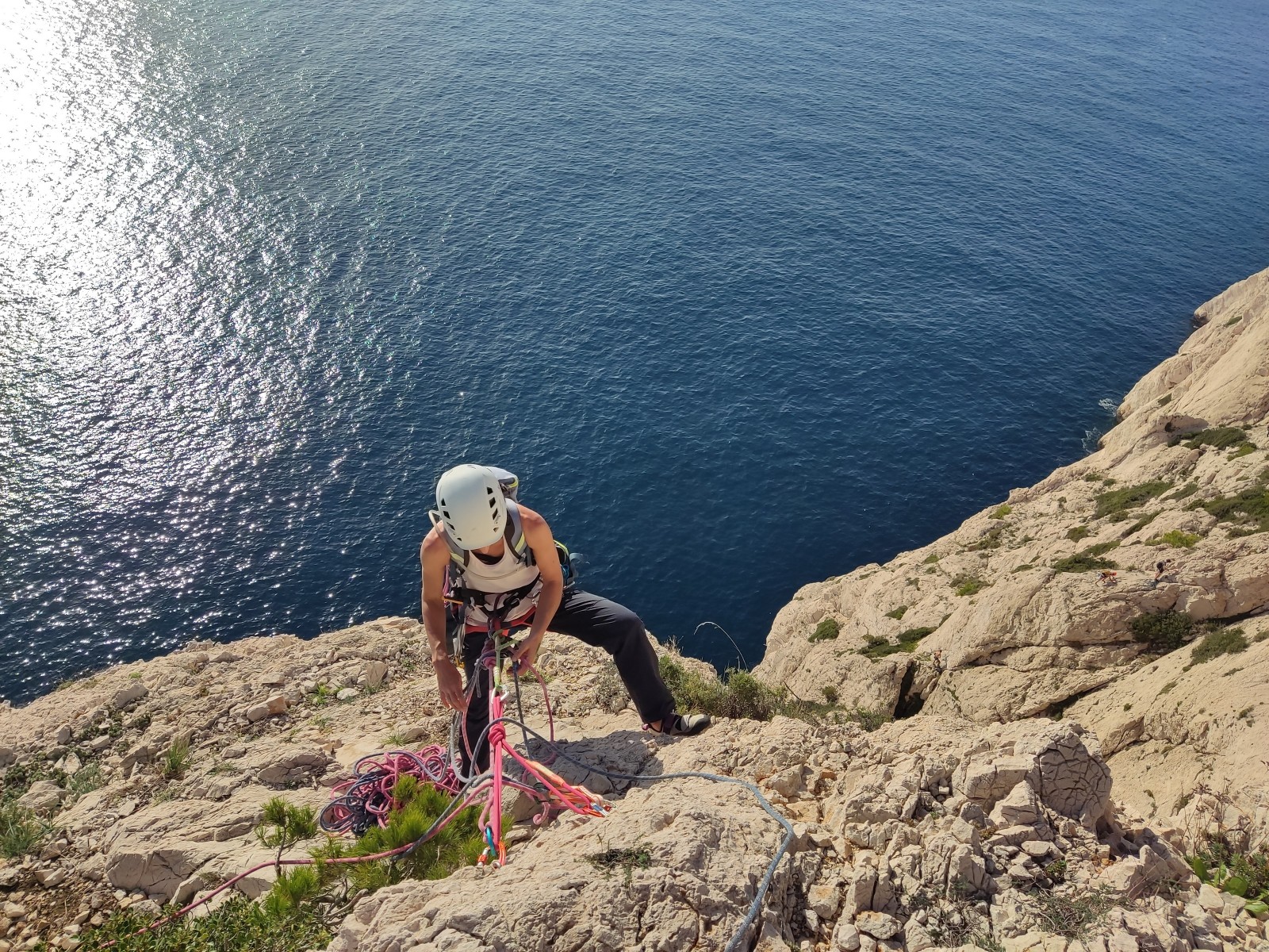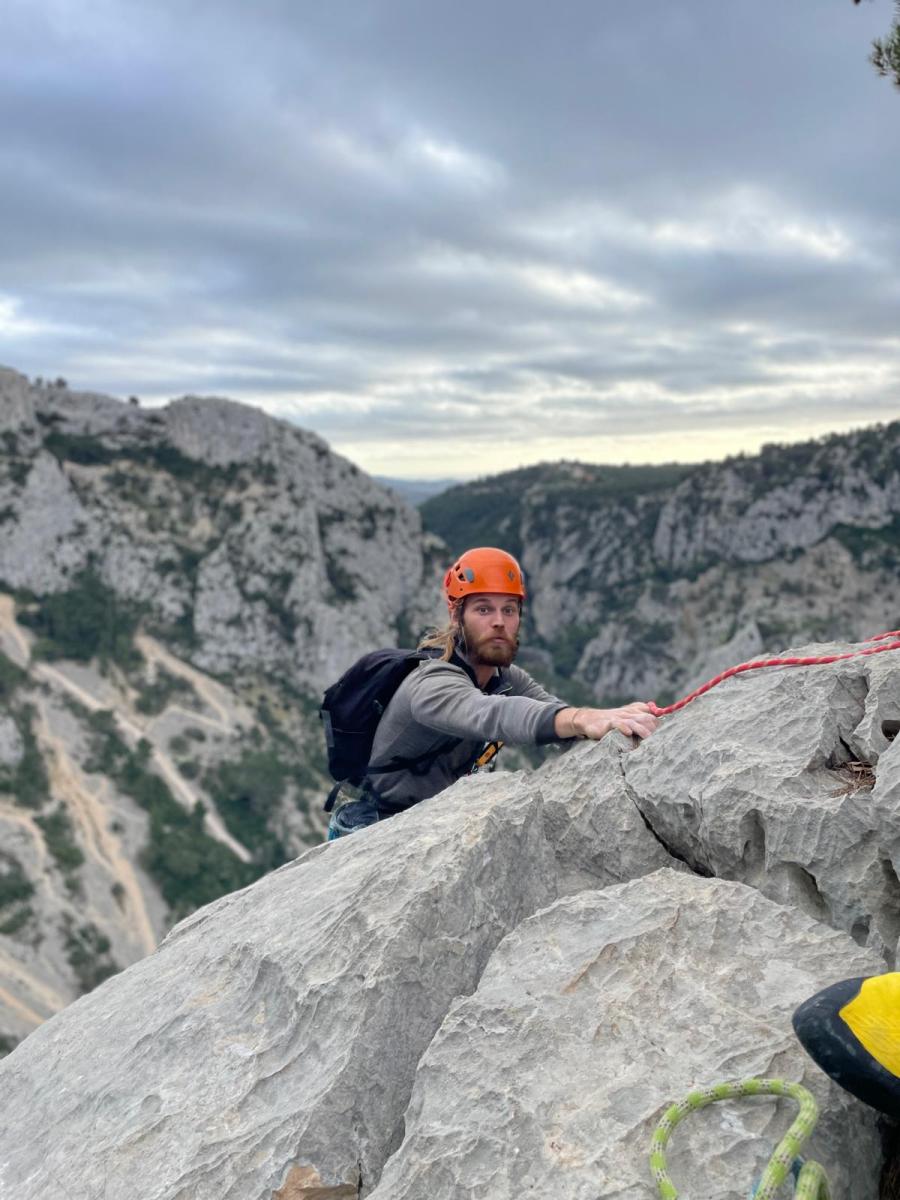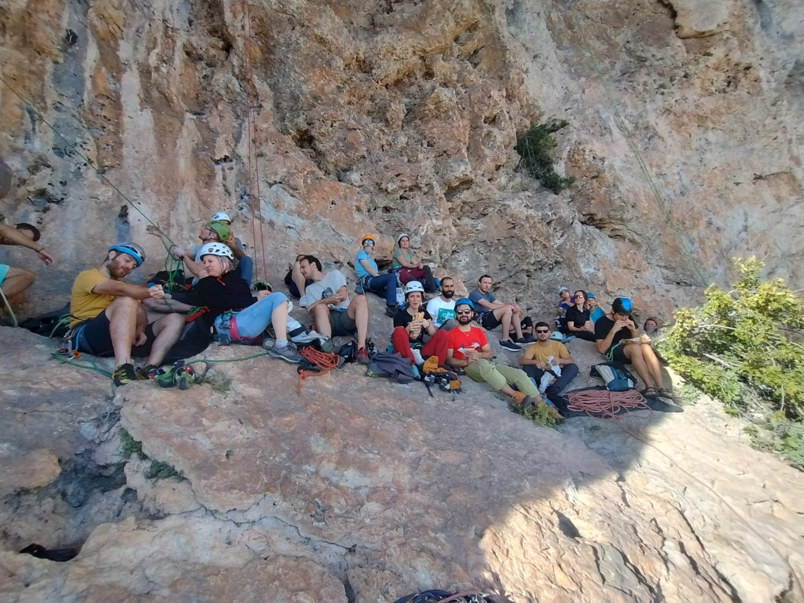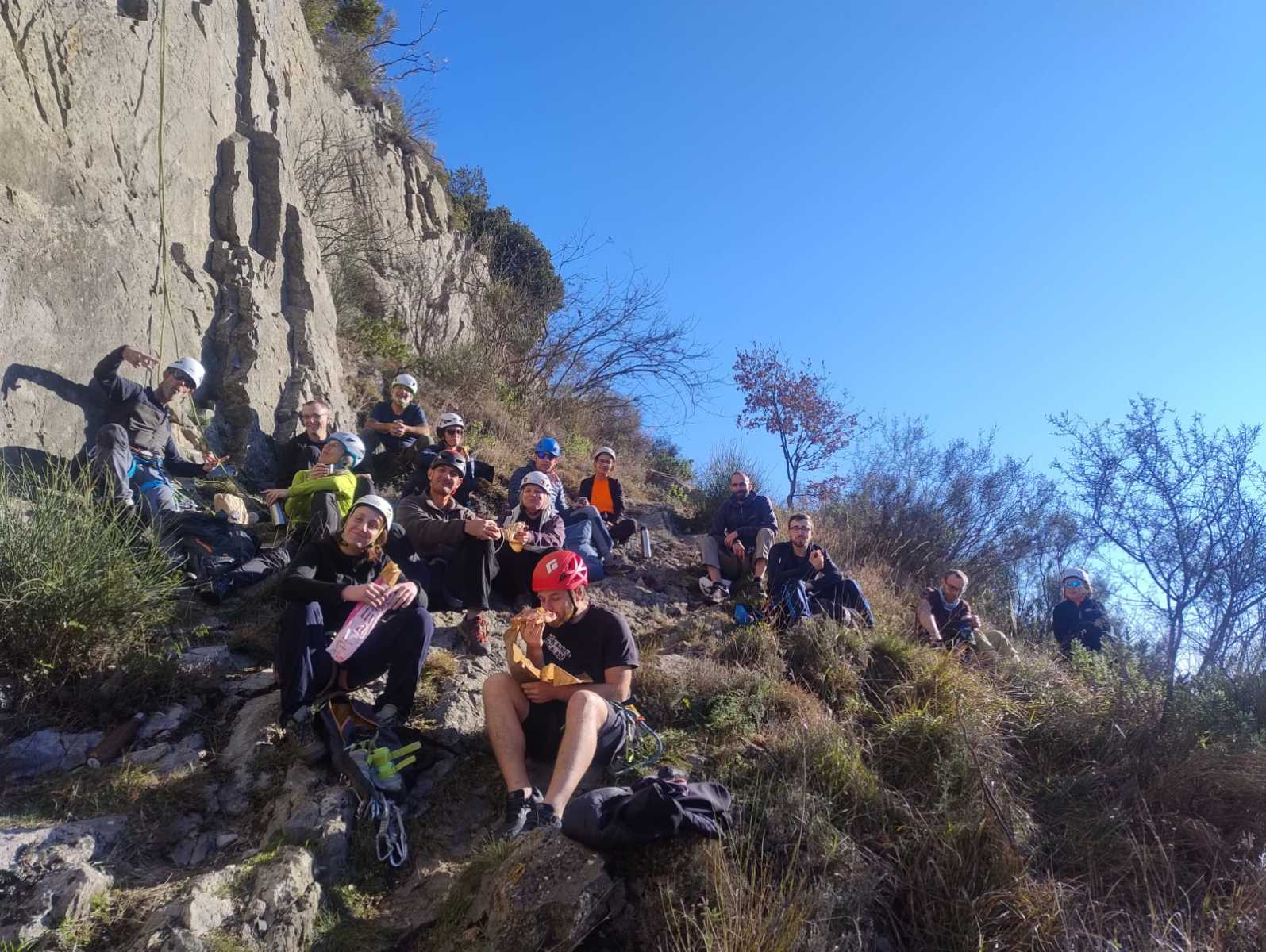 Chez nous, après un peu d’attente au R1 ou R2, ça déroule un peu plus. Roxane fait un premier relais classique puis un relais sur arbre dans une longueur de transition. Camille prend le relais sur Gautier dans les longueurs en 6a+ puis 4c et nous voilà tous à la terrasse où, ceux qui n’avaient pas eu la possibilité de manger (on dira qu’ils ont attendu par solidarité ou par peur de représailles) avalent leur sandwich avant de se poser la question existentielle qui s’impose : par quelle voie on sort ?