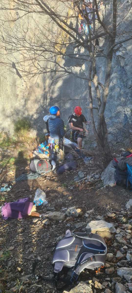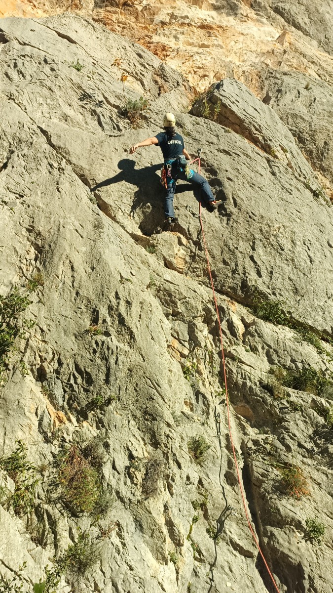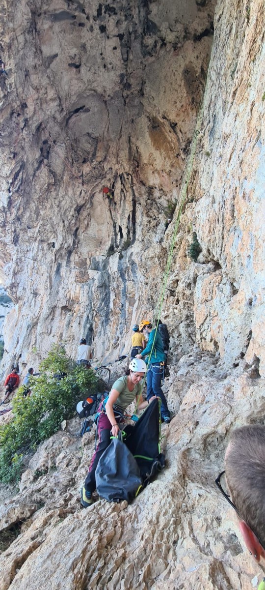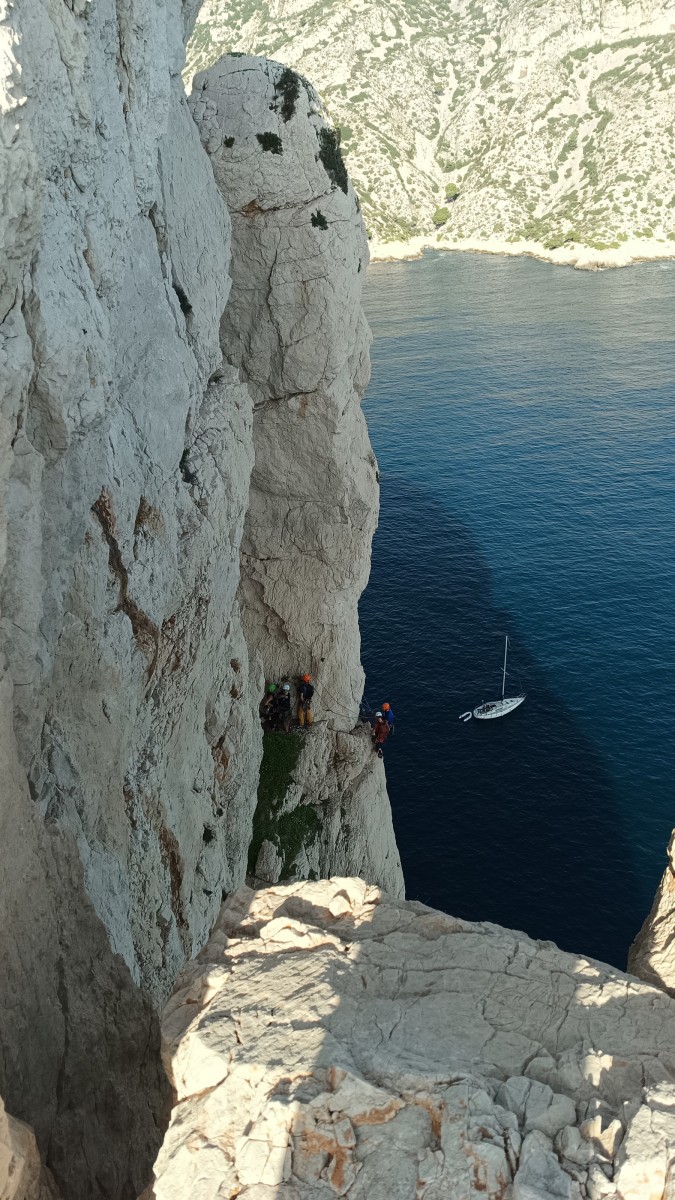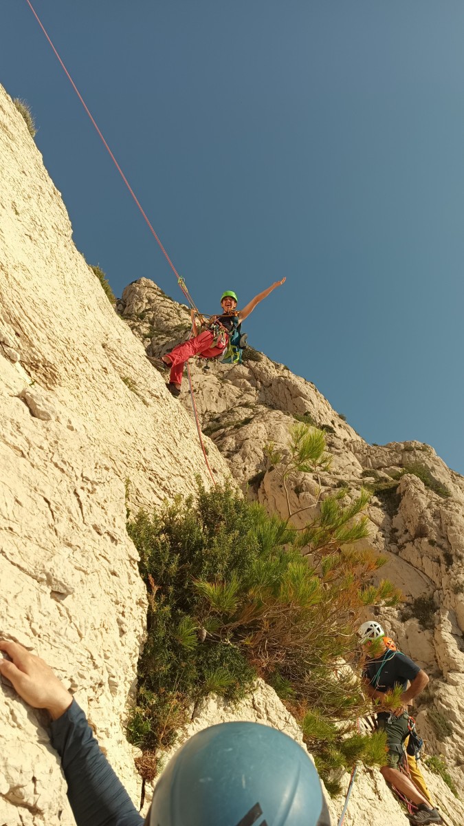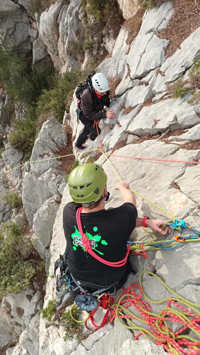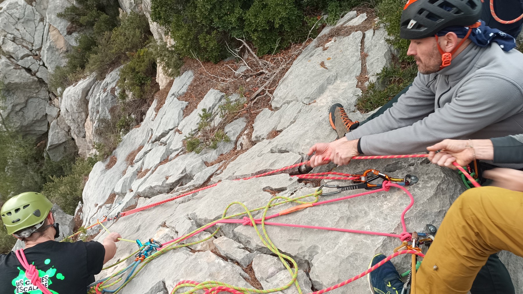 Ni une ni deux, on s’organise pour changer la tête de mouflage, Djé sort son matériel Chullanka qui brille et avec Alexis préparent la manip. Pour ceux qui ne comprennent pas ce que je viens d’écrire, moufler quelqu’un signifie le hisser. Pour ça, on a besoin de démultiplier la force de traction et il existe des manips pour ça. Et, merveilleux travail d’équipe, pendant qu’Alexis, un peu en contrebas, assure Jean-Luc et fait redescendre le bloqueur quand nécessaire, Julien et Djé jouent aux matelos hissant la grand voile ! Tellement efficace que Saliha n’a plus le temps de poser les pieds ou d’enlever les dégaines !