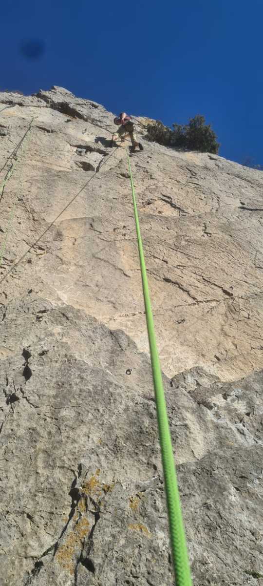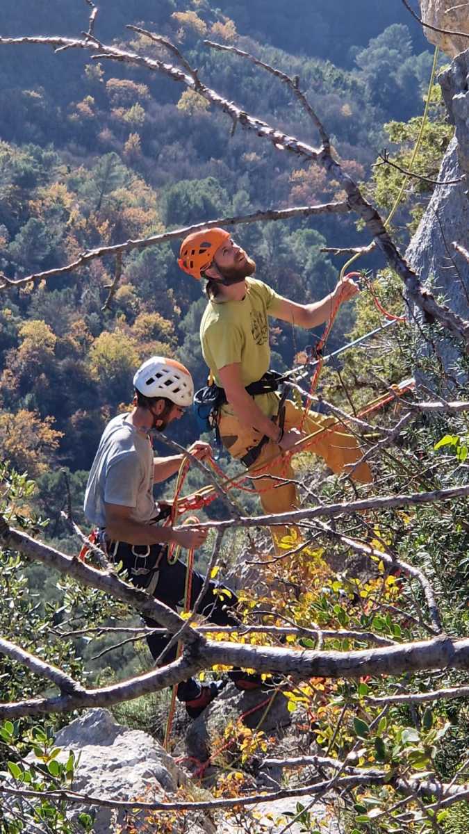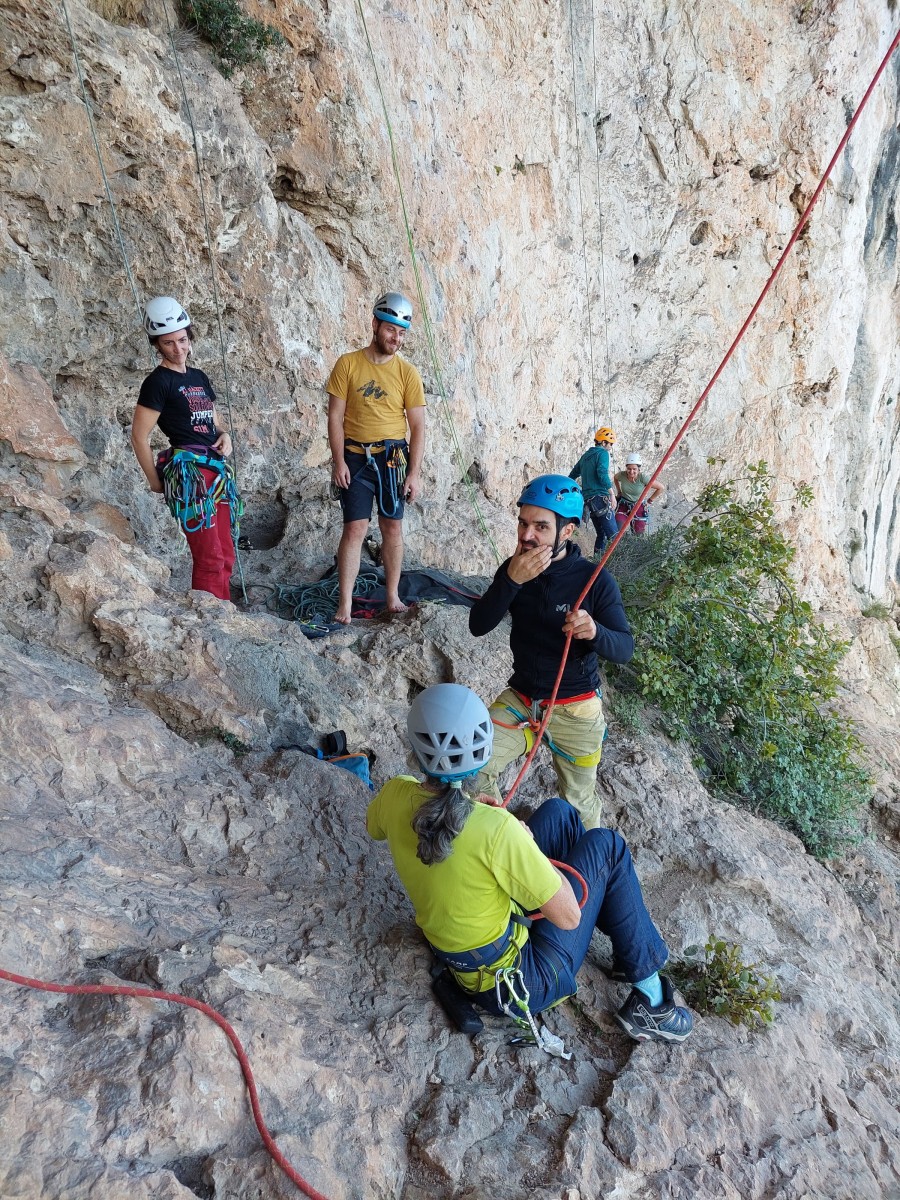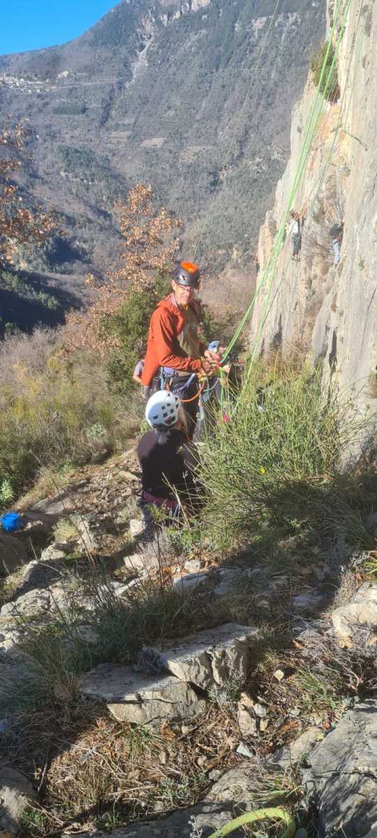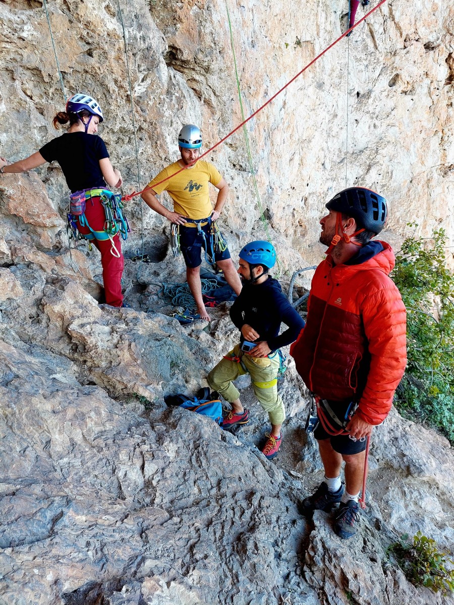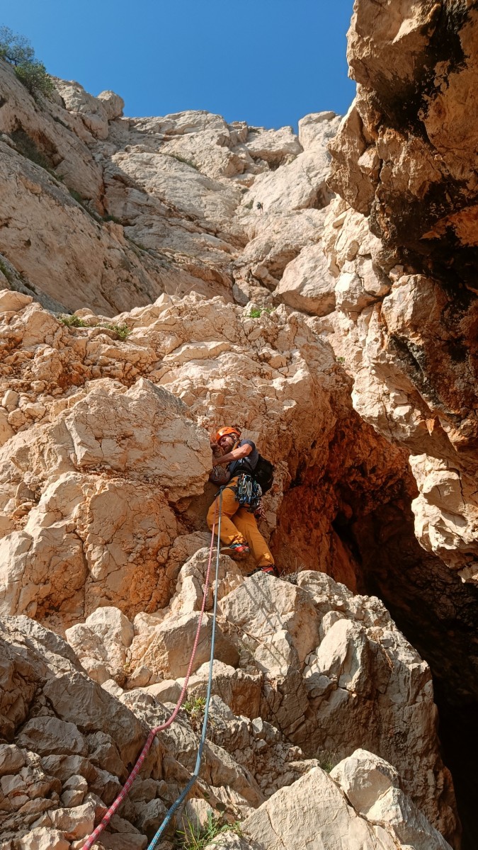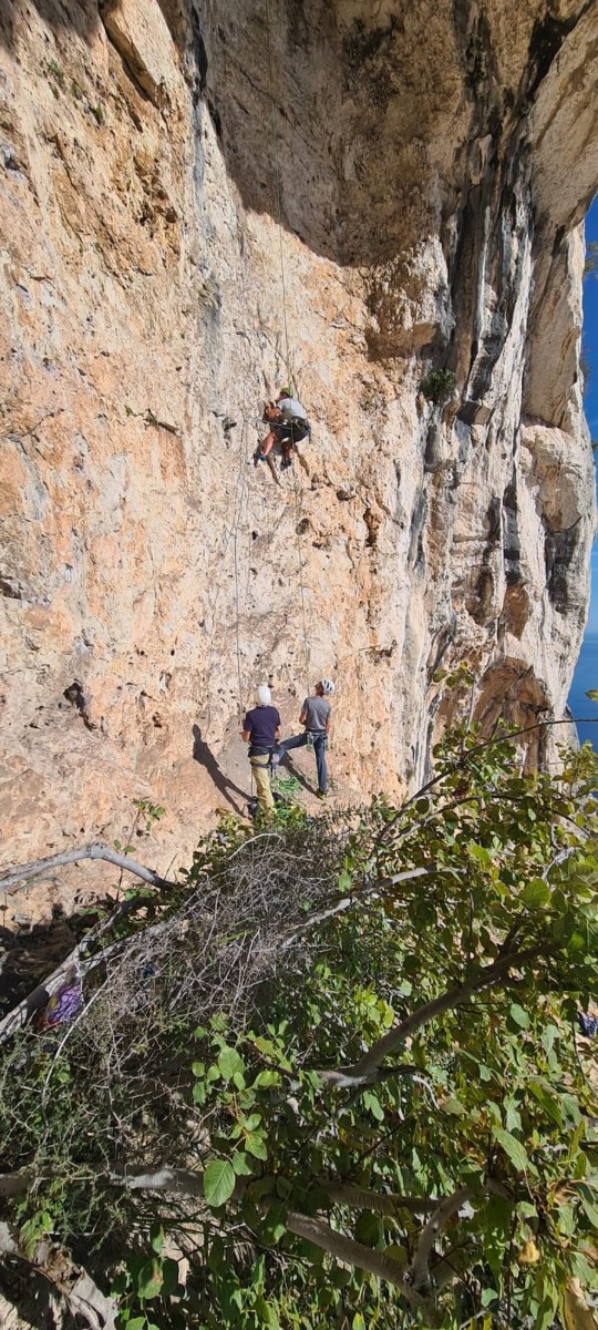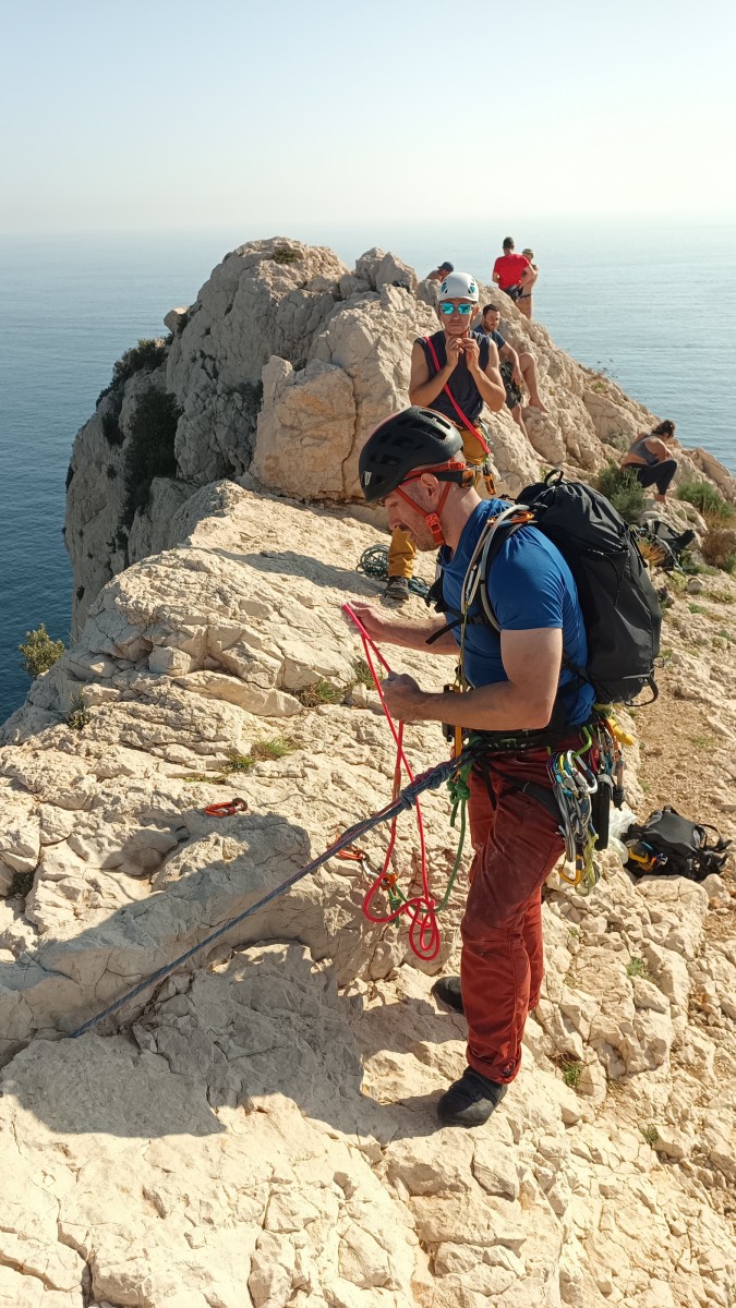 Ni une ni deux, on s’organise pour changer la tête de mouflage, Djé sort son matériel Chullanka qui brille et avec Alexis préparent la manip. Pour ceux qui ne comprennent pas ce que je viens d’écrire, moufler quelqu’un signifie le hisser. Pour ça, on a besoin de démultiplier la force de traction et il existe des manips pour ça. Et, merveilleux travail d’équipe, pendant qu’Alexis, un peu en contrebas, assure Jean-Luc et fait redescendre le bloqueur quand nécessaire, Julien et Djé jouent aux matelos hissant la grand voile ! Tellement efficace que Saliha n’a plus le temps de poser les pieds ou d’enlever les dégaines !