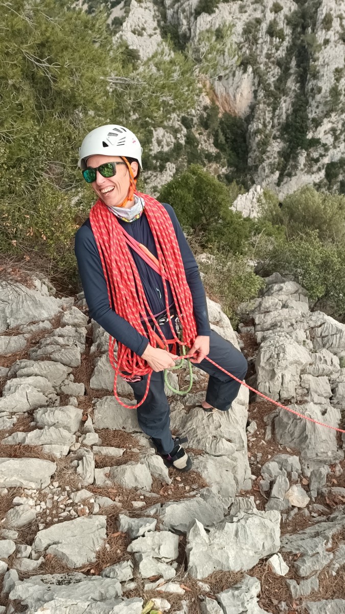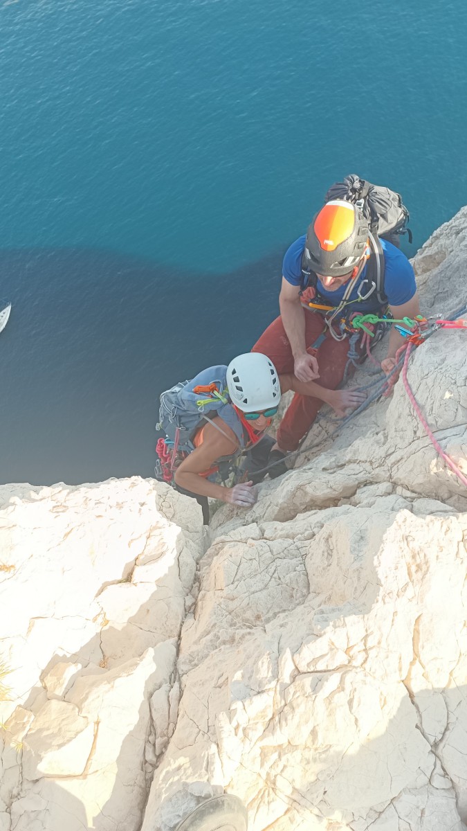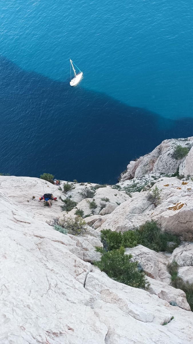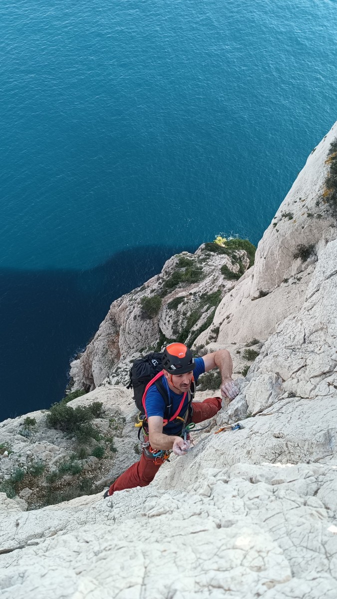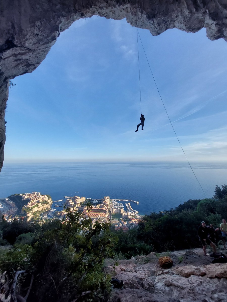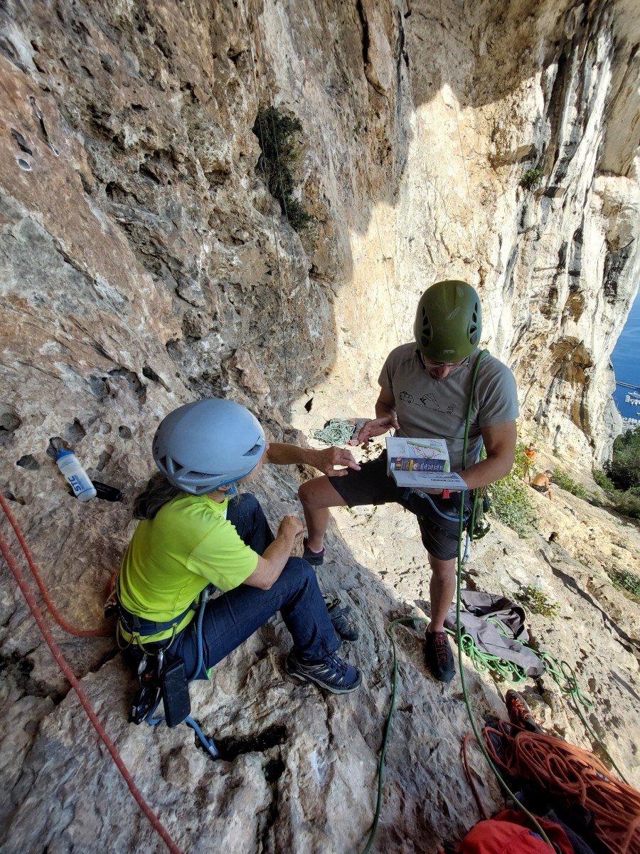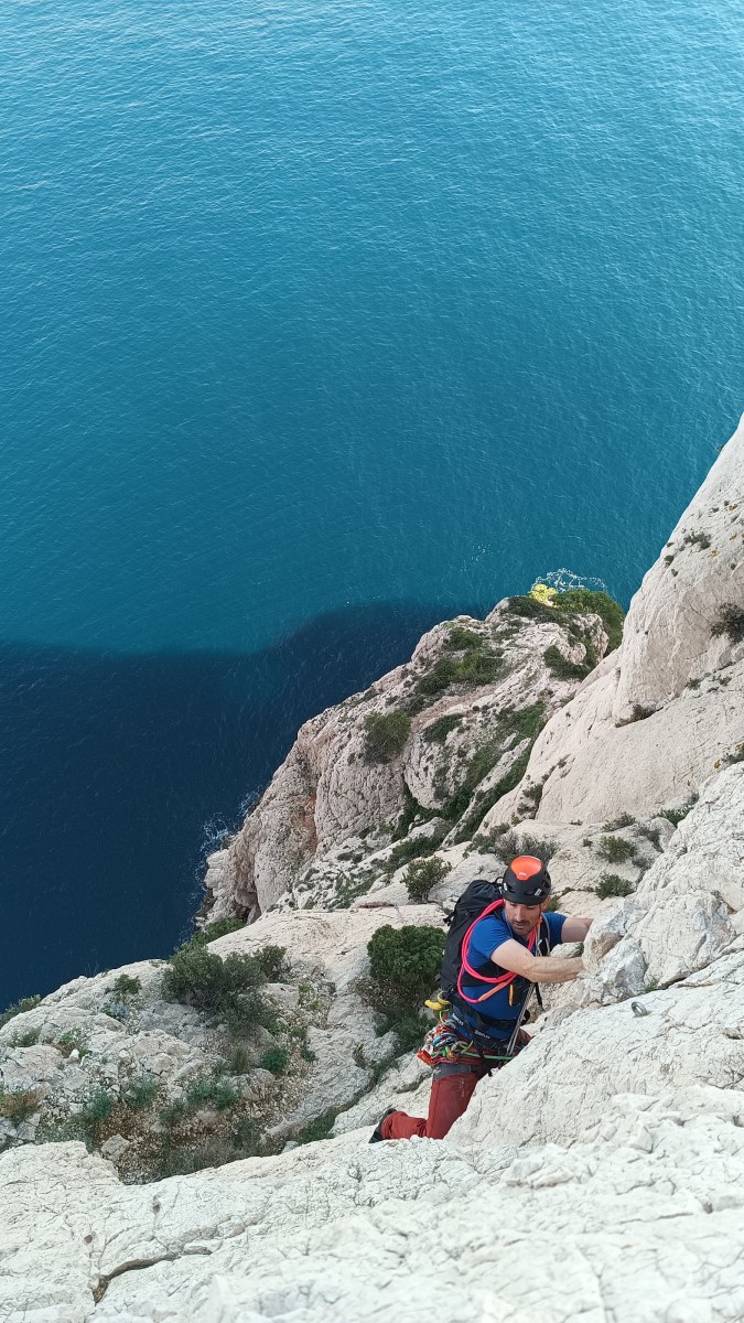 Ni une ni deux, on s’organise pour changer la tête de mouflage, Djé sort son matériel Chullanka qui brille et avec Alexis préparent la manip. Pour ceux qui ne comprennent pas ce que je viens d’écrire, moufler quelqu’un signifie le hisser. Pour ça, on a besoin de démultiplier la force de traction et il existe des manips pour ça. Et, merveilleux travail d’équipe, pendant qu’Alexis, un peu en contrebas, assure Jean-Luc et fait redescendre le bloqueur quand nécessaire, Julien et Djé jouent aux matelos hissant la grand voile ! Tellement efficace que Saliha n’a plus le temps de poser les pieds ou d’enlever les dégaines !