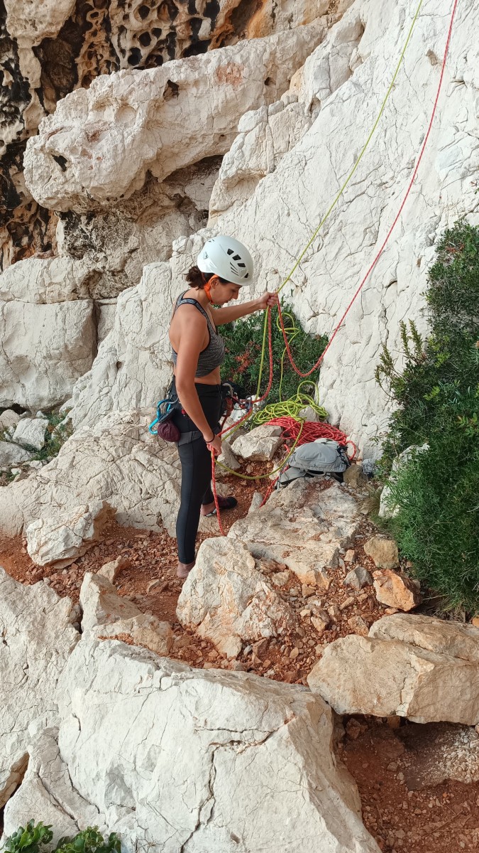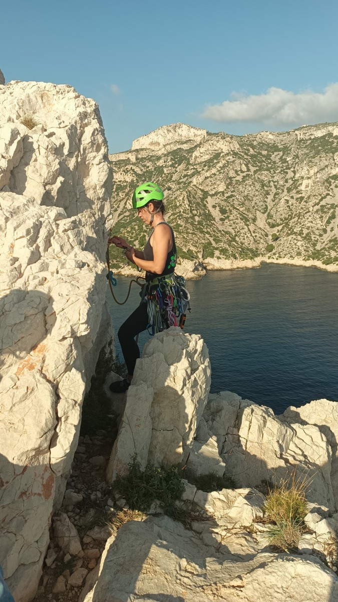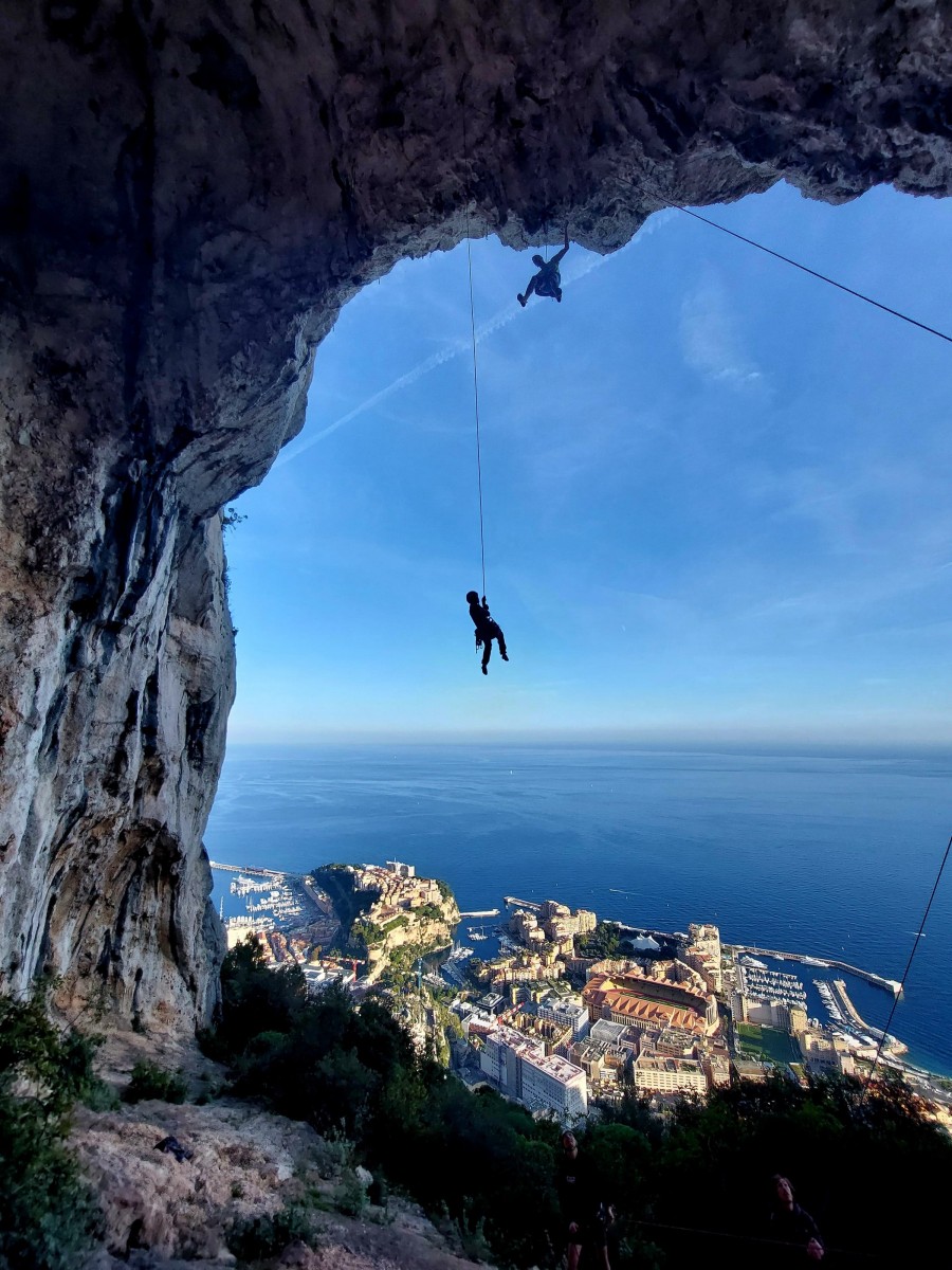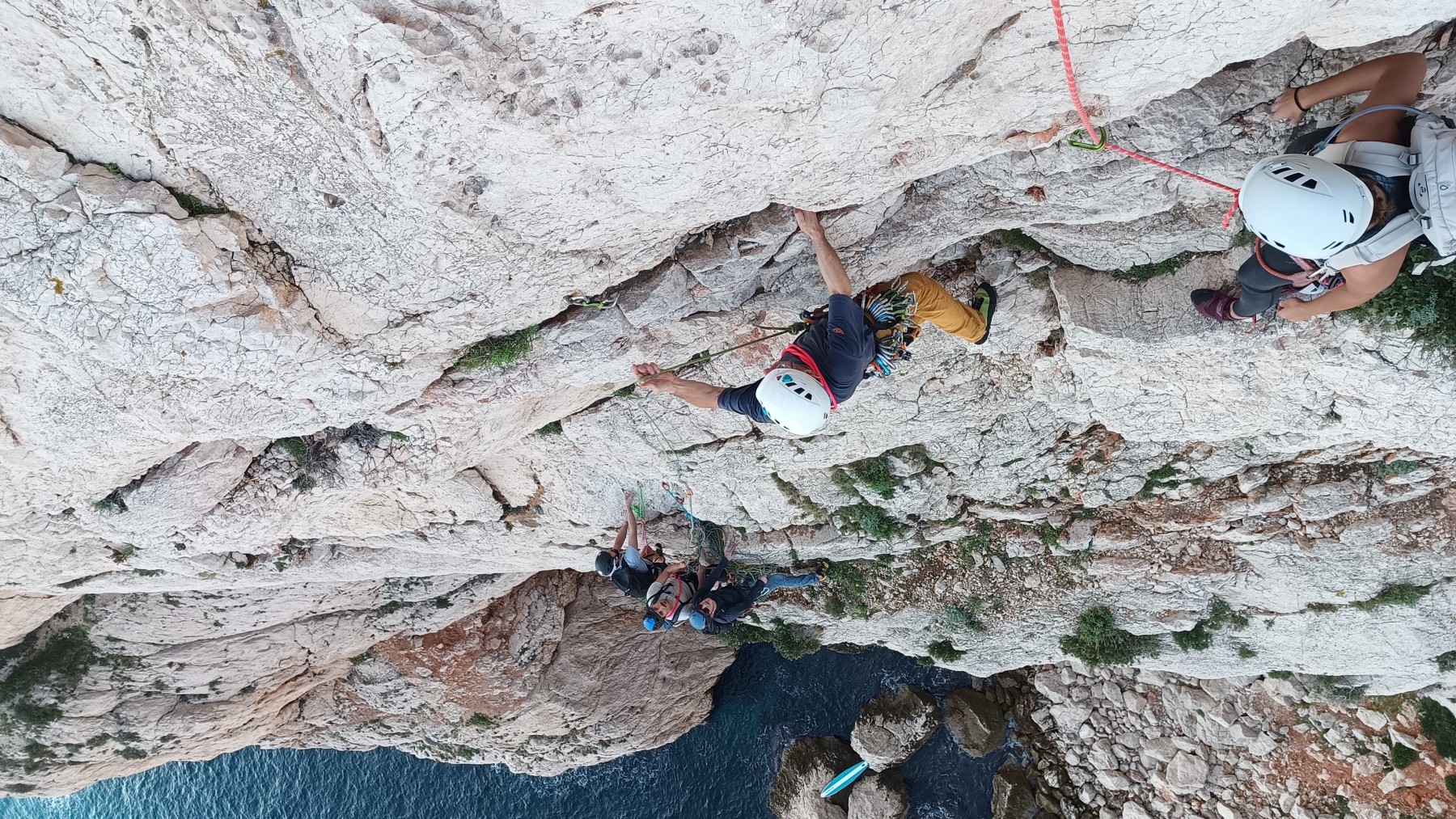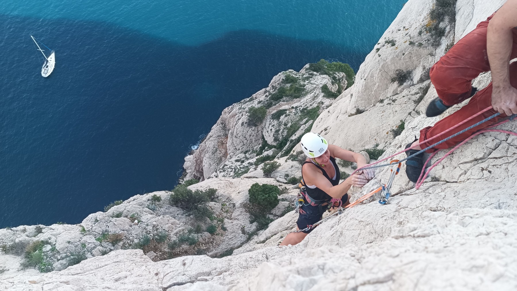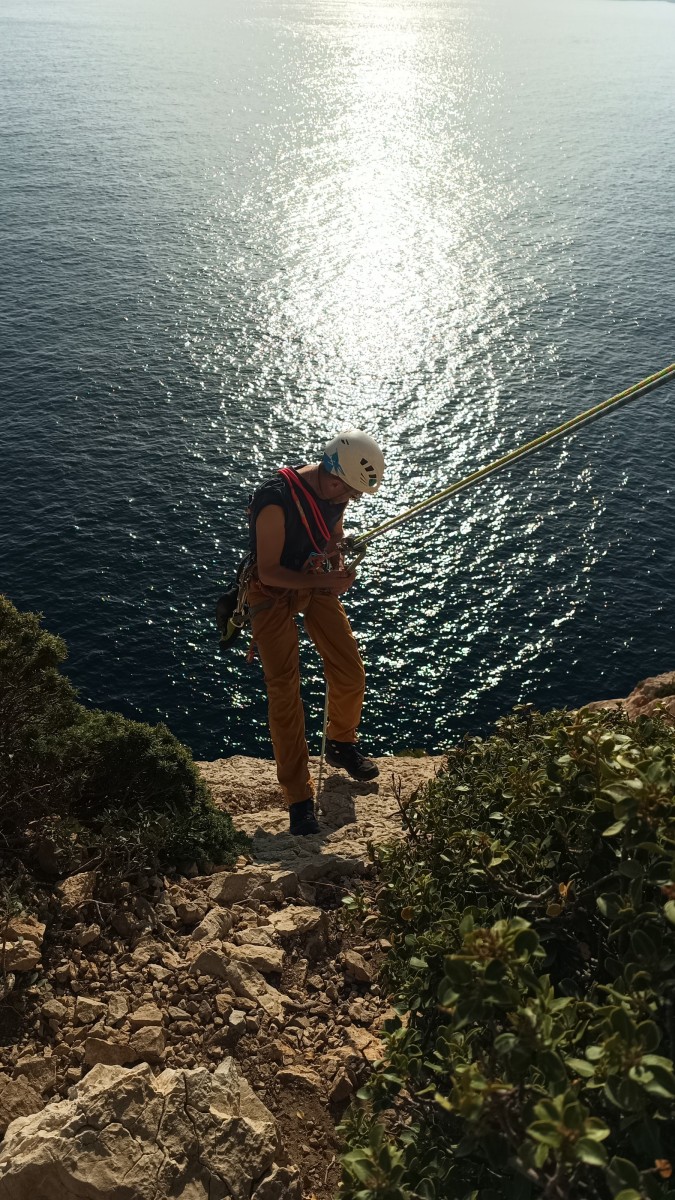 Ni une ni deux, on s’organise pour changer la tête de mouflage, Djé sort son matériel Chullanka qui brille et avec Alexis préparent la manip. Pour ceux qui ne comprennent pas ce que je viens d’écrire, moufler quelqu’un signifie le hisser. Pour ça, on a besoin de démultiplier la force de traction et il existe des manips pour ça. Et, merveilleux travail d’équipe, pendant qu’Alexis, un peu en contrebas, assure Jean-Luc et fait redescendre le bloqueur quand nécessaire, Julien et Djé jouent aux matelos hissant la grand voile ! Tellement efficace que Saliha n’a plus le temps de poser les pieds ou d’enlever les dégaines !