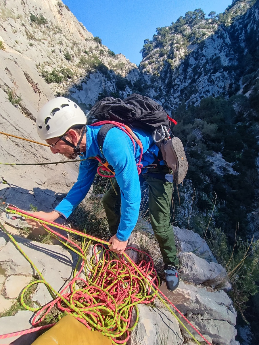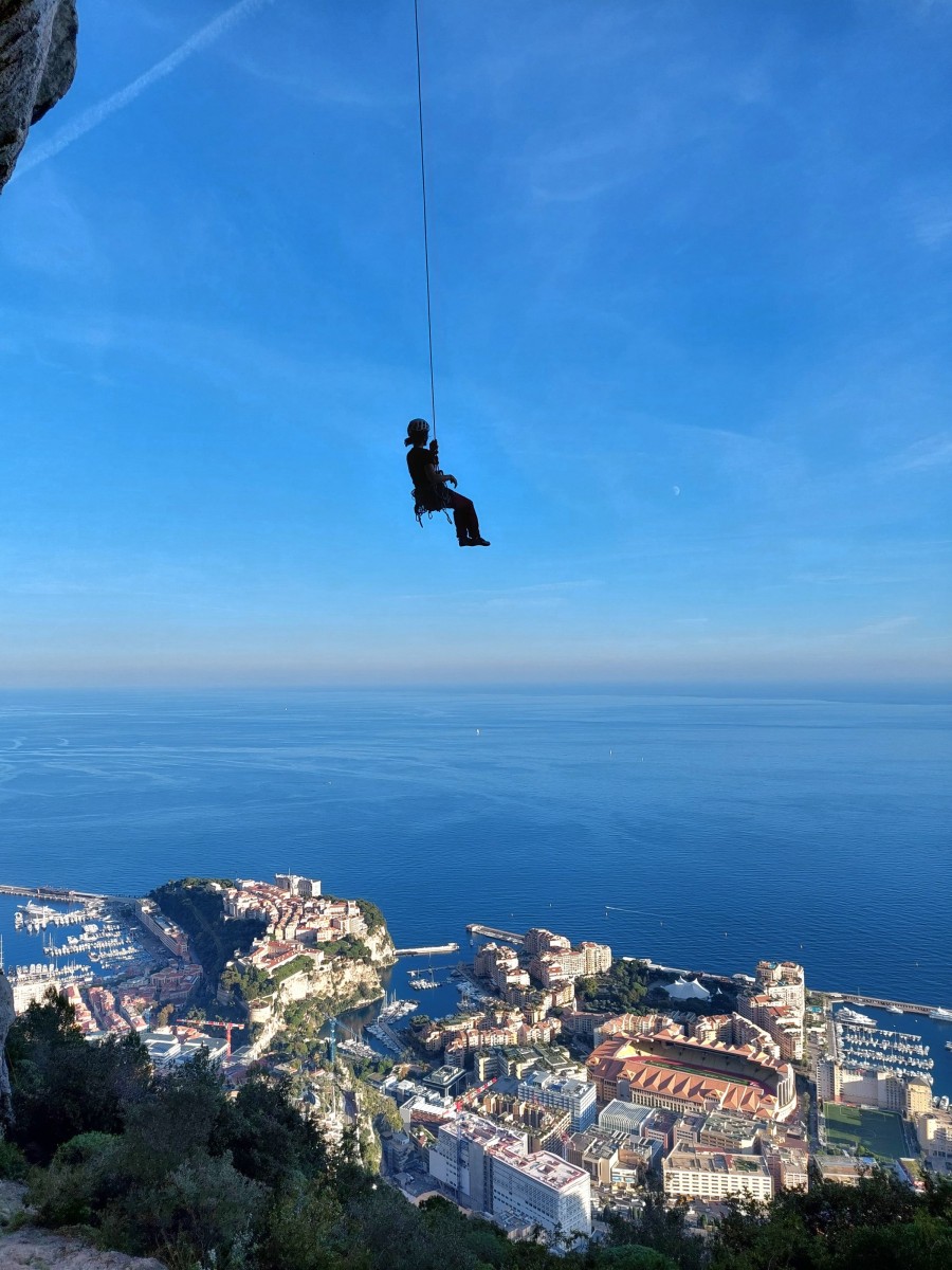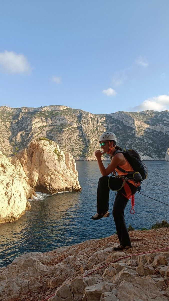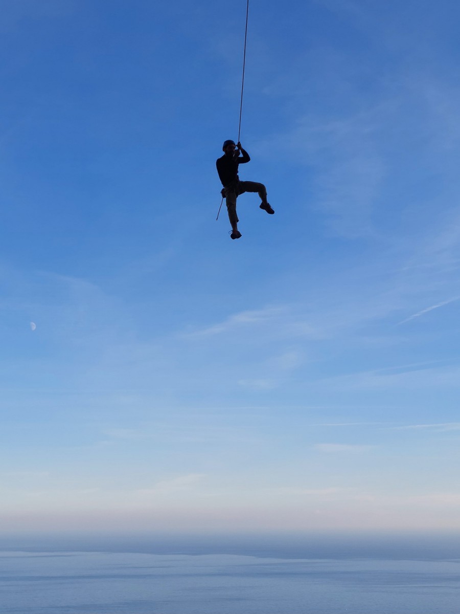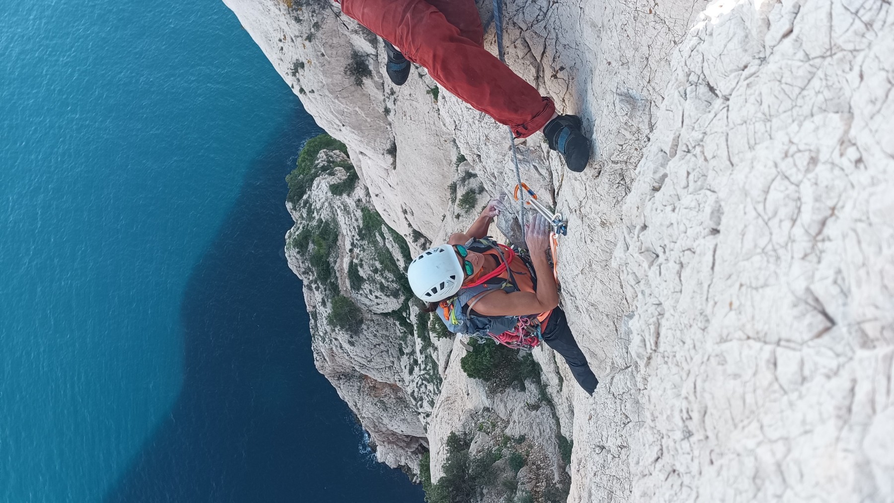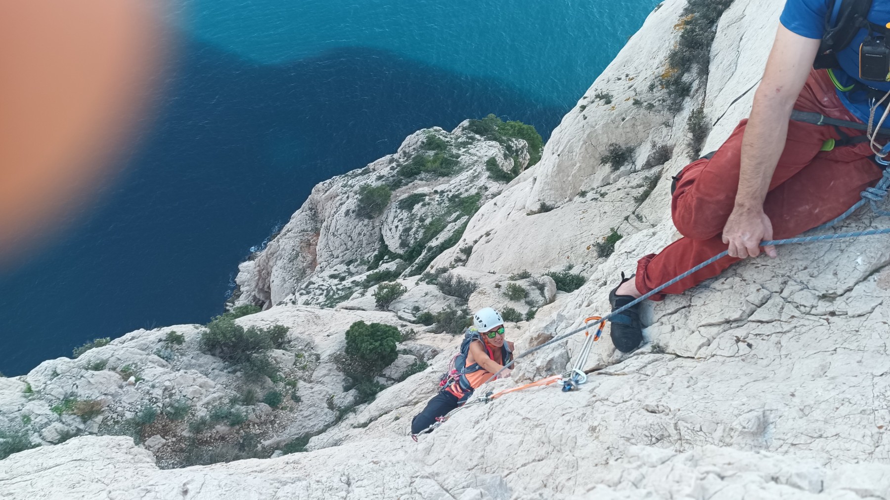 Ni une ni deux, on s’organise pour changer la tête de mouflage, Djé sort son matériel Chullanka qui brille et avec Alexis préparent la manip. Pour ceux qui ne comprennent pas ce que je viens d’écrire, moufler quelqu’un signifie le hisser. Pour ça, on a besoin de démultiplier la force de traction et il existe des manips pour ça. Et, merveilleux travail d’équipe, pendant qu’Alexis, un peu en contrebas, assure Jean-Luc et fait redescendre le bloqueur quand nécessaire, Julien et Djé jouent aux matelos hissant la grand voile ! Tellement efficace que Saliha n’a plus le temps de poser les pieds ou d’enlever les dégaines !