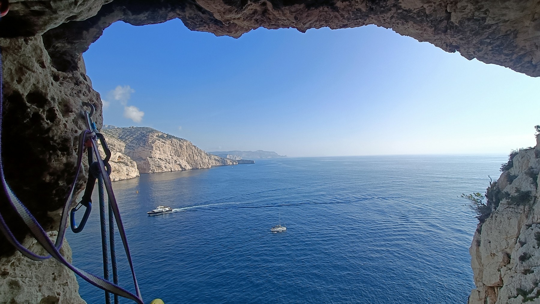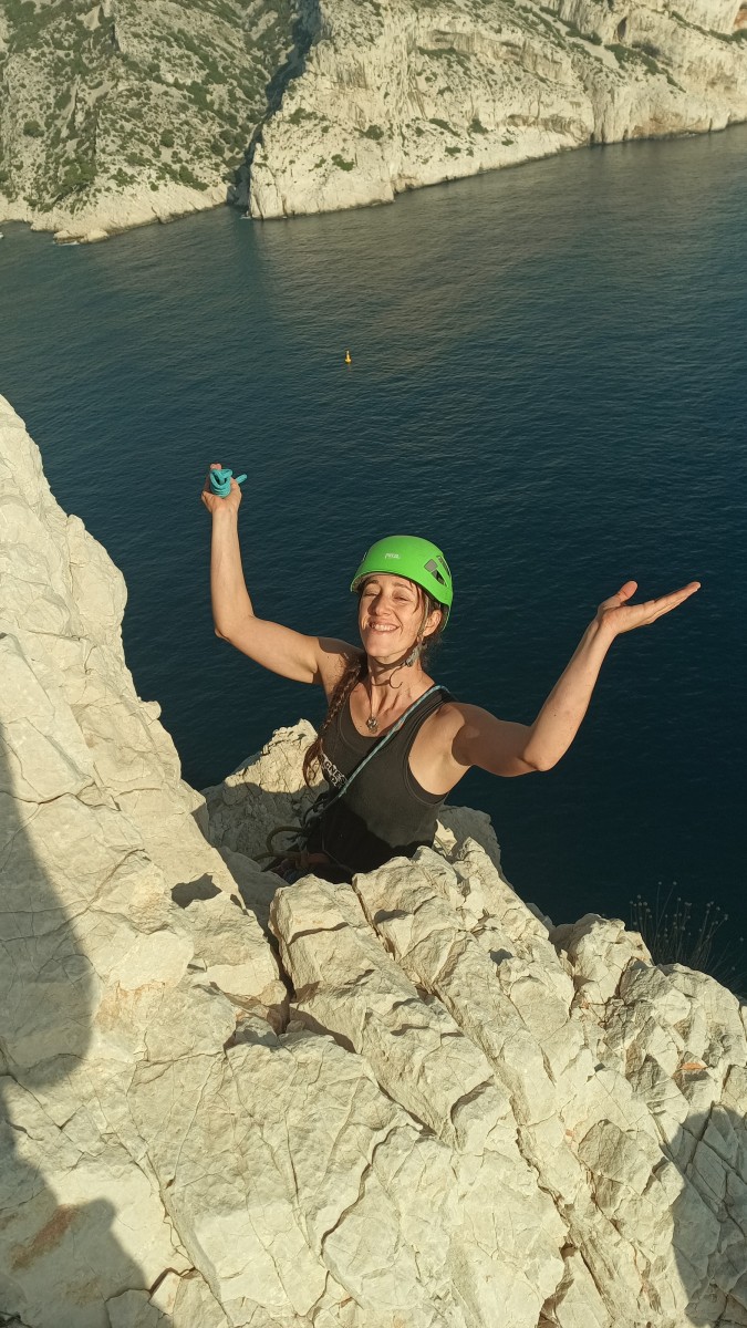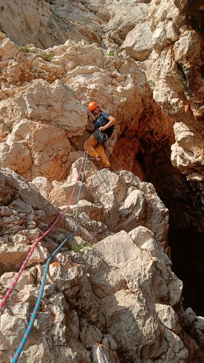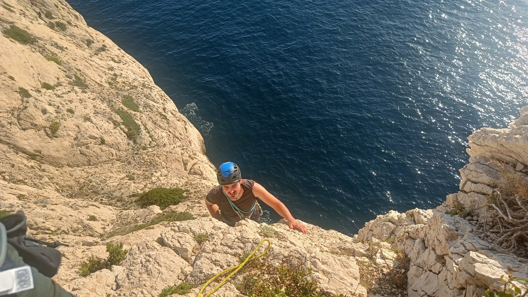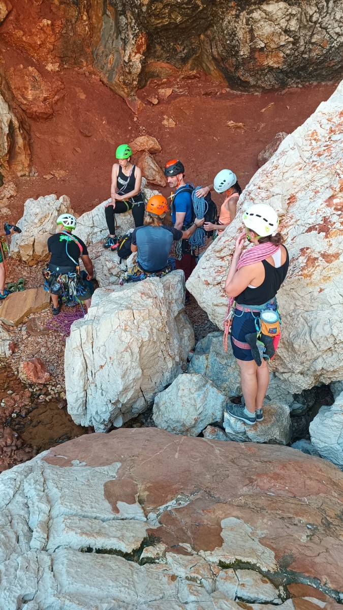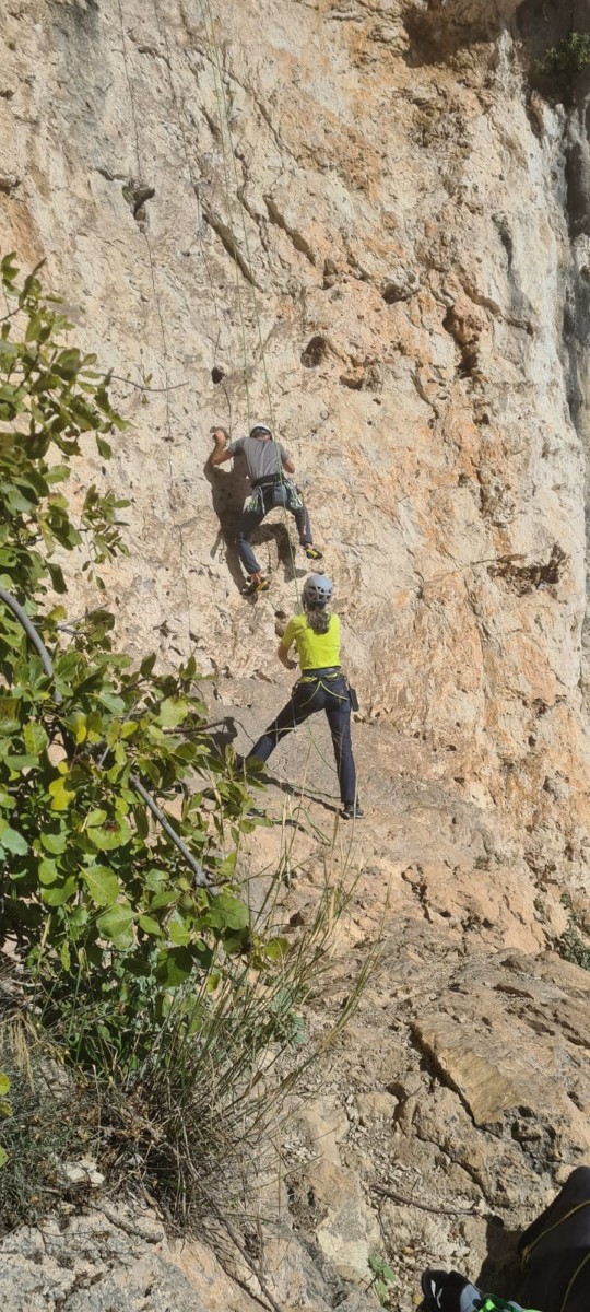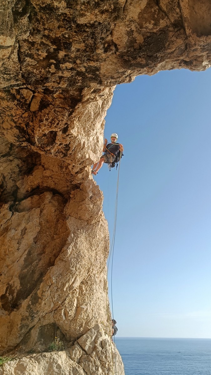 Ni une ni deux, on s’organise pour changer la tête de mouflage, Djé sort son matériel Chullanka qui brille et avec Alexis préparent la manip. Pour ceux qui ne comprennent pas ce que je viens d’écrire, moufler quelqu’un signifie le hisser. Pour ça, on a besoin de démultiplier la force de traction et il existe des manips pour ça. Et, merveilleux travail d’équipe, pendant qu’Alexis, un peu en contrebas, assure Jean-Luc et fait redescendre le bloqueur quand nécessaire, Julien et Djé jouent aux matelos hissant la grand voile ! Tellement efficace que Saliha n’a plus le temps de poser les pieds ou d’enlever les dégaines !