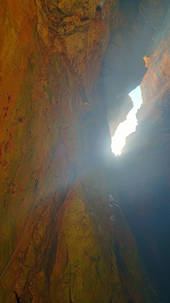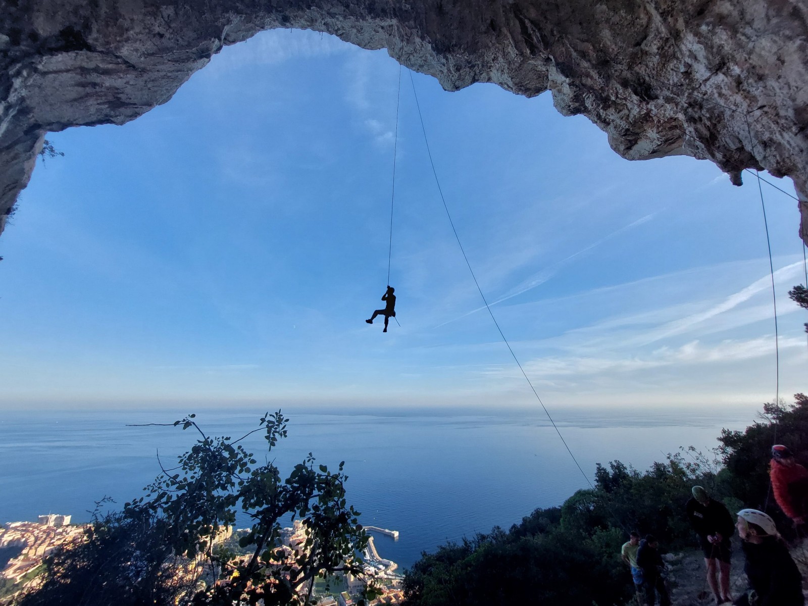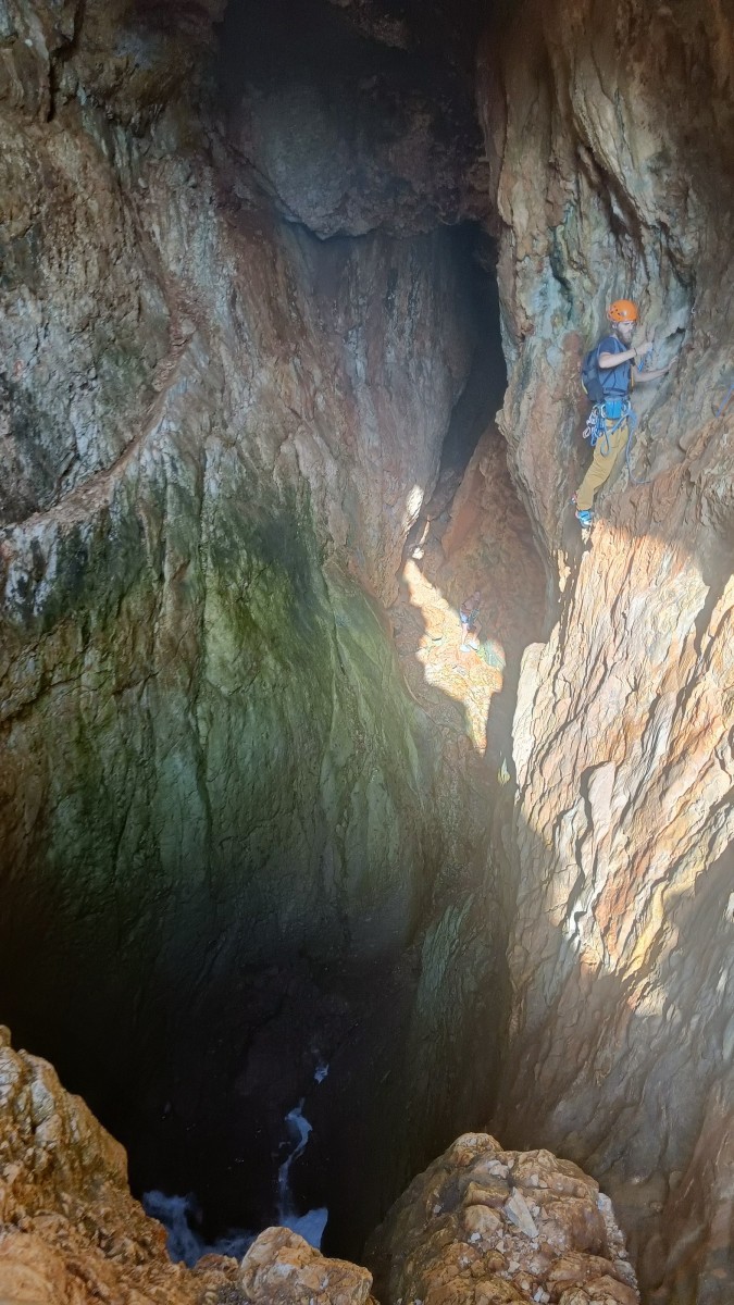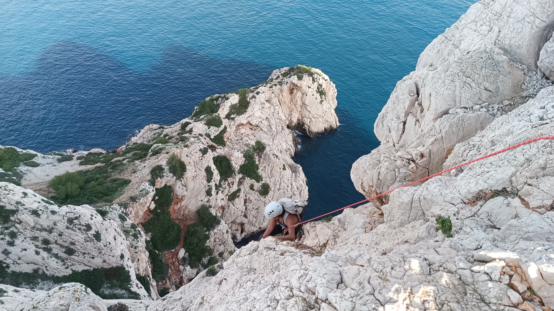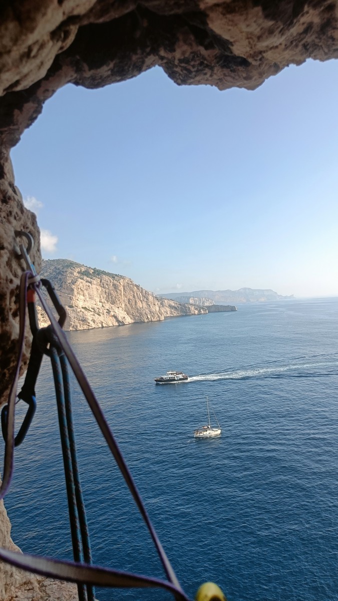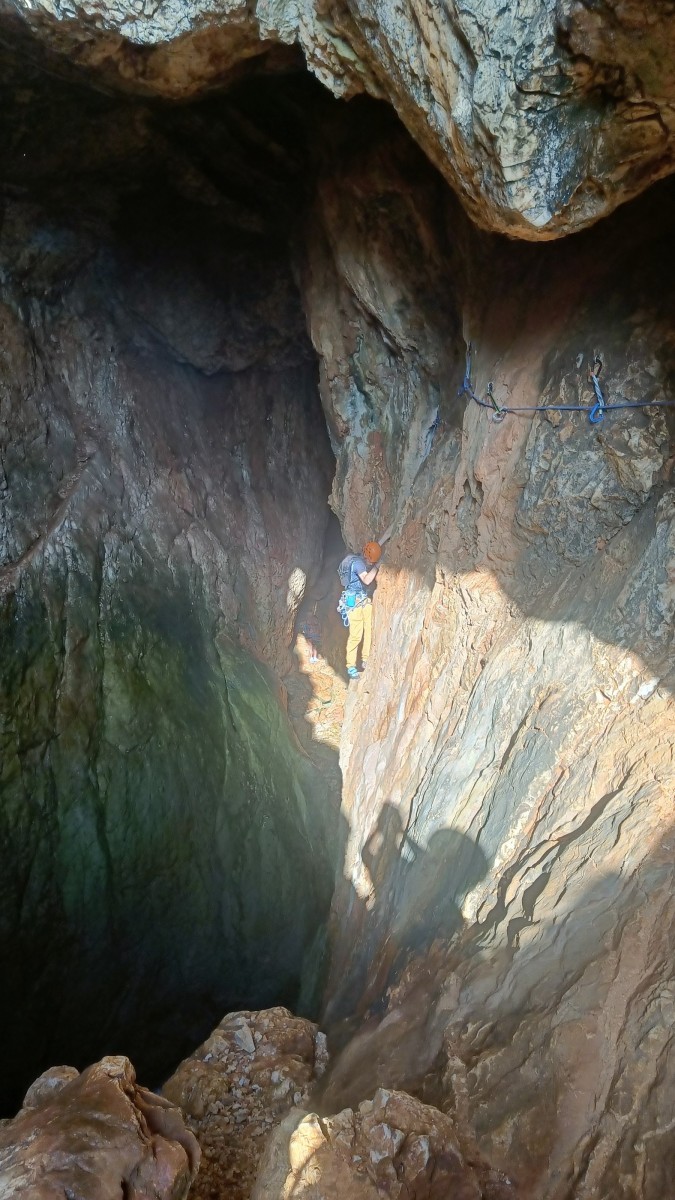 Ni une ni deux, on s’organise pour changer la tête de mouflage, Djé sort son matériel Chullanka qui brille et avec Alexis préparent la manip. Pour ceux qui ne comprennent pas ce que je viens d’écrire, moufler quelqu’un signifie le hisser. Pour ça, on a besoin de démultiplier la force de traction et il existe des manips pour ça. Et, merveilleux travail d’équipe, pendant qu’Alexis, un peu en contrebas, assure Jean-Luc et fait redescendre le bloqueur quand nécessaire, Julien et Djé jouent aux matelos hissant la grand voile ! Tellement efficace que Saliha n’a plus le temps de poser les pieds ou d’enlever les dégaines !
