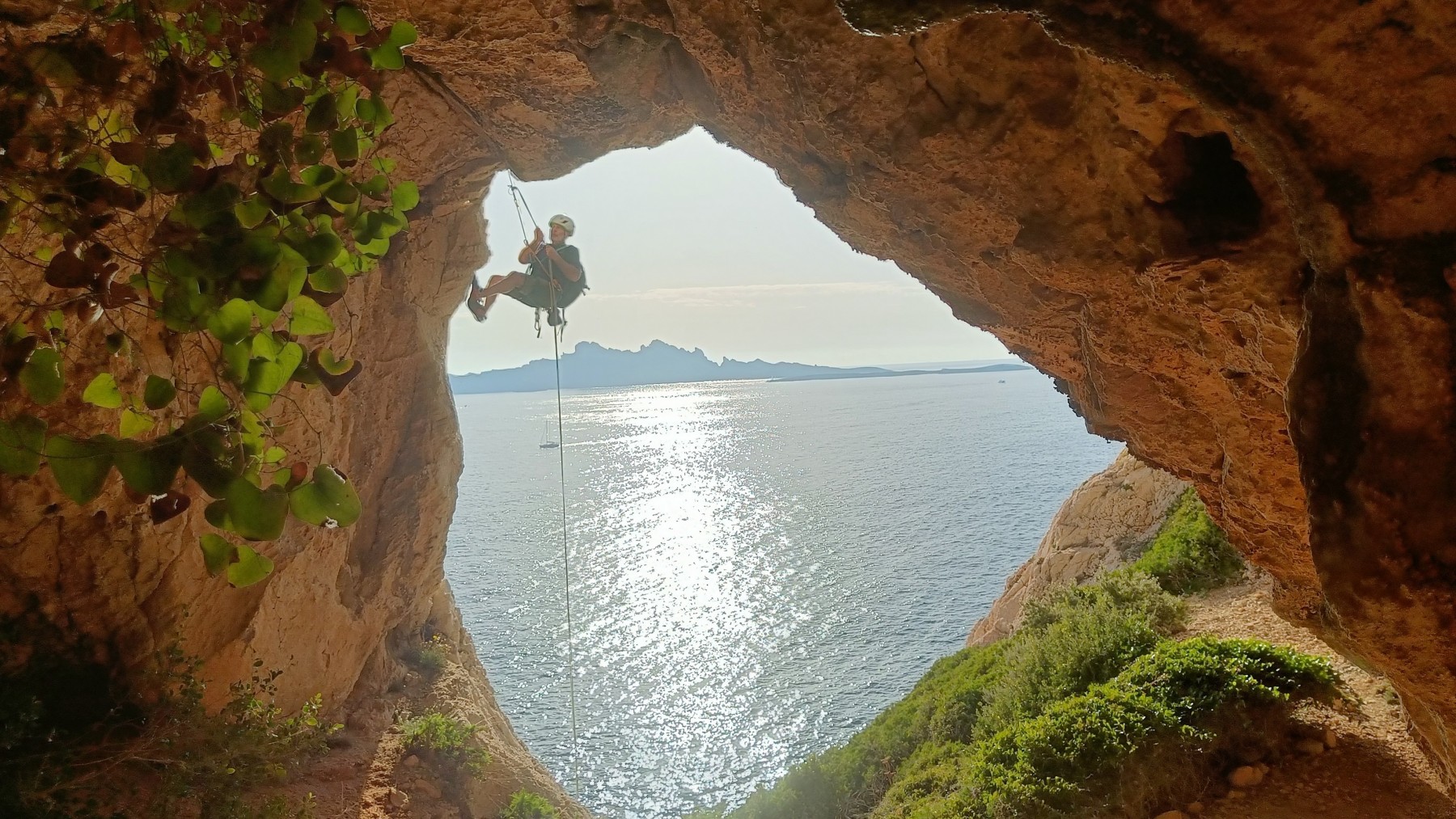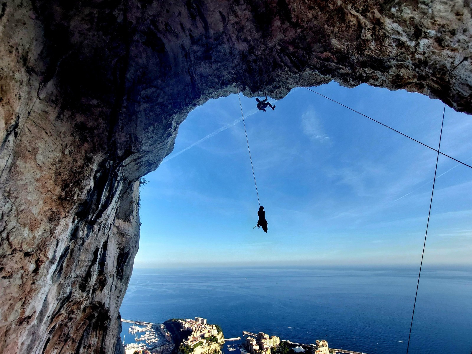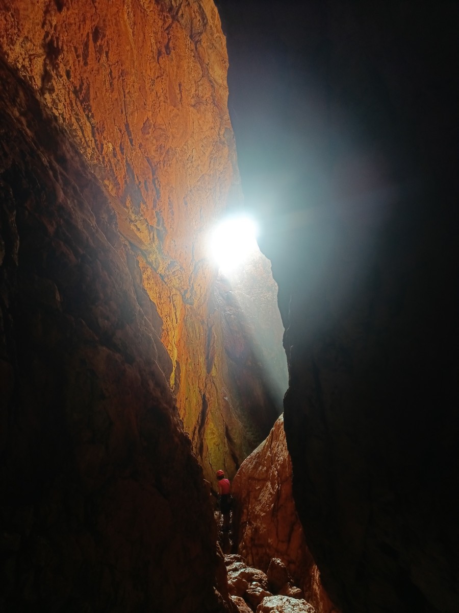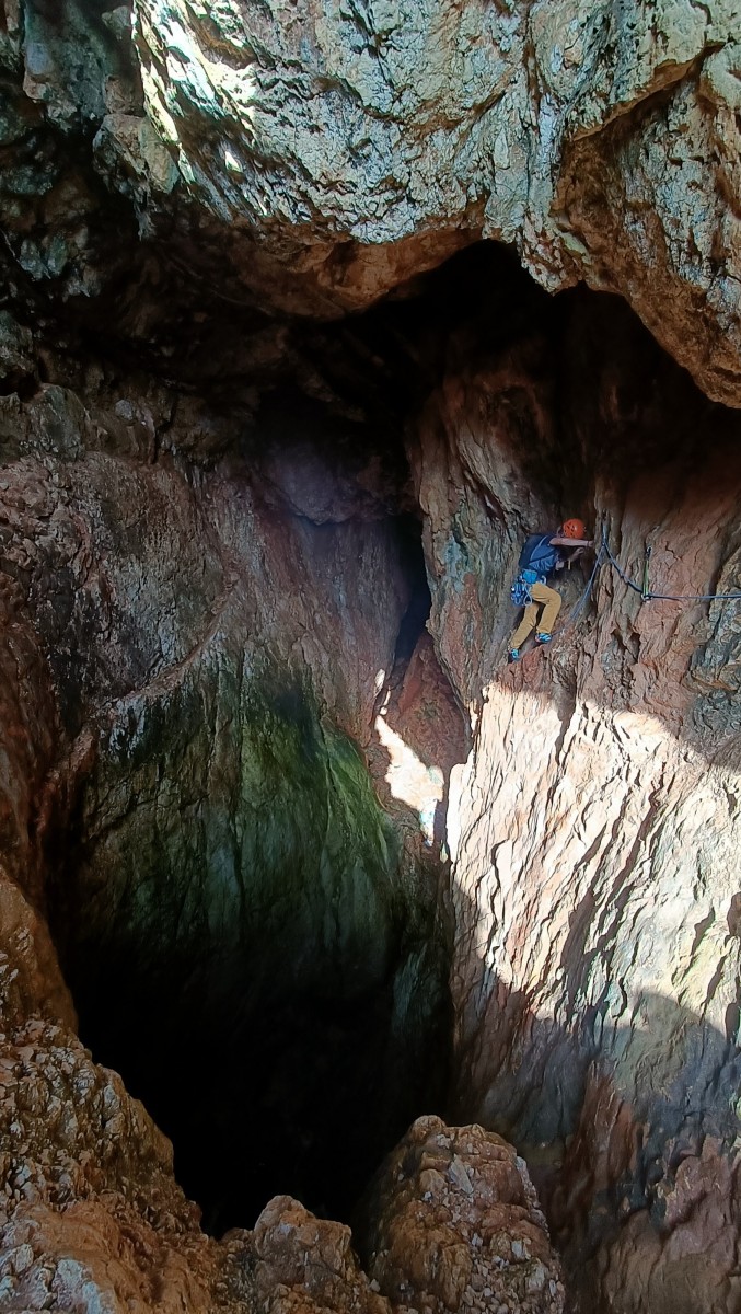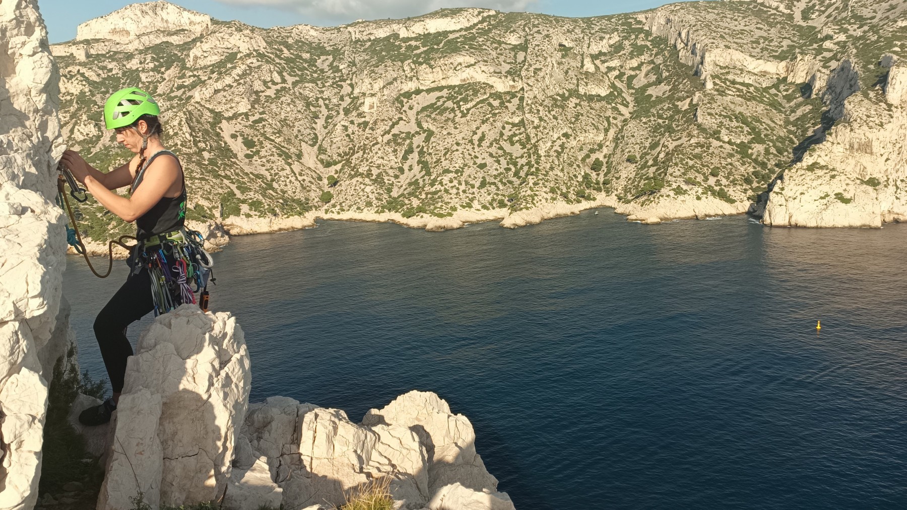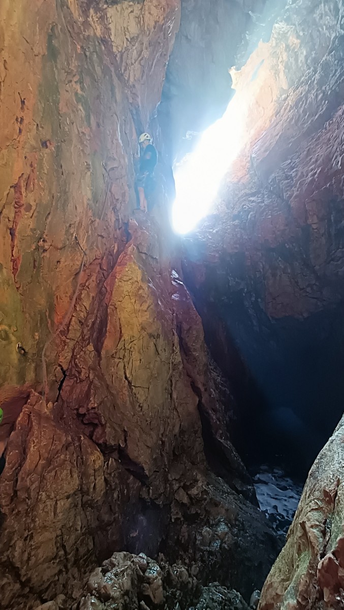 Ni une ni deux, on s’organise pour changer la tête de mouflage, Djé sort son matériel Chullanka qui brille et avec Alexis préparent la manip. Pour ceux qui ne comprennent pas ce que je viens d’écrire, moufler quelqu’un signifie le hisser. Pour ça, on a besoin de démultiplier la force de traction et il existe des manips pour ça. Et, merveilleux travail d’équipe, pendant qu’Alexis, un peu en contrebas, assure Jean-Luc et fait redescendre le bloqueur quand nécessaire, Julien et Djé jouent aux matelos hissant la grand voile ! Tellement efficace que Saliha n’a plus le temps de poser les pieds ou d’enlever les dégaines !