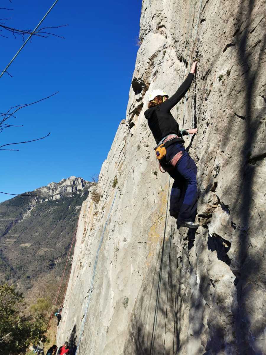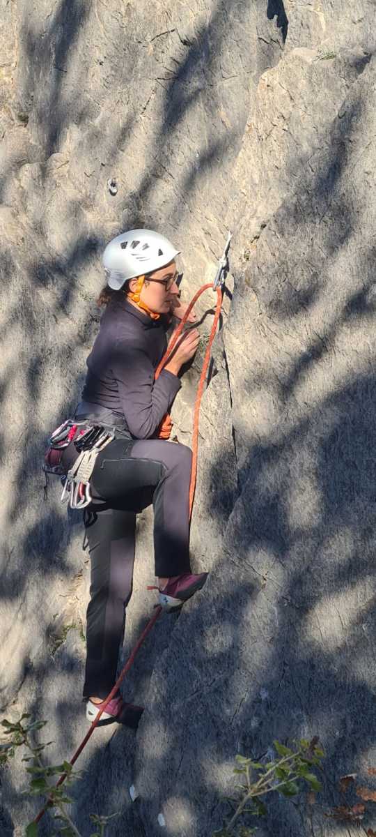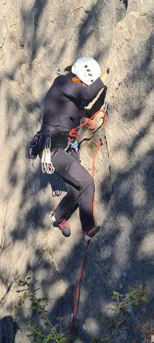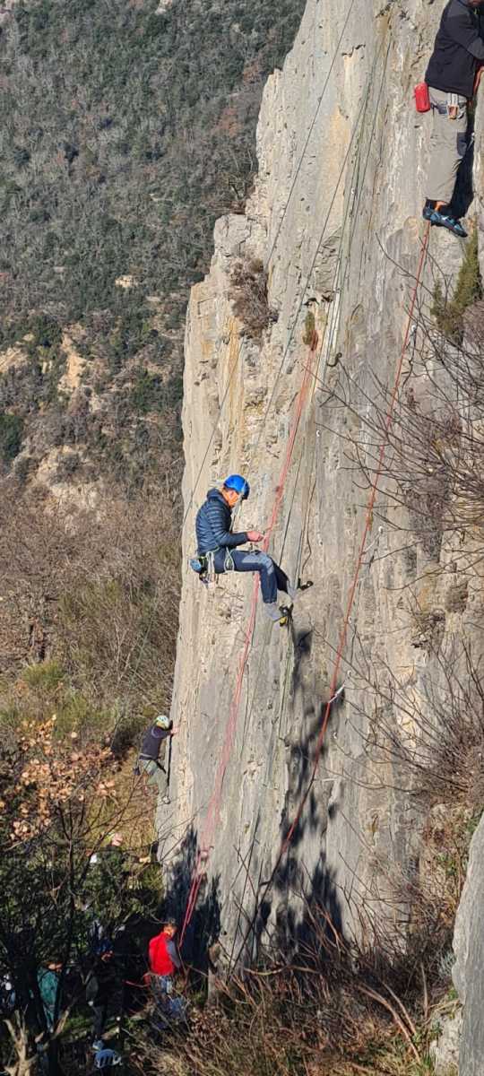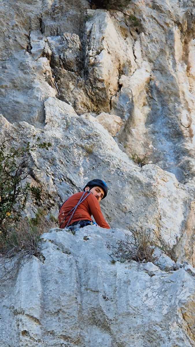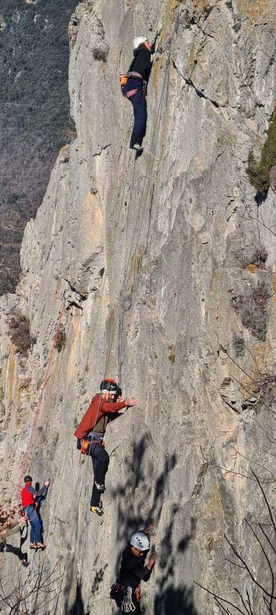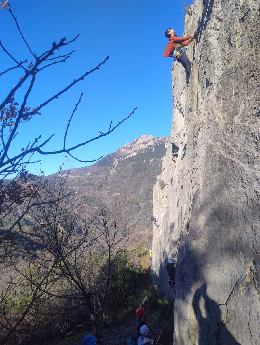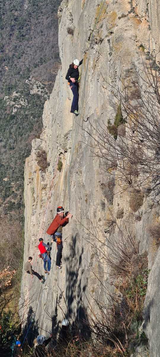 De notre côté, c’est Gautier qui s’est lancé à froid et dans le froid dans le 6a de départ qu’il enchaîne sans trop de difficulté. On le suit avec Camille et pendant que Gautier enchaîne la L2, j’attends patiemment que Julien arrive. Julien qui, dès ses premiers mètres, décroche un beau bloc avec un joli vol à la clé ! Le voilà un peu perturbé. Il e rejoind cependant et assure Roxane qui, comme à son habitude, exprime toute la palette de ses ressentis entre 2 mouvements. Comme c’est elle qui part en tête derrière, je l’attends pour m’assurer que le pas du 5b qui se trouve juste au dessus du relais ne pose pas de problème.