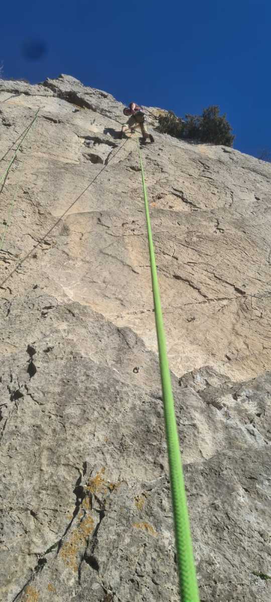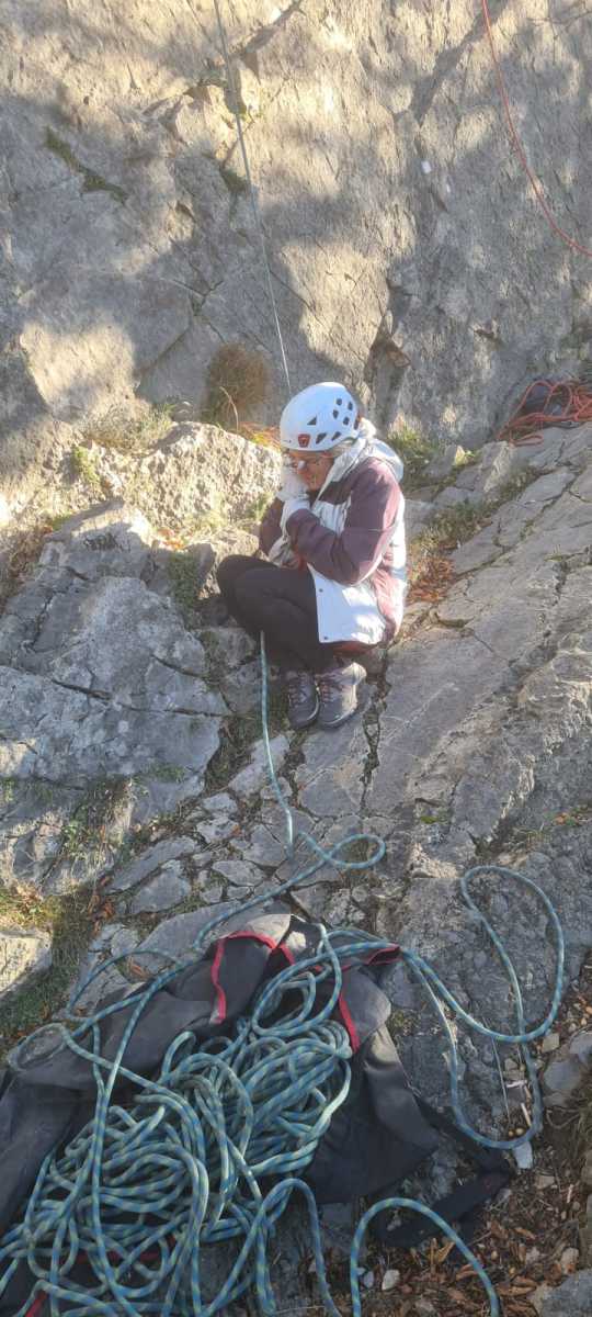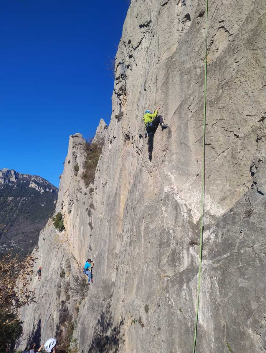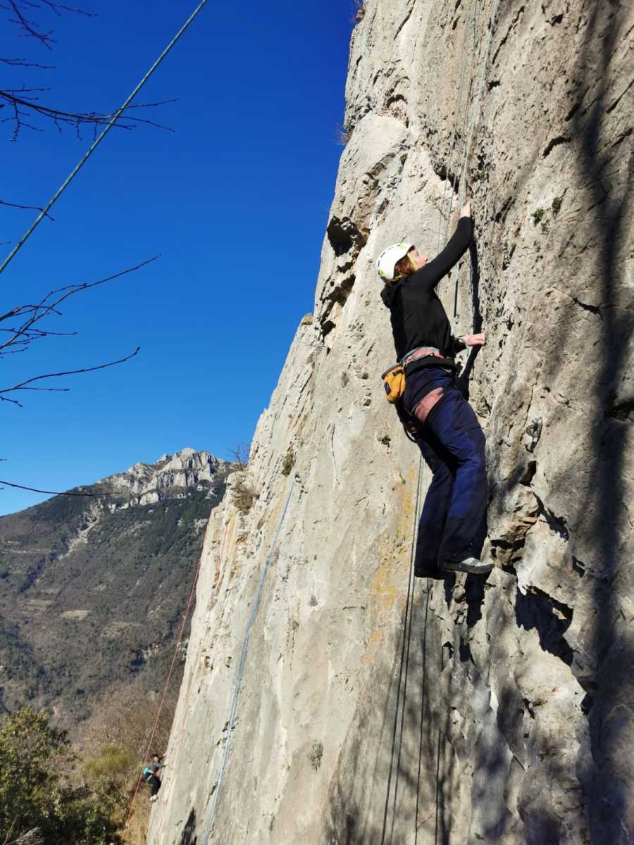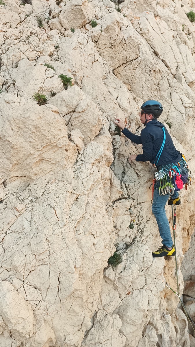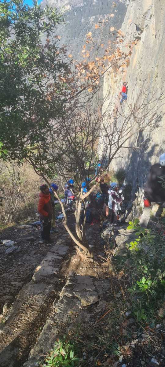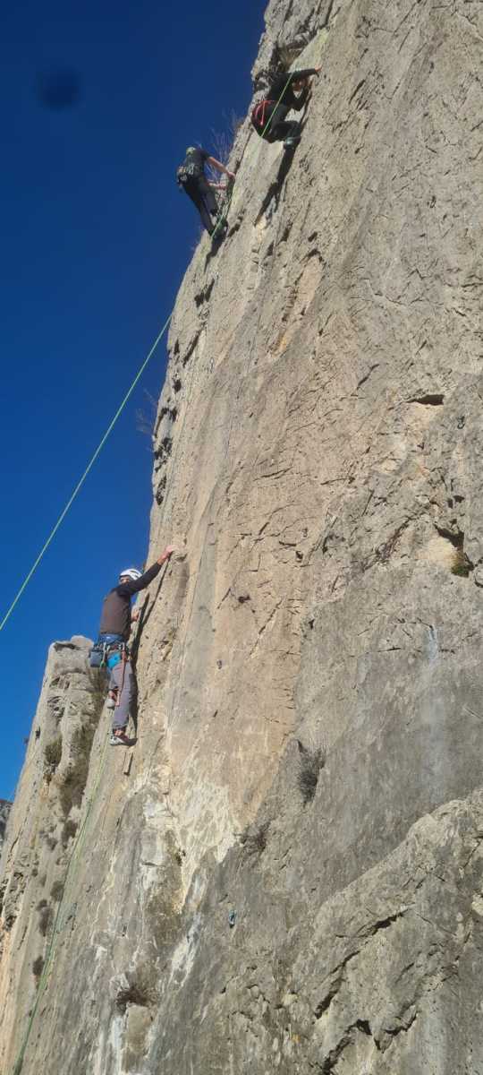 De notre côté, c’est Gautier qui s’est lancé à froid et dans le froid dans le 6a de départ qu’il enchaîne sans trop de difficulté. On le suit avec Camille et pendant que Gautier enchaîne la L2, j’attends patiemment que Julien arrive. Julien qui, dès ses premiers mètres, décroche un beau bloc avec un joli vol à la clé ! Le voilà un peu perturbé. Il e rejoind cependant et assure Roxane qui, comme à son habitude, exprime toute la palette de ses ressentis entre 2 mouvements. Comme c’est elle qui part en tête derrière, je l’attends pour m’assurer que le pas du 5b qui se trouve juste au dessus du relais ne pose pas de problème.