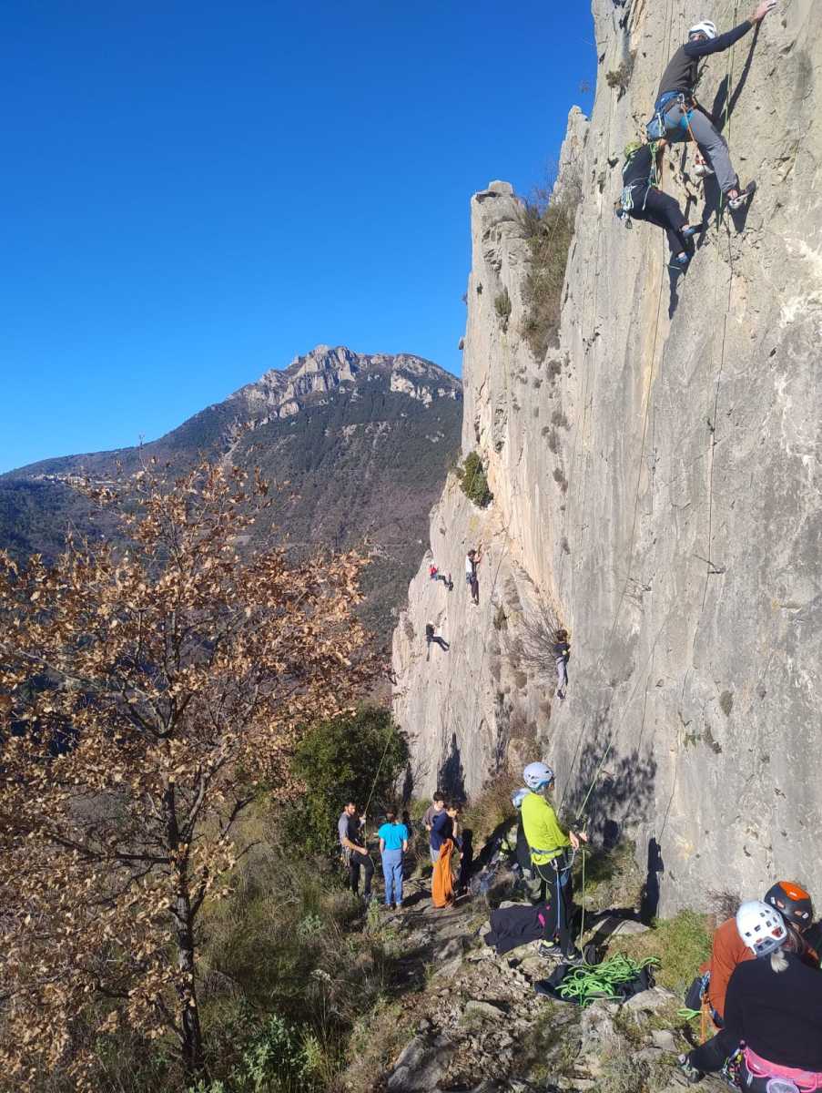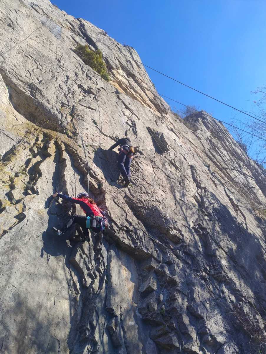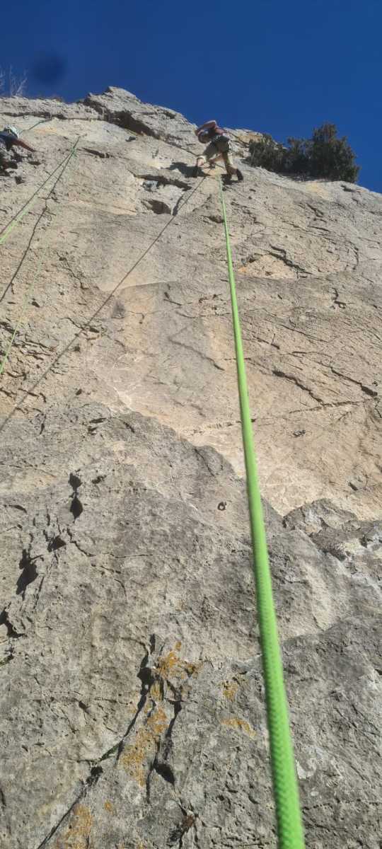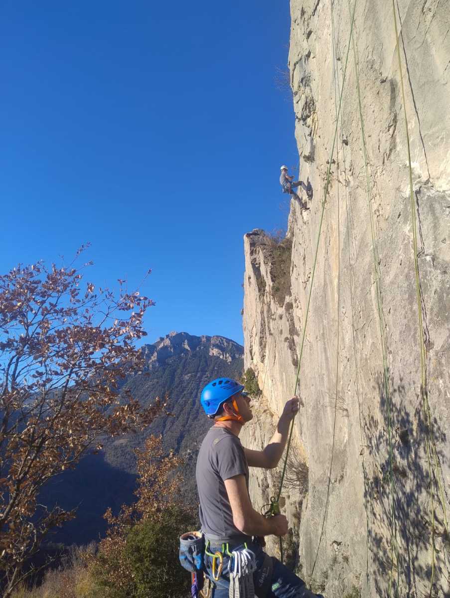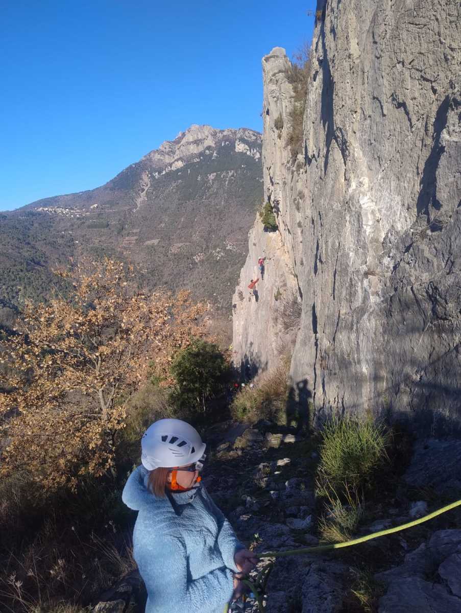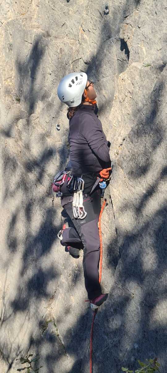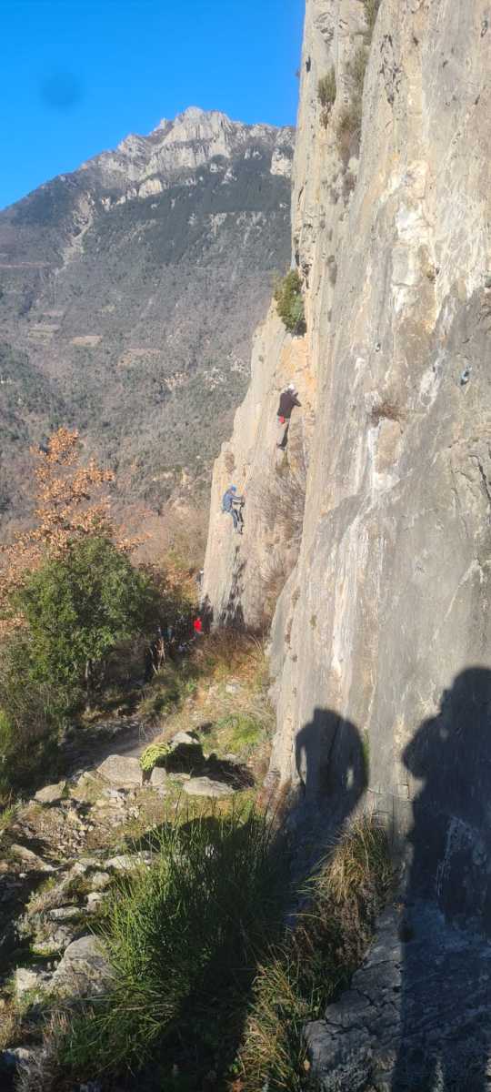 De notre côté, c’est Gautier qui s’est lancé à froid et dans le froid dans le 6a de départ qu’il enchaîne sans trop de difficulté. On le suit avec Camille et pendant que Gautier enchaîne la L2, j’attends patiemment que Julien arrive. Julien qui, dès ses premiers mètres, décroche un beau bloc avec un joli vol à la clé ! Le voilà un peu perturbé. Il e rejoind cependant et assure Roxane qui, comme à son habitude, exprime toute la palette de ses ressentis entre 2 mouvements. Comme c’est elle qui part en tête derrière, je l’attends pour m’assurer que le pas du 5b qui se trouve juste au dessus du relais ne pose pas de problème.