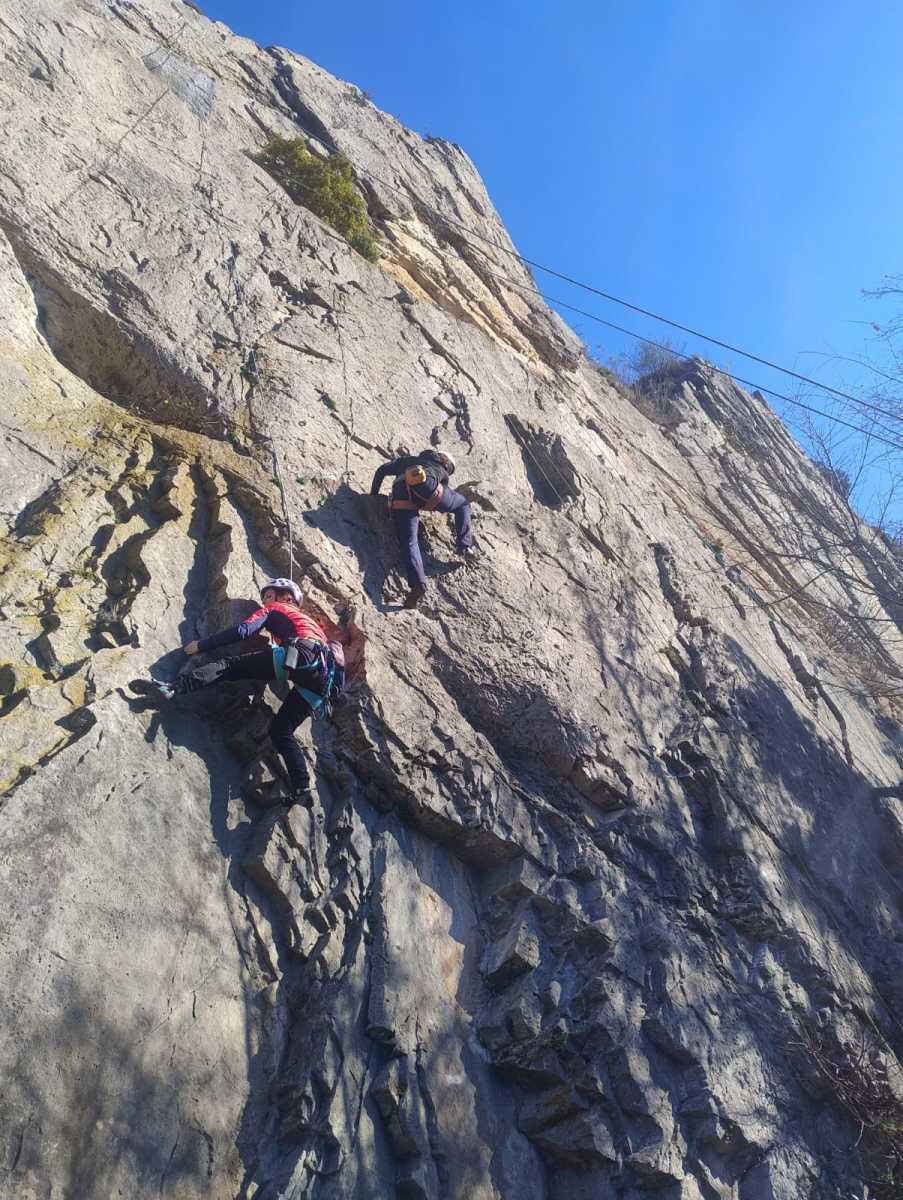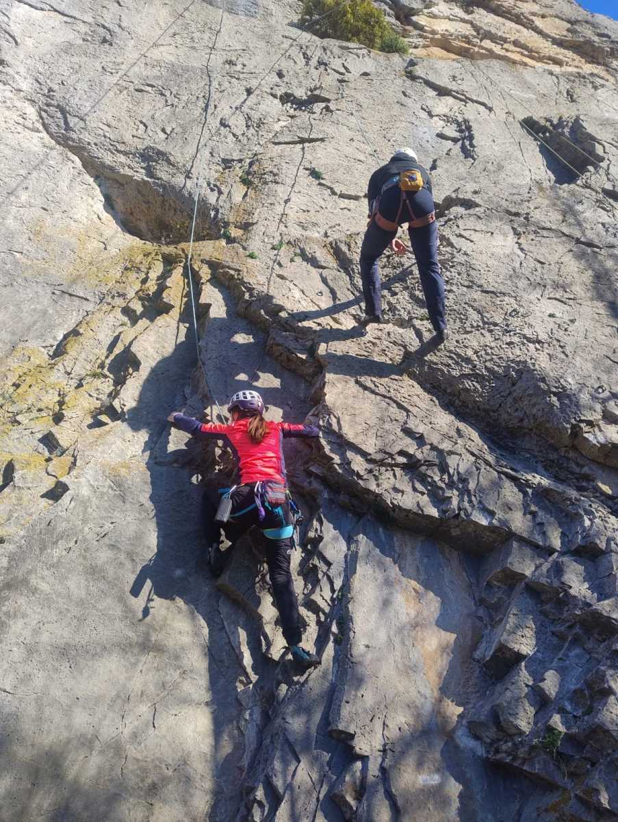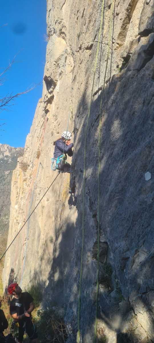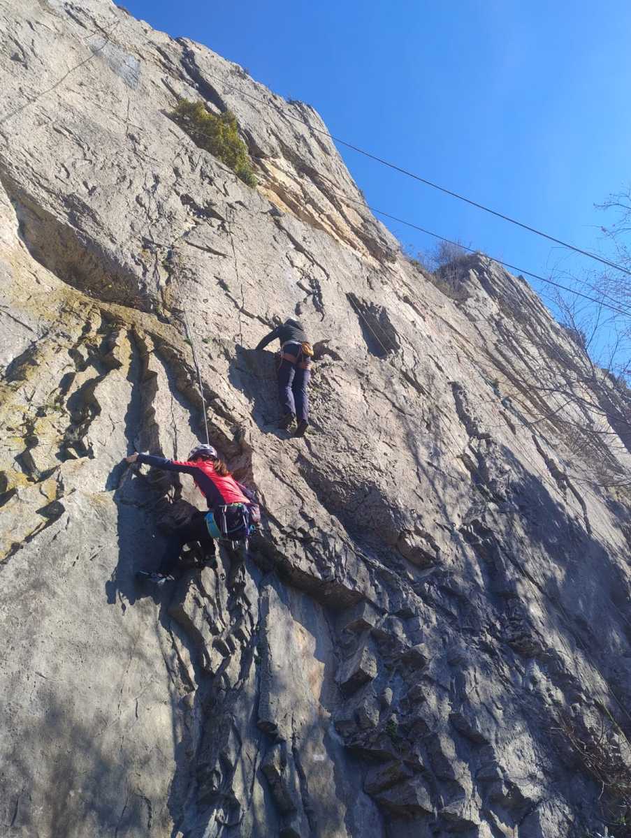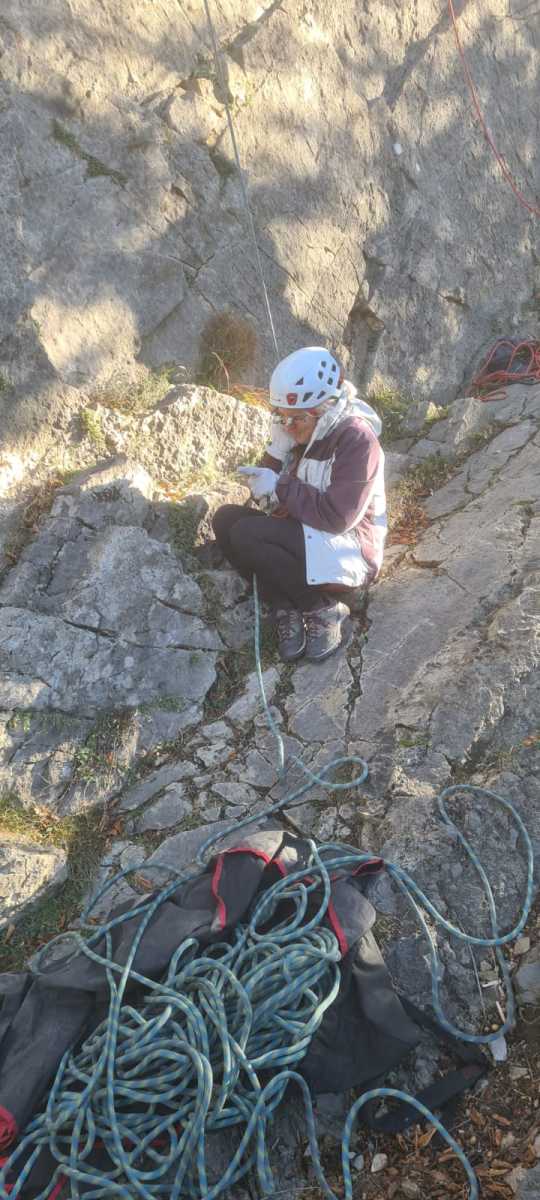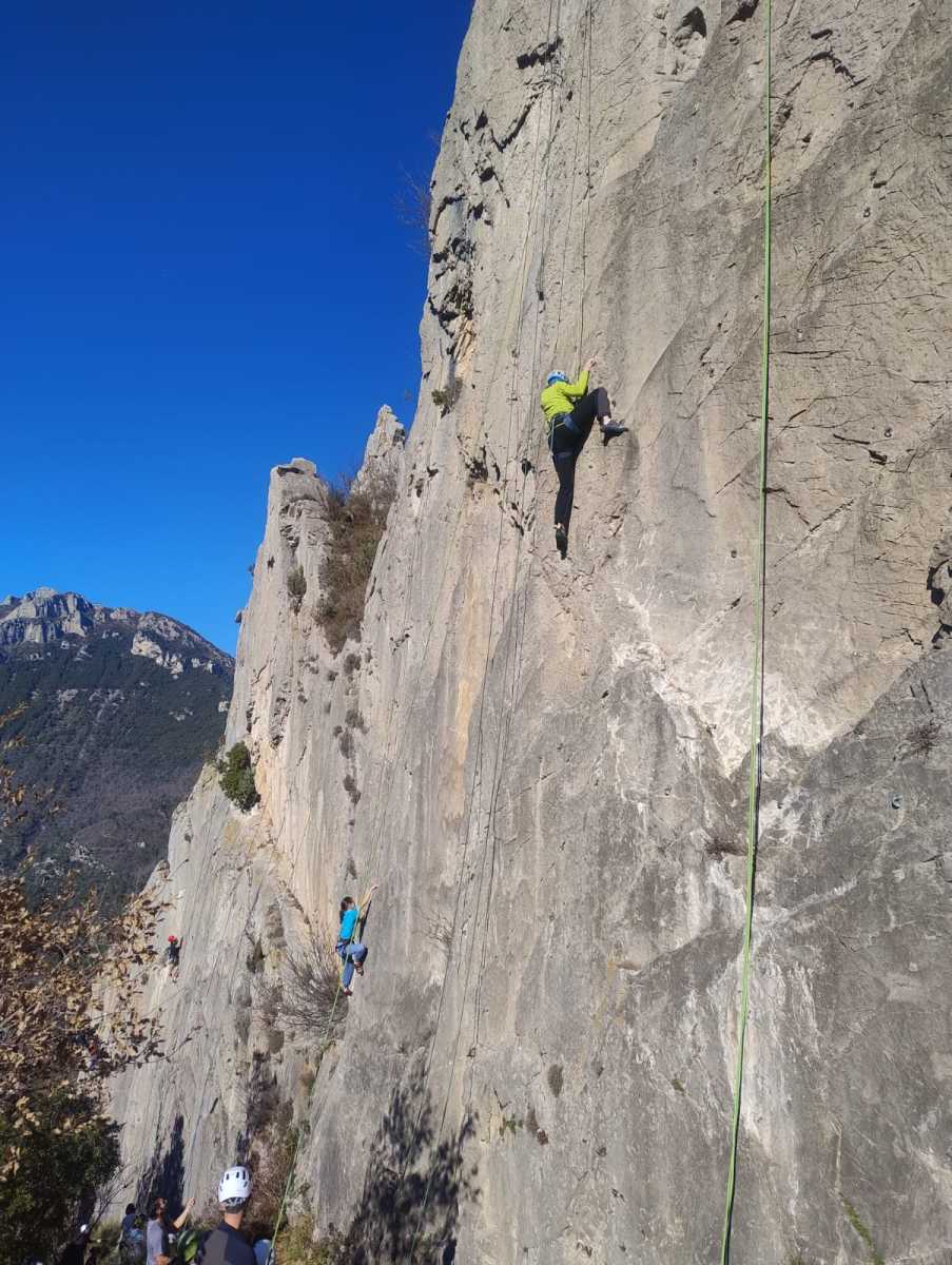 De notre côté, c’est Gautier qui s’est lancé à froid et dans le froid dans le 6a de départ qu’il enchaîne sans trop de difficulté. On le suit avec Camille et pendant que Gautier enchaîne la L2, j’attends patiemment que Julien arrive. Julien qui, dès ses premiers mètres, décroche un beau bloc avec un joli vol à la clé ! Le voilà un peu perturbé. Il e rejoind cependant et assure Roxane qui, comme à son habitude, exprime toute la palette de ses ressentis entre 2 mouvements. Comme c’est elle qui part en tête derrière, je l’attends pour m’assurer que le pas du 5b qui se trouve juste au dessus du relais ne pose pas de problème.