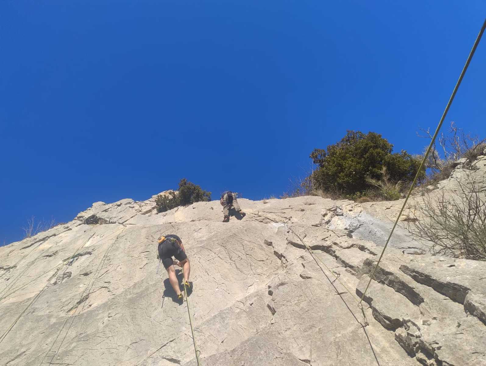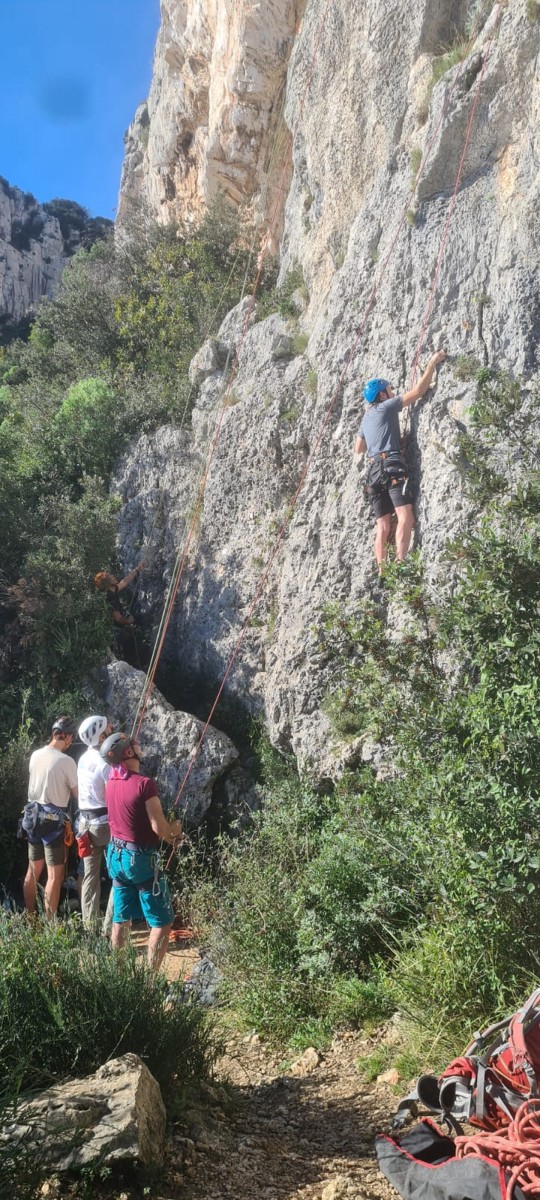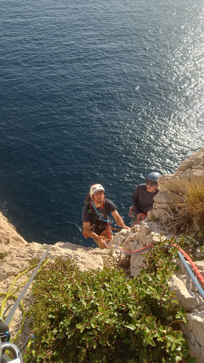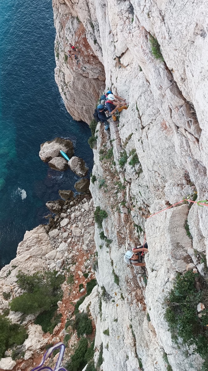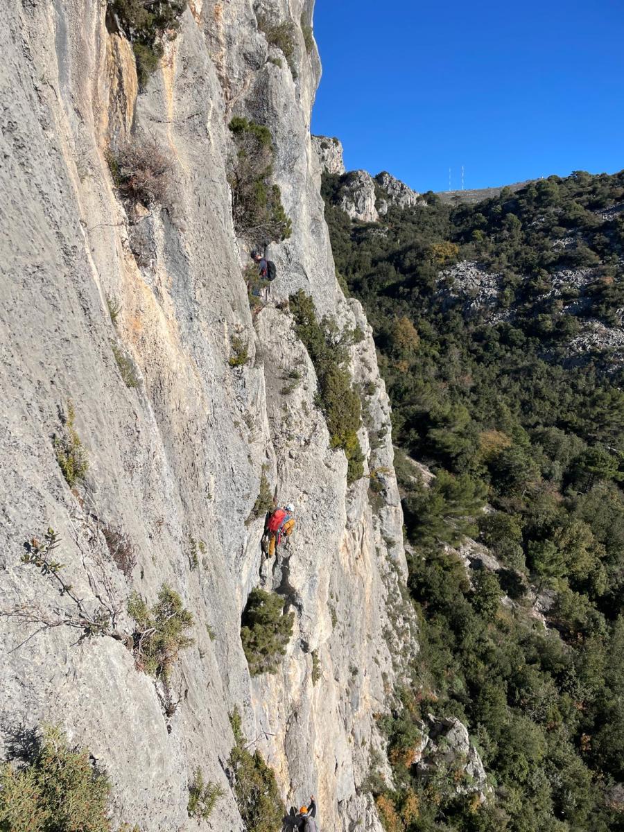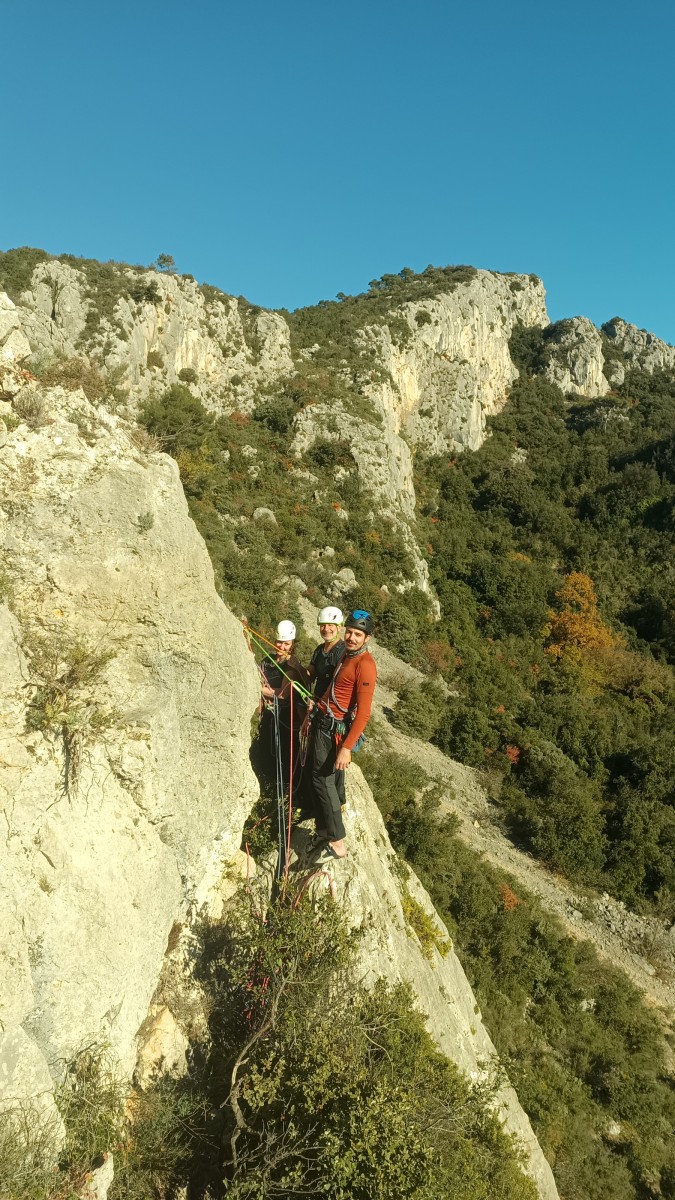 Nous avons fait 4 cordées pour 2 voies. A gauche, Camille Gautier et moi-même partons devant dans « Dernière cartouche », 4 longueurs entre 4c et 6a+ pour arriver à la grande terrasse sommitale et le dernier ressaut qui offre de multiples possibilités. Derrière nous Roxane et Julien se préparent.