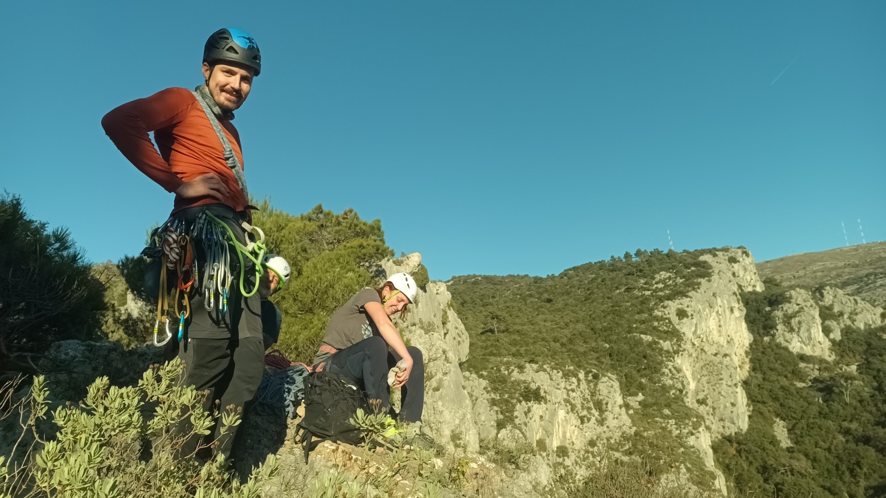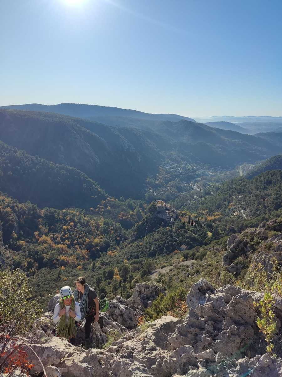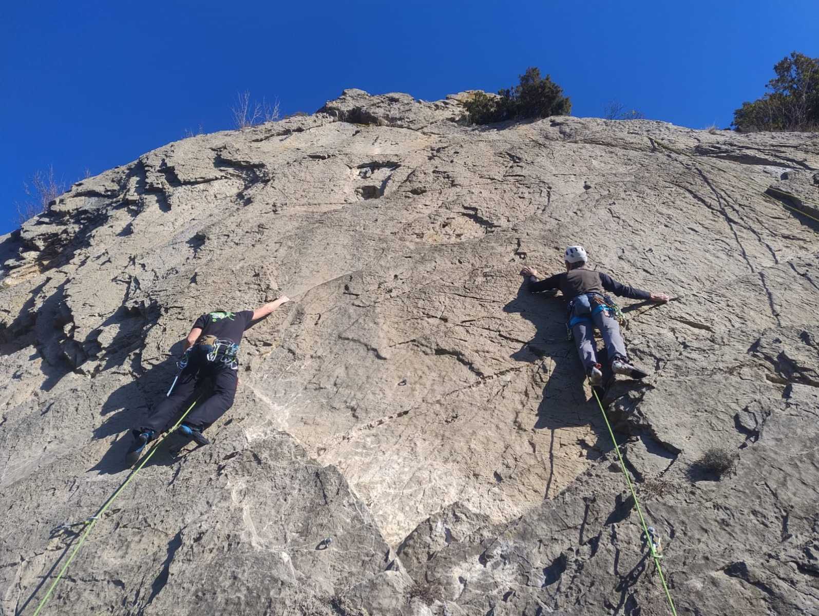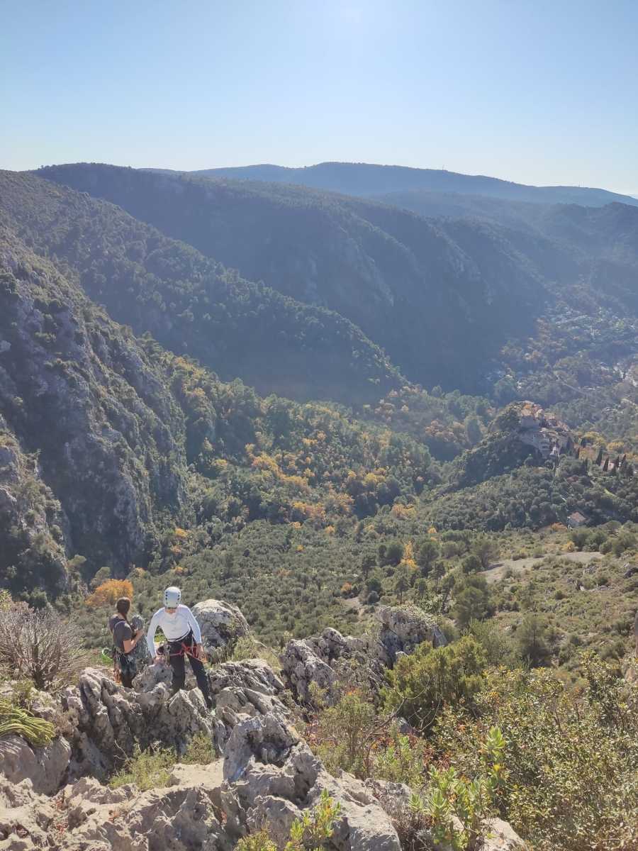 Nous avons fait 4 cordées pour 2 voies. A gauche, Camille Gautier et moi-même partons devant dans « Dernière cartouche », 4 longueurs entre 4c et 6a+ pour arriver à la grande terrasse sommitale et le dernier ressaut qui offre de multiples possibilités. Derrière nous Roxane et Julien se préparent.