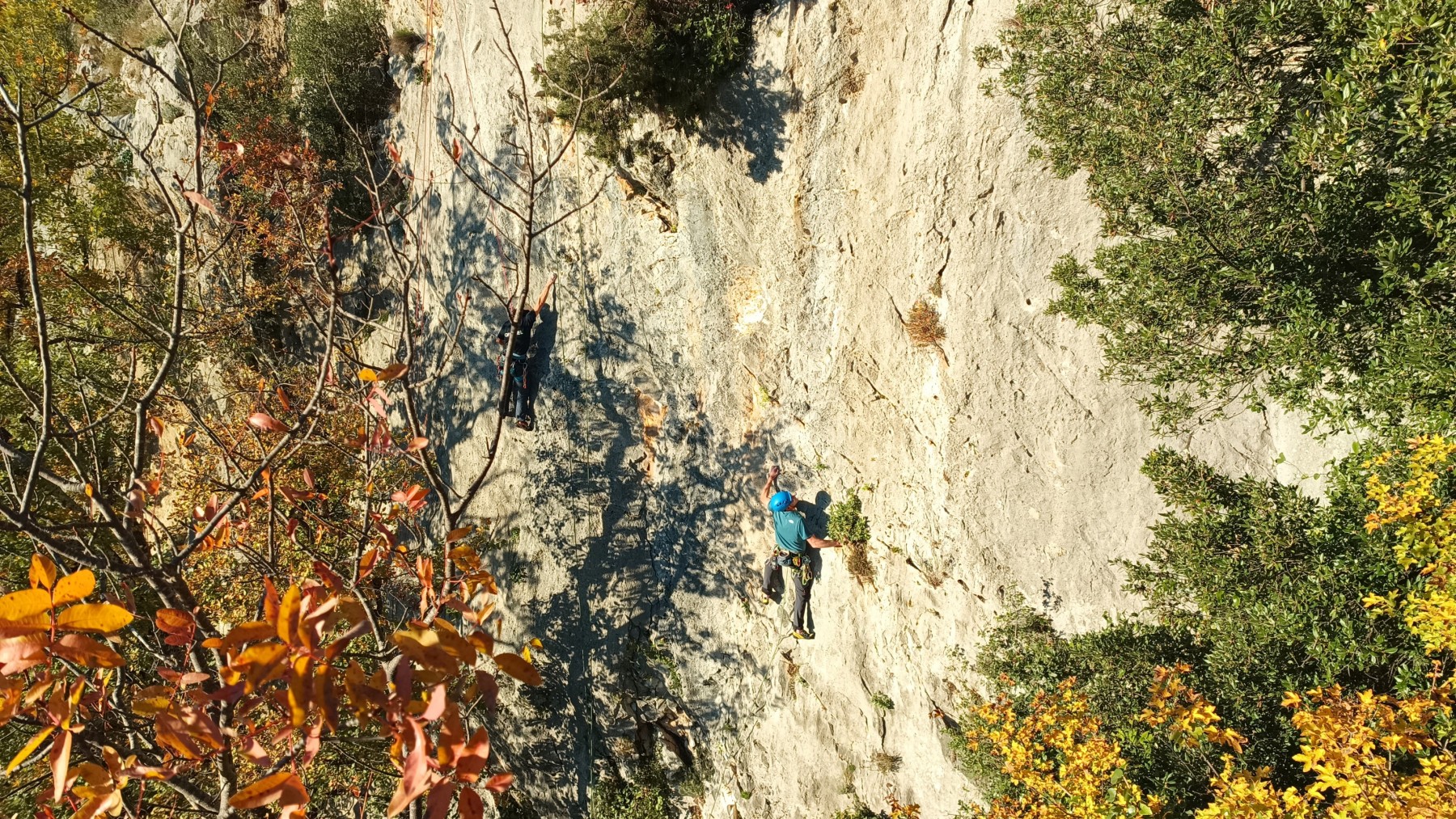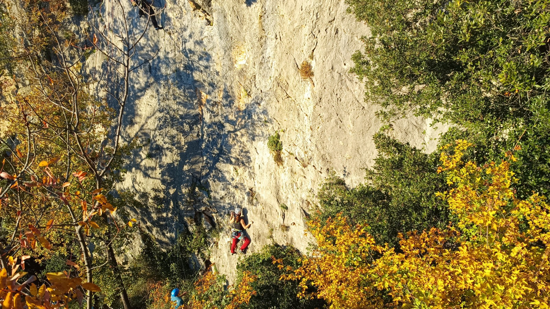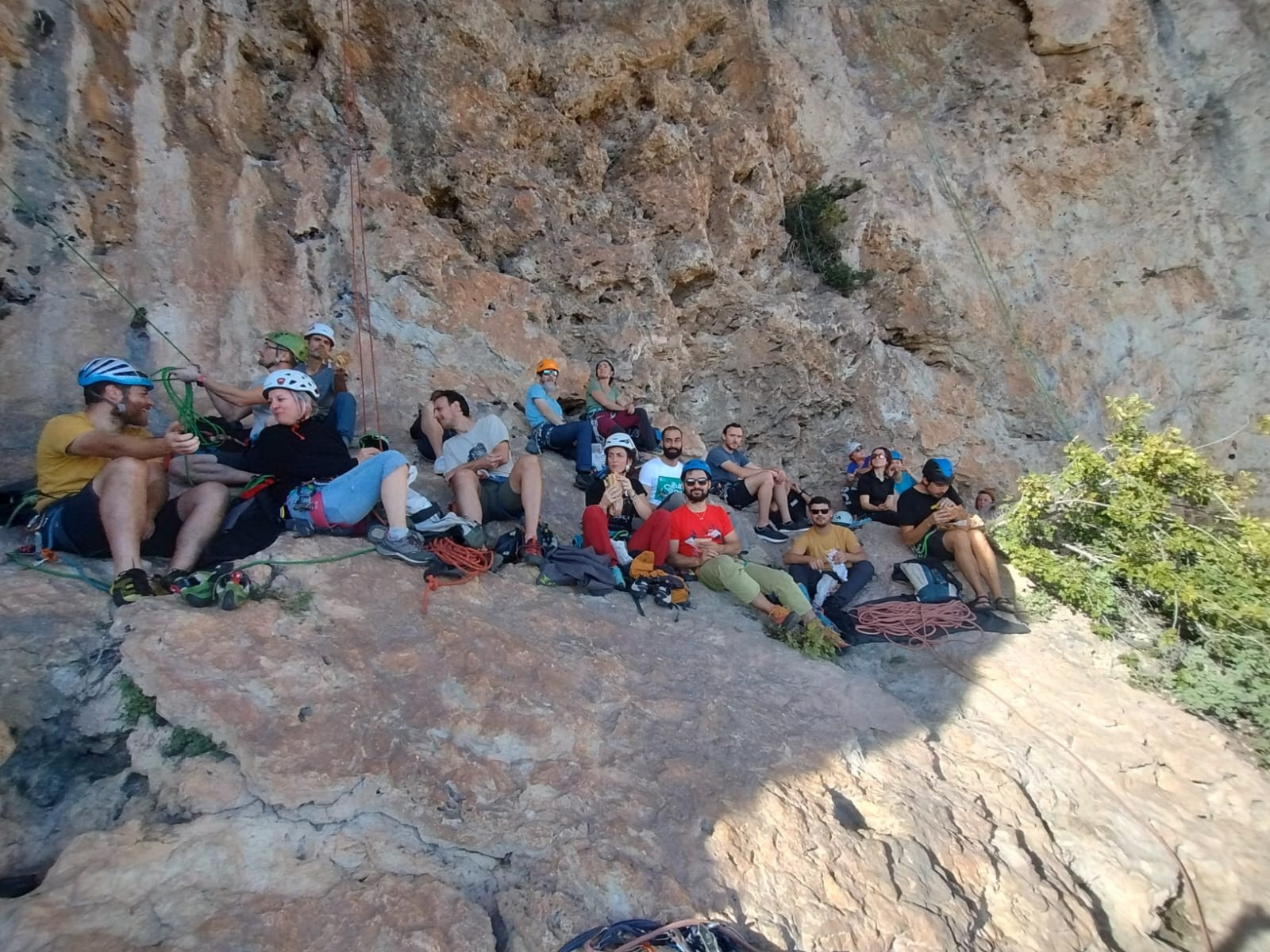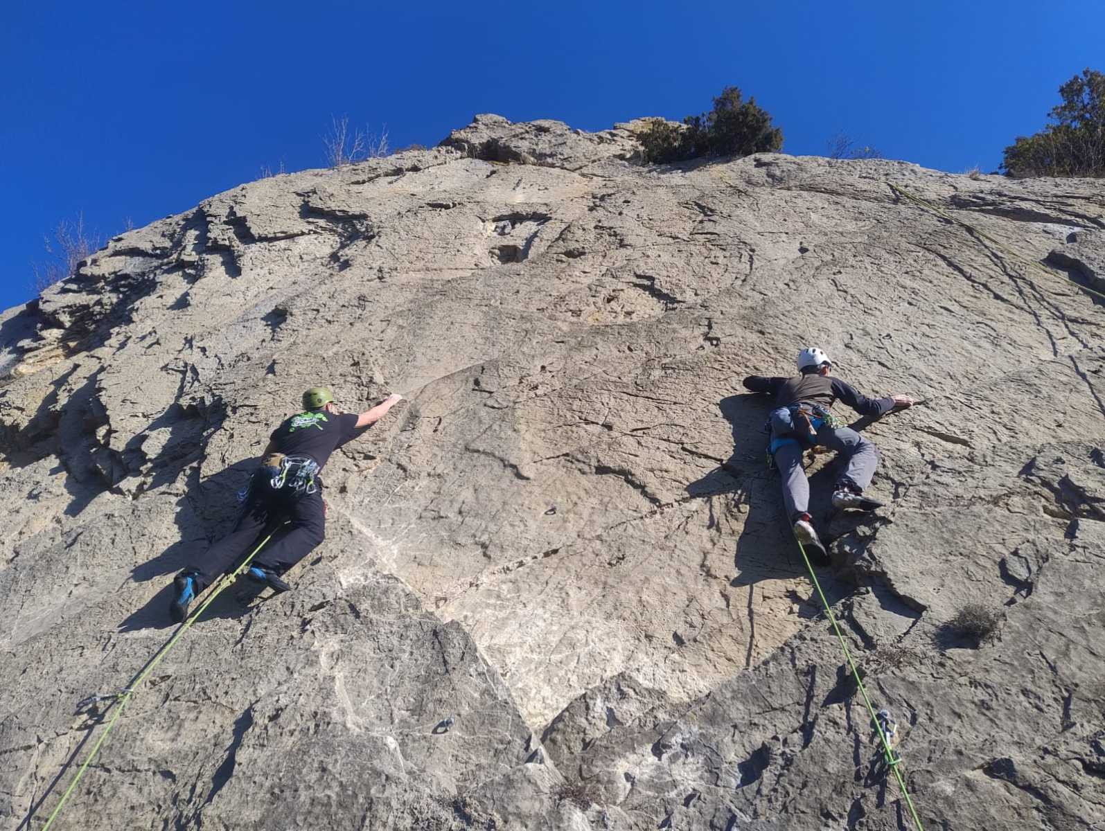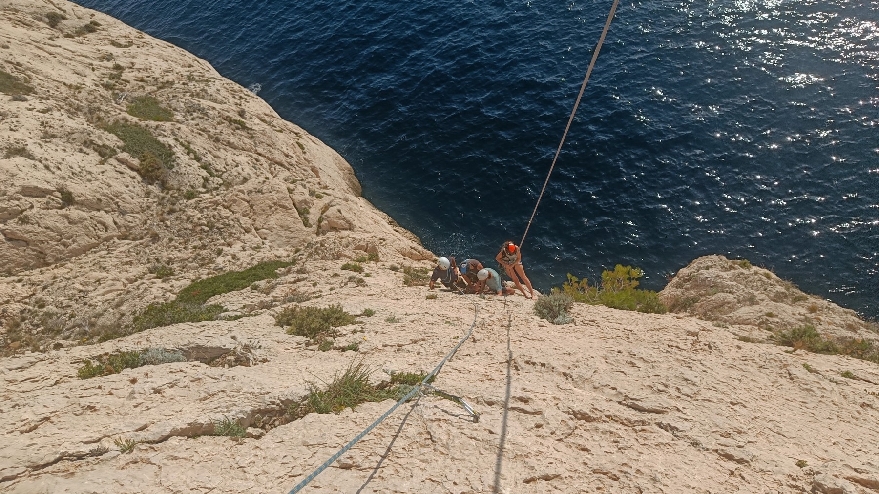 Nous avons fait 4 cordées pour 2 voies. A gauche, Camille Gautier et moi-même partons devant dans « Dernière cartouche », 4 longueurs entre 4c et 6a+ pour arriver à la grande terrasse sommitale et le dernier ressaut qui offre de multiples possibilités. Derrière nous Roxane et Julien se préparent.