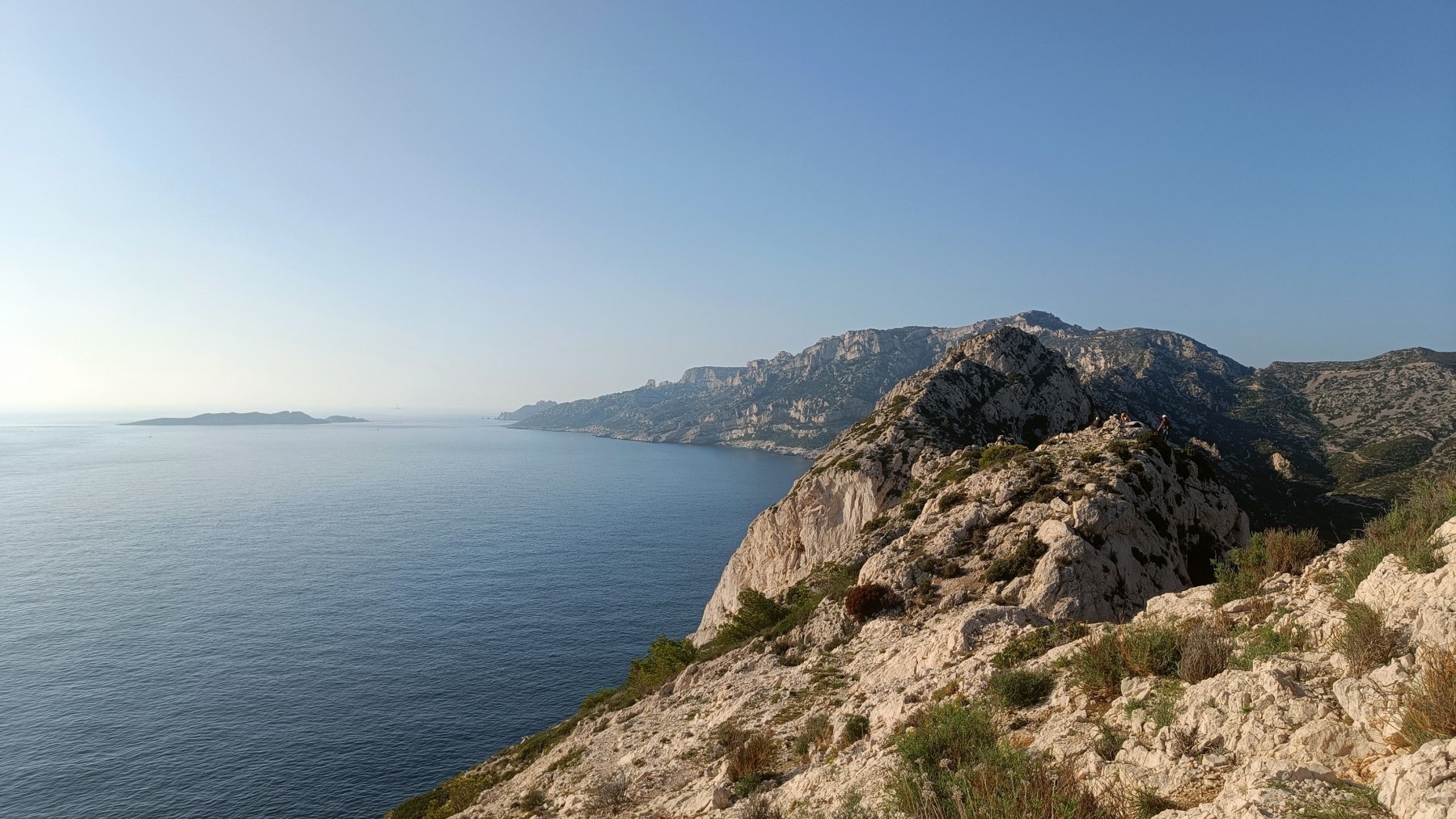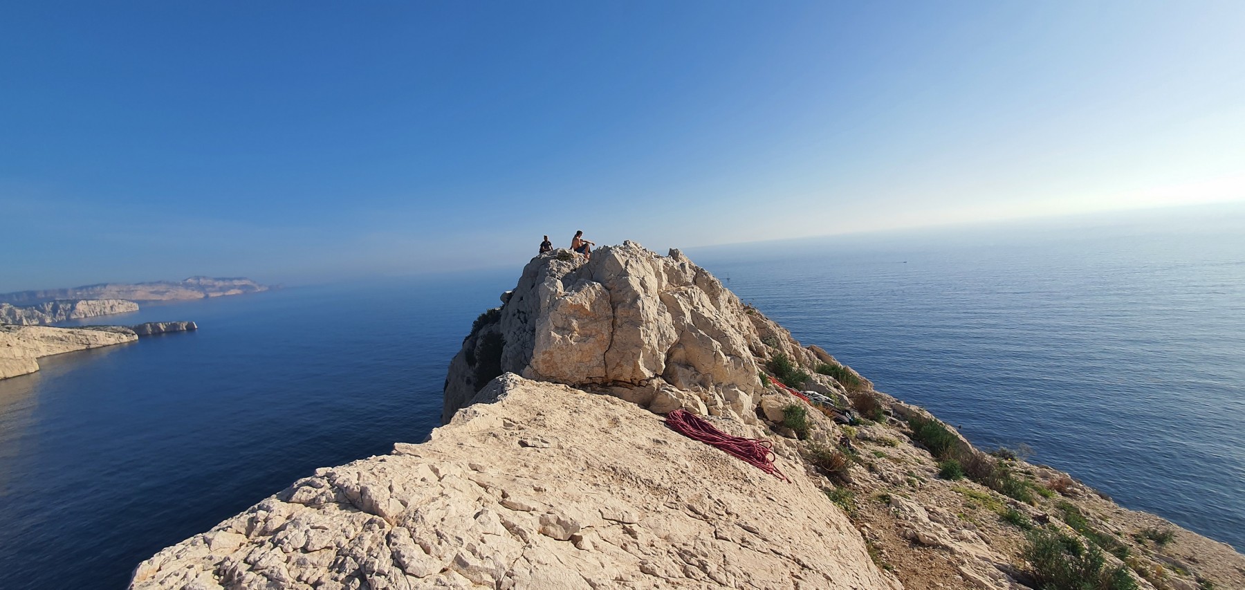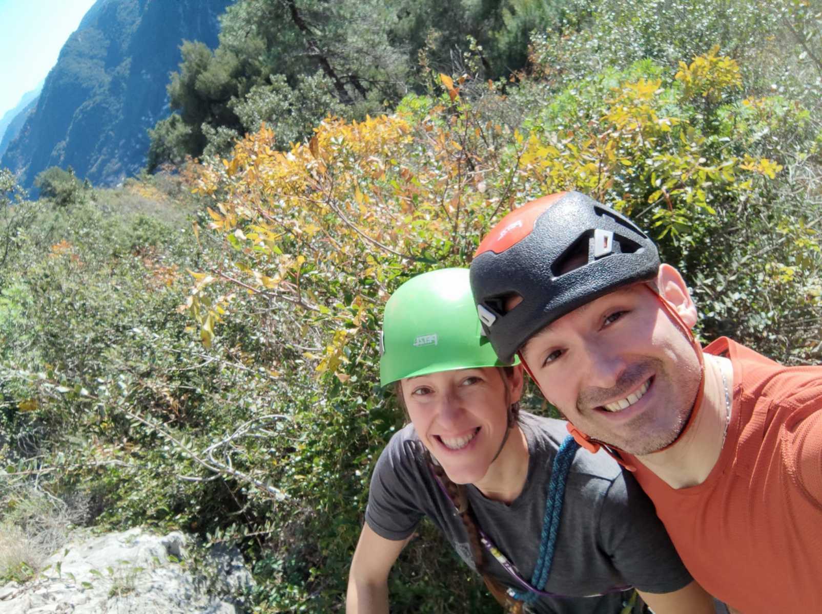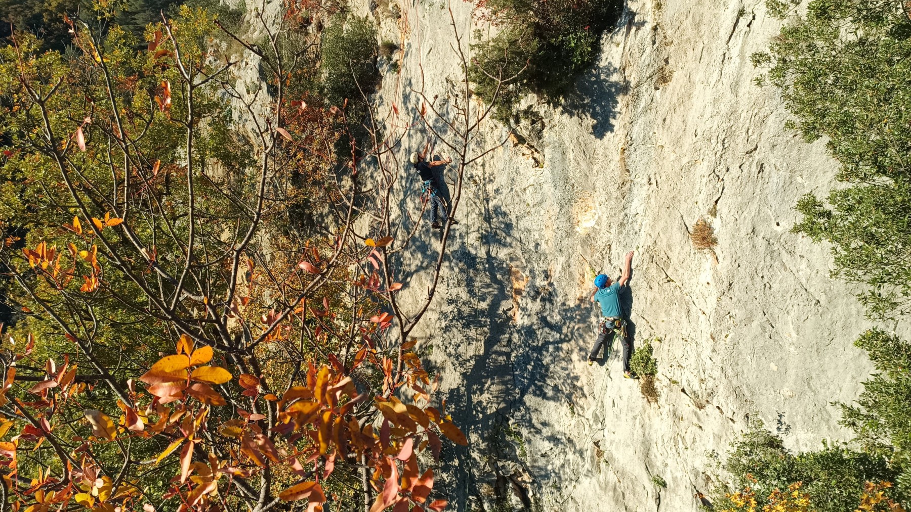 Nous avons fait 4 cordées pour 2 voies. A gauche, Camille Gautier et moi-même partons devant dans « Dernière cartouche », 4 longueurs entre 4c et 6a+ pour arriver à la grande terrasse sommitale et le dernier ressaut qui offre de multiples possibilités. Derrière nous Roxane et Julien se préparent.