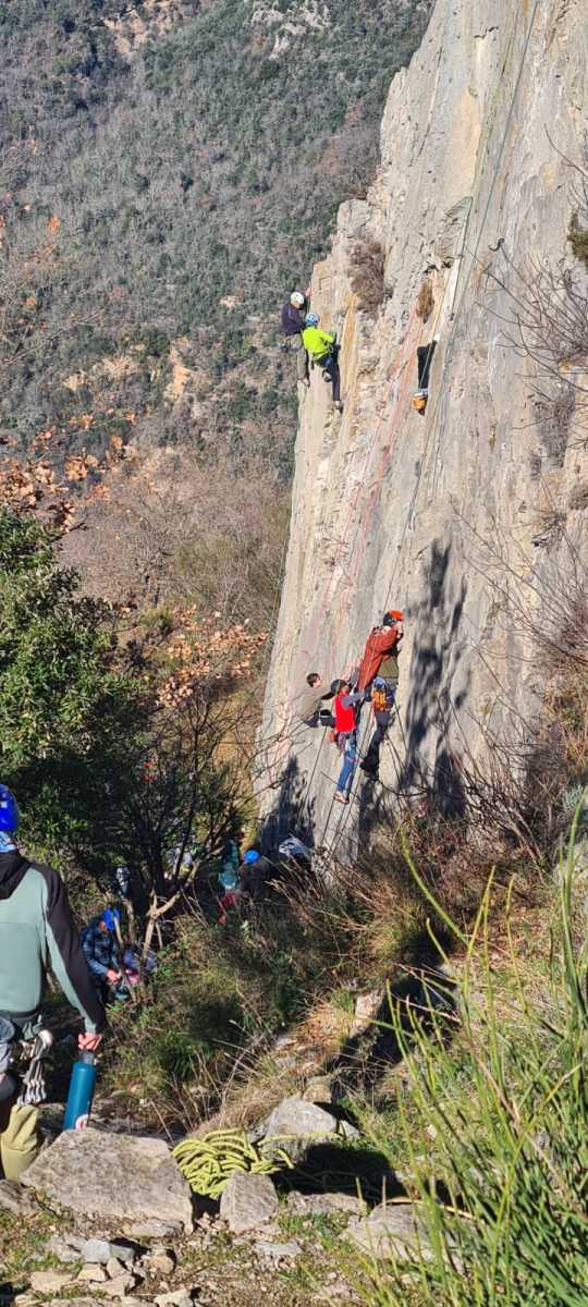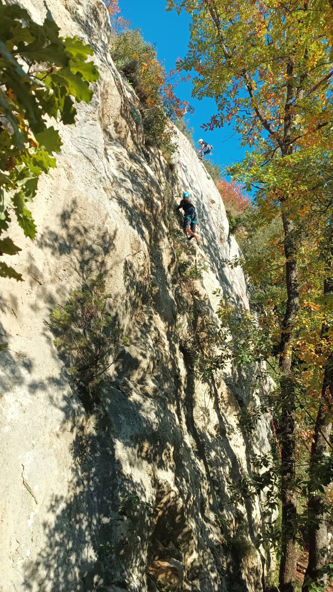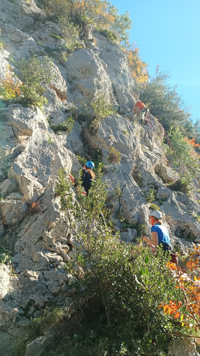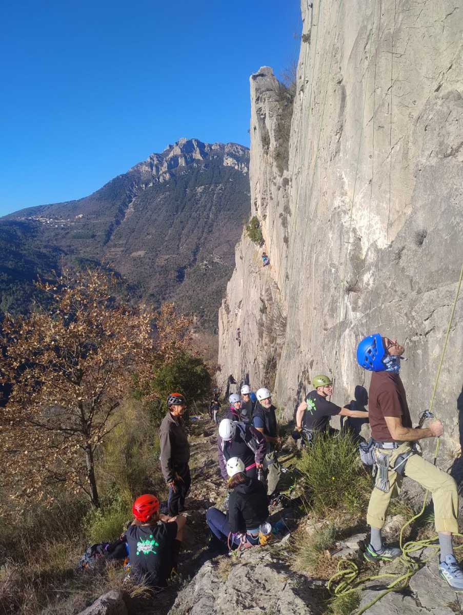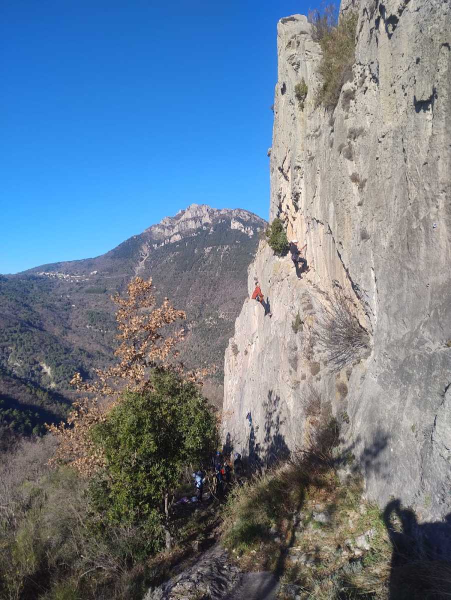 A droite, Sandrine, Djé et Alexis sont devant, avec pour consigne de ne pas abandonner Jean-Luc et Saliha pour qui la voie choisie, même si c’est la plus facile du secteur, risque d’être difficile. C’est « Donjons et dragons », 5 longueurs entre 5b et 5c+ avant la fameuse terrasse.