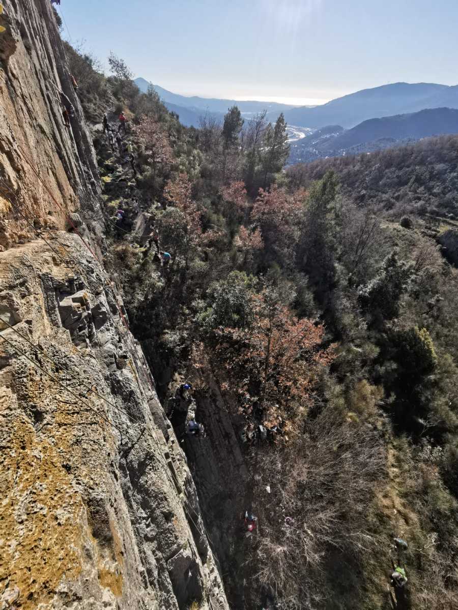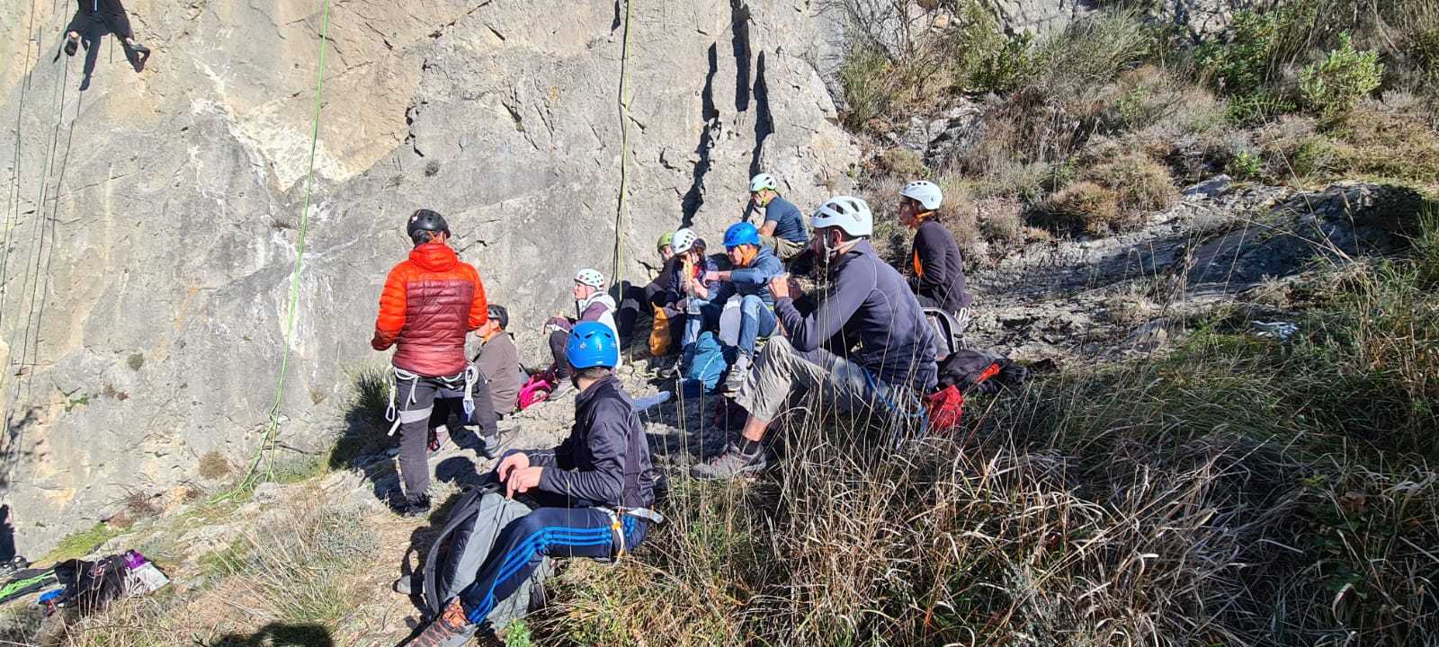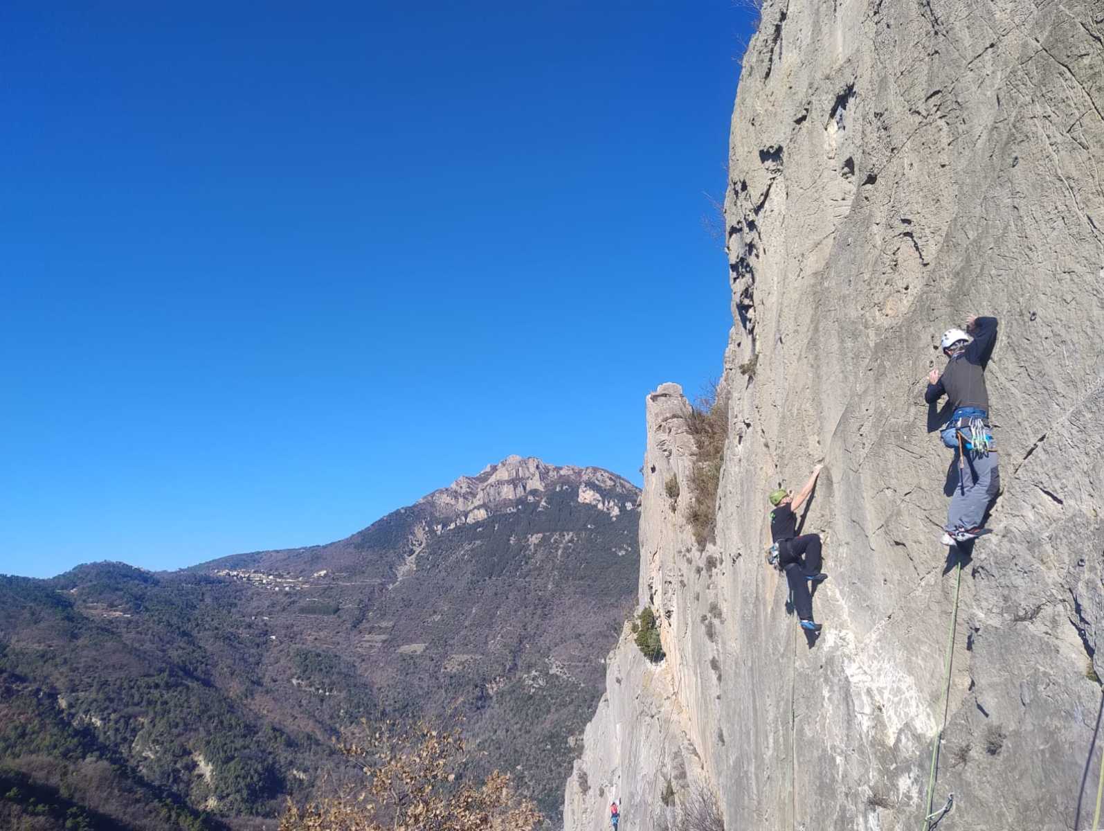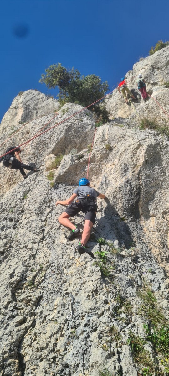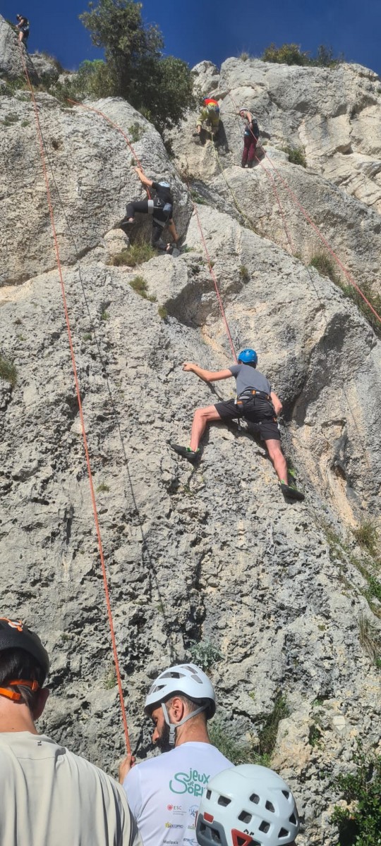 A droite, Sandrine, Djé et Alexis sont devant, avec pour consigne de ne pas abandonner Jean-Luc et Saliha pour qui la voie choisie, même si c’est la plus facile du secteur, risque d’être difficile. C’est « Donjons et dragons », 5 longueurs entre 5b et 5c+ avant la fameuse terrasse.