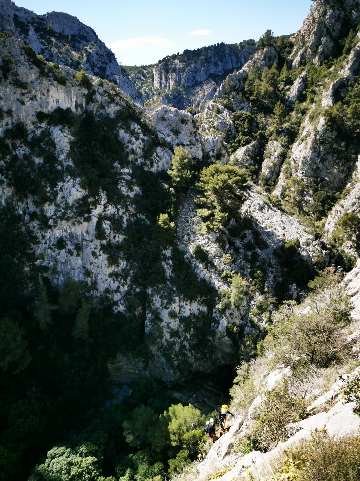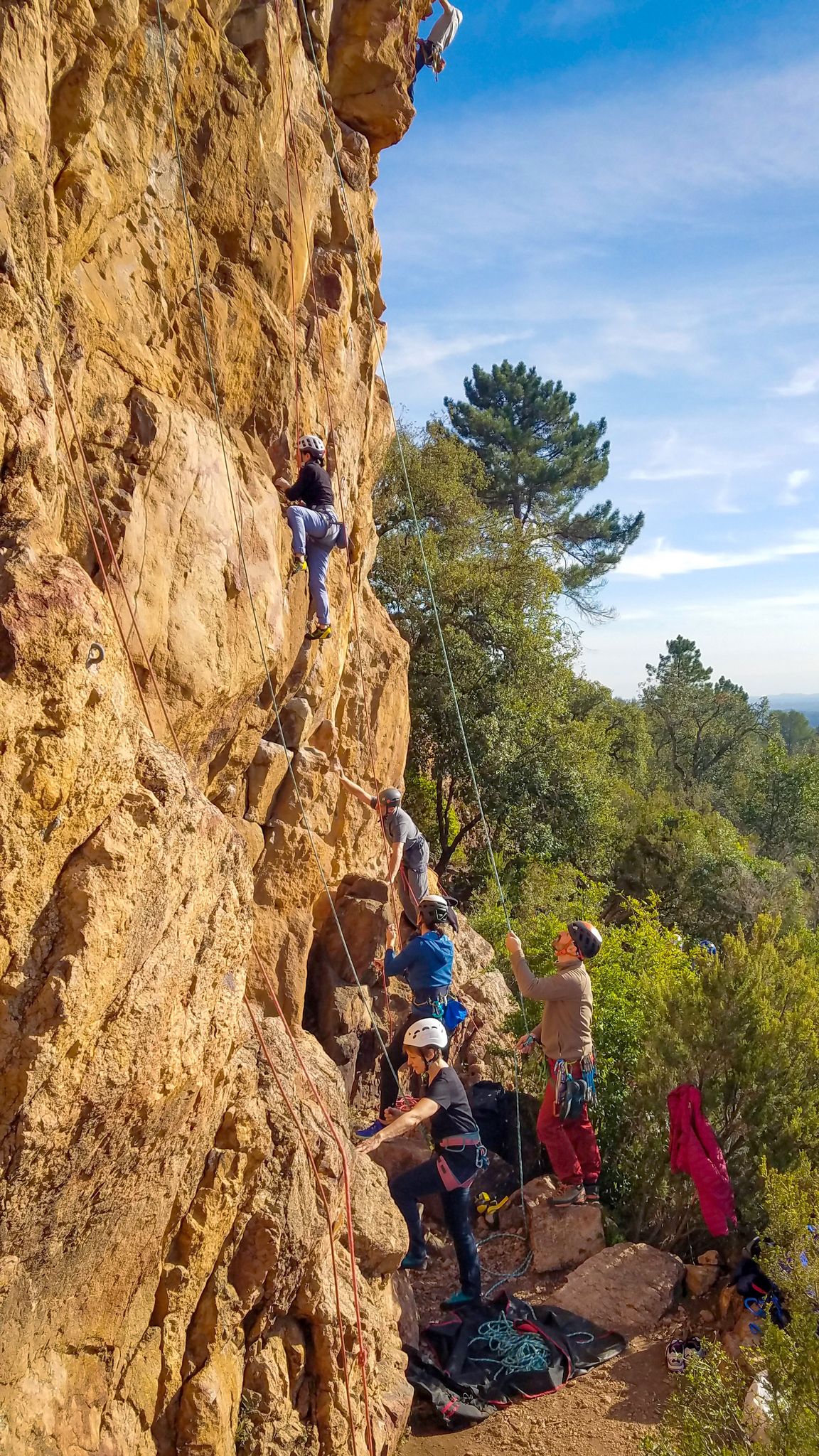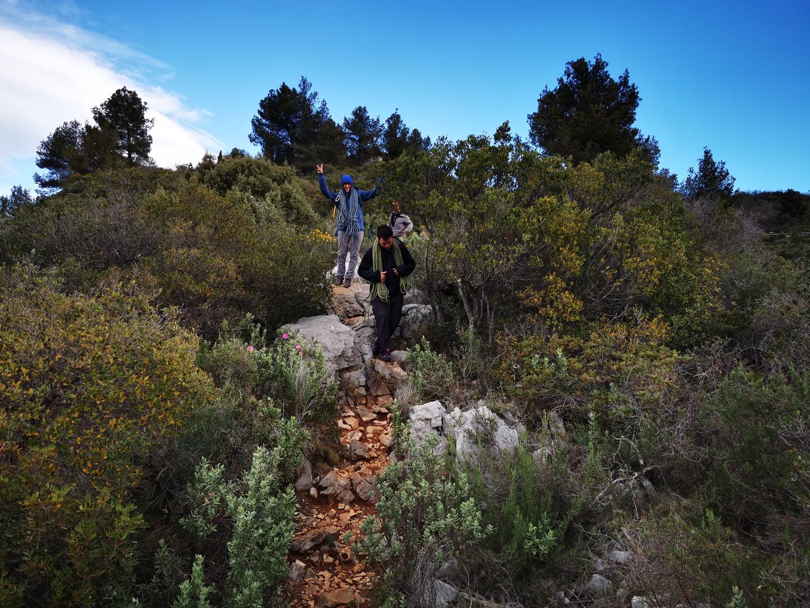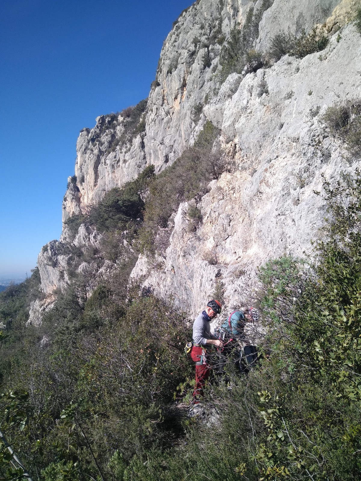 C’est donc à 9 que nous nous retrouvons sur le parking du secteur, juste après le magnifique village d’Evenos. Il semble que nous soyons seuls mais le temps de se garer et c’est déjà plusieurs autres voitures qui débarquent. On se prépare par cordées, pour une organisation à peu près rodée maintenant et on attaque la marche d’approche.
