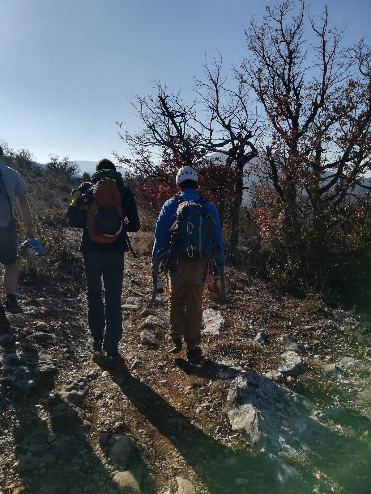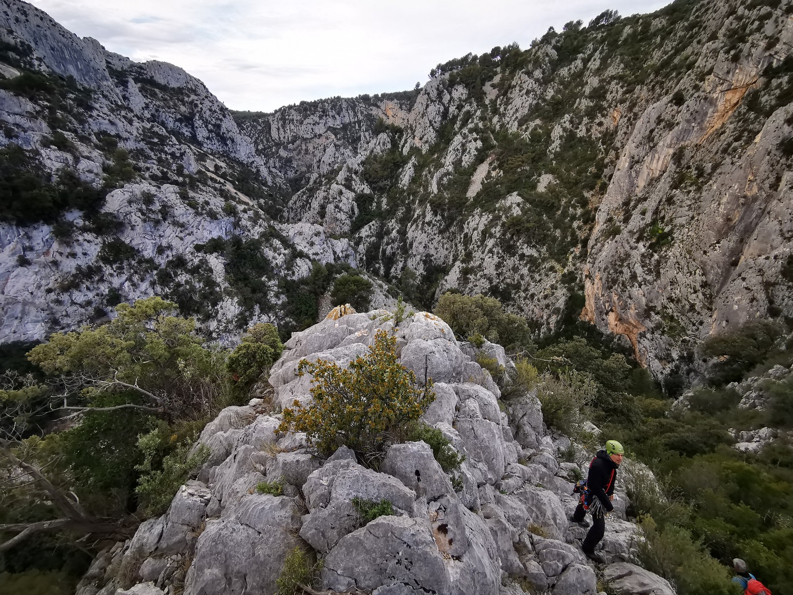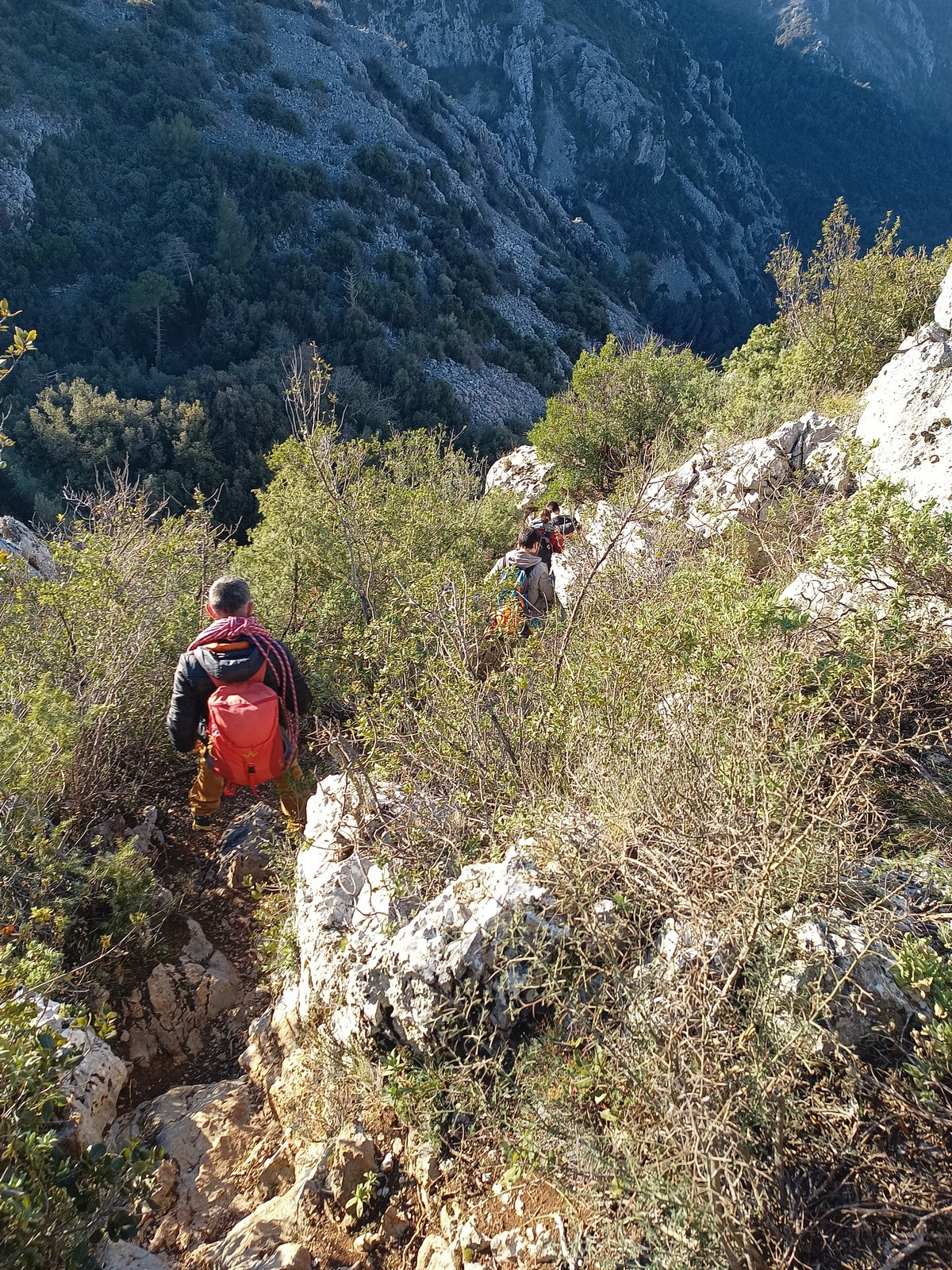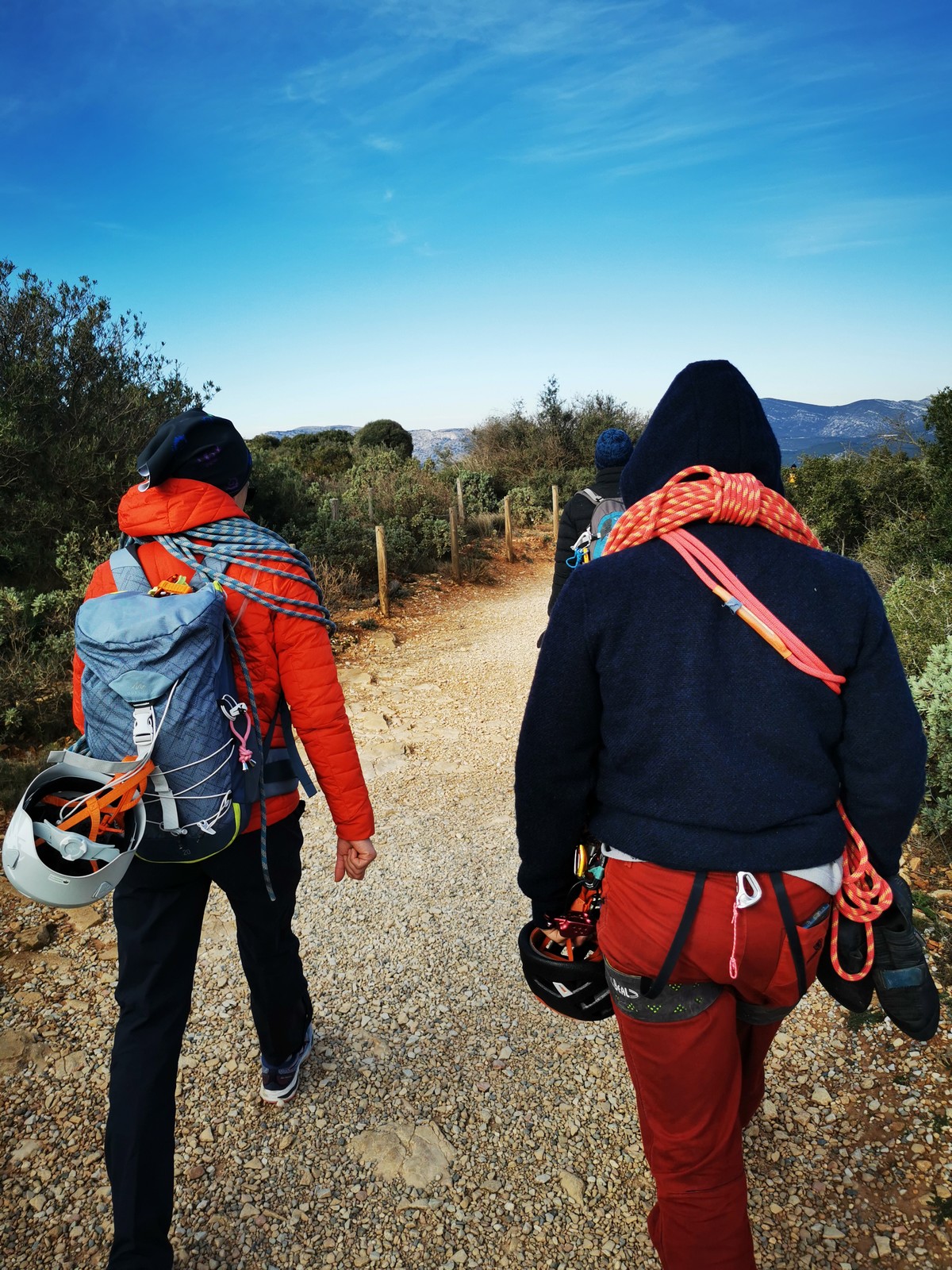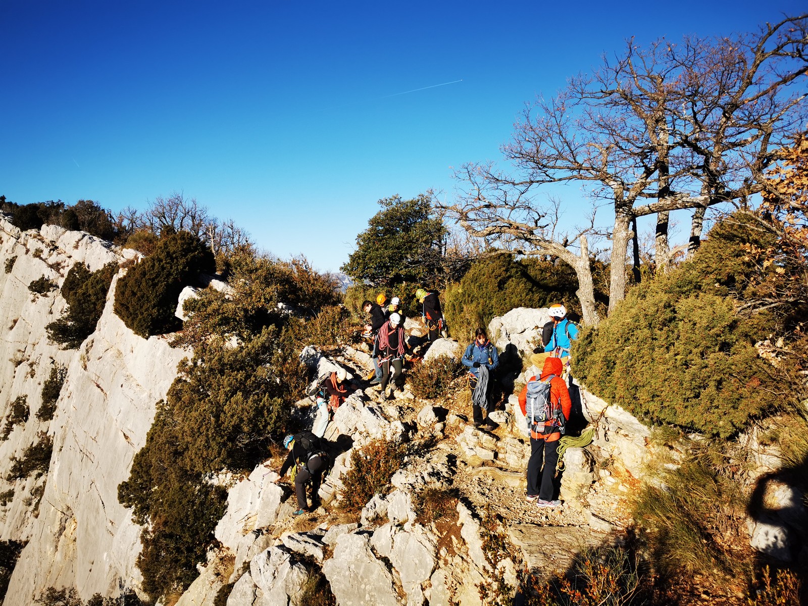 C’est donc à 9 que nous nous retrouvons sur le parking du secteur, juste après le magnifique village d’Evenos. Il semble que nous soyons seuls mais le temps de se garer et c’est déjà plusieurs autres voitures qui débarquent. On se prépare par cordées, pour une organisation à peu près rodée maintenant et on attaque la marche d’approche.