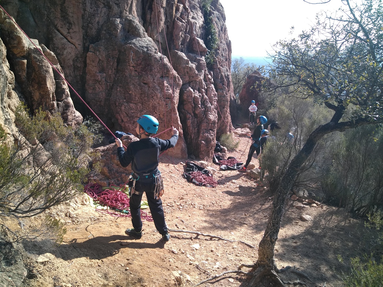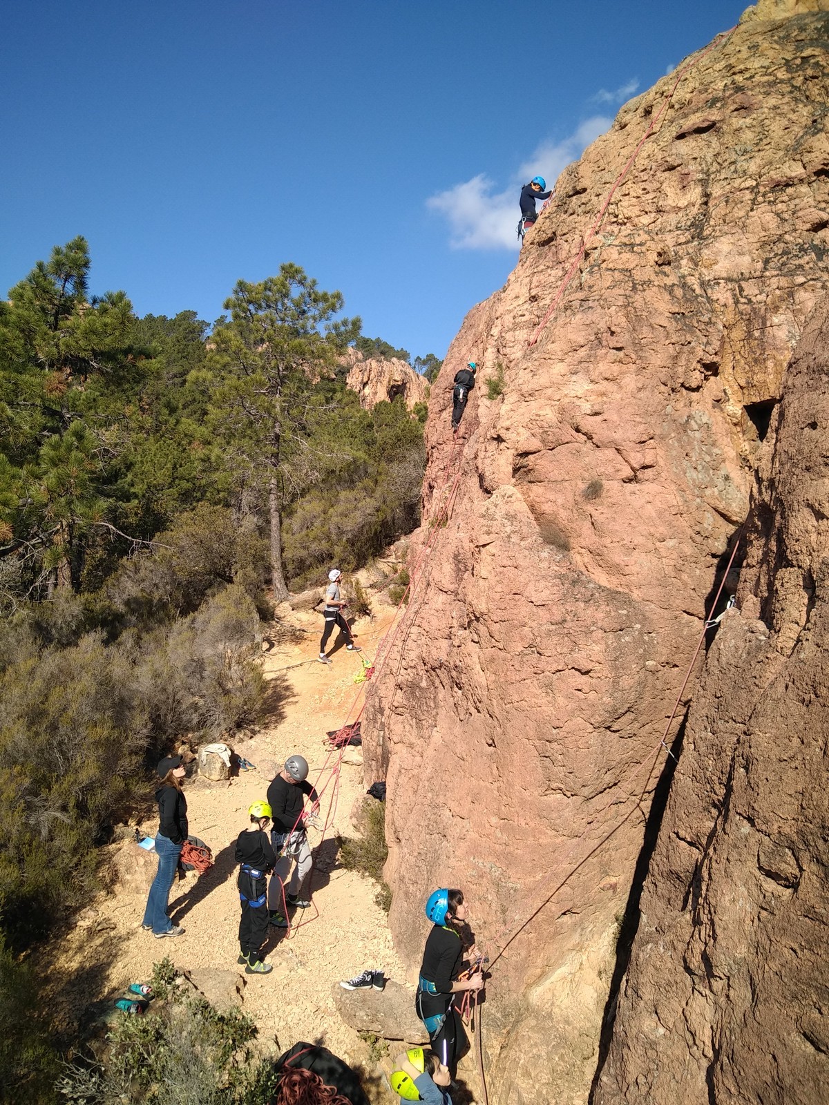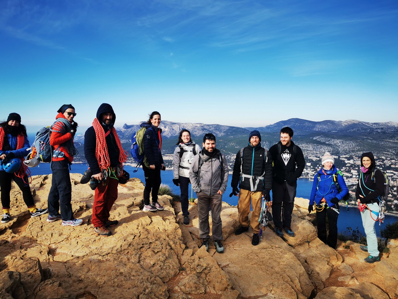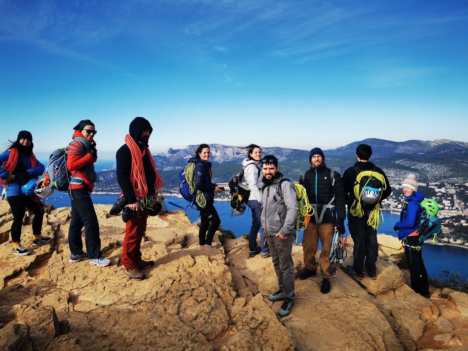 C’est donc à 9 que nous nous retrouvons sur le parking du secteur, juste après le magnifique village d’Evenos. Il semble que nous soyons seuls mais le temps de se garer et c’est déjà plusieurs autres voitures qui débarquent. On se prépare par cordées, pour une organisation à peu près rodée maintenant et on attaque la marche d’approche.