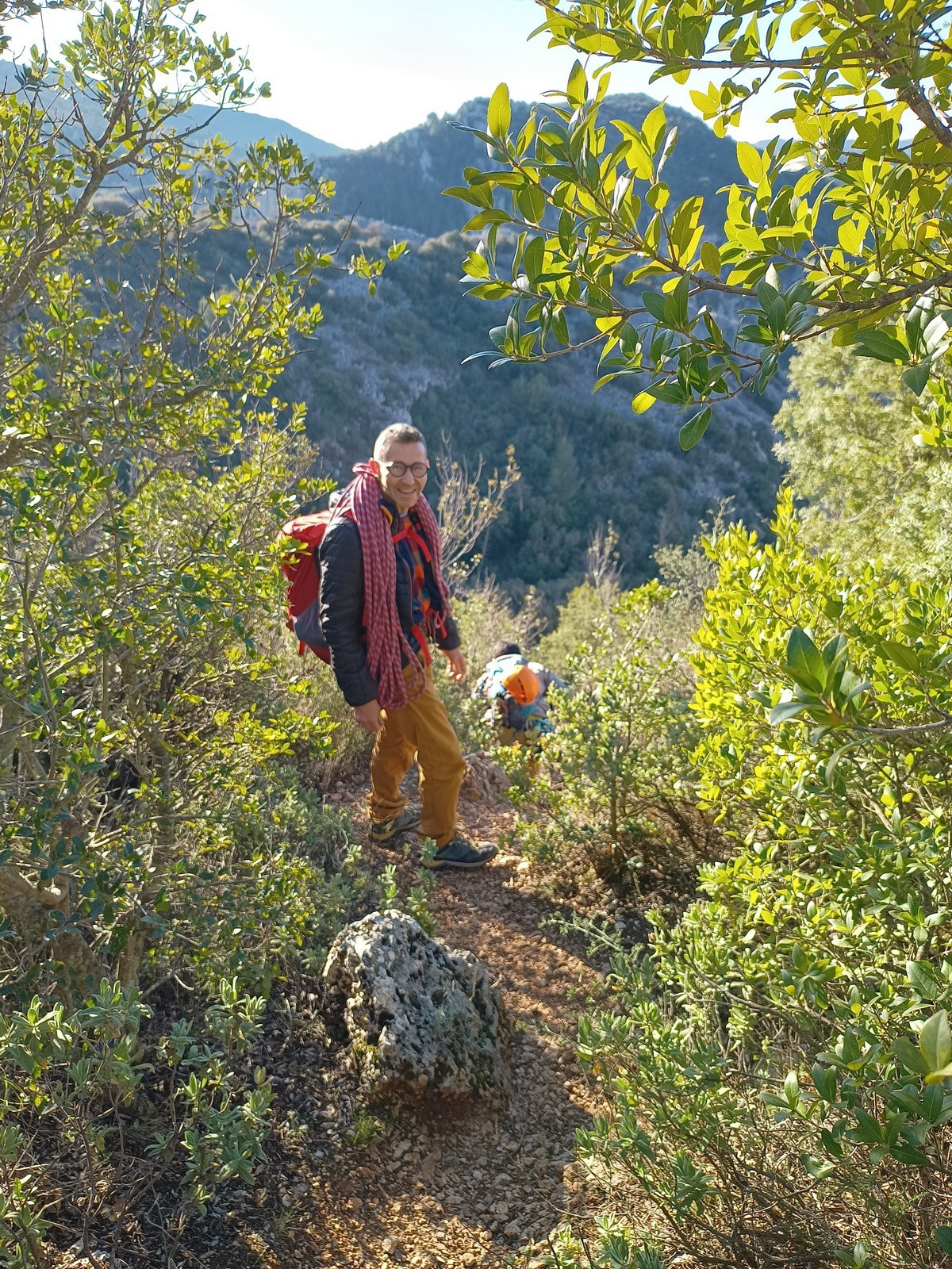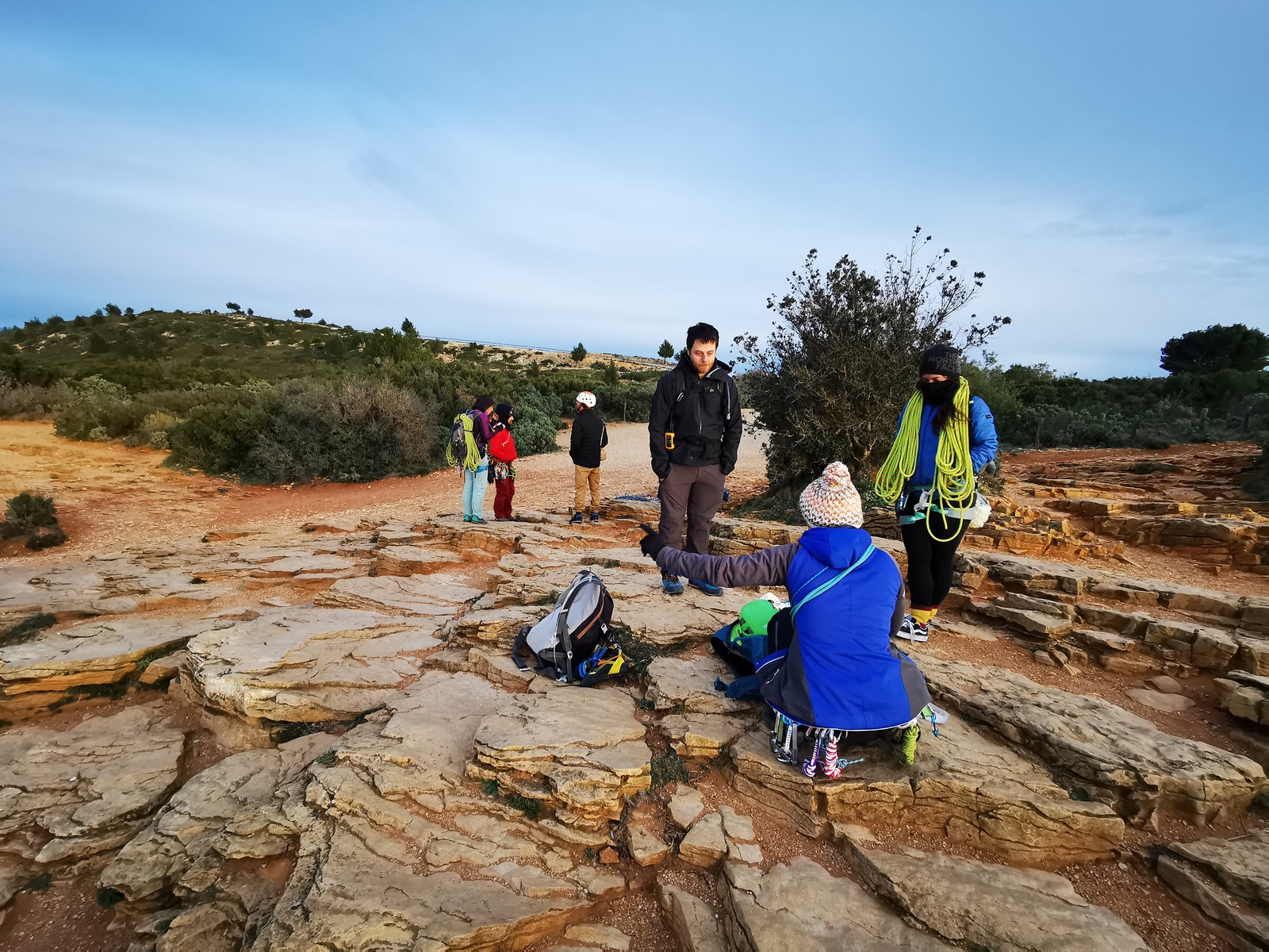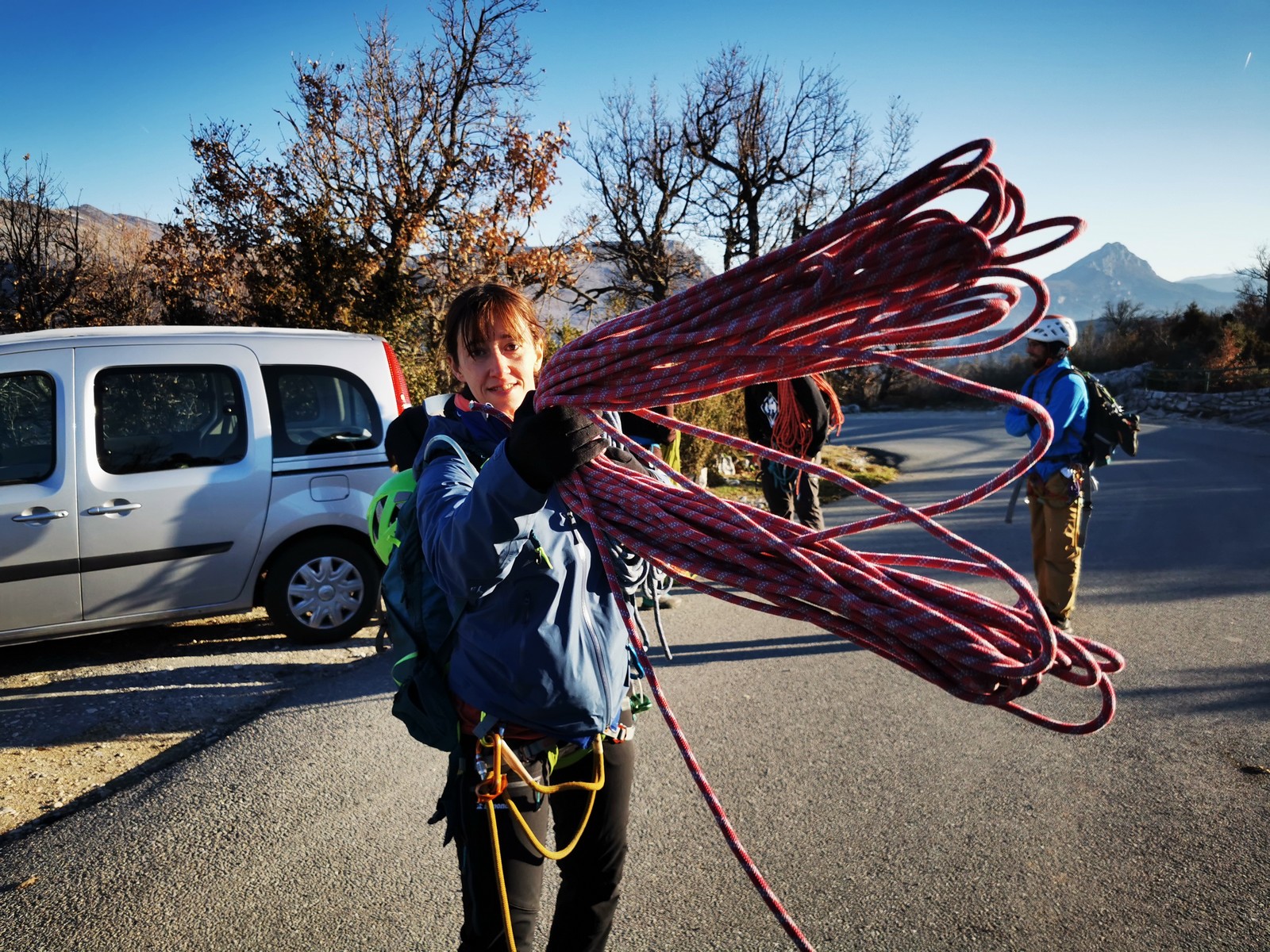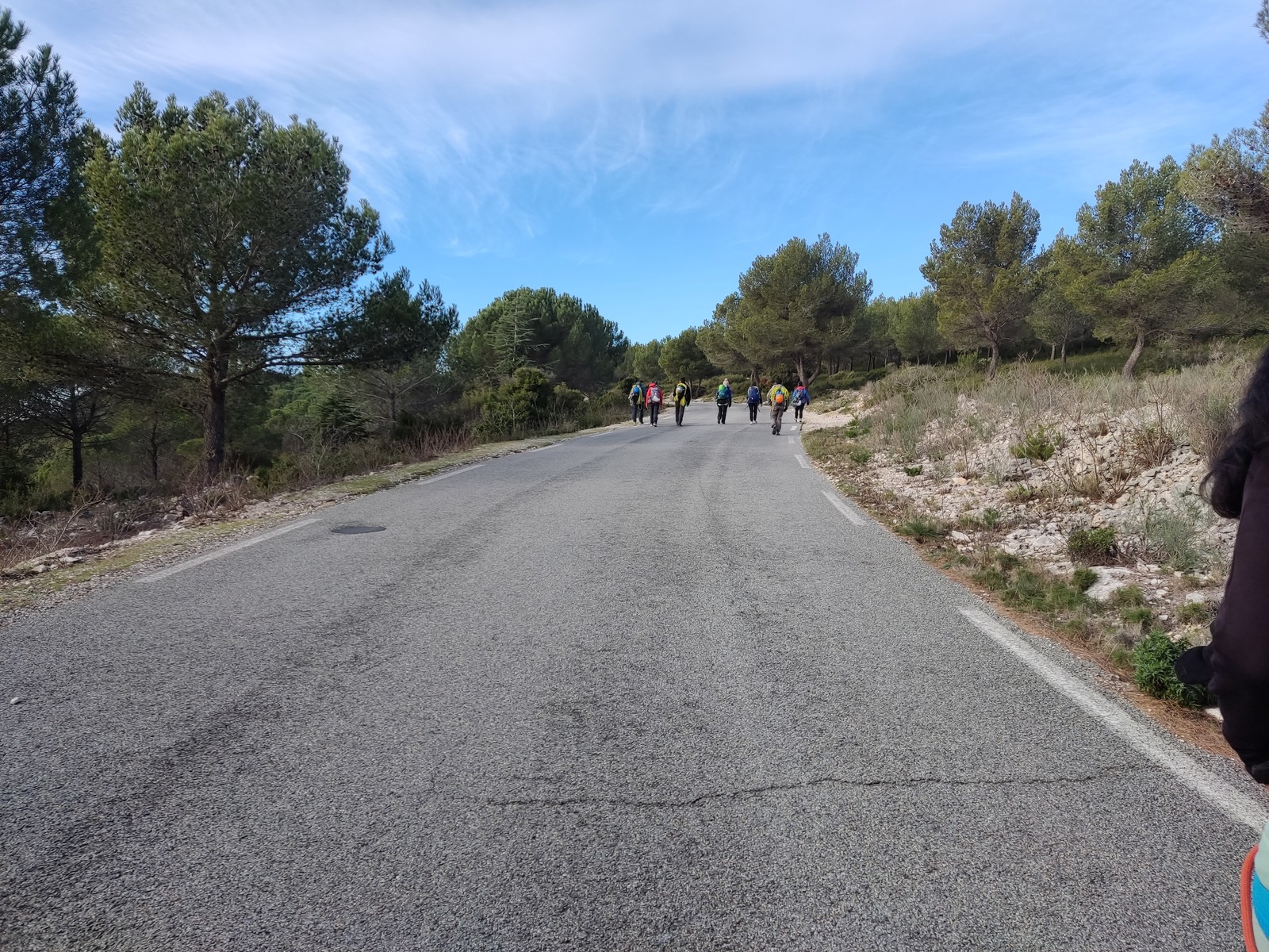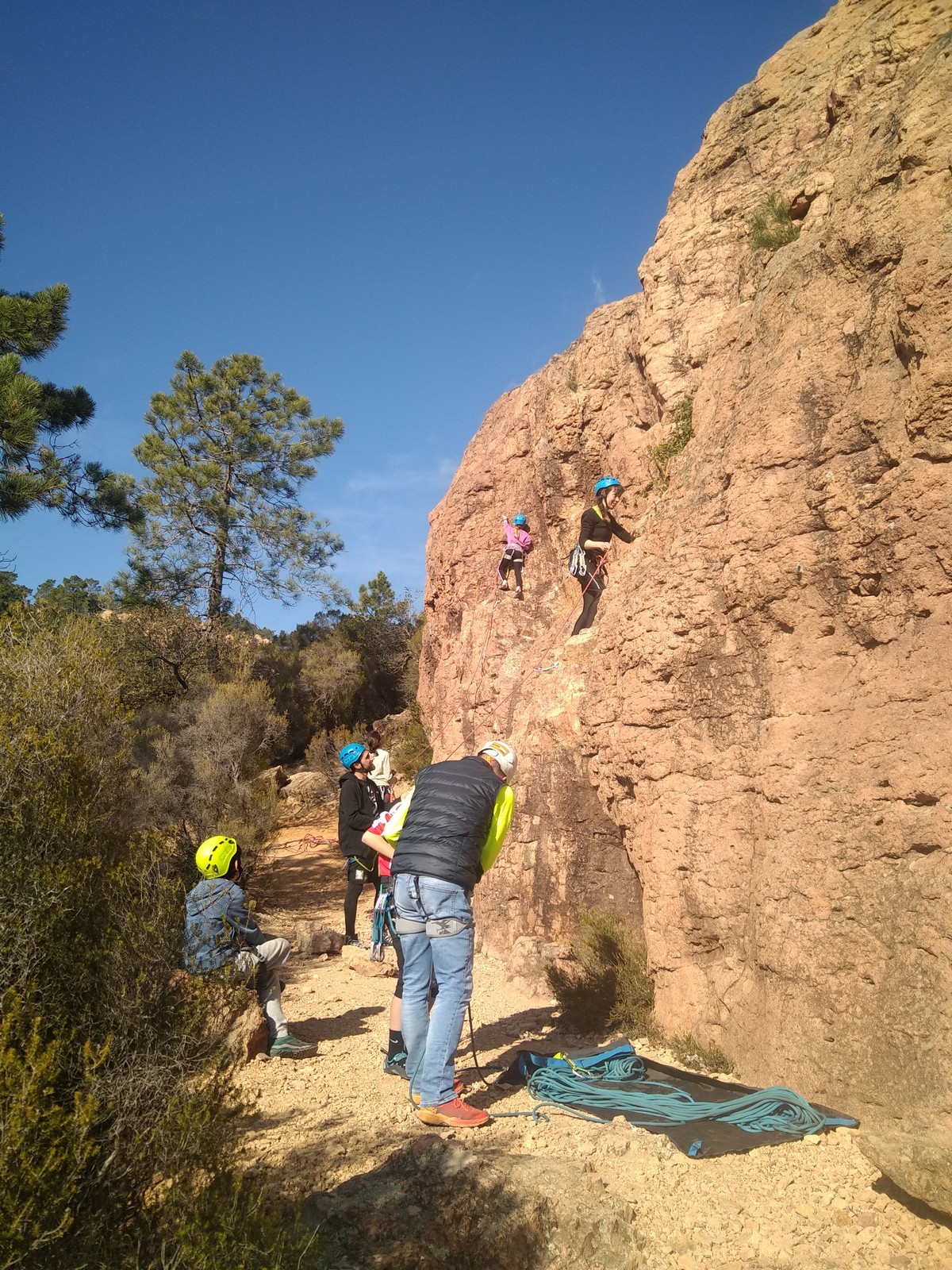 C’est donc à 9 que nous nous retrouvons sur le parking du secteur, juste après le magnifique village d’Evenos. Il semble que nous soyons seuls mais le temps de se garer et c’est déjà plusieurs autres voitures qui débarquent. On se prépare par cordées, pour une organisation à peu près rodée maintenant et on attaque la marche d’approche.
