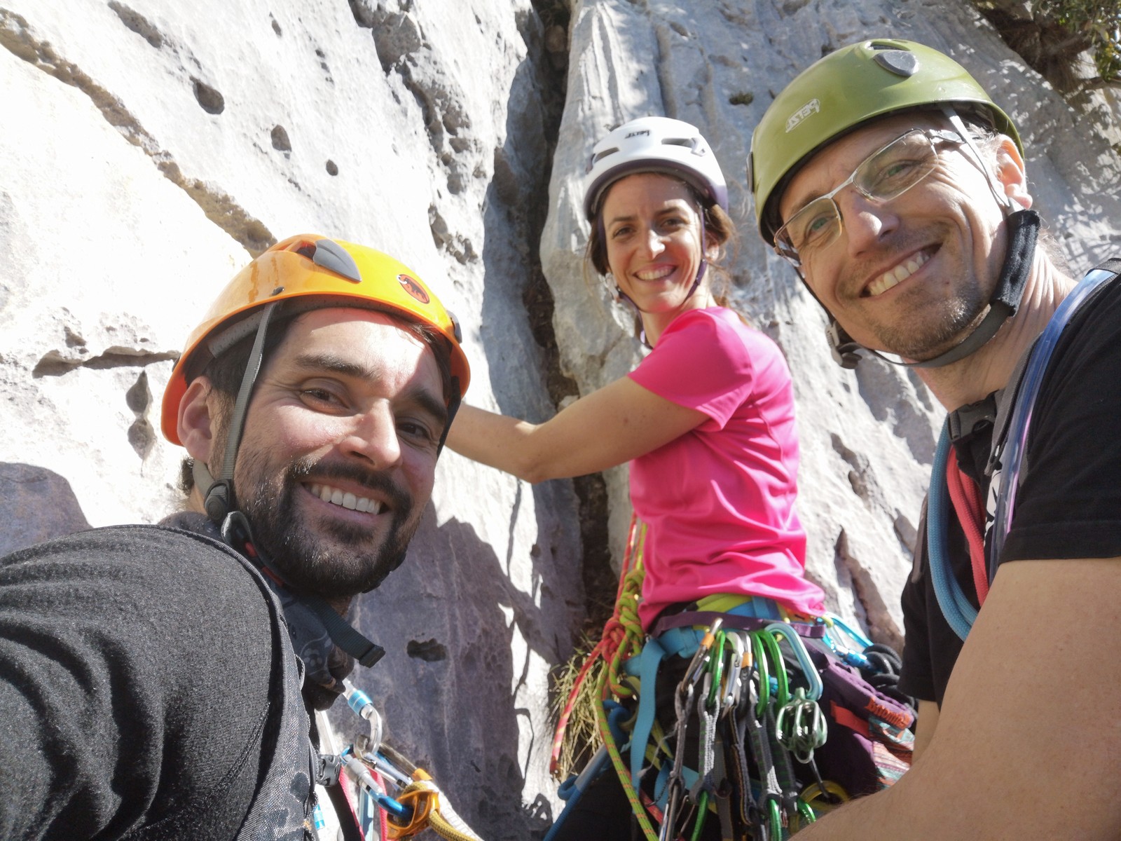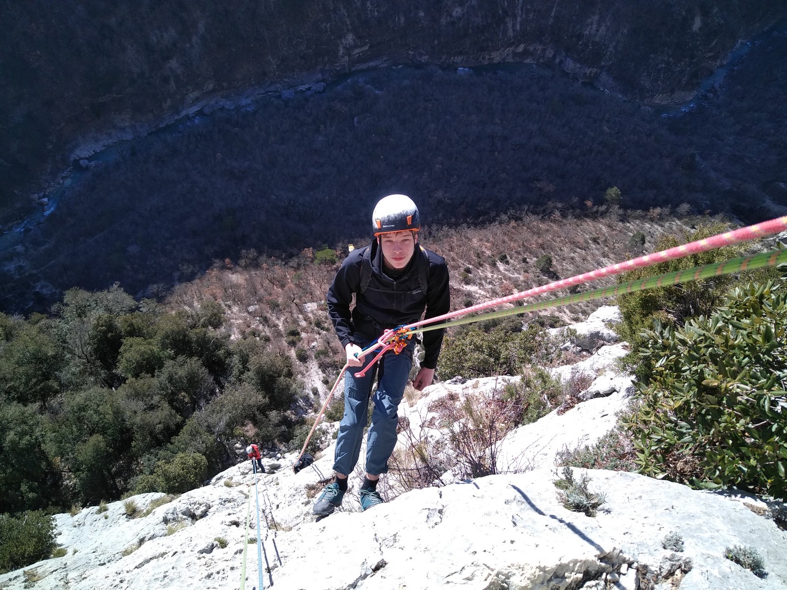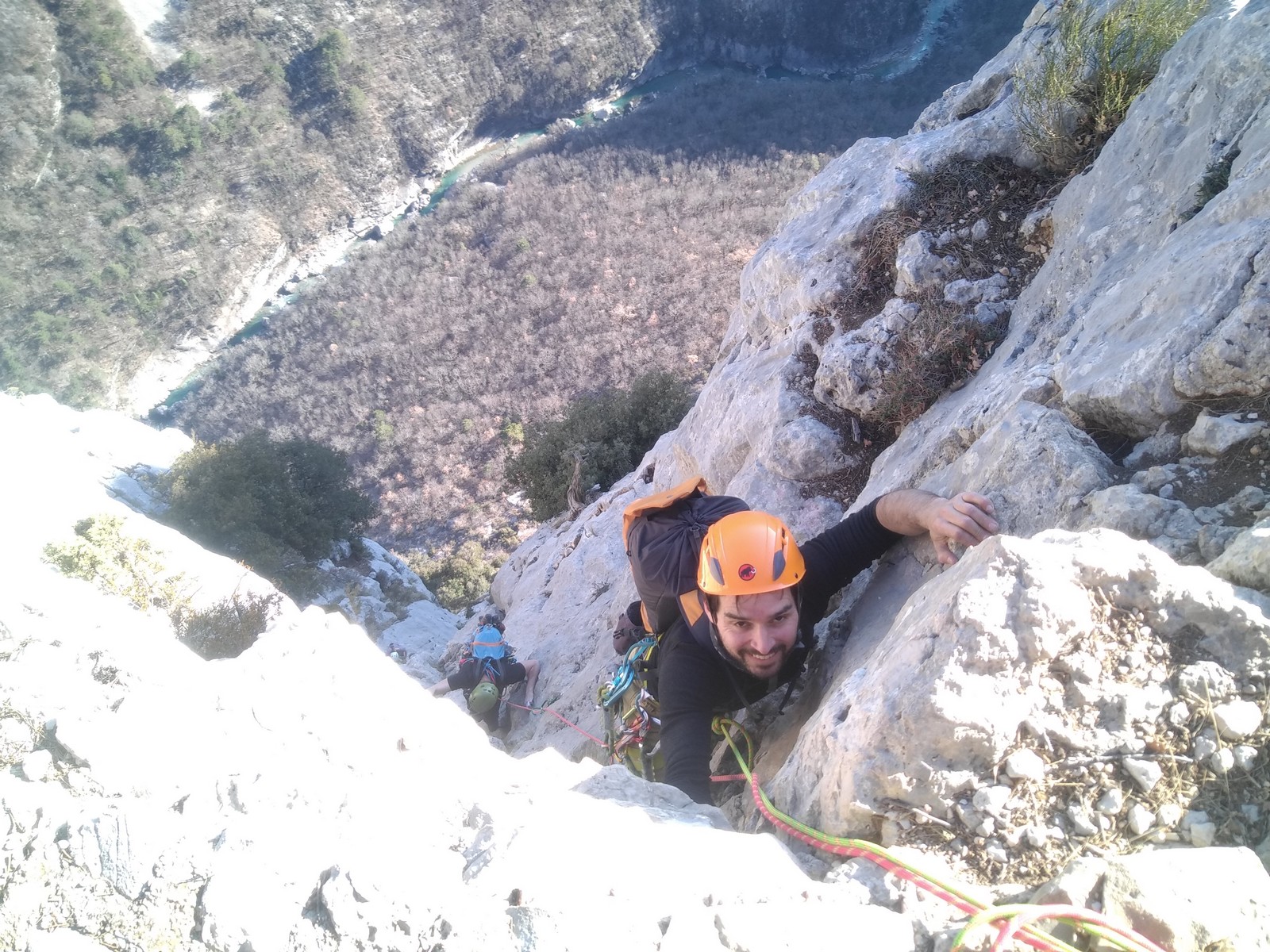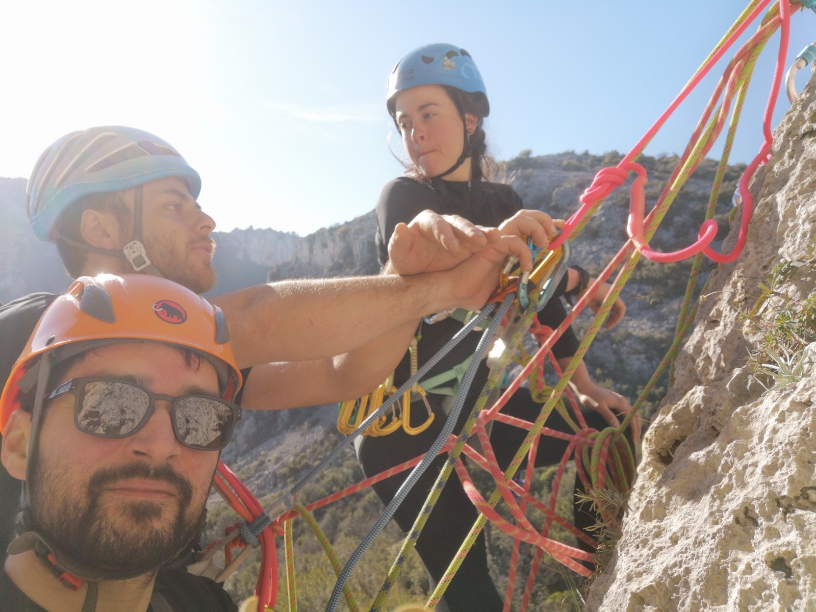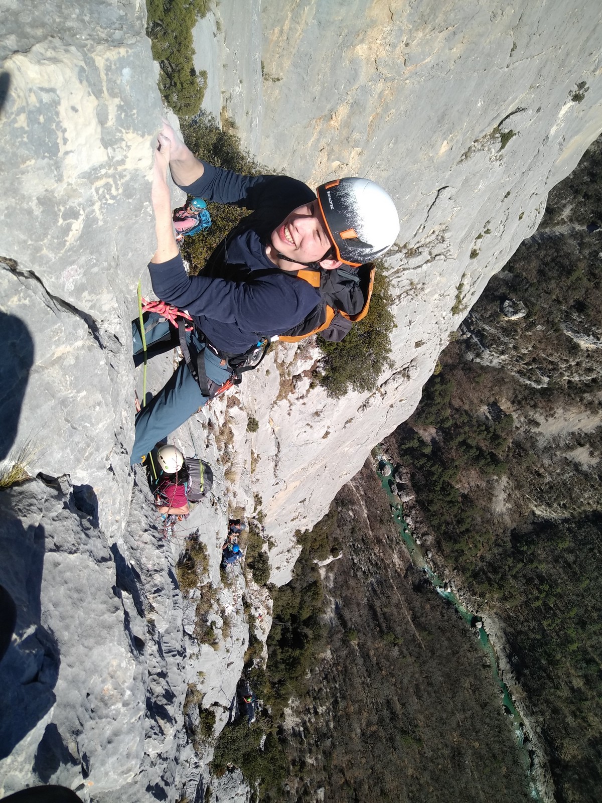 En grandes voies, les situations sont toujours nouvelles et il faut savoir d’adapter. La première partie de la journée se passe bien malgré des difficultés pour Xavier pour construire correctement son premier relais. Avec Théo, on arrive vite à la longueur clé en 6c, pendant que Brice, juste en dessous, donne tout pour sortir sa longueur en 6a.