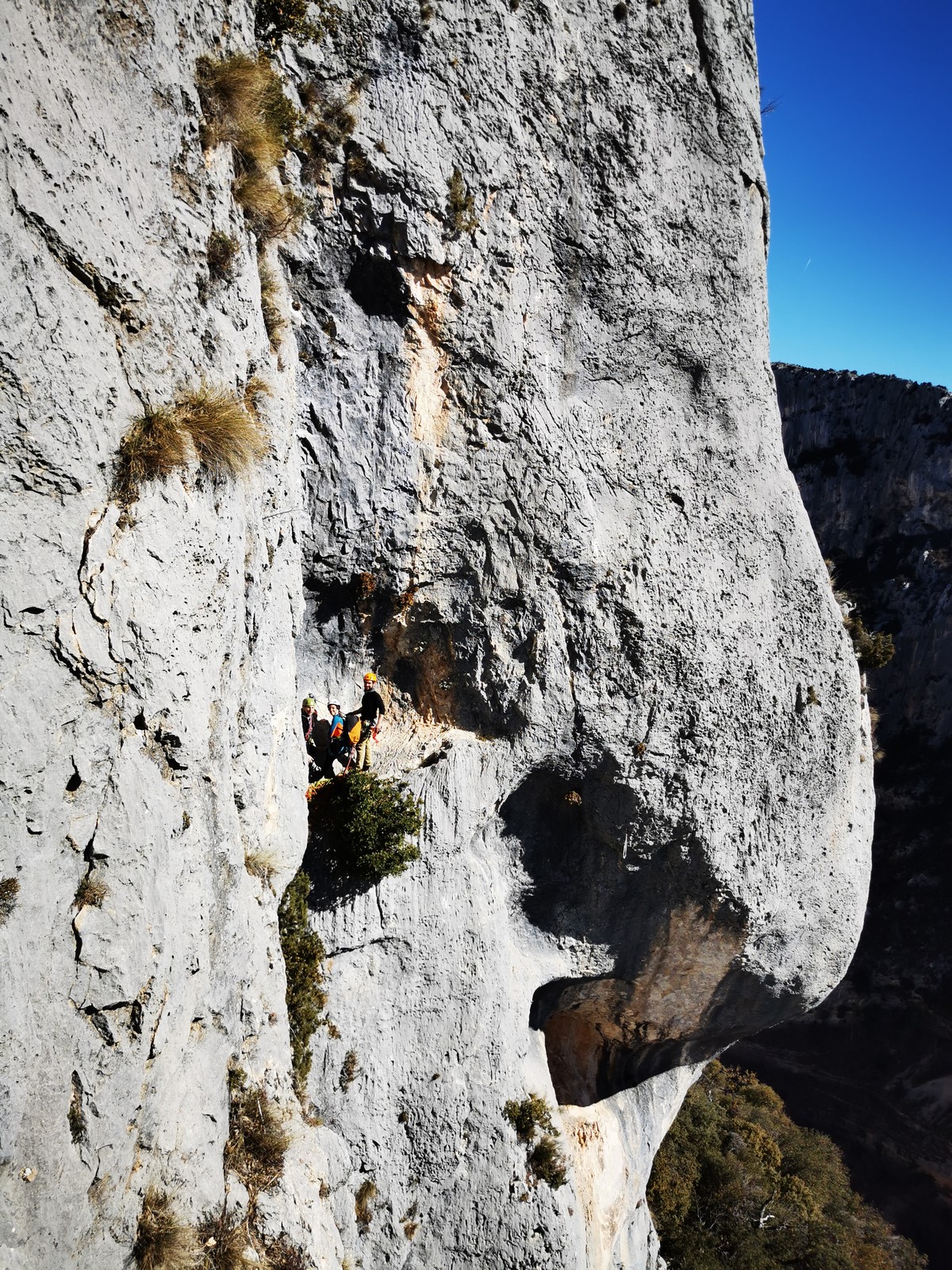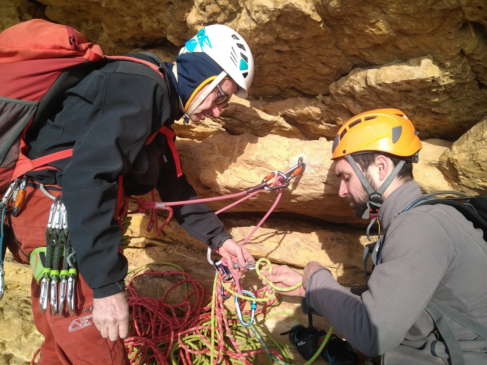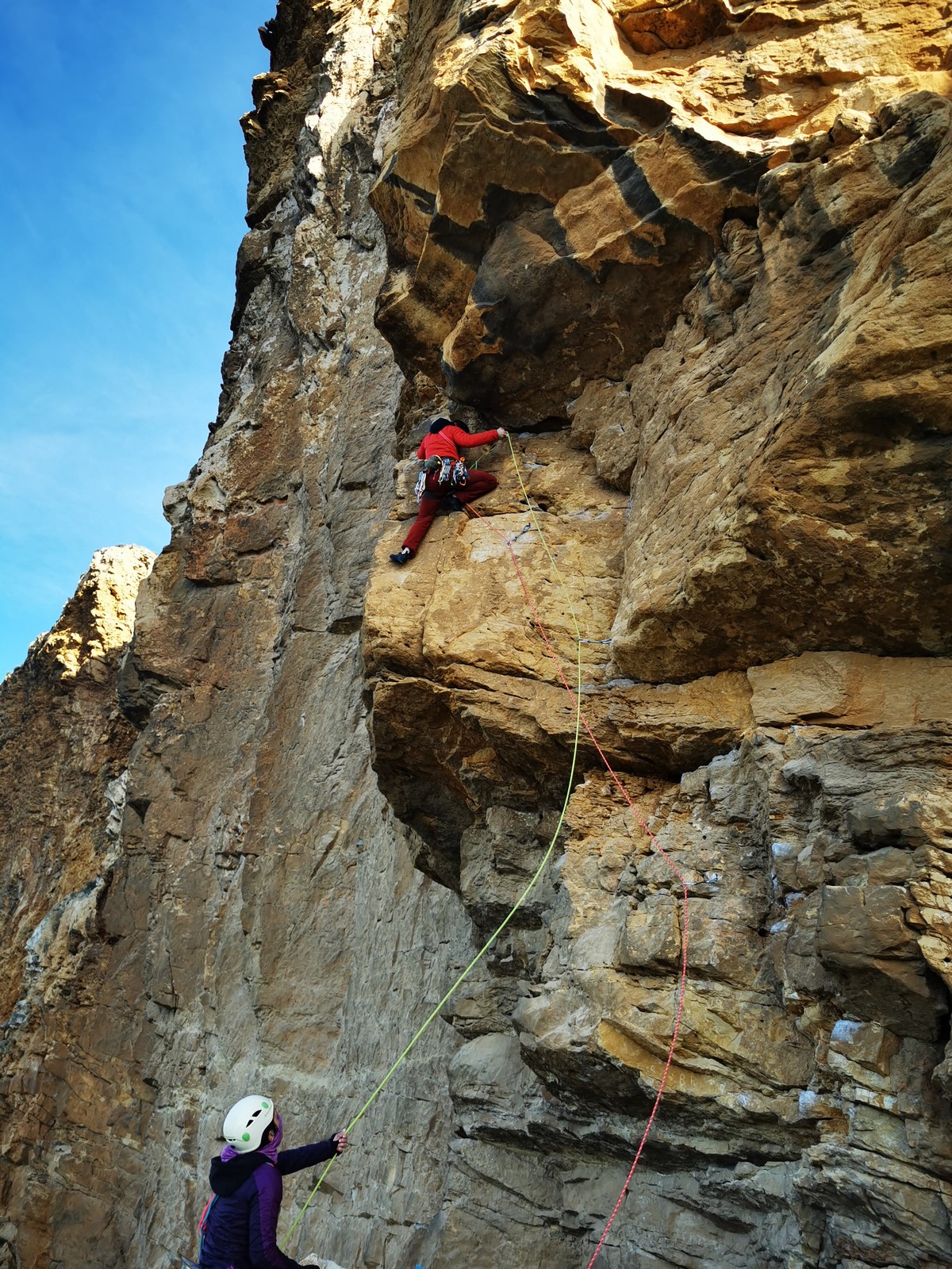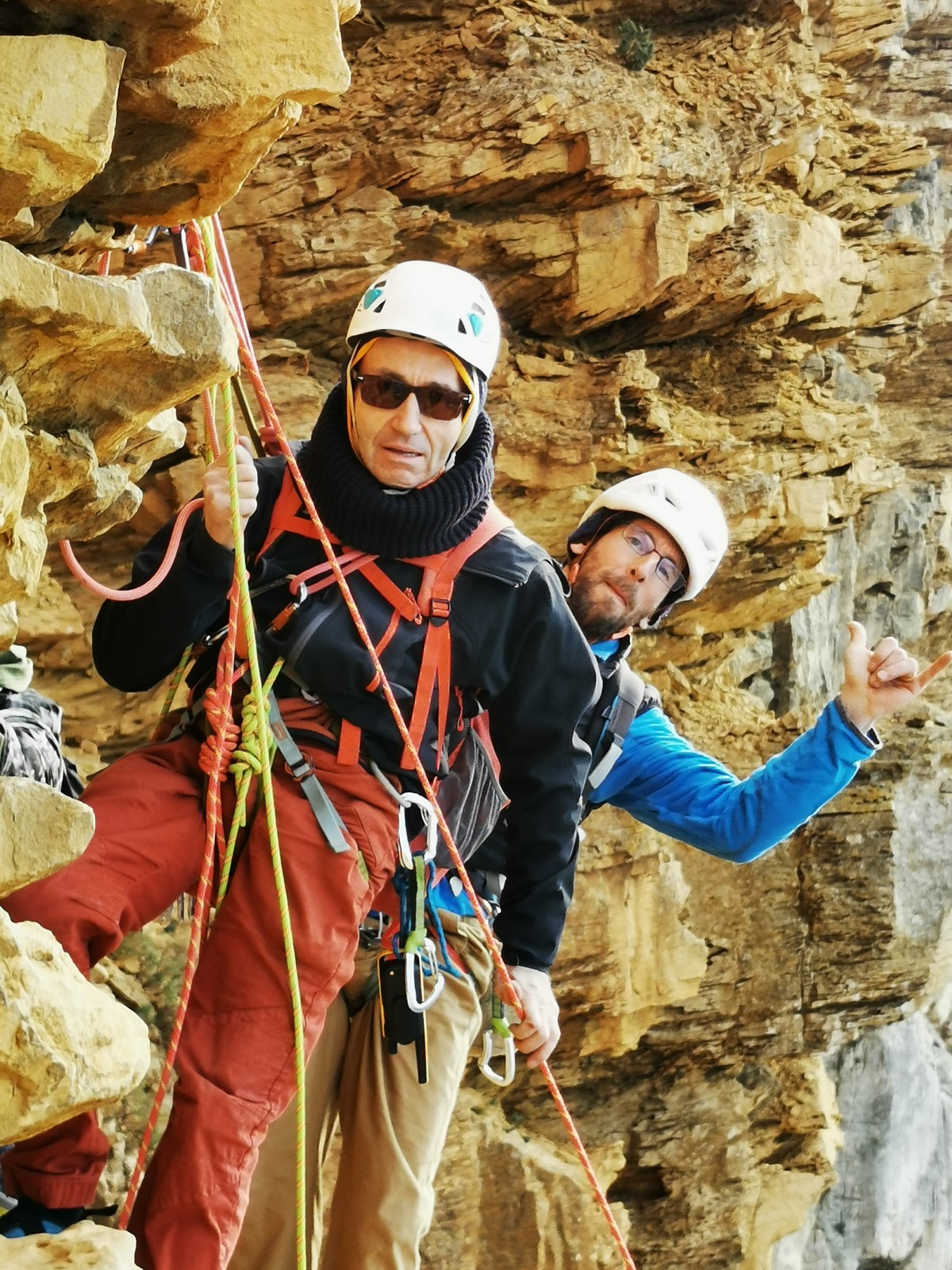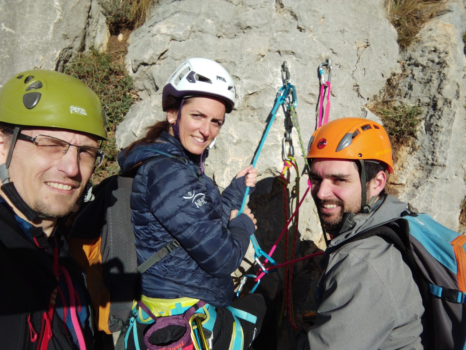 En grandes voies, les situations sont toujours nouvelles et il faut savoir d’adapter. La première partie de la journée se passe bien malgré des difficultés pour Xavier pour construire correctement son premier relais. Avec Théo, on arrive vite à la longueur clé en 6c, pendant que Brice, juste en dessous, donne tout pour sortir sa longueur en 6a.