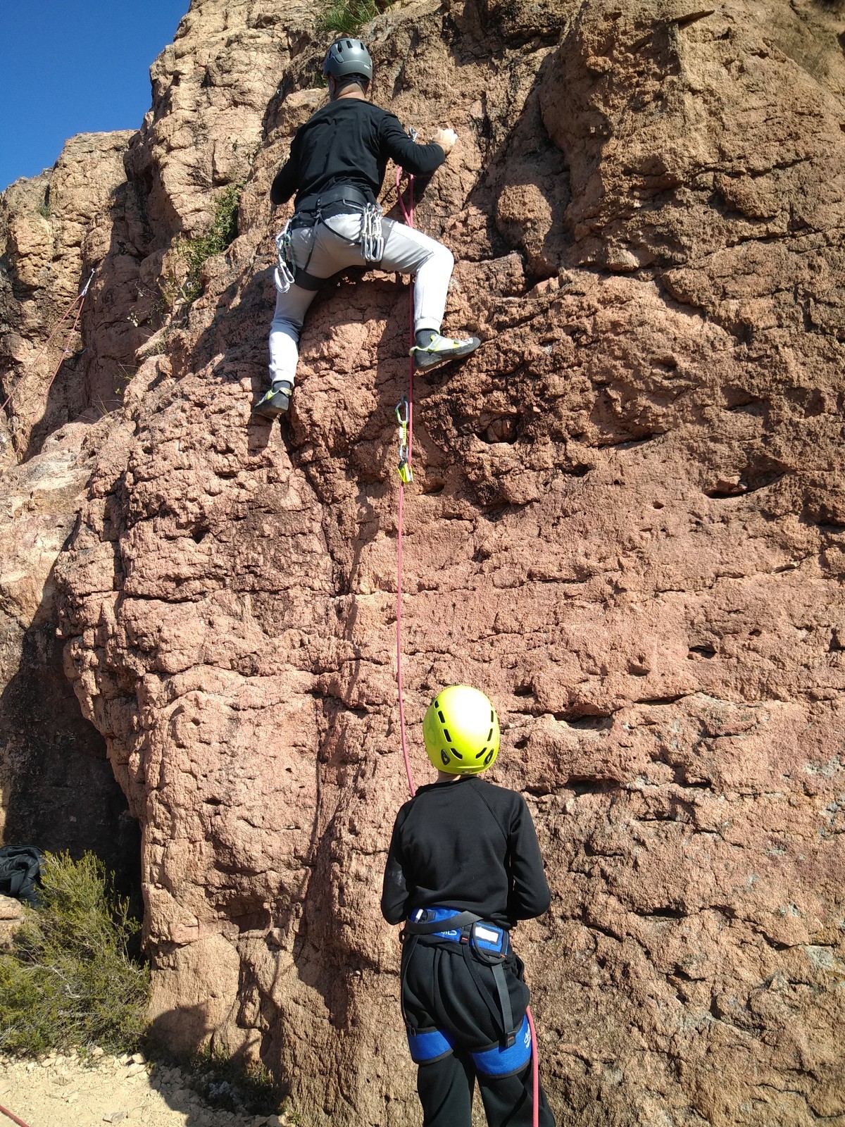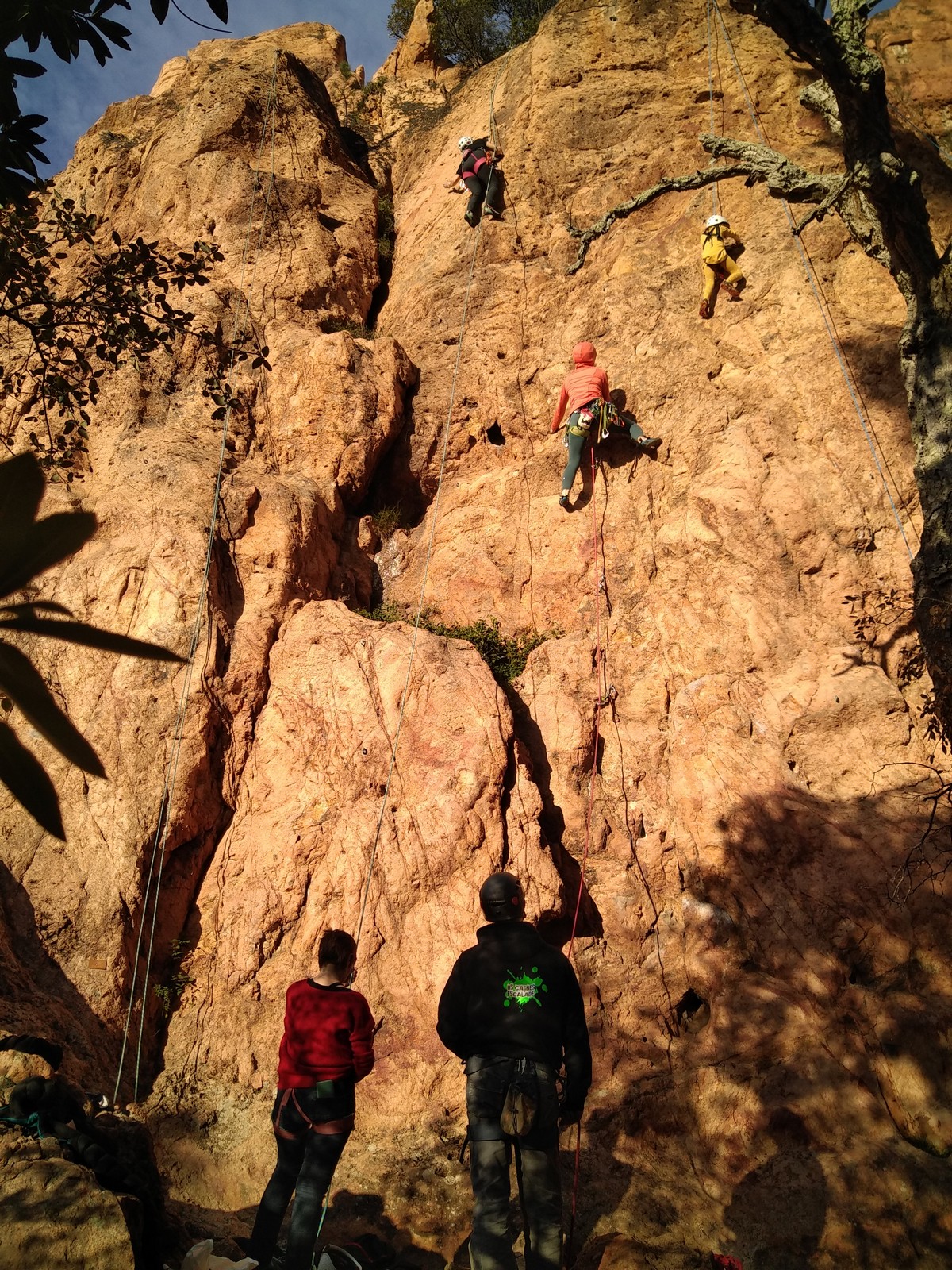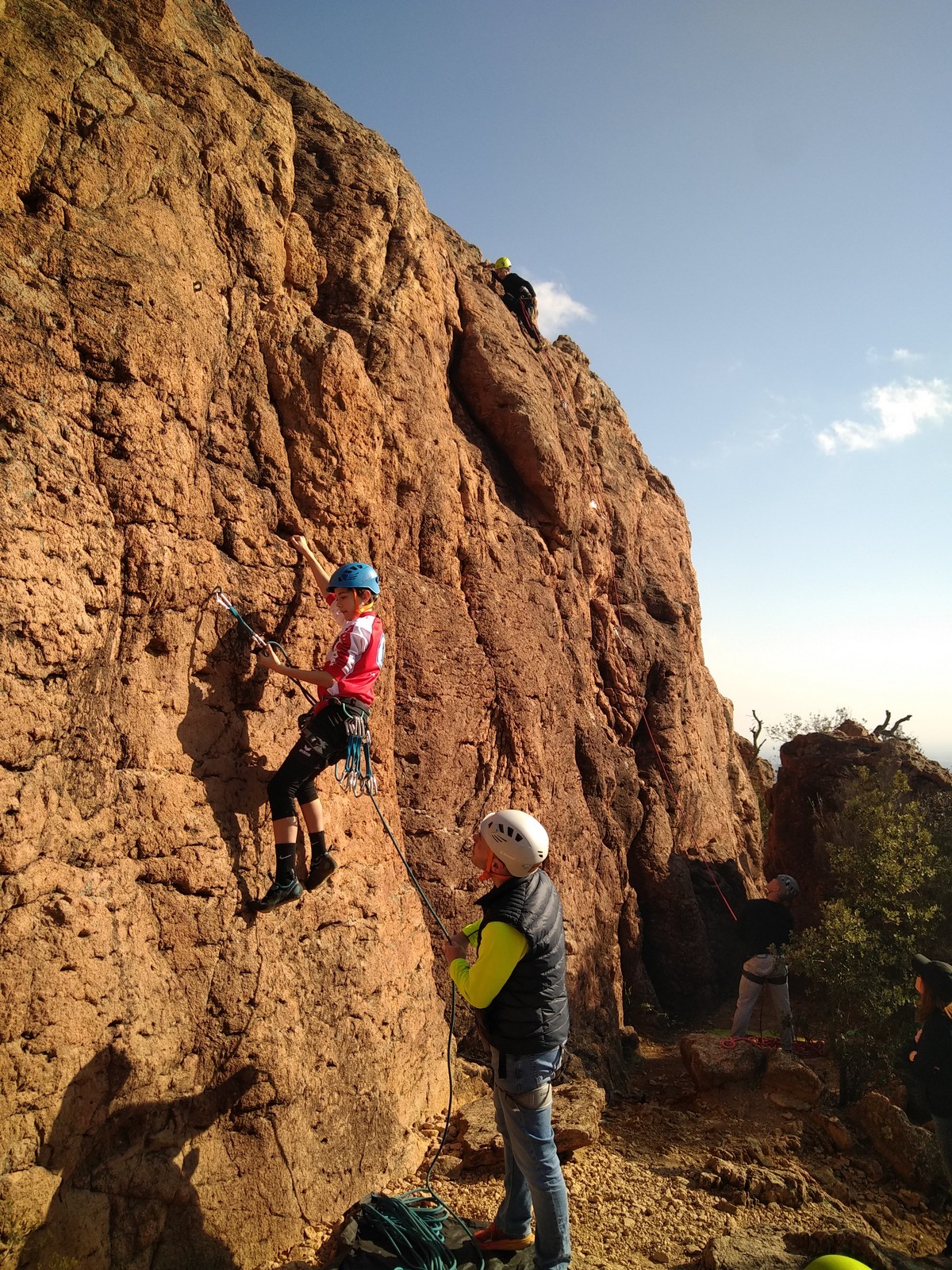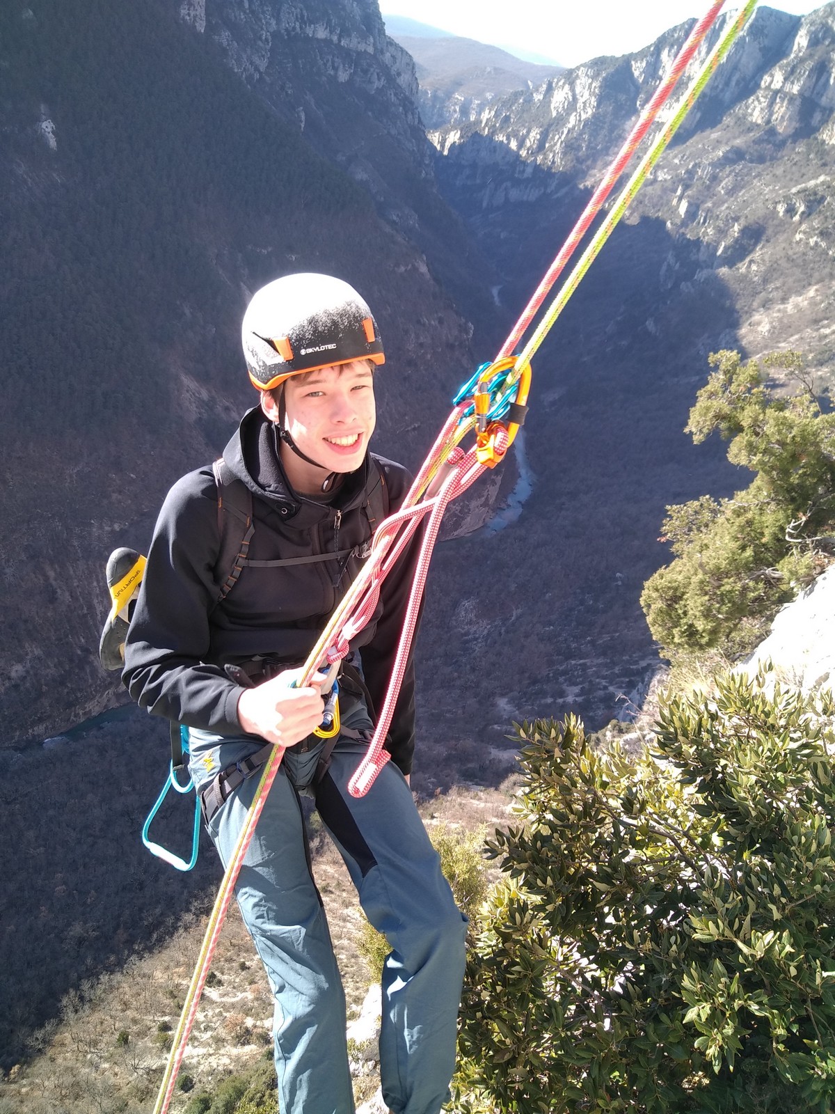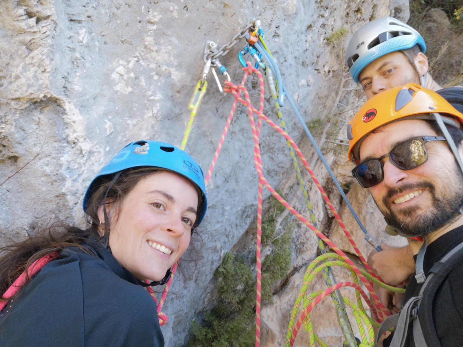 En grandes voies, les situations sont toujours nouvelles et il faut savoir d’adapter. La première partie de la journée se passe bien malgré des difficultés pour Xavier pour construire correctement son premier relais. Avec Théo, on arrive vite à la longueur clé en 6c, pendant que Brice, juste en dessous, donne tout pour sortir sa longueur en 6a.