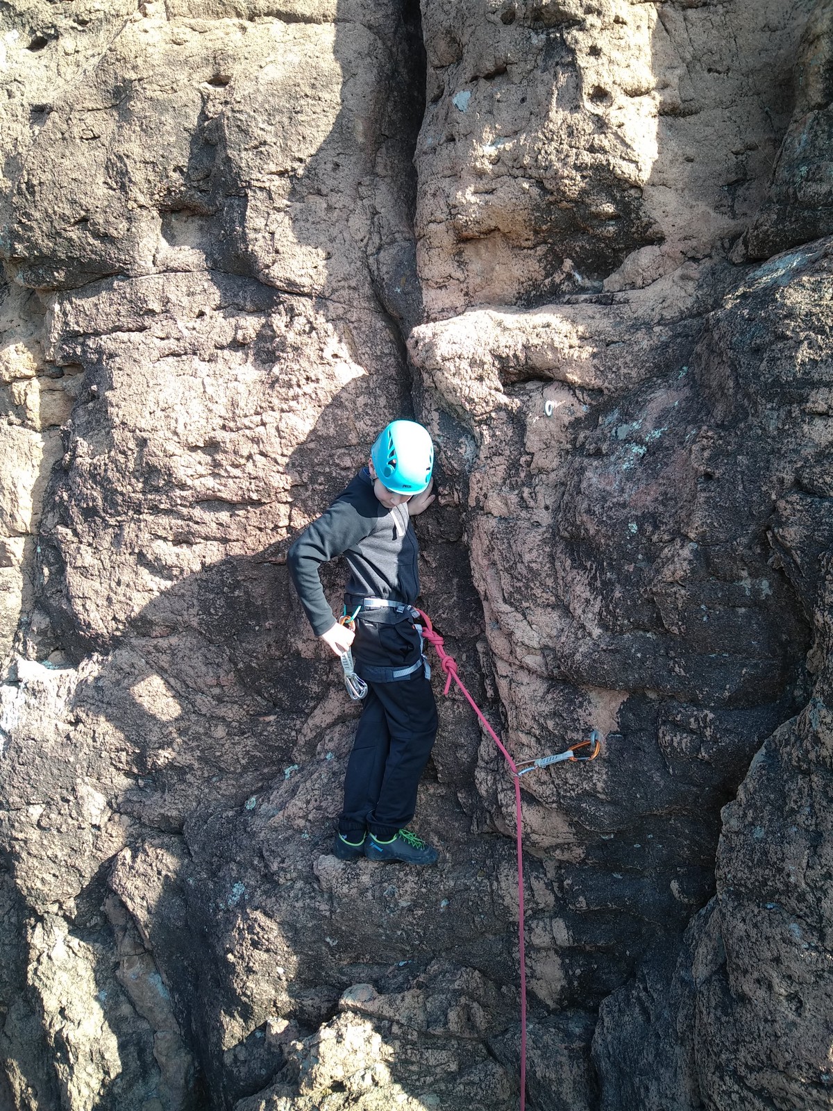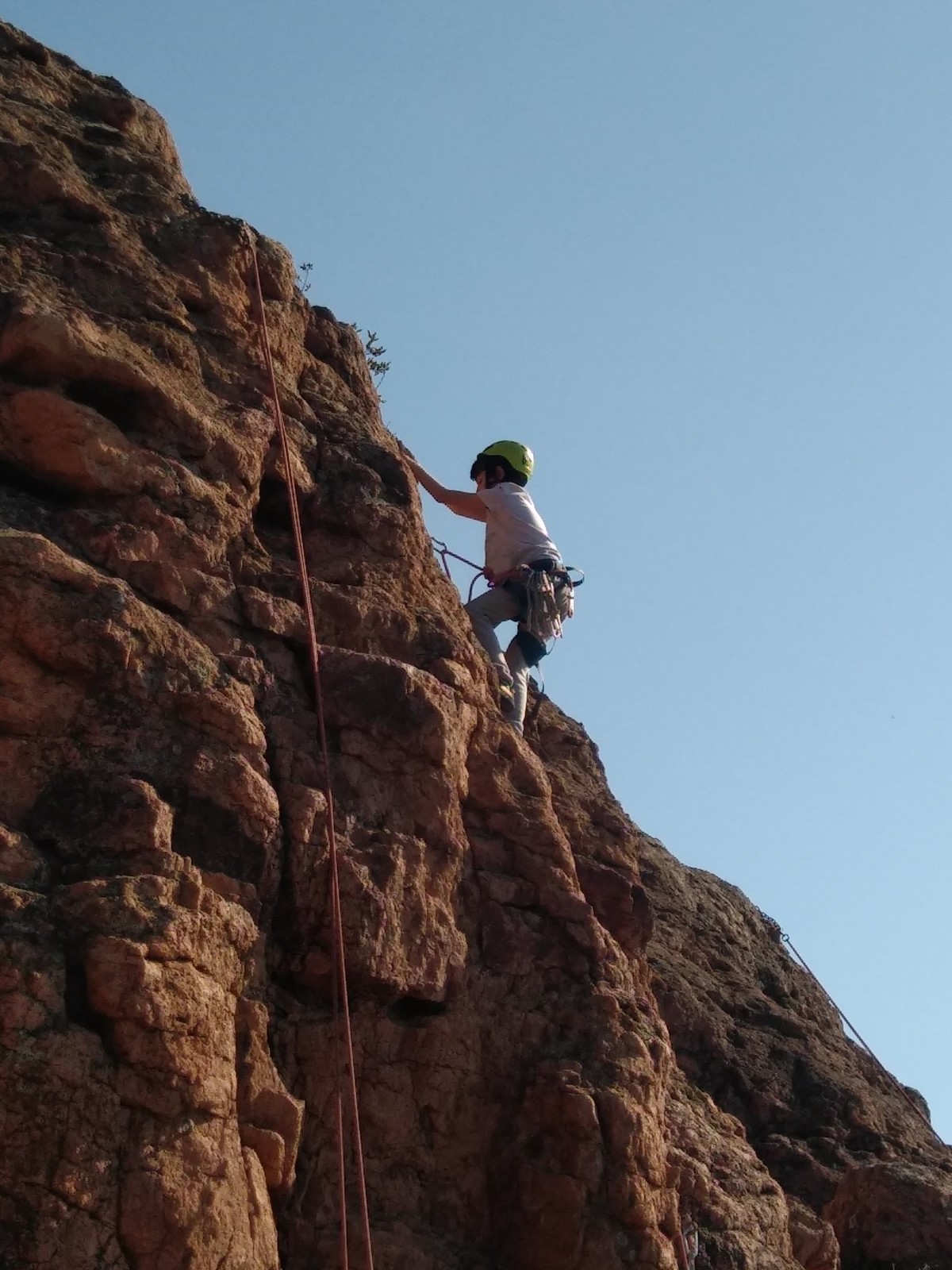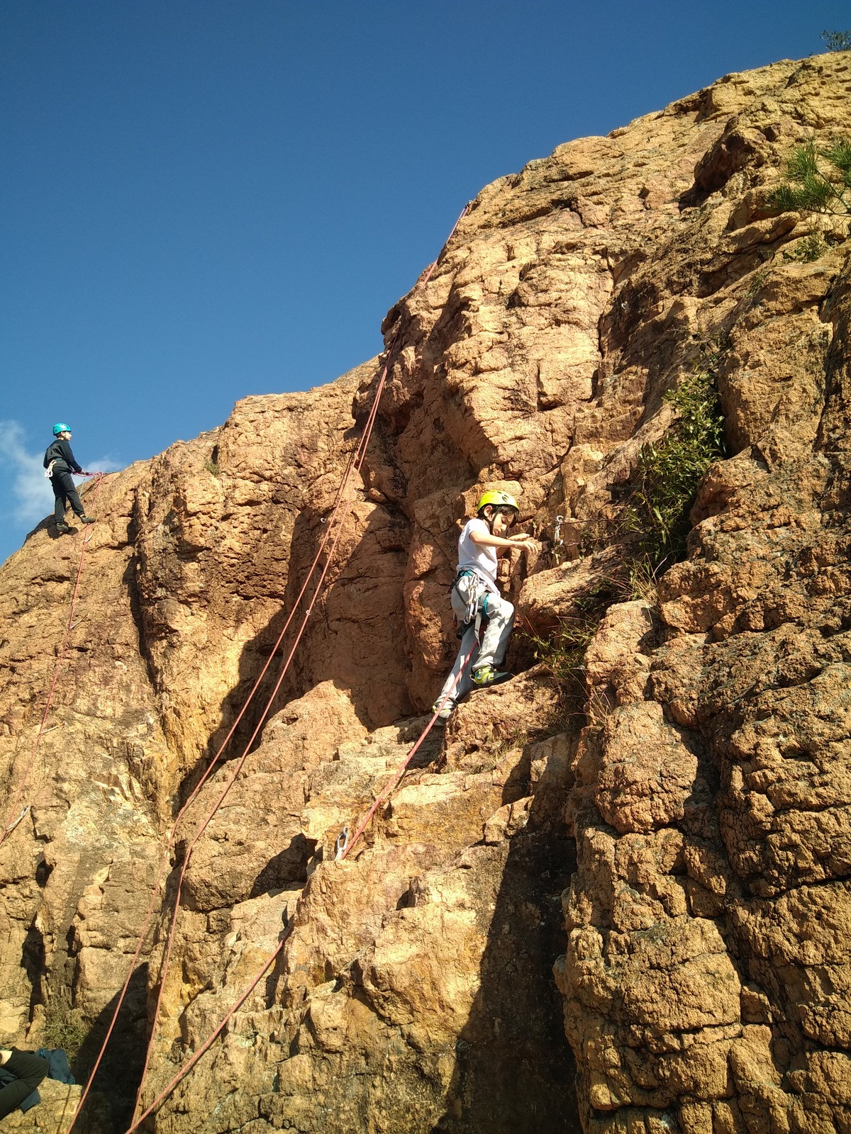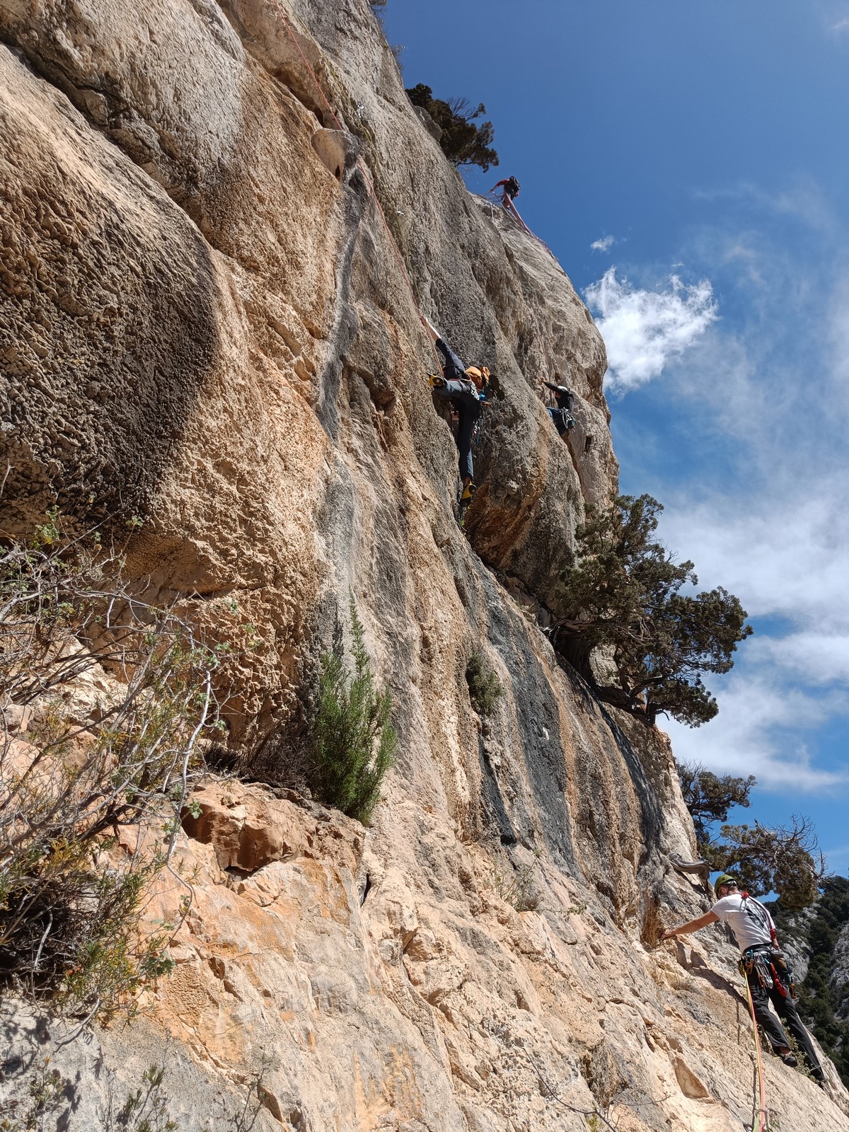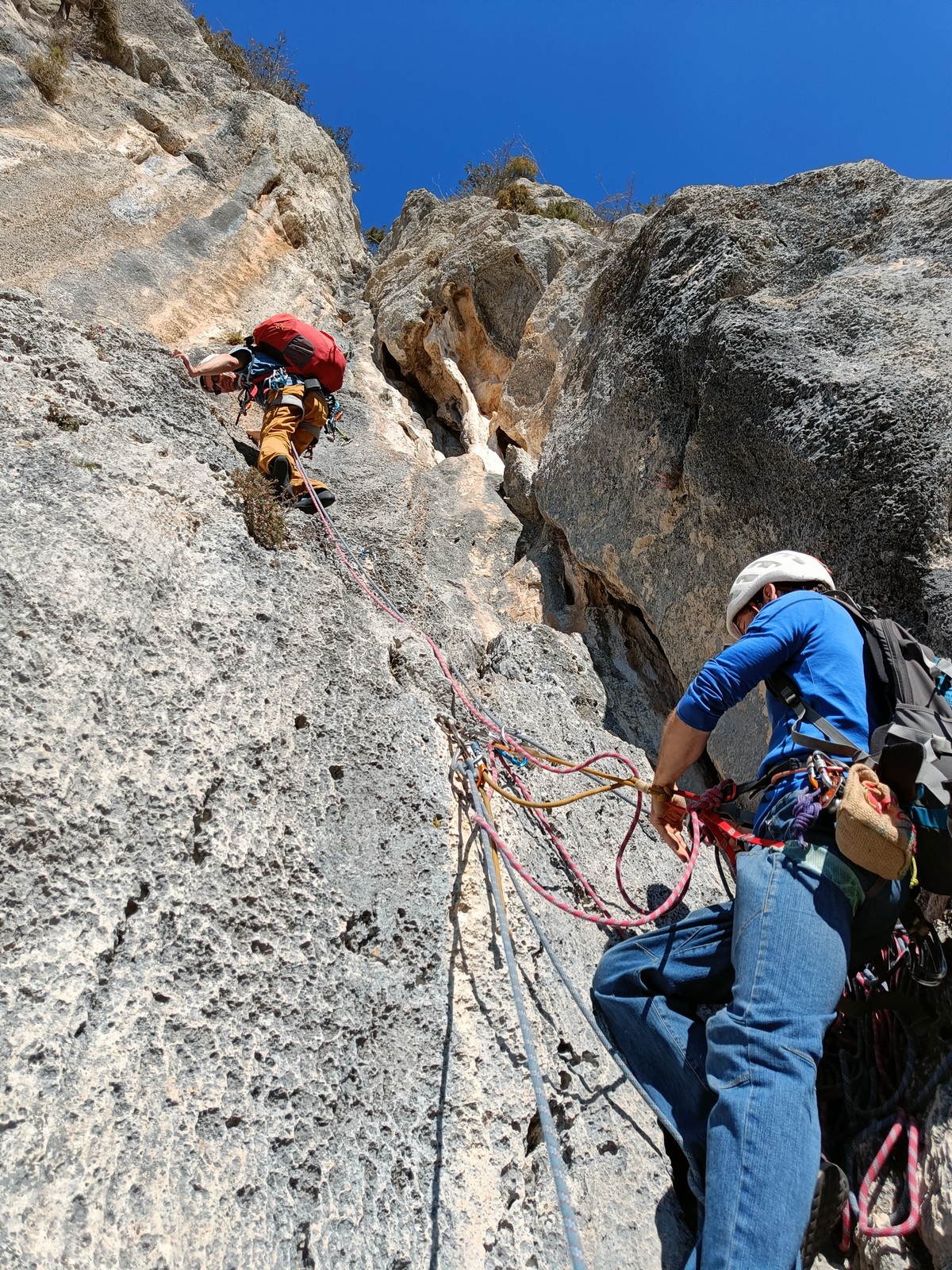 En grandes voies, les situations sont toujours nouvelles et il faut savoir d’adapter. La première partie de la journée se passe bien malgré des difficultés pour Xavier pour construire correctement son premier relais. Avec Théo, on arrive vite à la longueur clé en 6c, pendant que Brice, juste en dessous, donne tout pour sortir sa longueur en 6a.