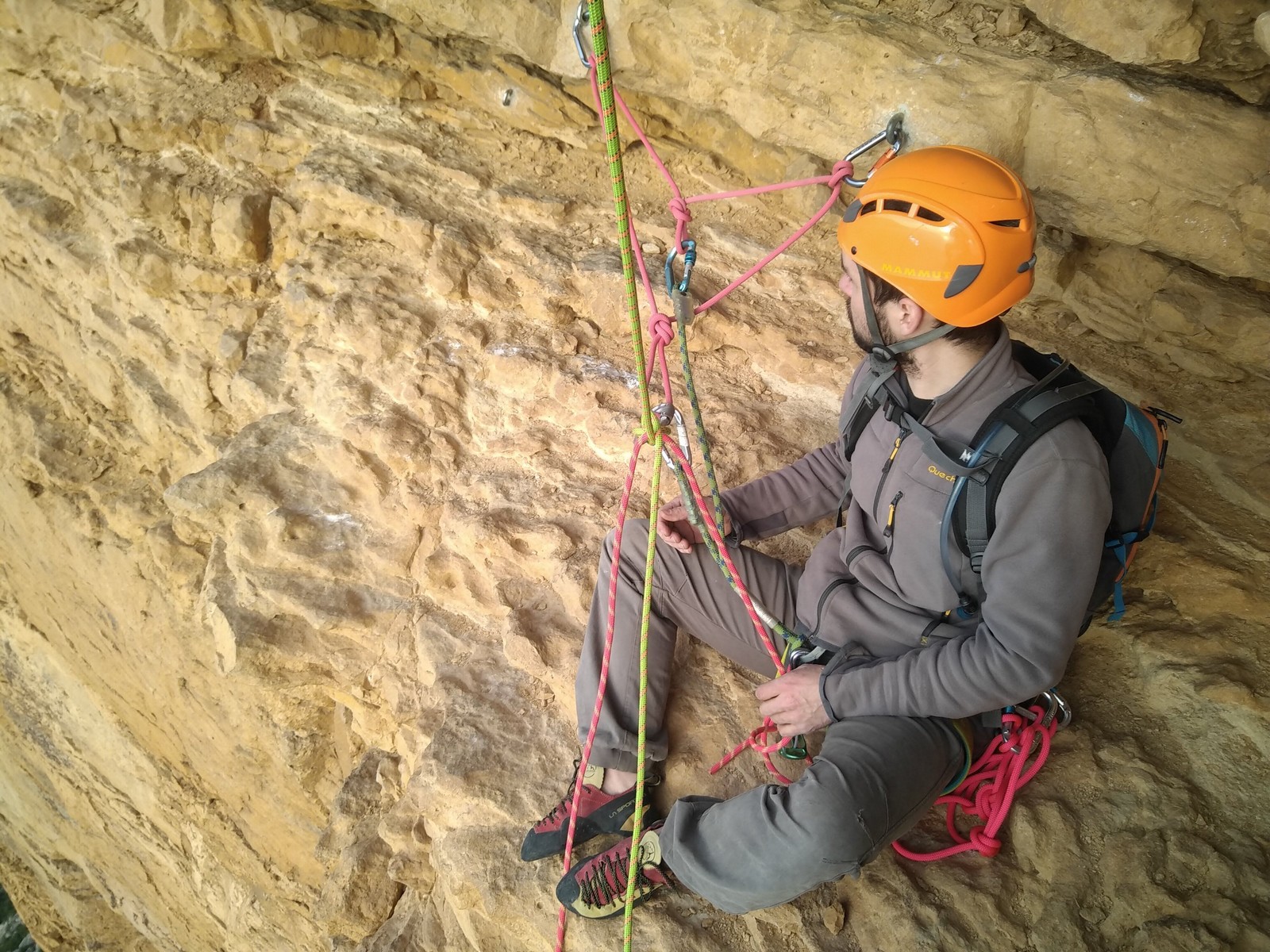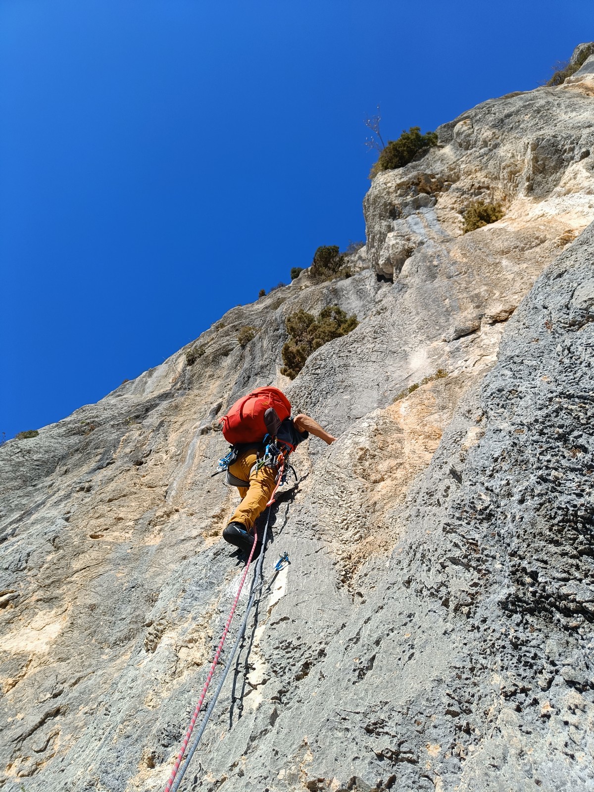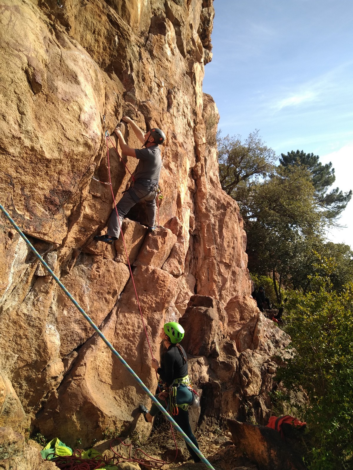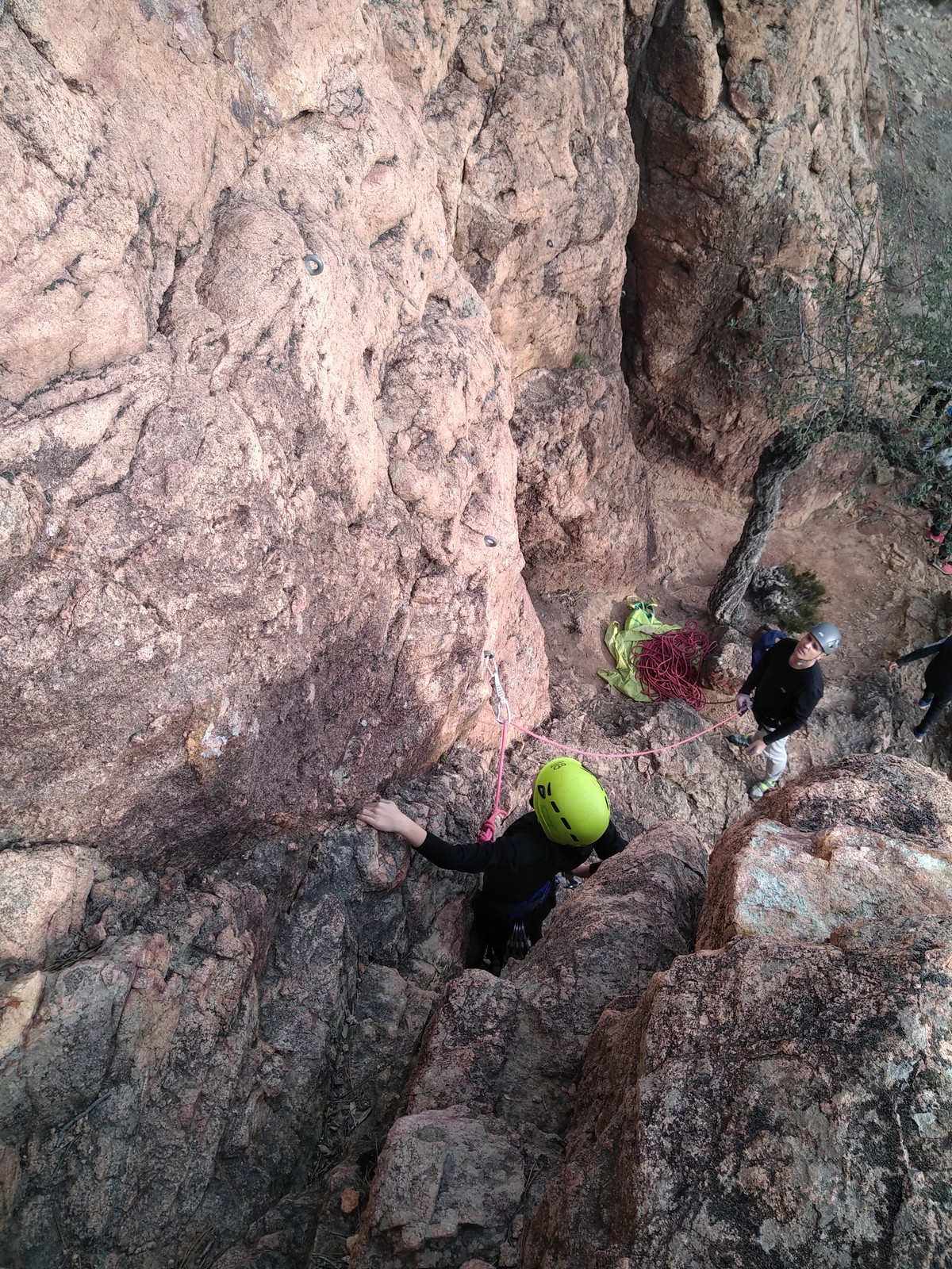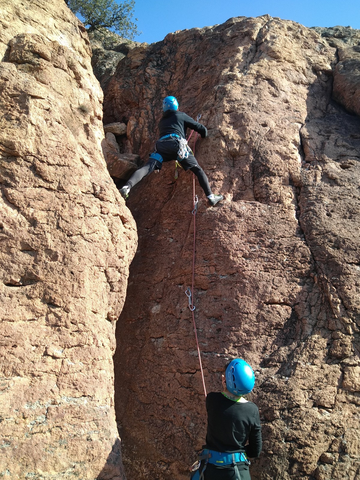 En grandes voies, les situations sont toujours nouvelles et il faut savoir d’adapter. La première partie de la journée se passe bien malgré des difficultés pour Xavier pour construire correctement son premier relais. Avec Théo, on arrive vite à la longueur clé en 6c, pendant que Brice, juste en dessous, donne tout pour sortir sa longueur en 6a.
