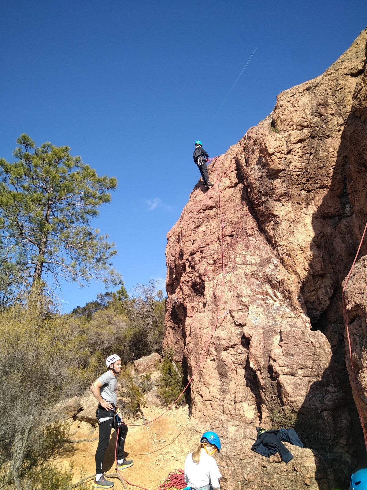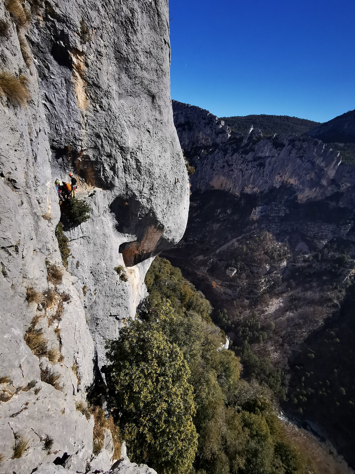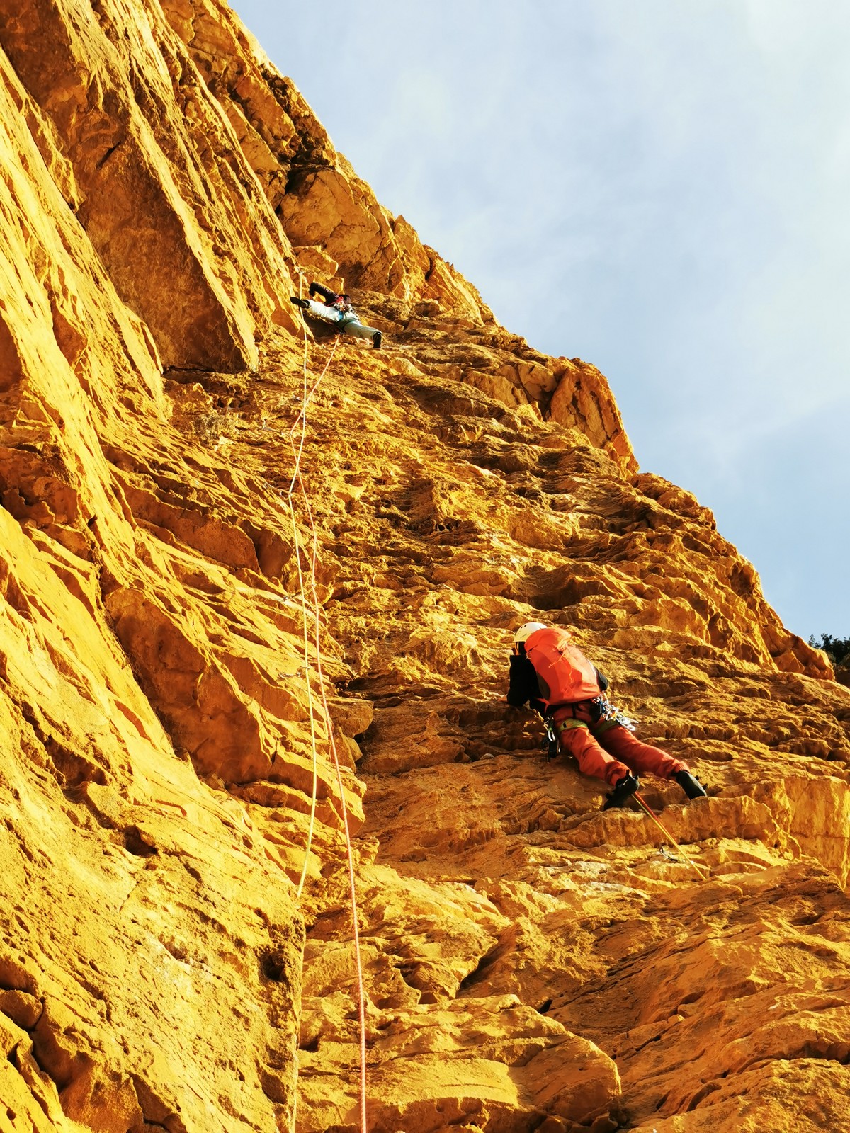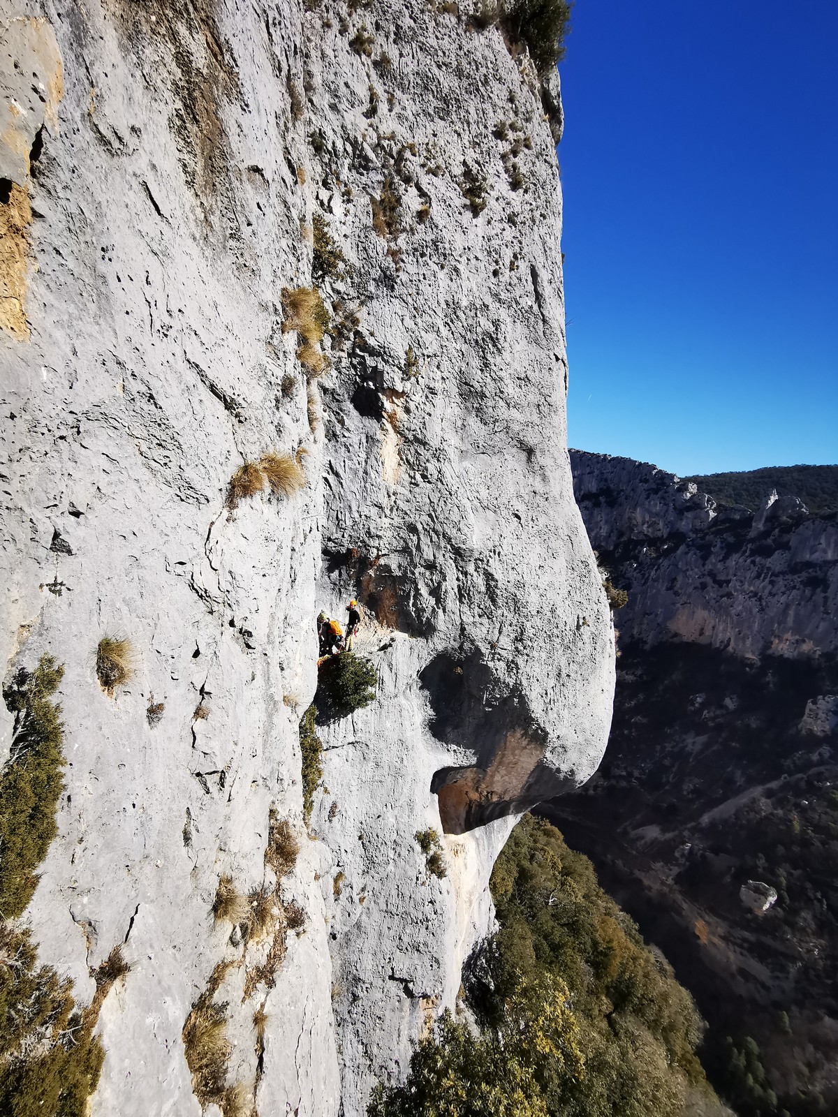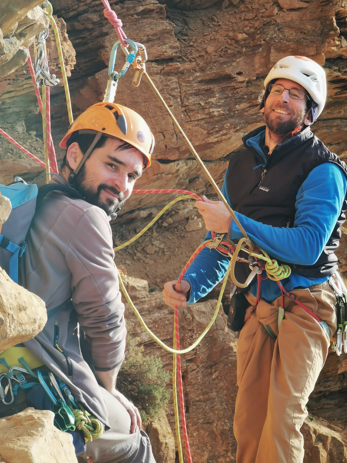 En grandes voies, les situations sont toujours nouvelles et il faut savoir d’adapter. La première partie de la journée se passe bien malgré des difficultés pour Xavier pour construire correctement son premier relais. Avec Théo, on arrive vite à la longueur clé en 6c, pendant que Brice, juste en dessous, donne tout pour sortir sa longueur en 6a.
