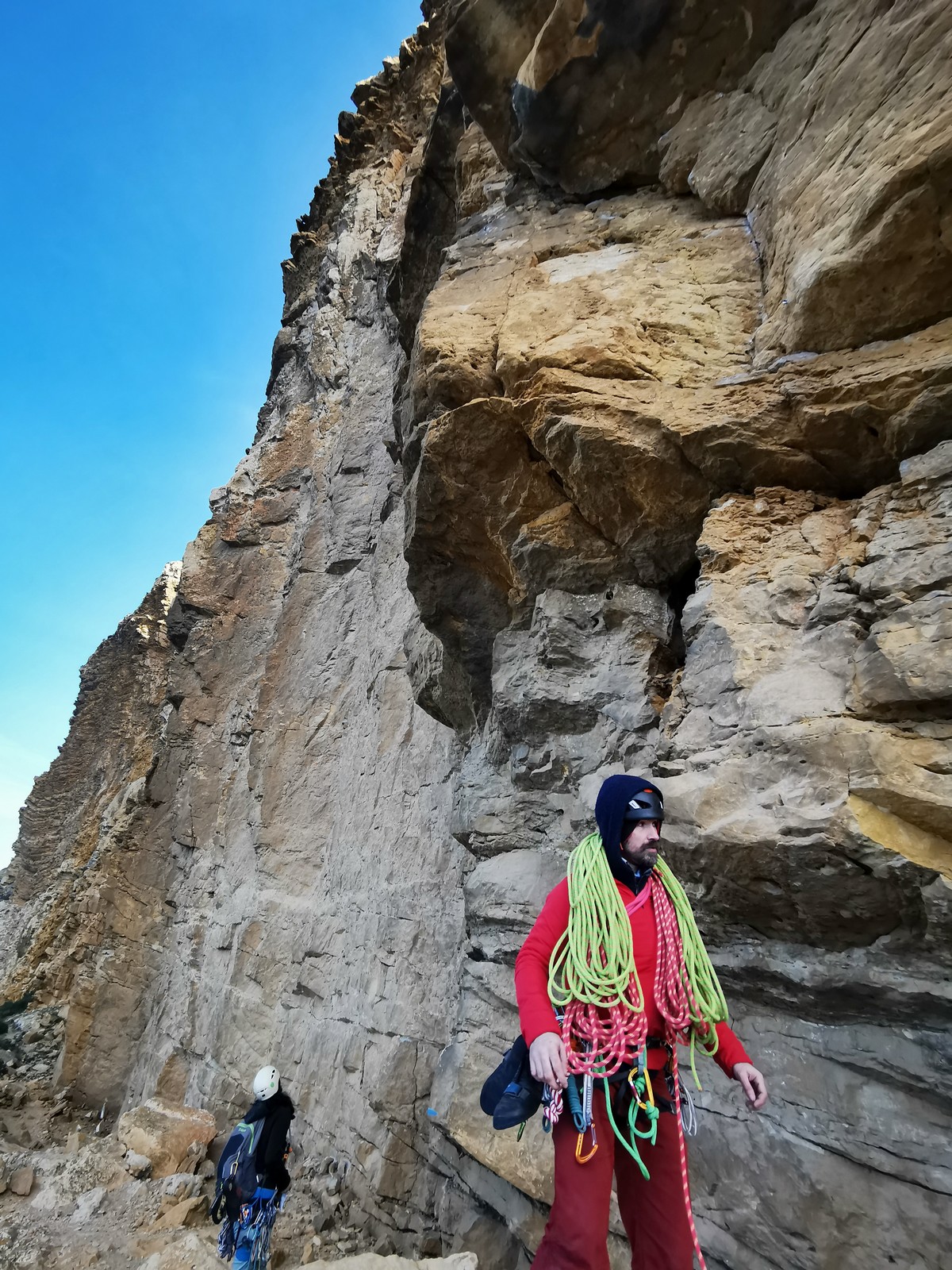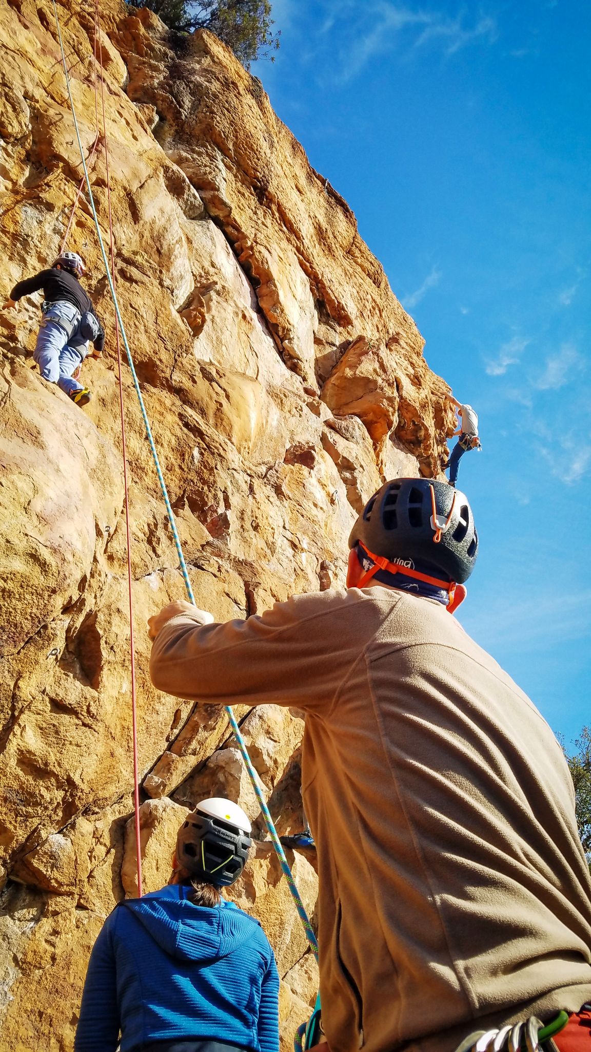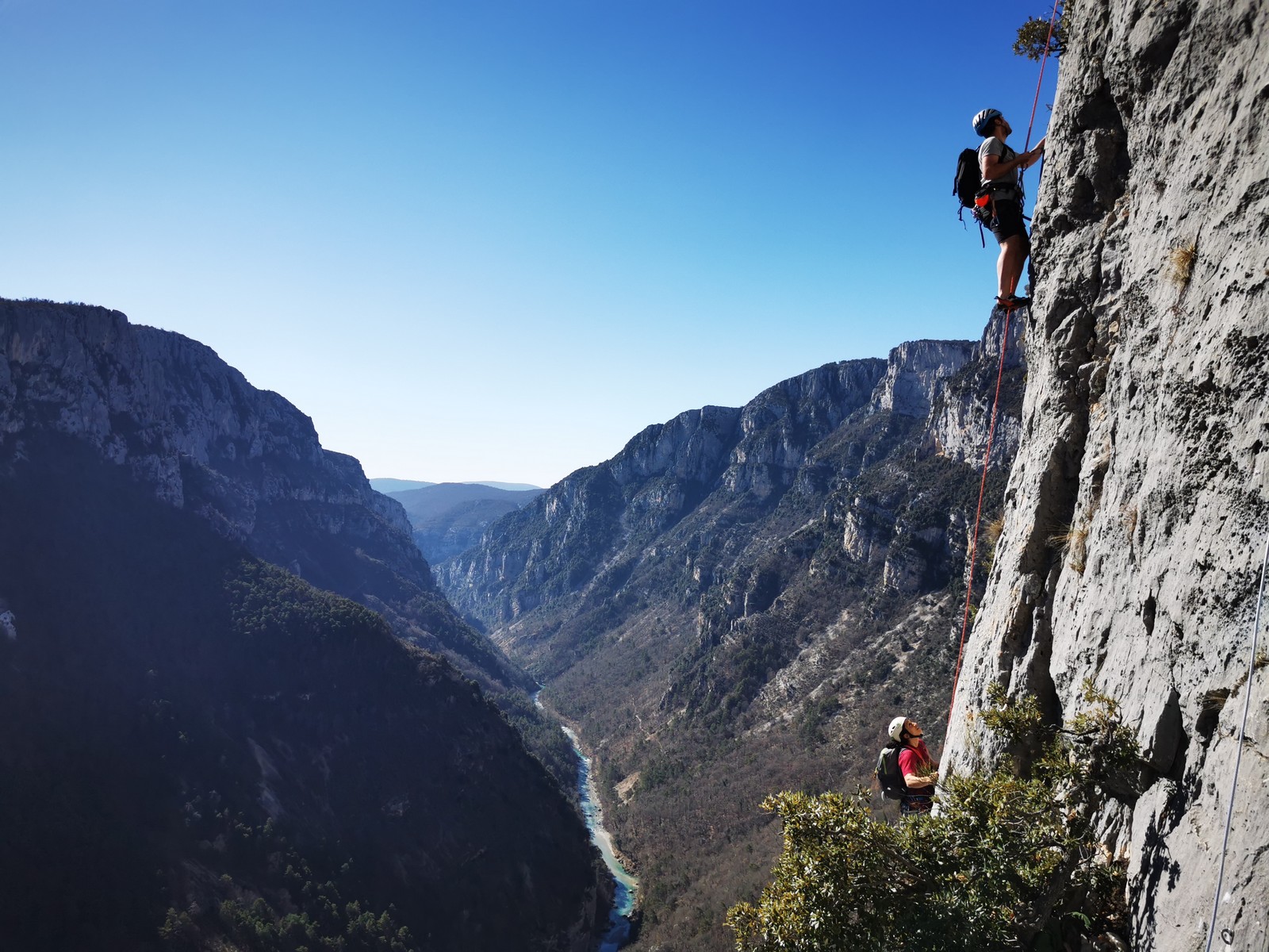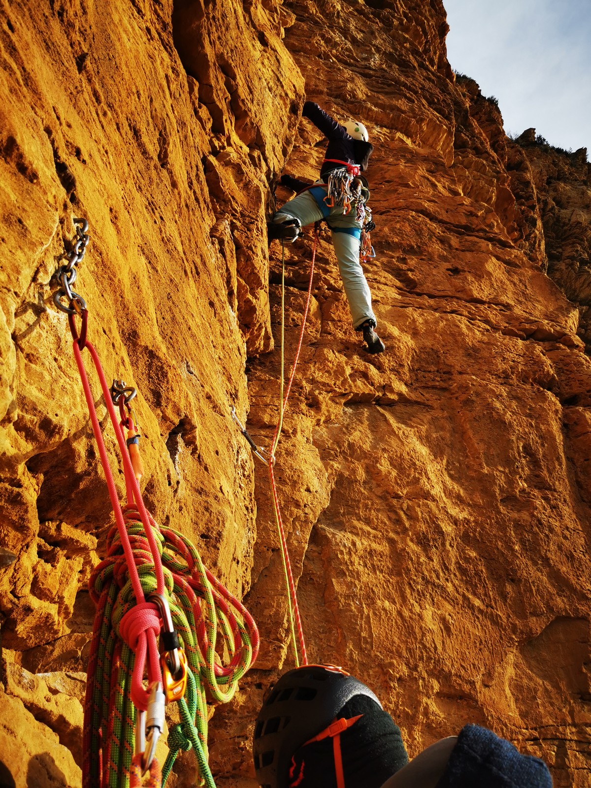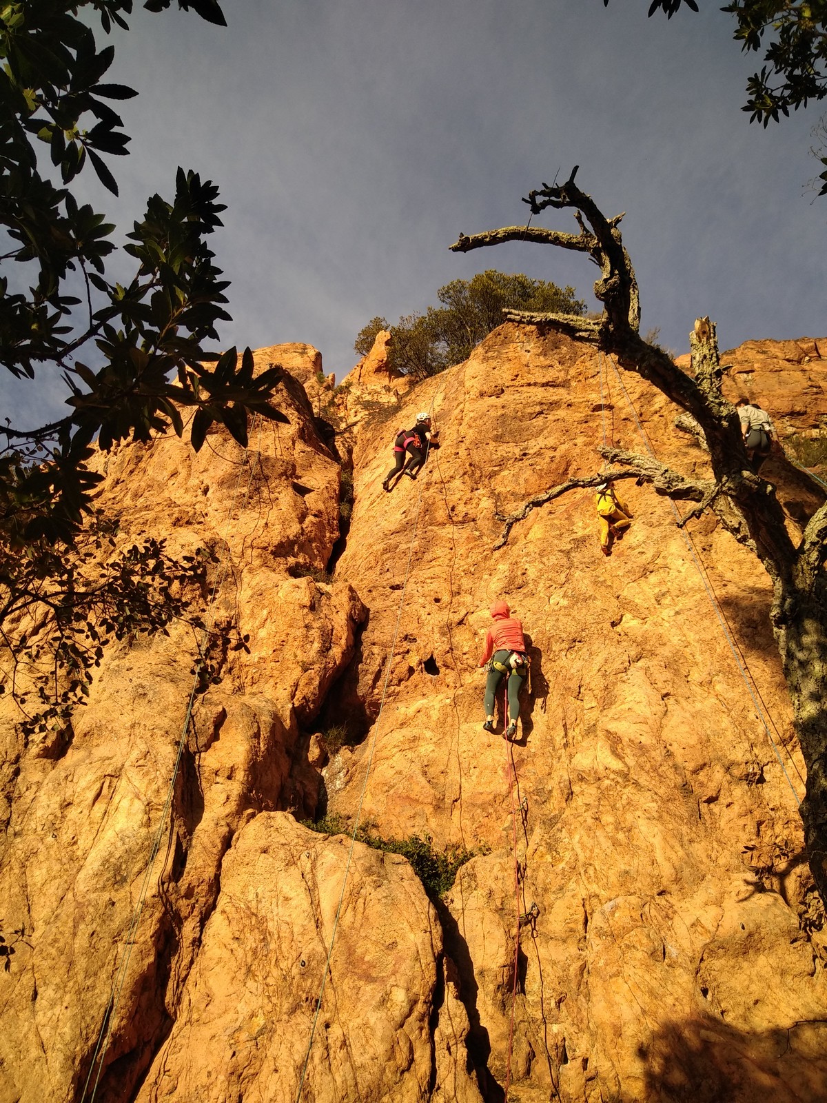 En grandes voies, les situations sont toujours nouvelles et il faut savoir d’adapter. La première partie de la journée se passe bien malgré des difficultés pour Xavier pour construire correctement son premier relais. Avec Théo, on arrive vite à la longueur clé en 6c, pendant que Brice, juste en dessous, donne tout pour sortir sa longueur en 6a.
