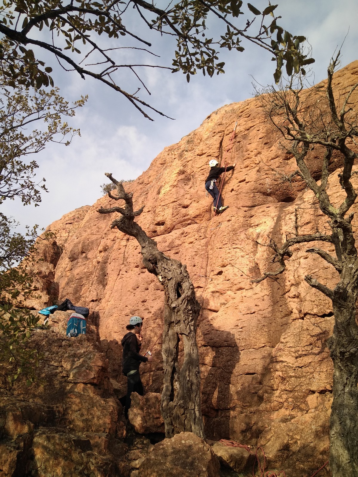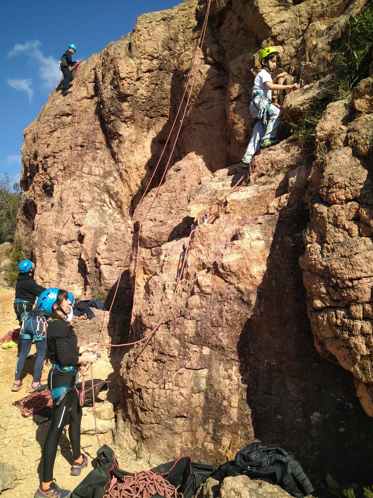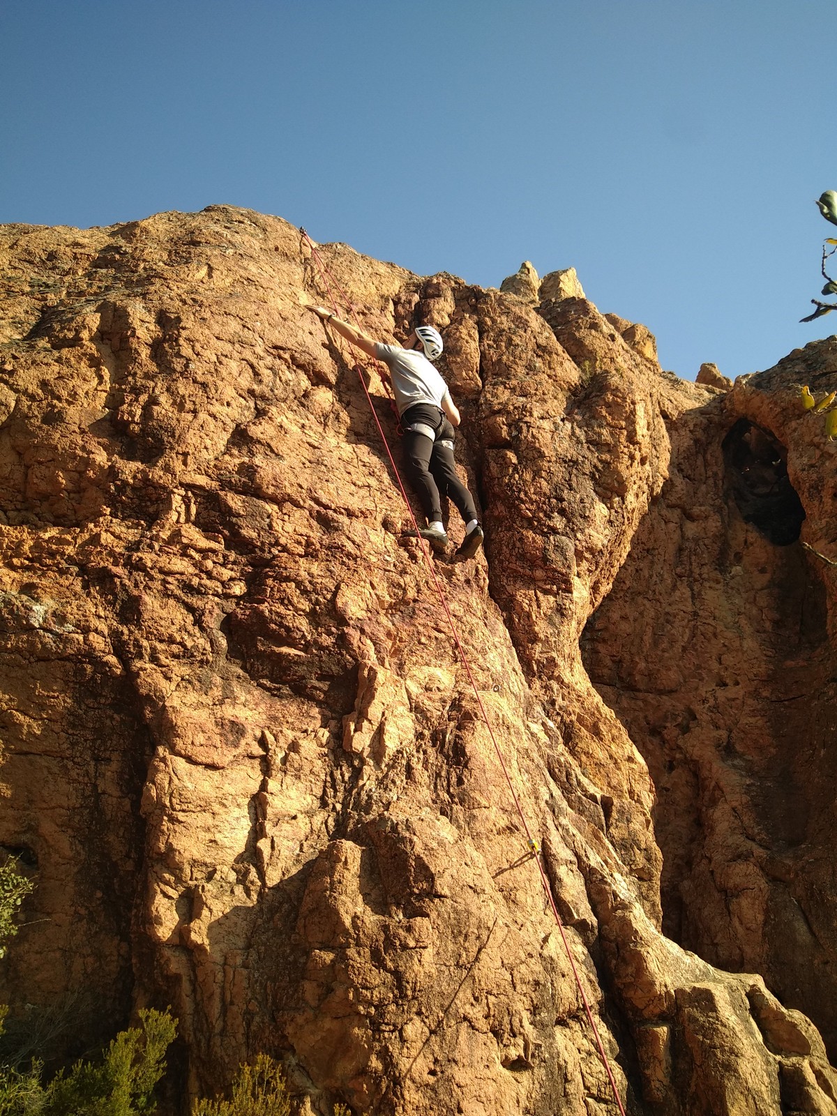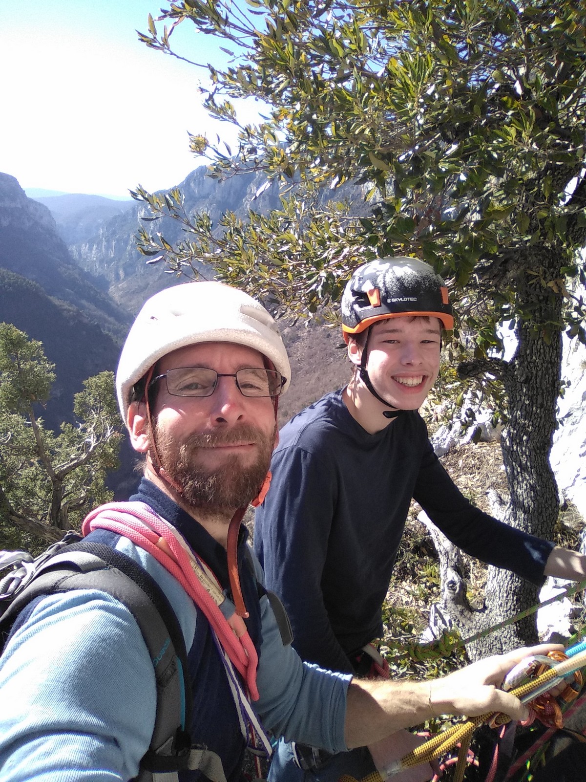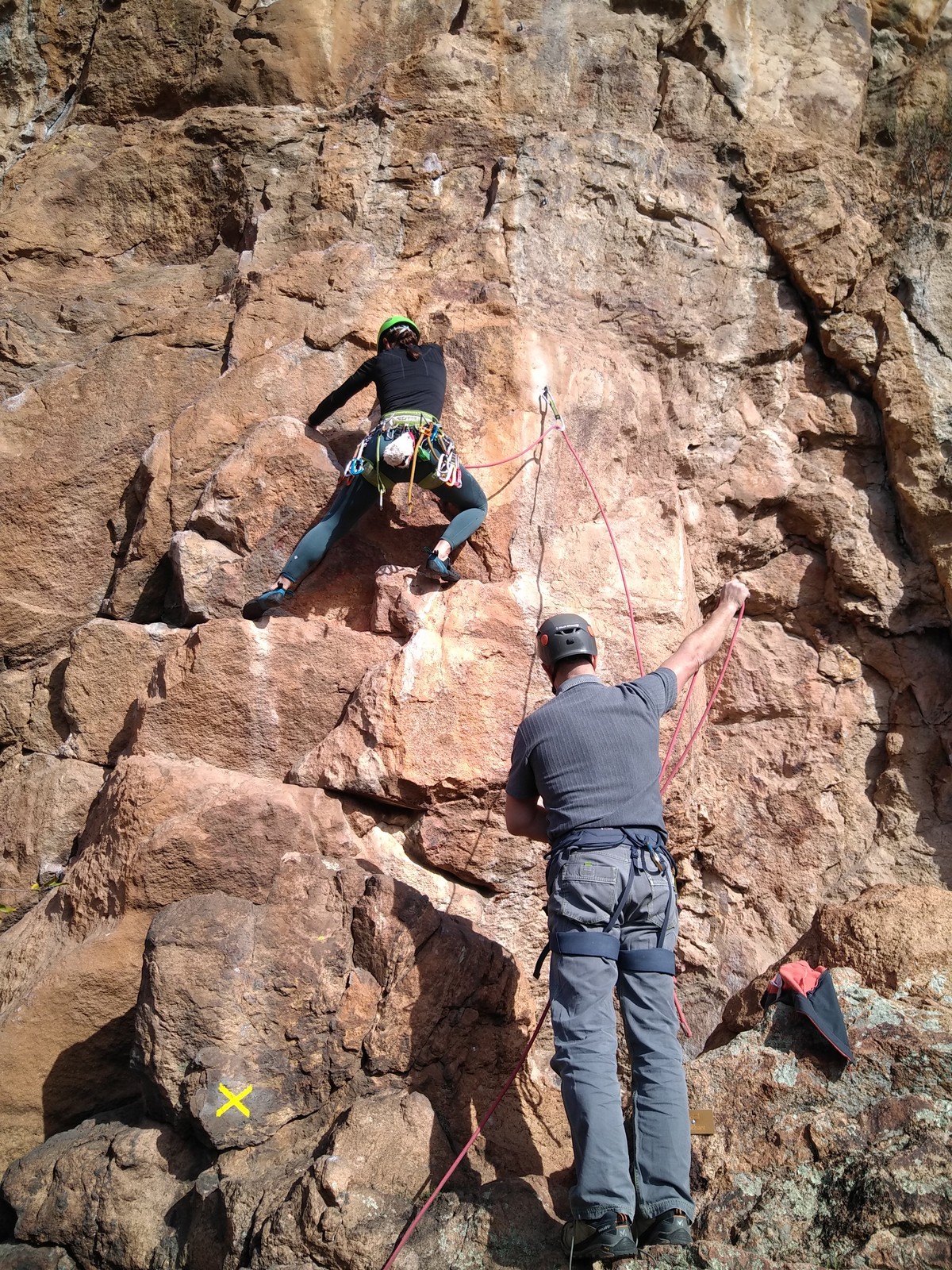 En grandes voies, les situations sont toujours nouvelles et il faut savoir d’adapter. La première partie de la journée se passe bien malgré des difficultés pour Xavier pour construire correctement son premier relais. Avec Théo, on arrive vite à la longueur clé en 6c, pendant que Brice, juste en dessous, donne tout pour sortir sa longueur en 6a.