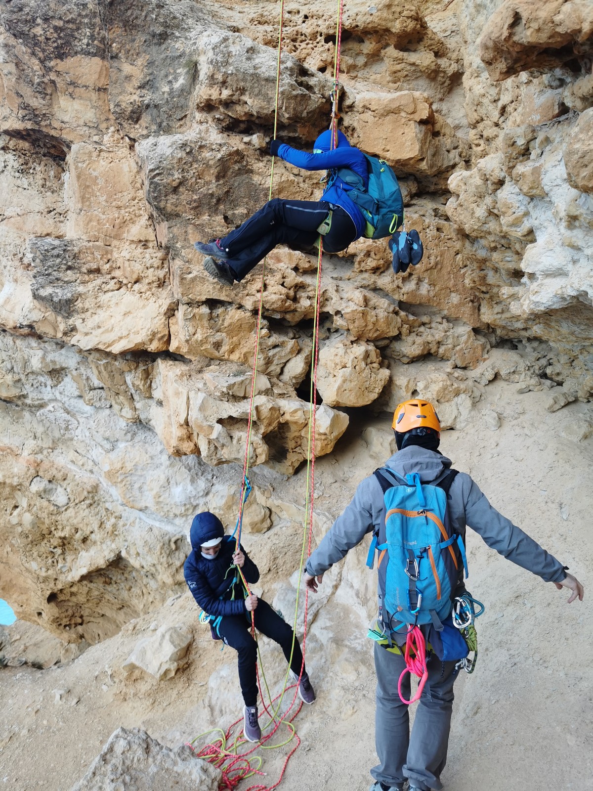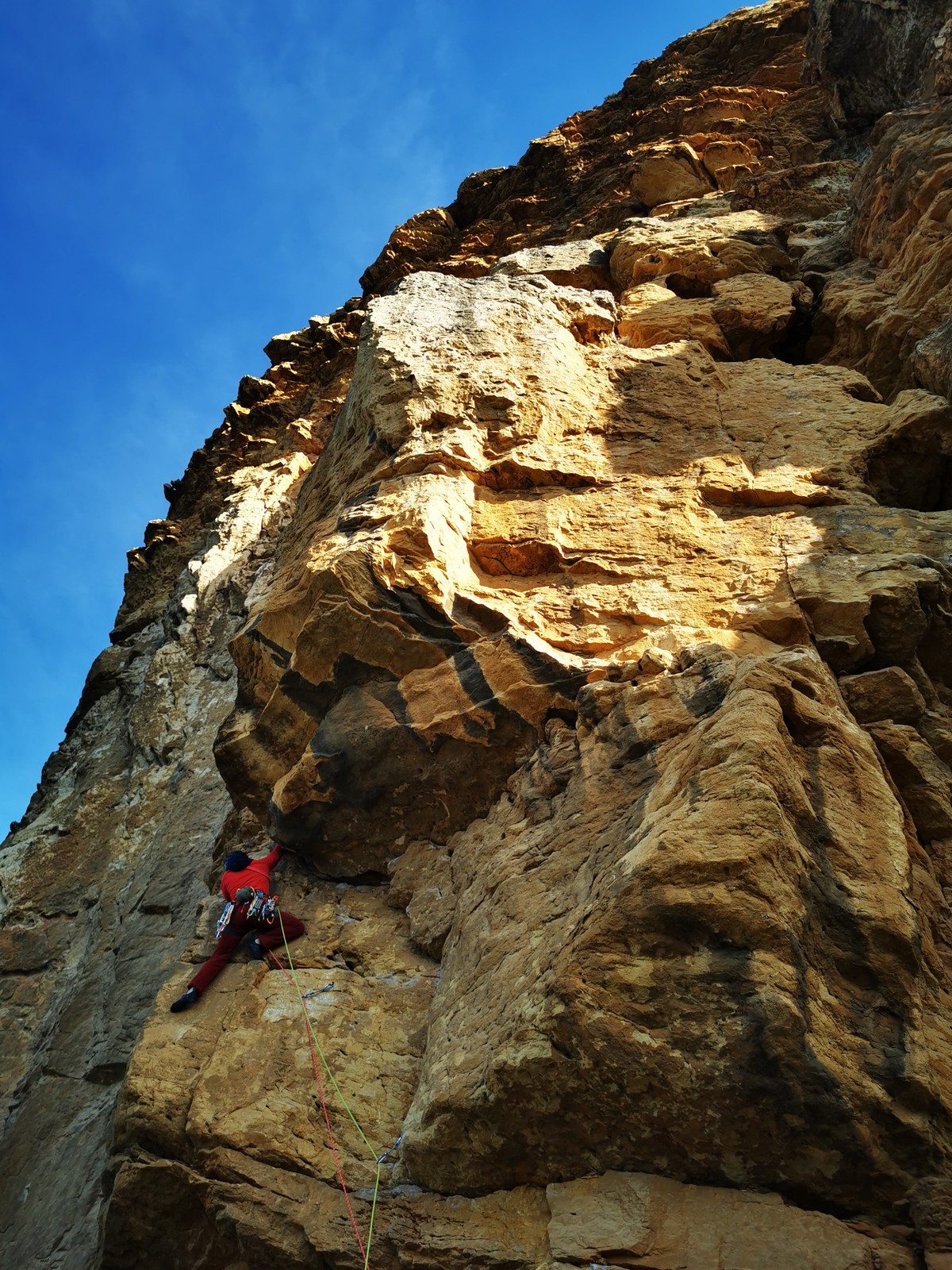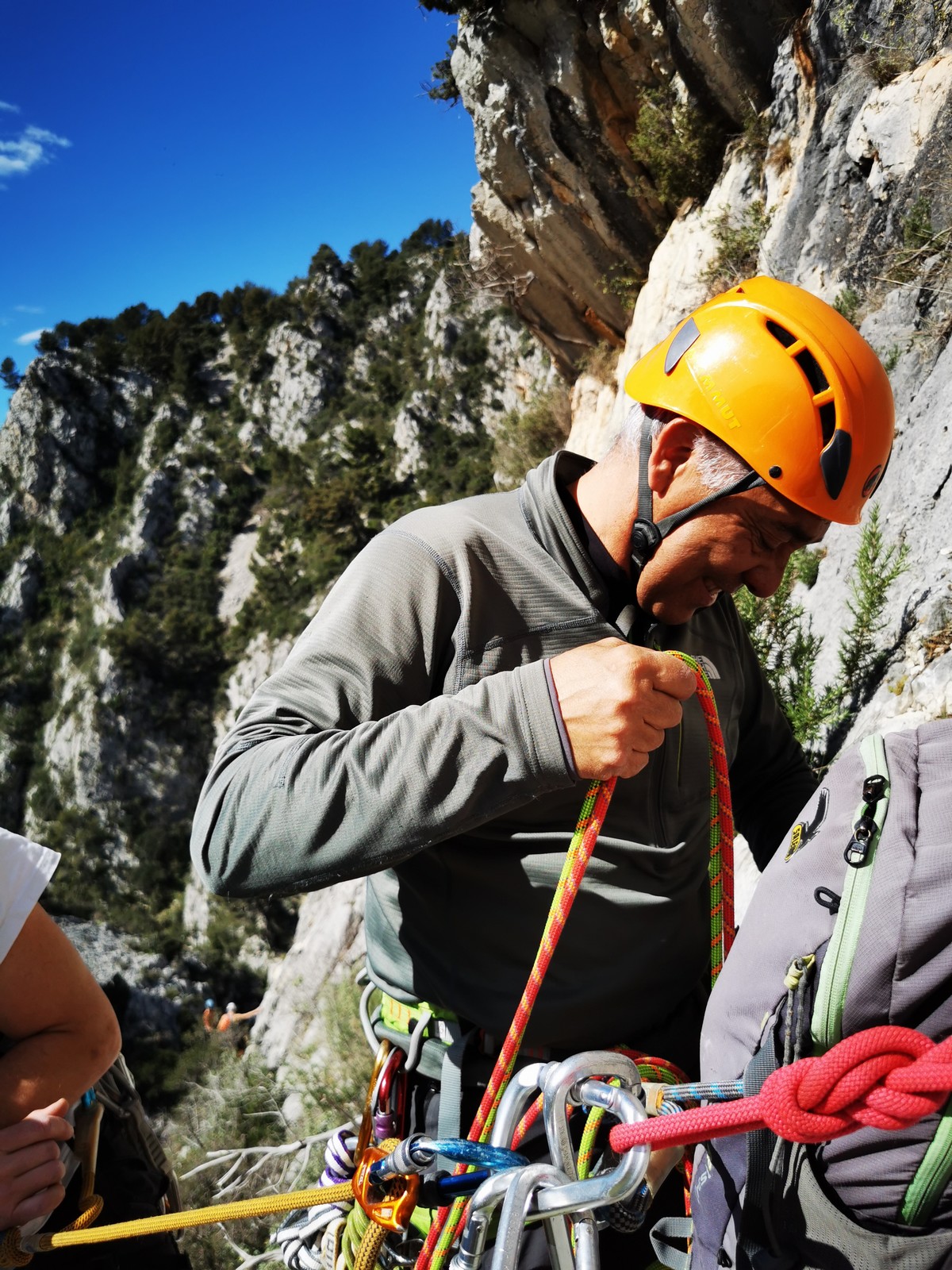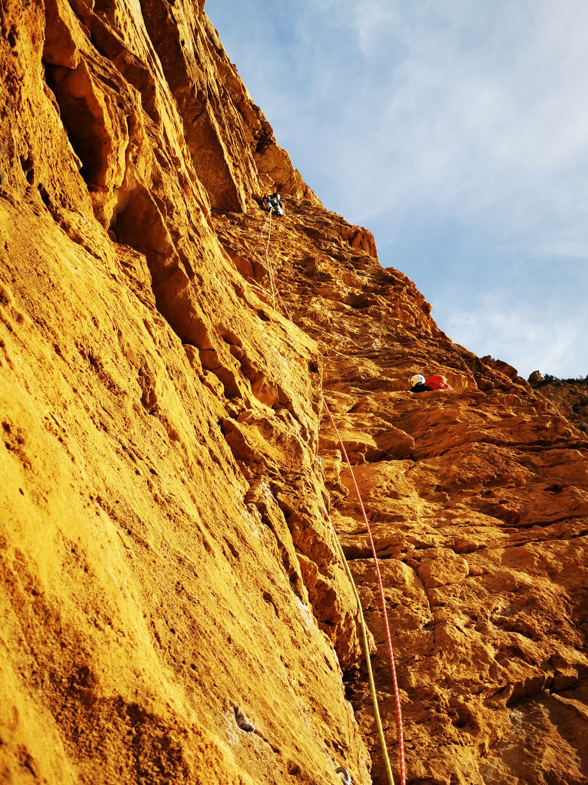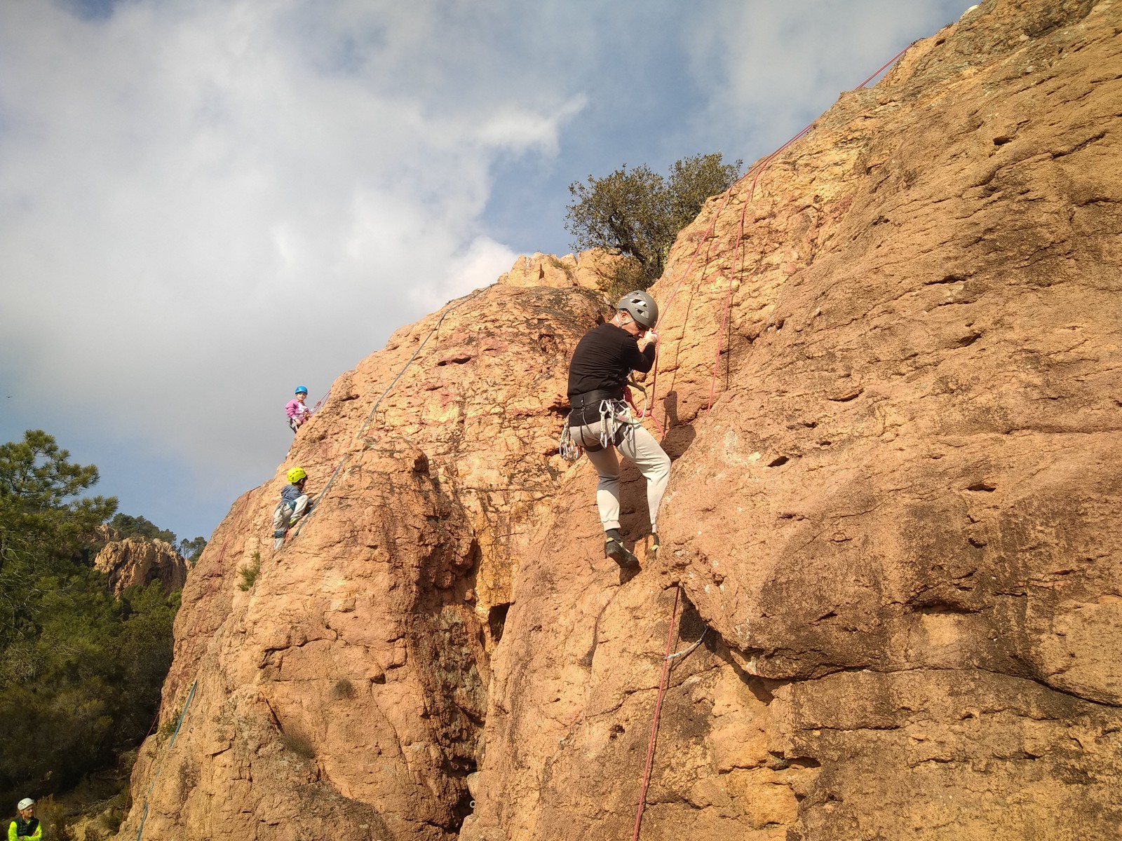 En grandes voies, les situations sont toujours nouvelles et il faut savoir d’adapter. La première partie de la journée se passe bien malgré des difficultés pour Xavier pour construire correctement son premier relais. Avec Théo, on arrive vite à la longueur clé en 6c, pendant que Brice, juste en dessous, donne tout pour sortir sa longueur en 6a.