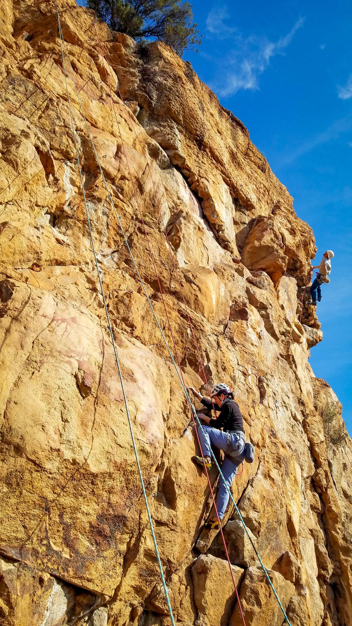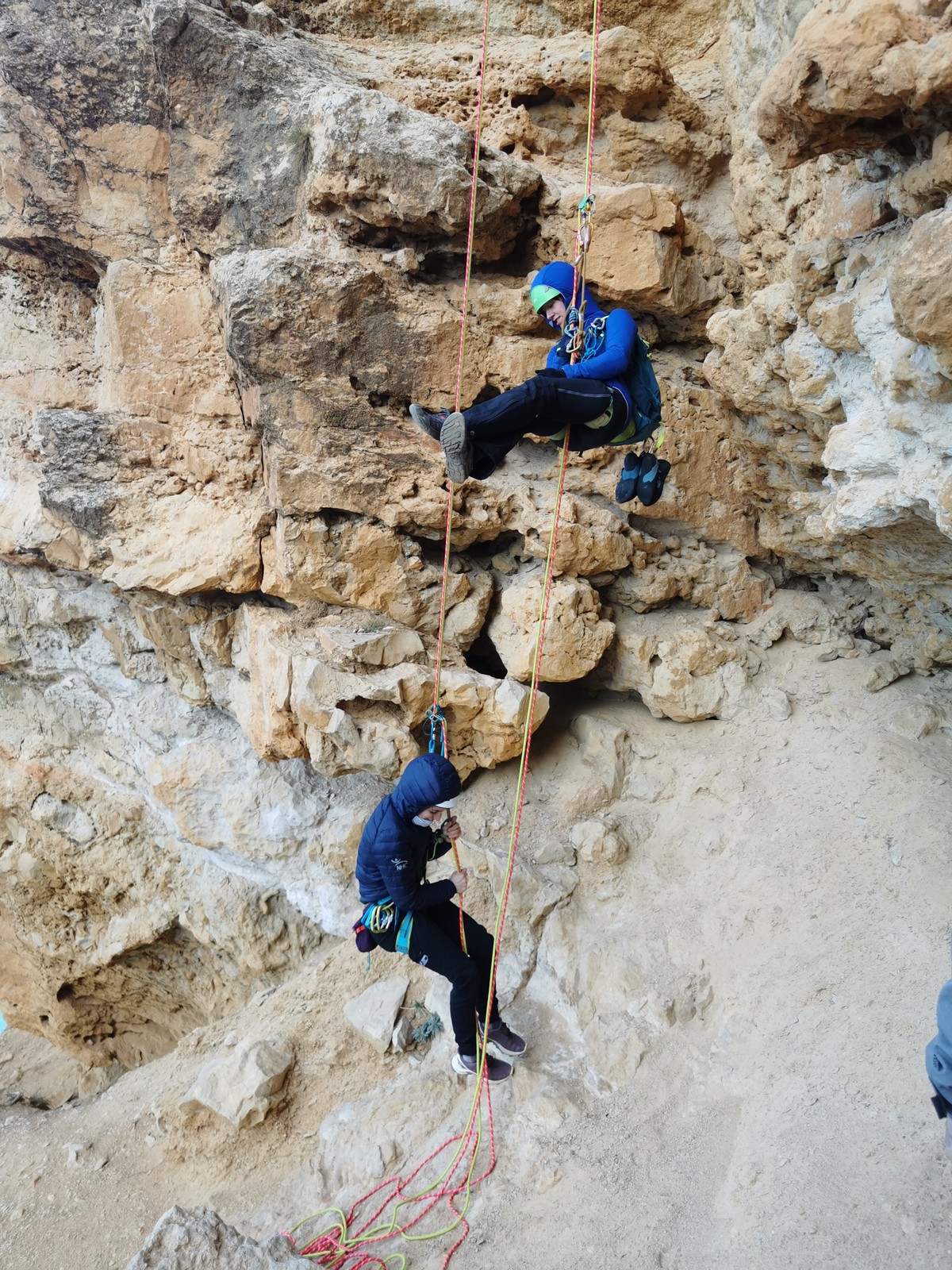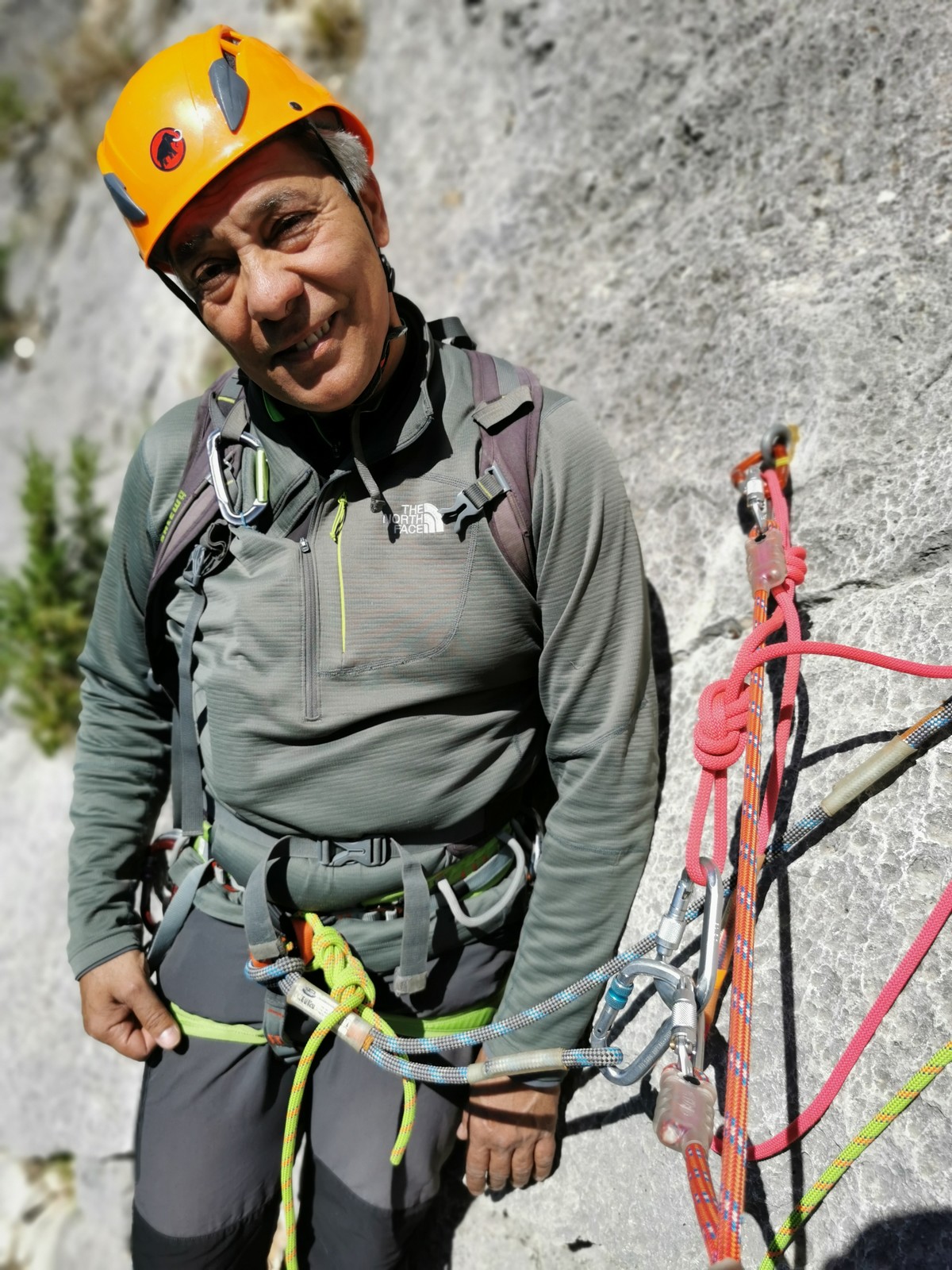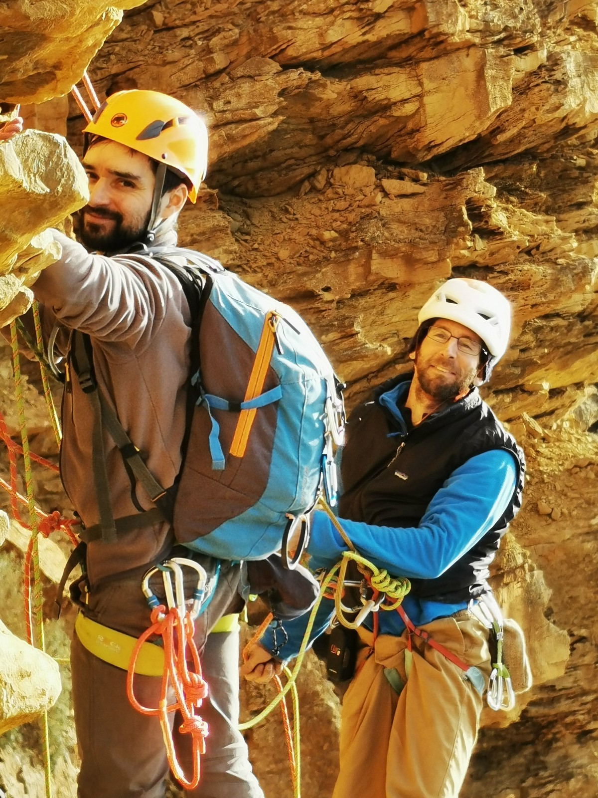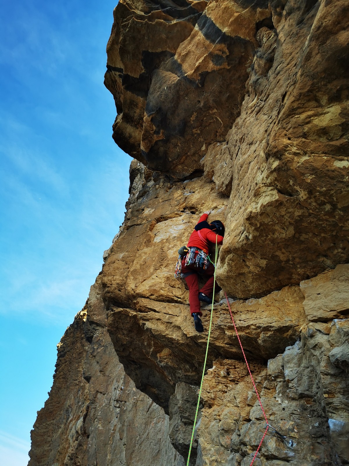 En grandes voies, les situations sont toujours nouvelles et il faut savoir d’adapter. La première partie de la journée se passe bien malgré des difficultés pour Xavier pour construire correctement son premier relais. Avec Théo, on arrive vite à la longueur clé en 6c, pendant que Brice, juste en dessous, donne tout pour sortir sa longueur en 6a.
