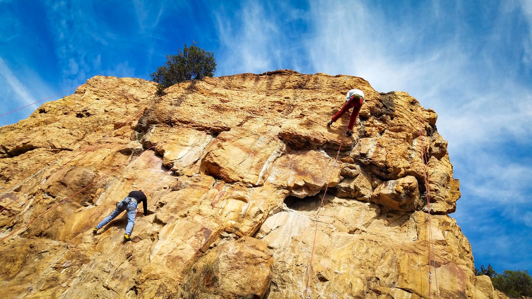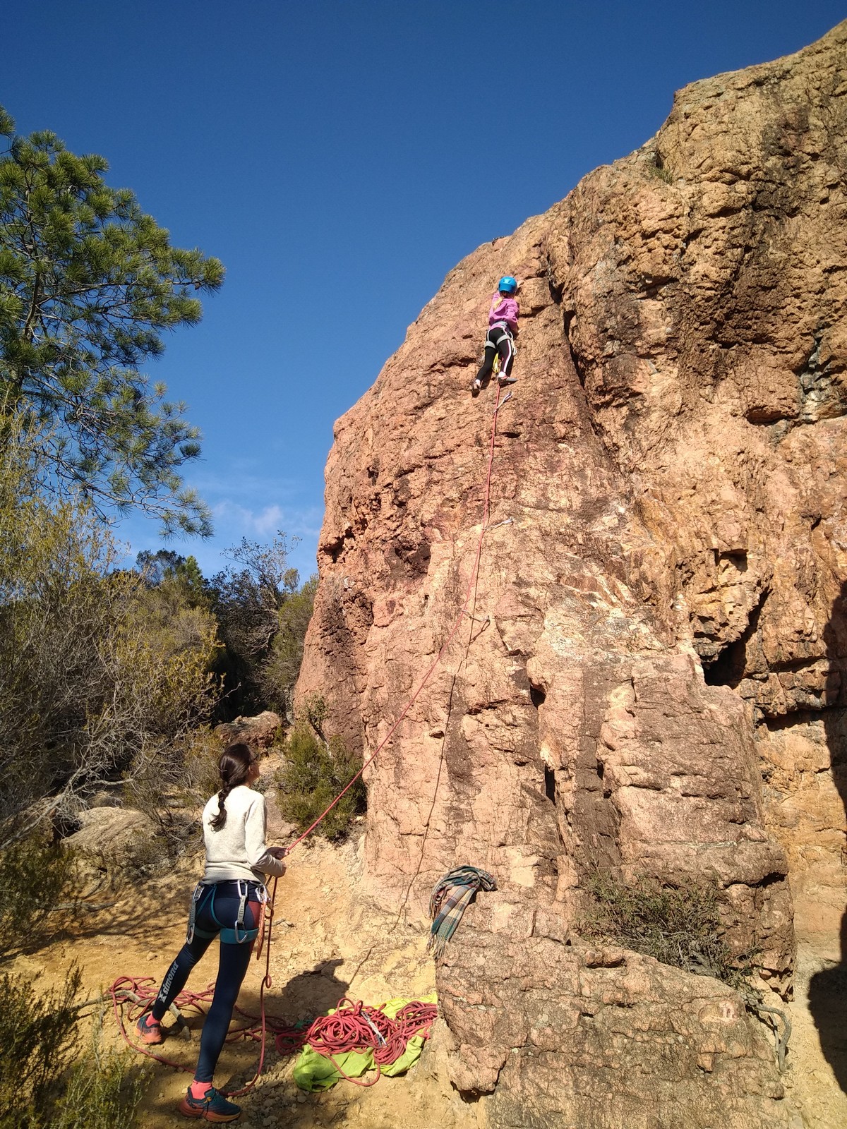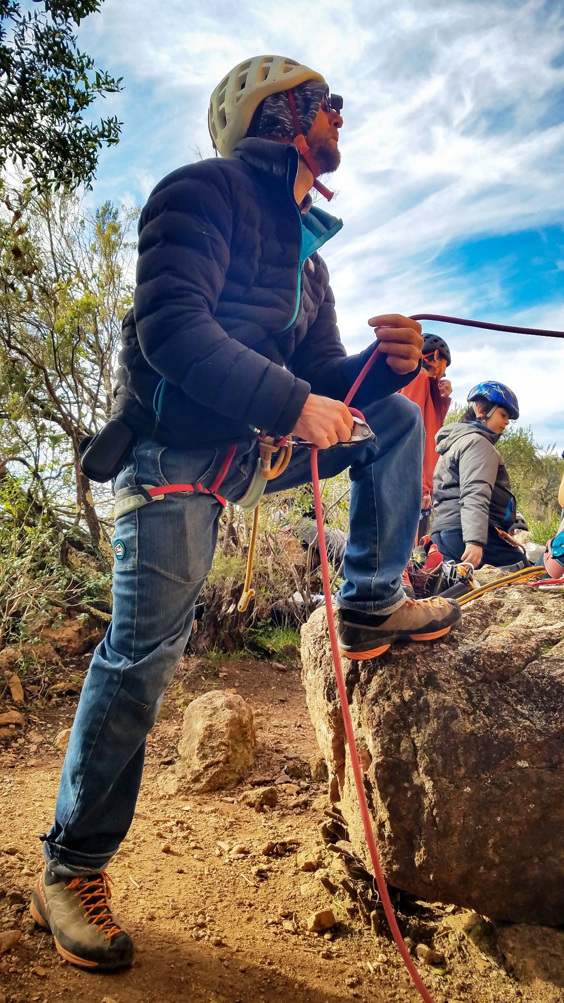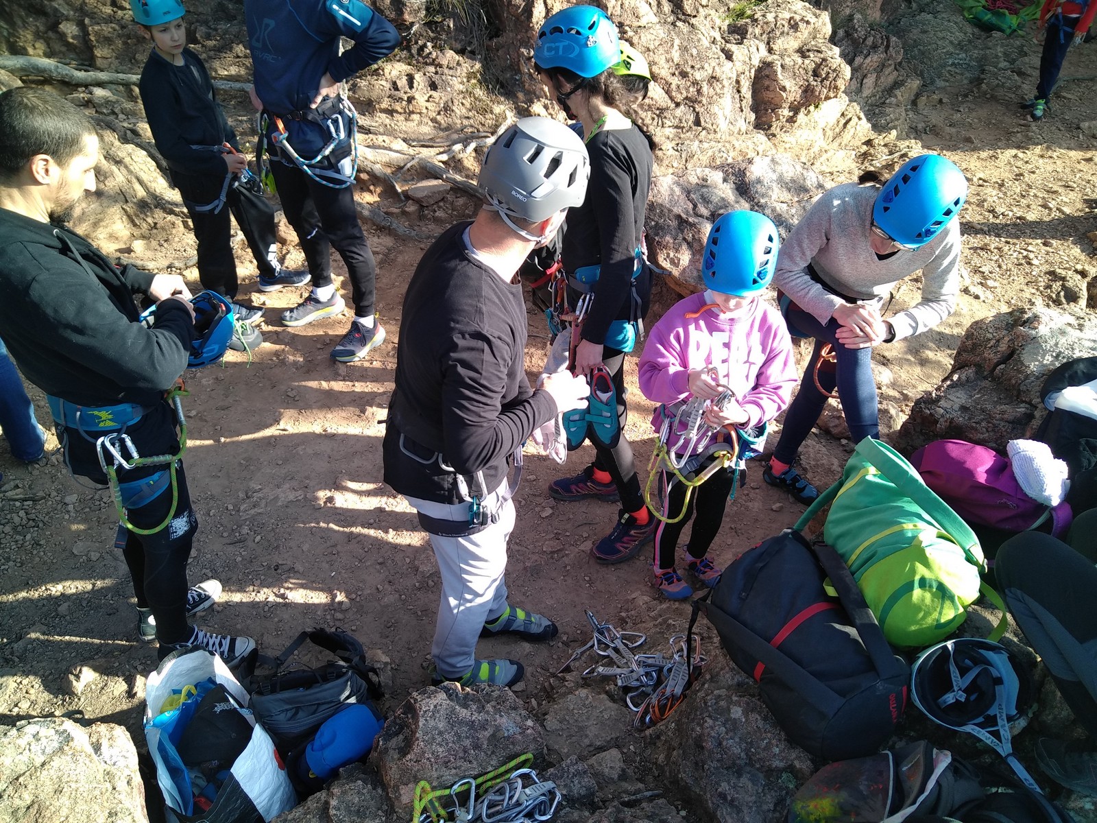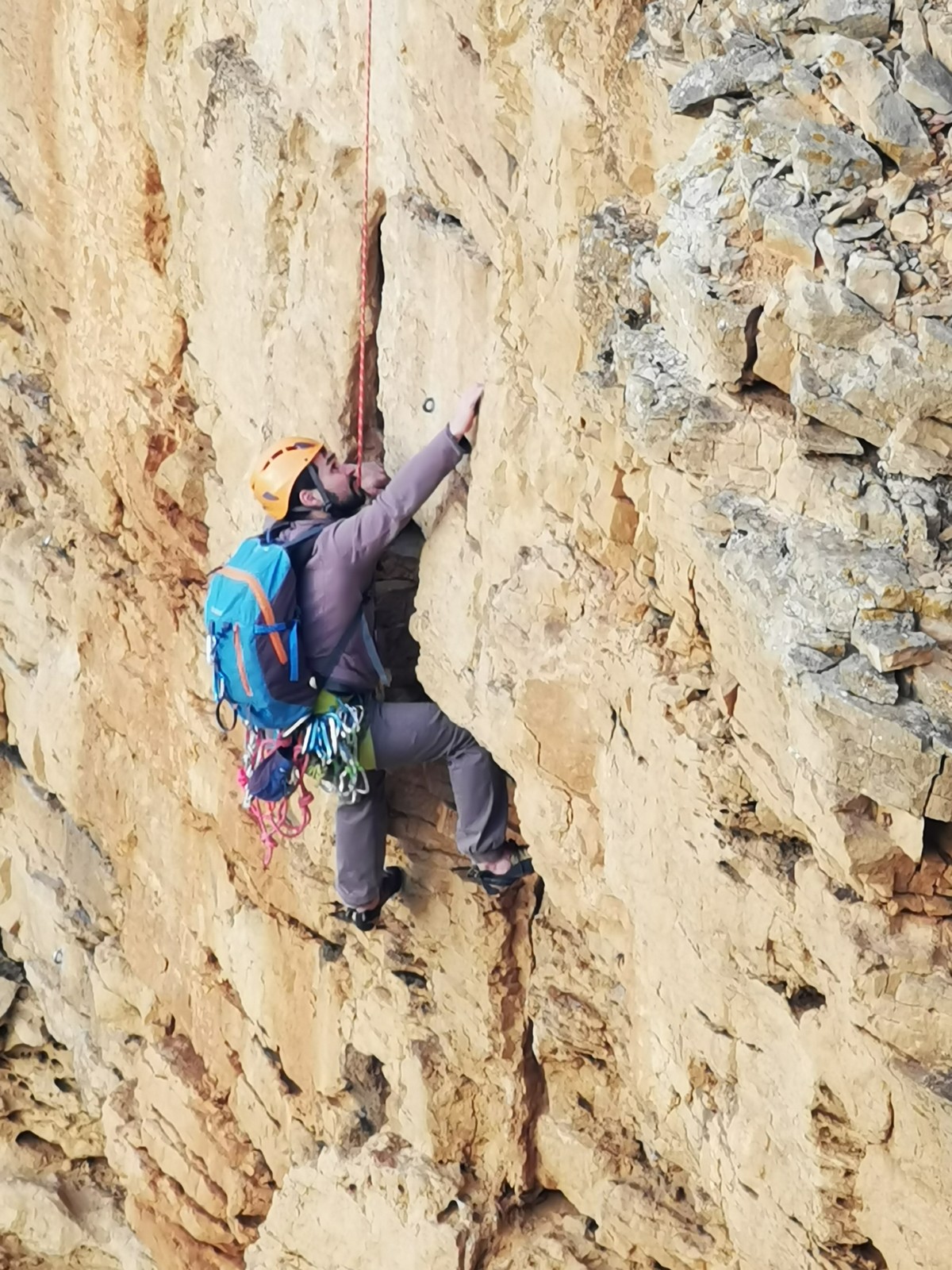 En grandes voies, les situations sont toujours nouvelles et il faut savoir d’adapter. La première partie de la journée se passe bien malgré des difficultés pour Xavier pour construire correctement son premier relais. Avec Théo, on arrive vite à la longueur clé en 6c, pendant que Brice, juste en dessous, donne tout pour sortir sa longueur en 6a.